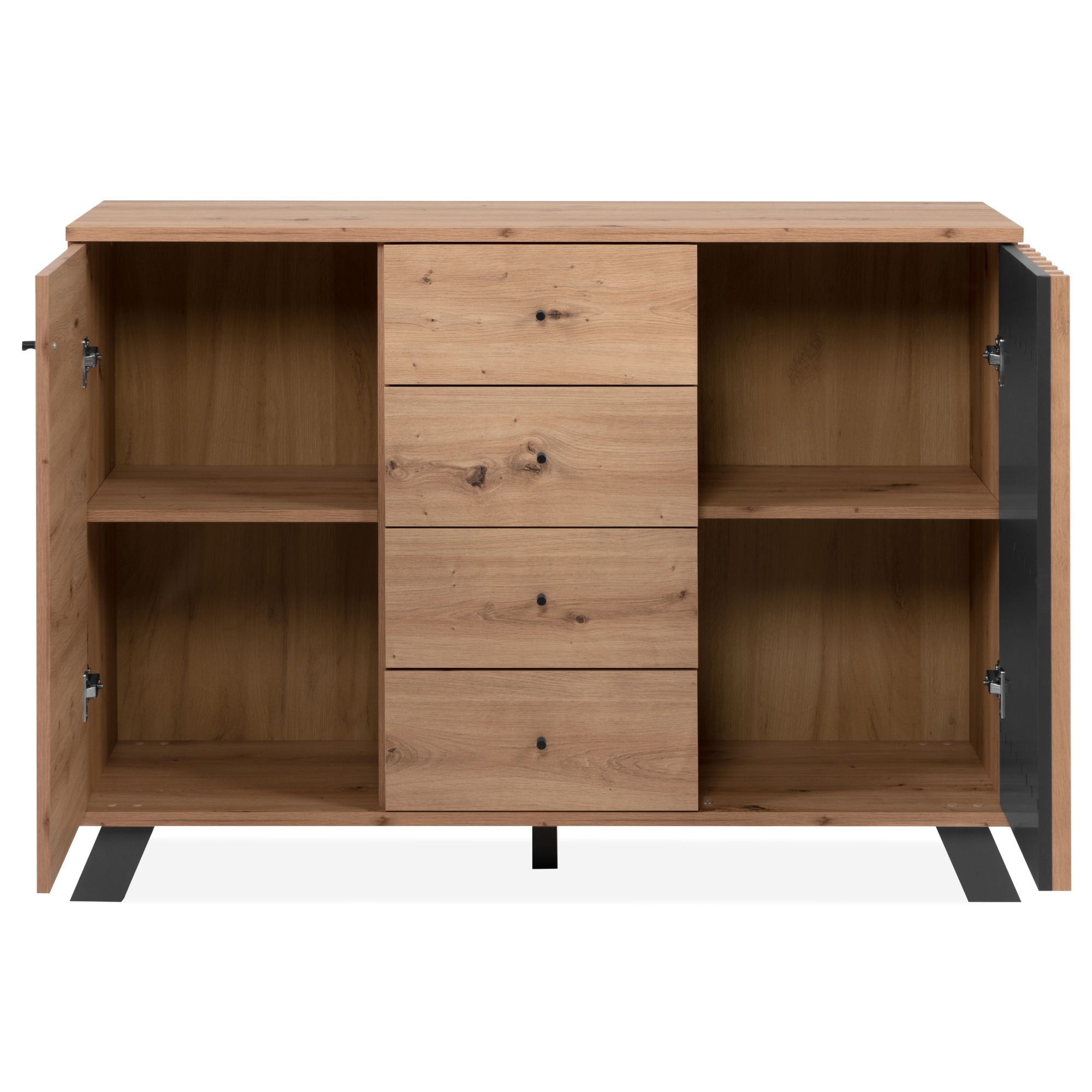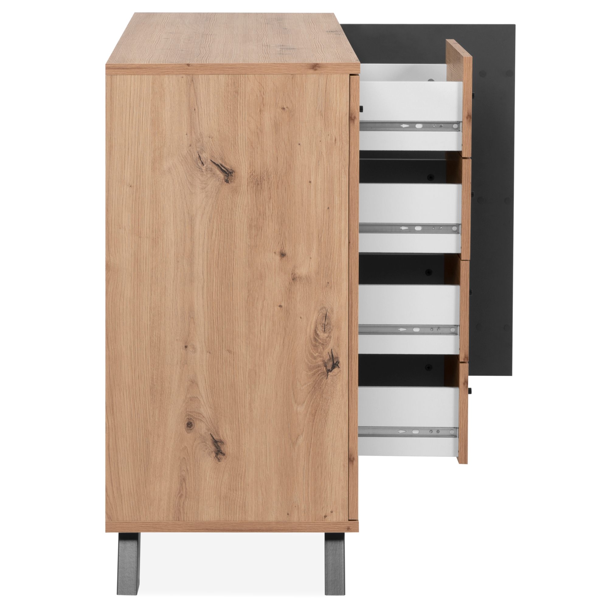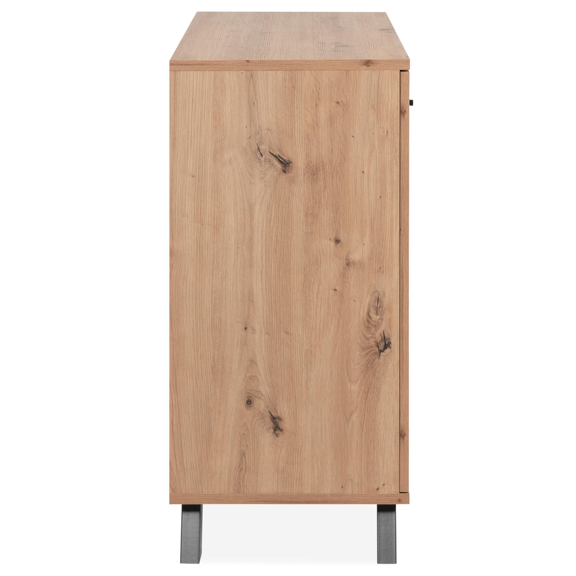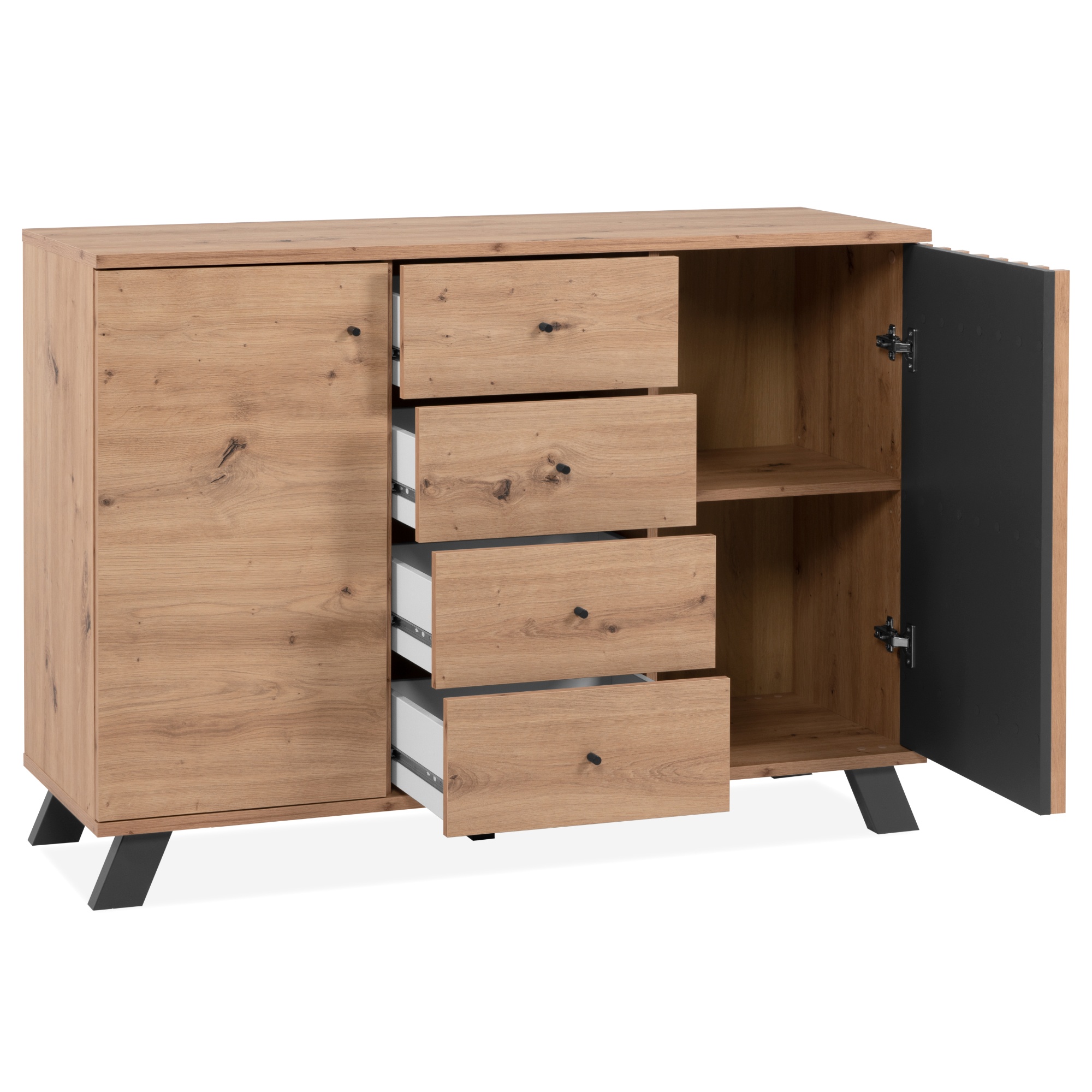 Vyrobená je z laminovaných dřevotřískových desek, které se vyznačují snadnou udržovatelností i dlouho životností. Laděná je pak do dekoru dubu artisan s výraznou kresbou dřeva, které interiér zútulňuje a obohacuje o přírodní nádech, styl doplňuje stabilní podnož z MDF materiálu v kontrastním antracitovém odstínu. Dostatečný úložný prostor zajišťují vnitřní police a prostřední čtyři zásuvky, pravá část je navíc doplněna o dekorativní dvířka. Celkovou manipulaci usnadňují decentní úchytky z kovu.