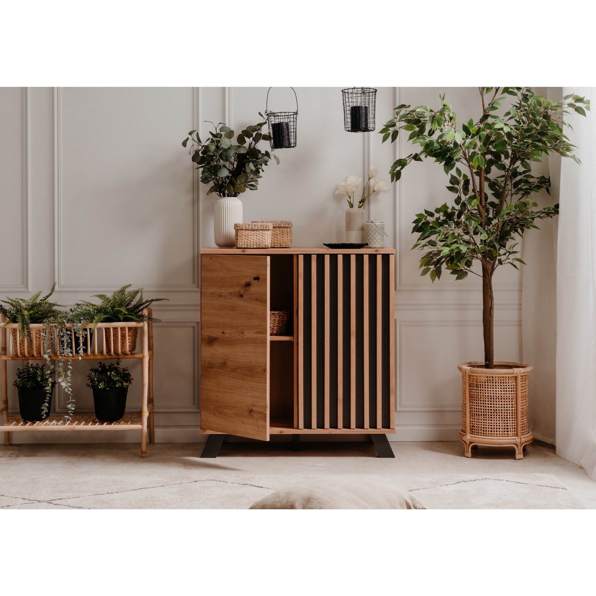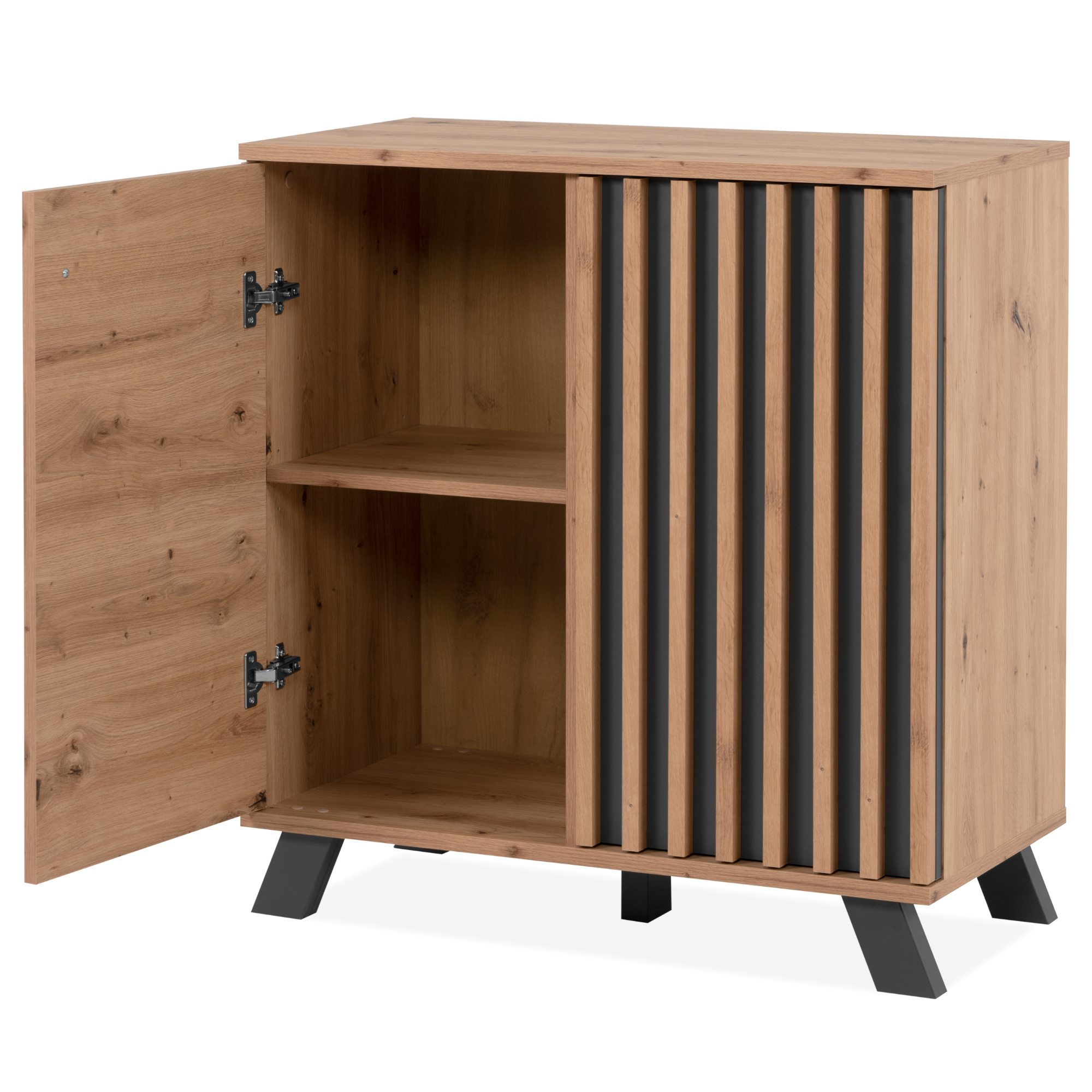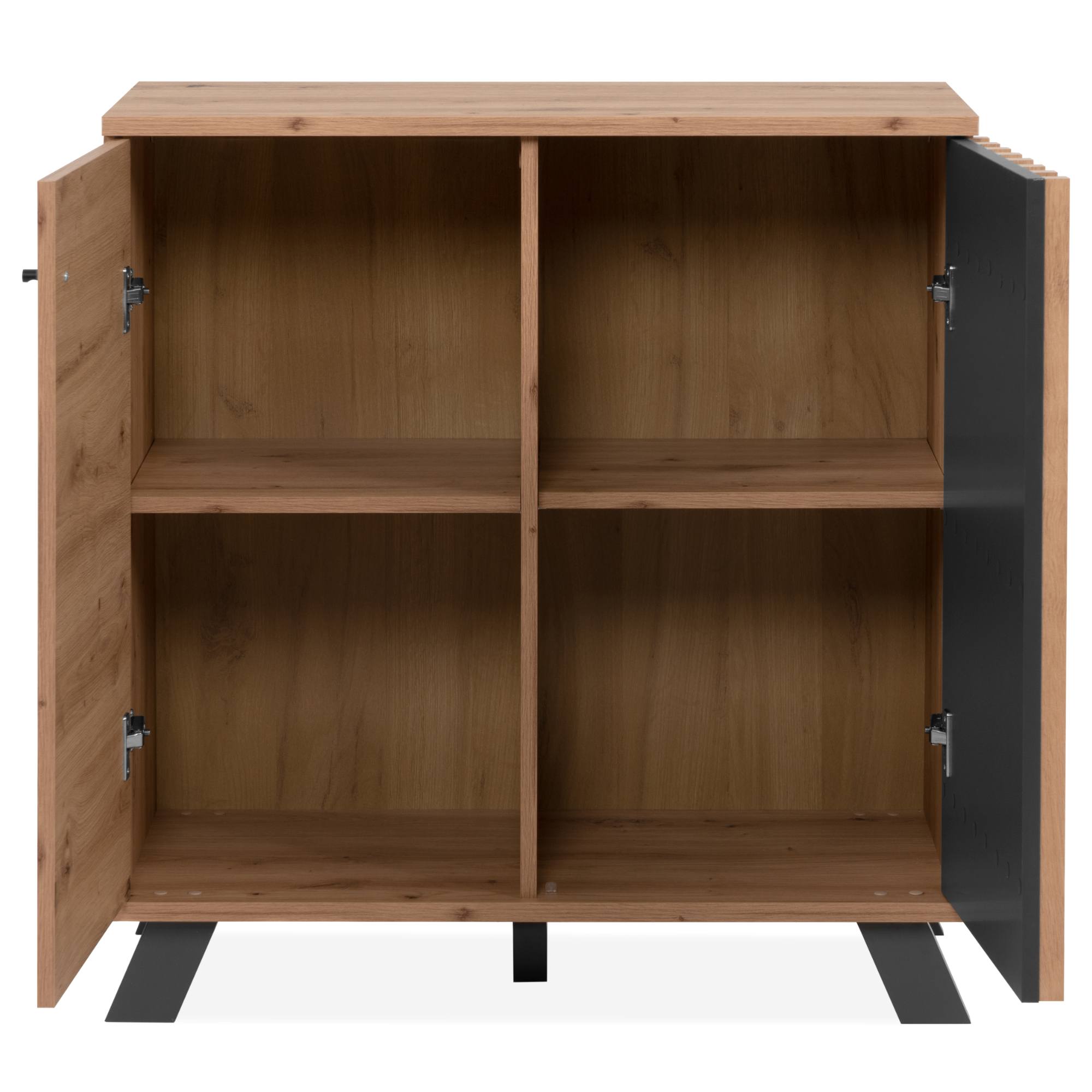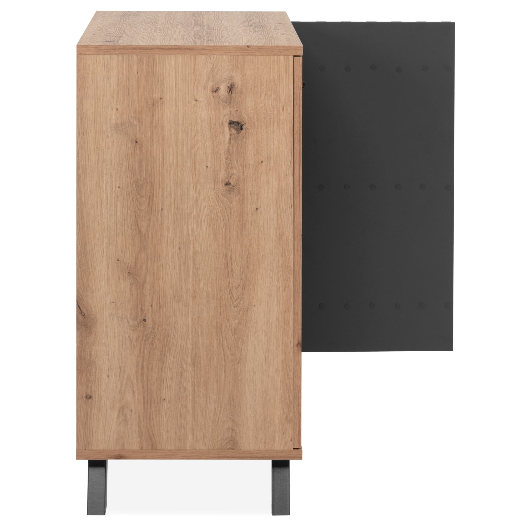 Vyrobená je z laminovaných dřevotřískových desek, které se vyznačují snadnou udržovatelností i dlouho životností. Laděná je pak do dekoru dubu artisan s výraznou kresbou dřeva, které interiér zútulňuje a obohacuje o přírodní nádech, styl doplňuje stabilní podnož z MDF materiálu v kontrastním antracitovém odstínu. Dostatečný úložný prostor zajišťují vnitřní police, pravá část je navíc doplněna o dekorativní dvířka. Celkovou manipulaci usnadňují decentní úchytky z kovu.