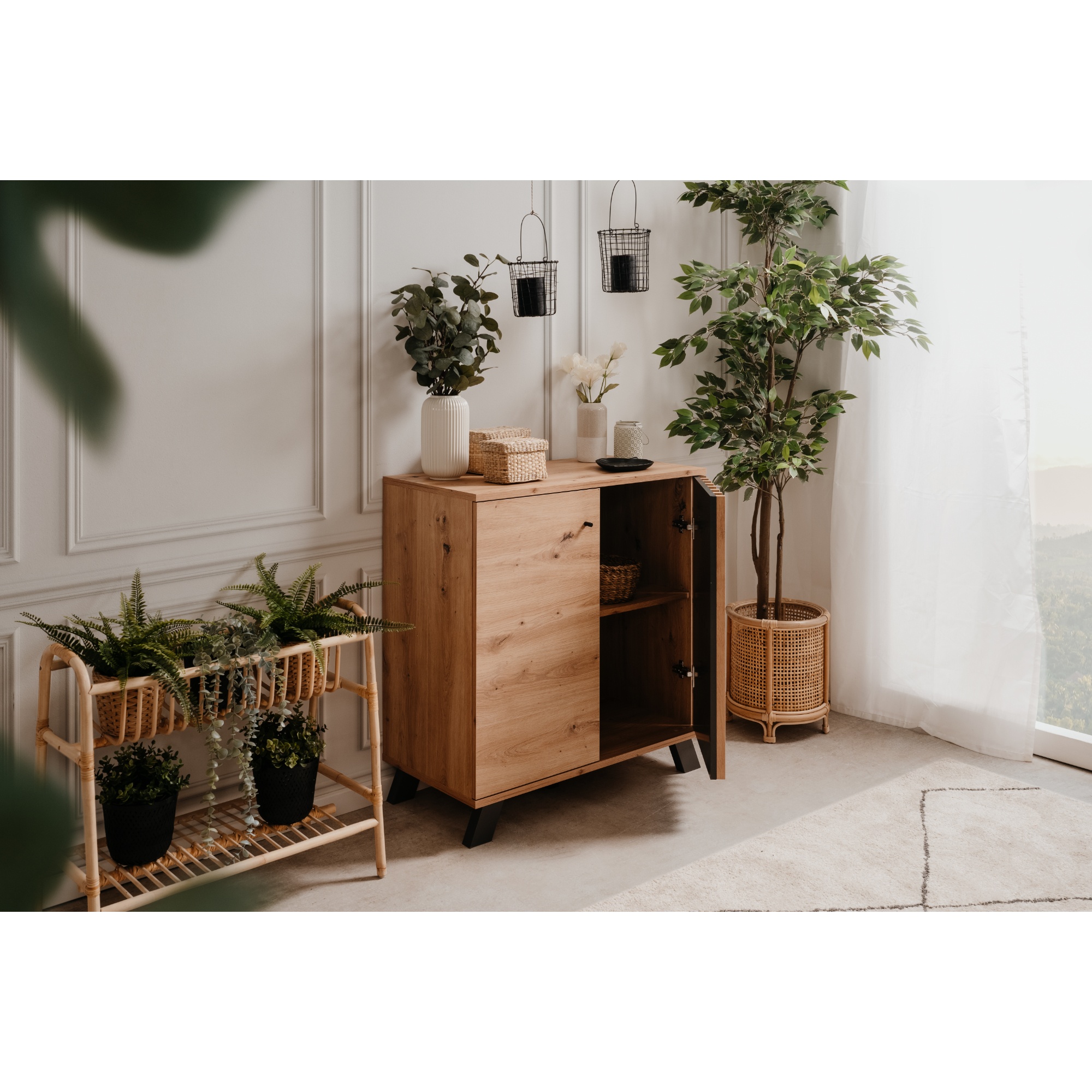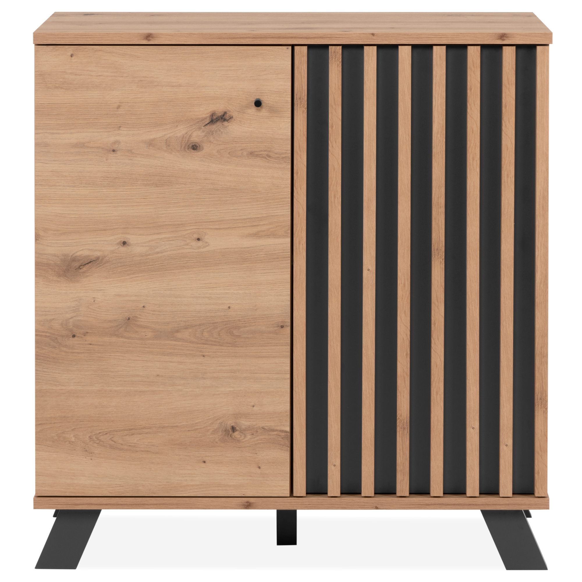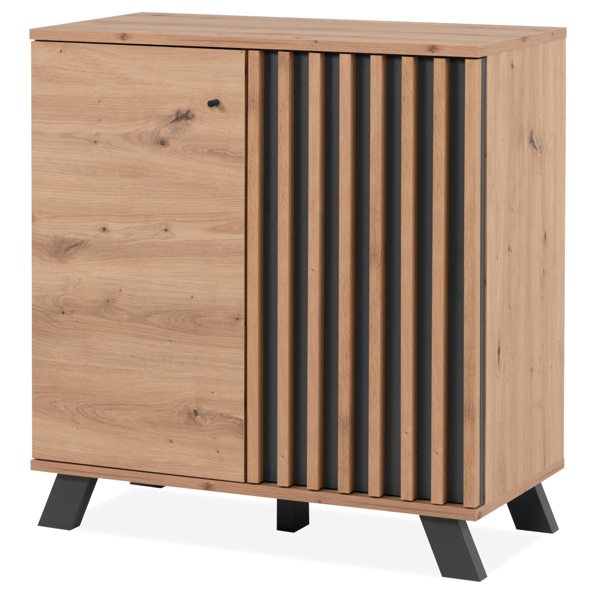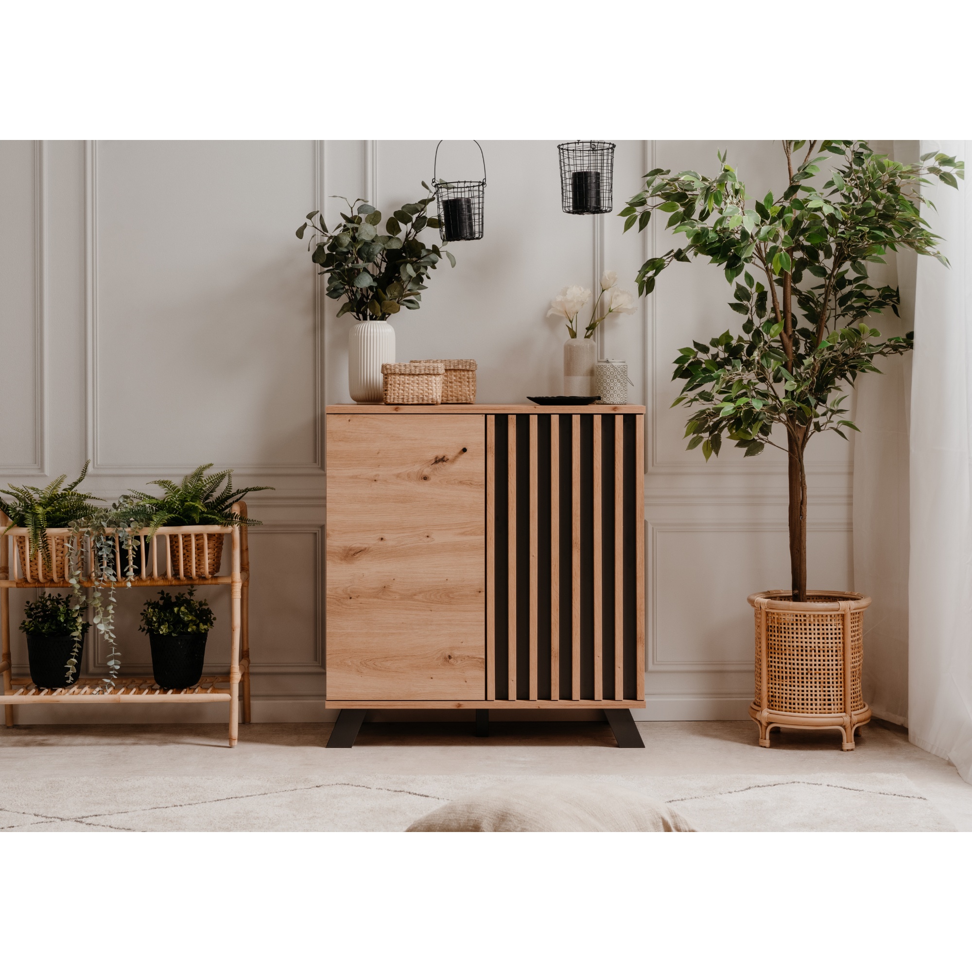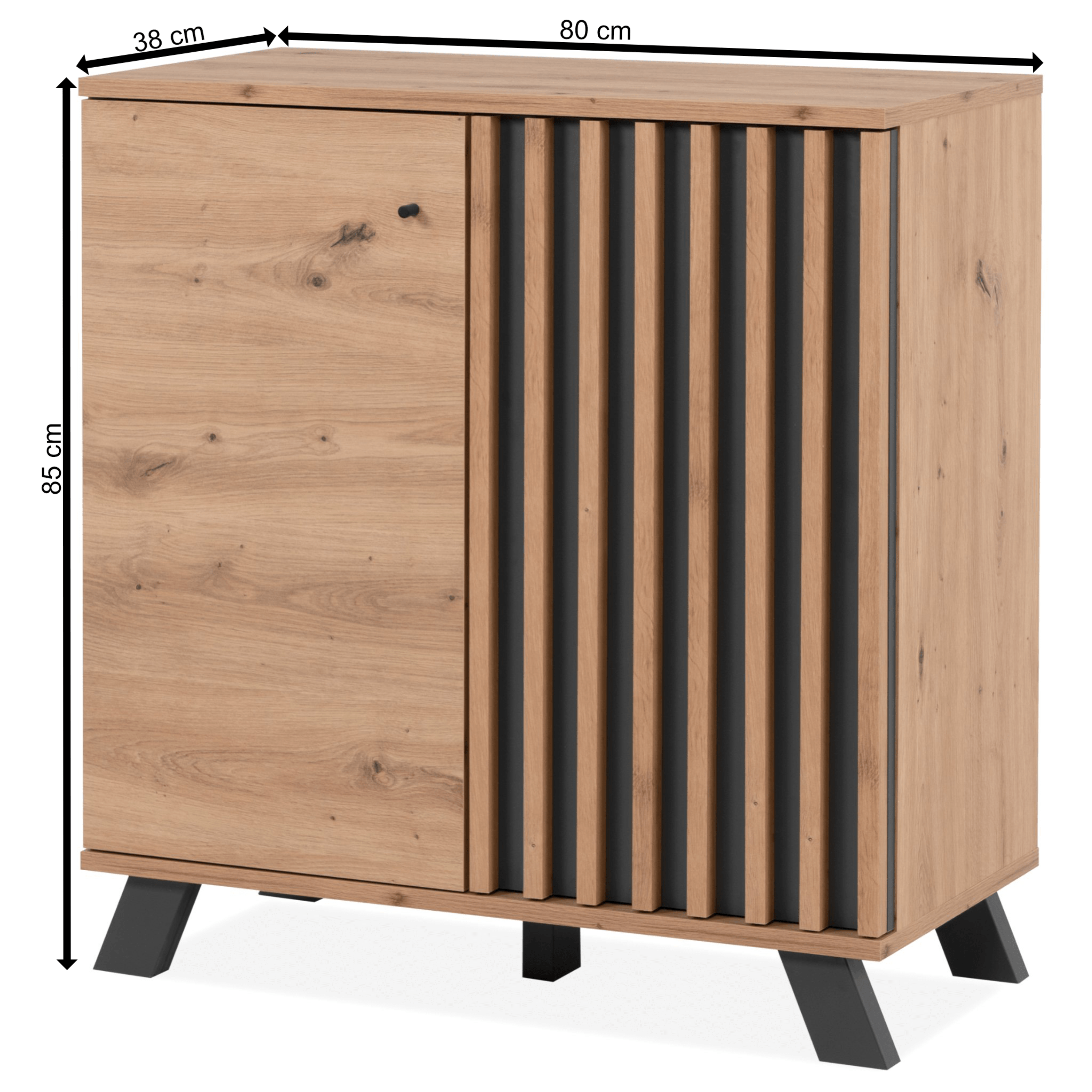 Vyrobená je z laminovaných dřevotřískových desek, které se vyznačují snadnou udržovatelností i dlouho životností. Laděná je pak do dekoru dubu artisan s výraznou kresbou dřeva, které interiér zútulňuje a obohacuje o přírodní nádech, styl doplňuje stabilní podnož z MDF materiálu v kontrastním antracitovém odstínu. Dostatečný úložný prostor zajišťují vnitřní police, pravá část je navíc doplněna o dekorativní dvířka. Celkovou manipulaci usnadňují decentní úchytky z kovu.