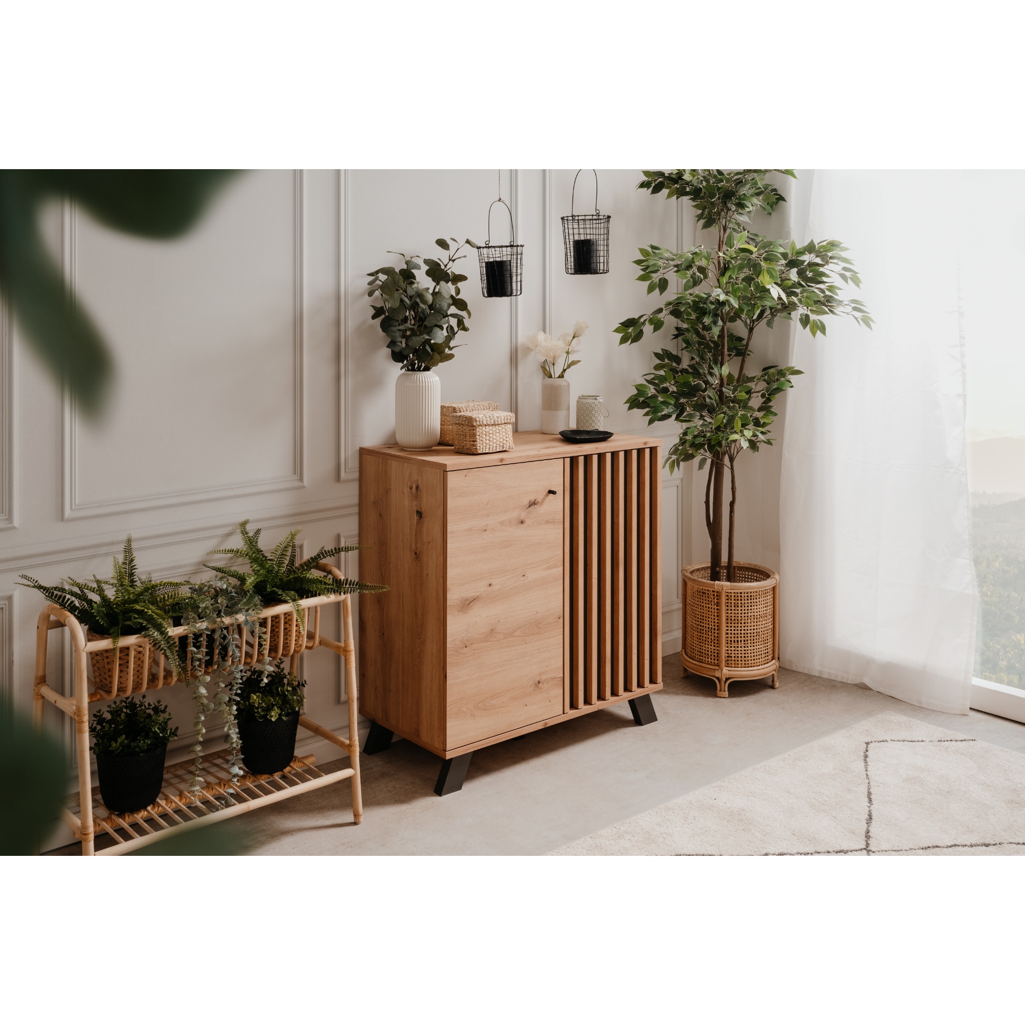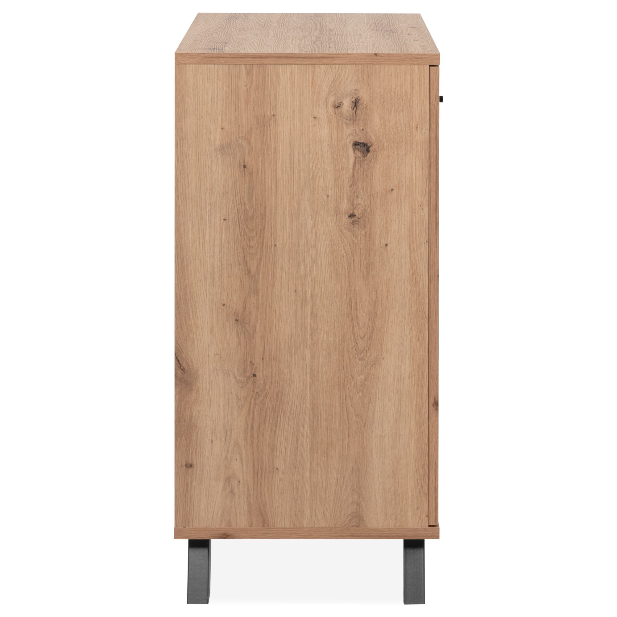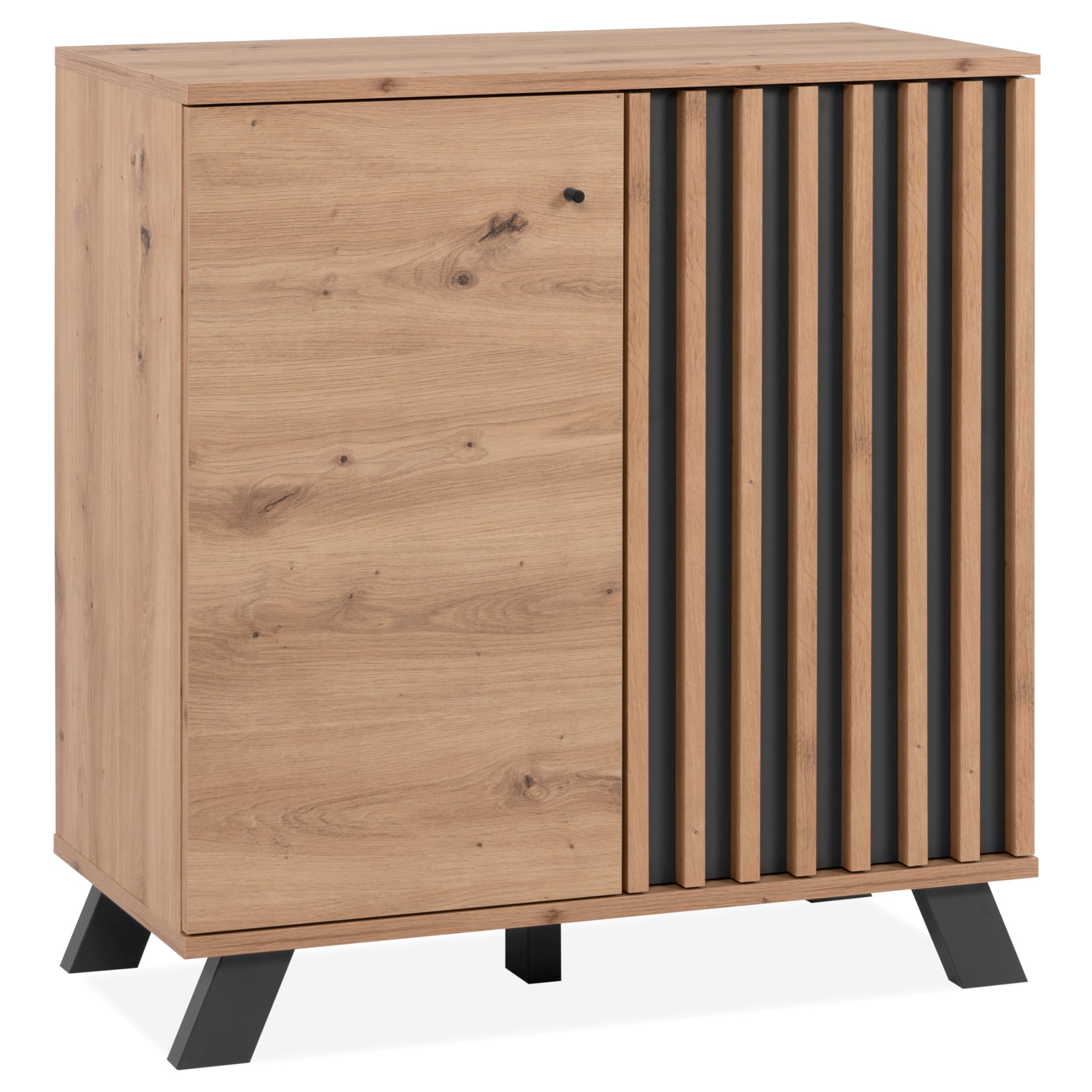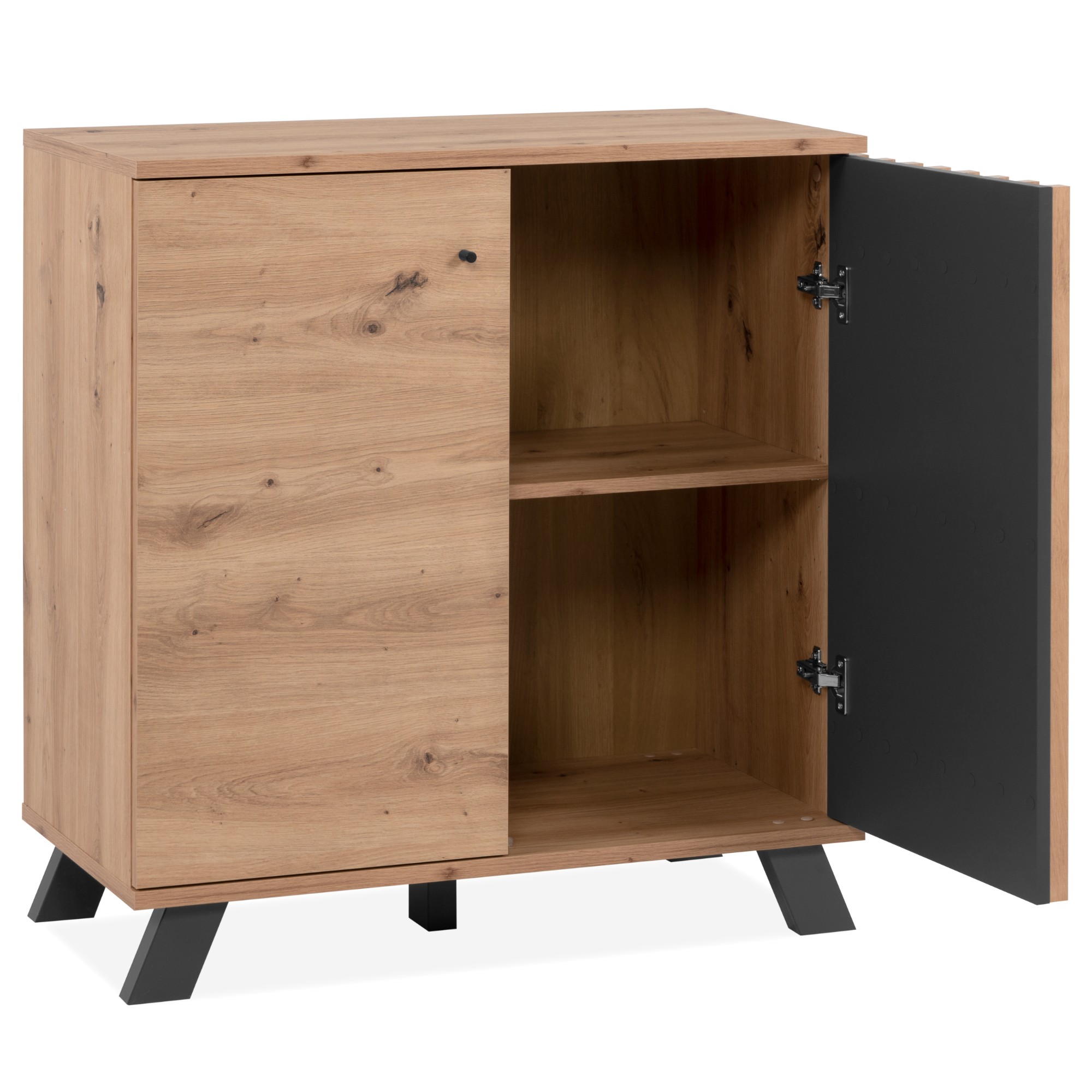 Vyrobená je z laminovaných dřevotřískových desek, které se vyznačují snadnou udržovatelností i dlouho životností. Laděná je pak do dekoru dubu artisan s výraznou kresbou dřeva, které interiér zútulňuje a obohacuje o přírodní nádech, styl doplňuje stabilní podnož z MDF materiálu v kontrastním antracitovém odstínu. Dostatečný úložný prostor zajišťují vnitřní police, pravá část je navíc doplněna o dekorativní dvířka. Celkovou manipulaci usnadňují decentní úchytky z kovu.