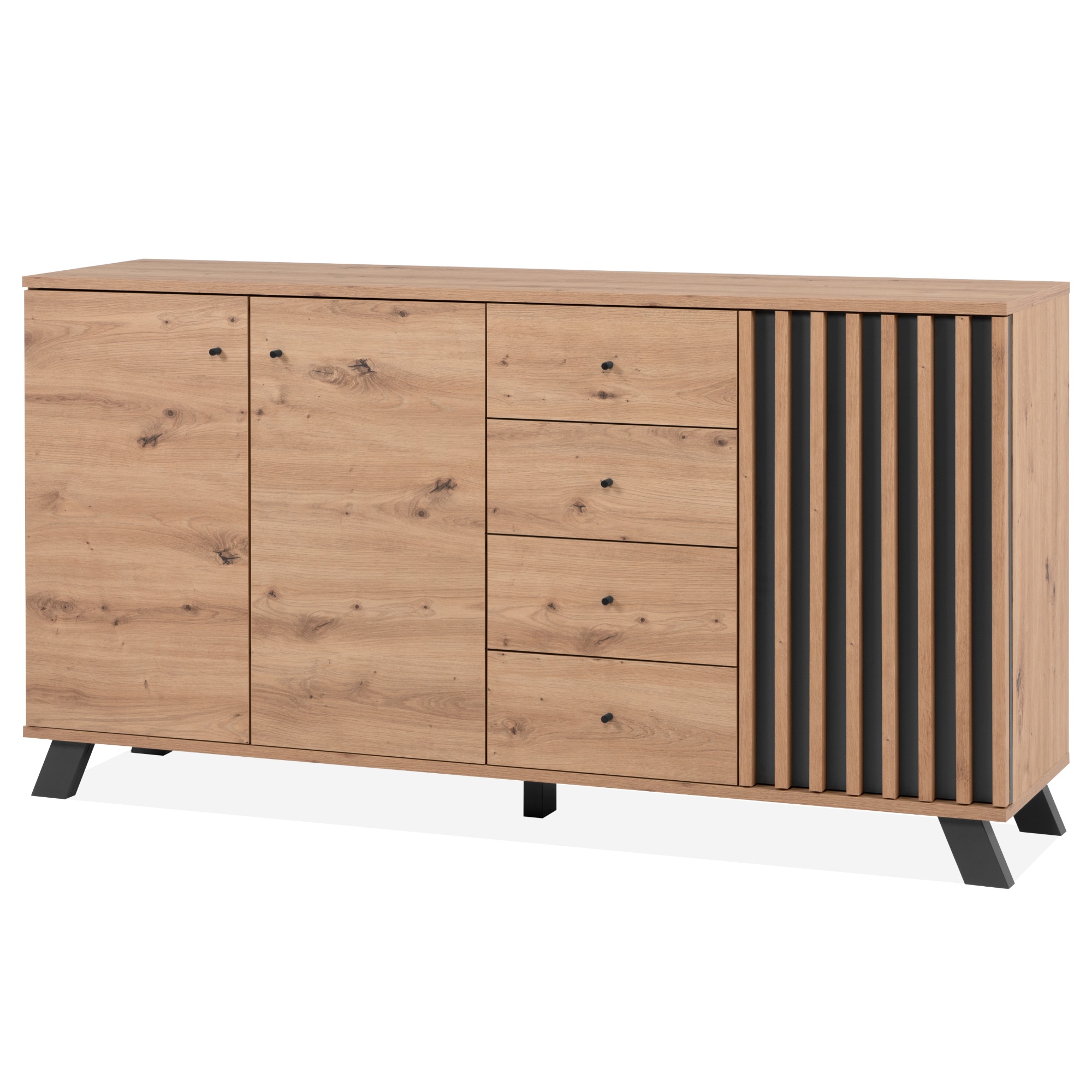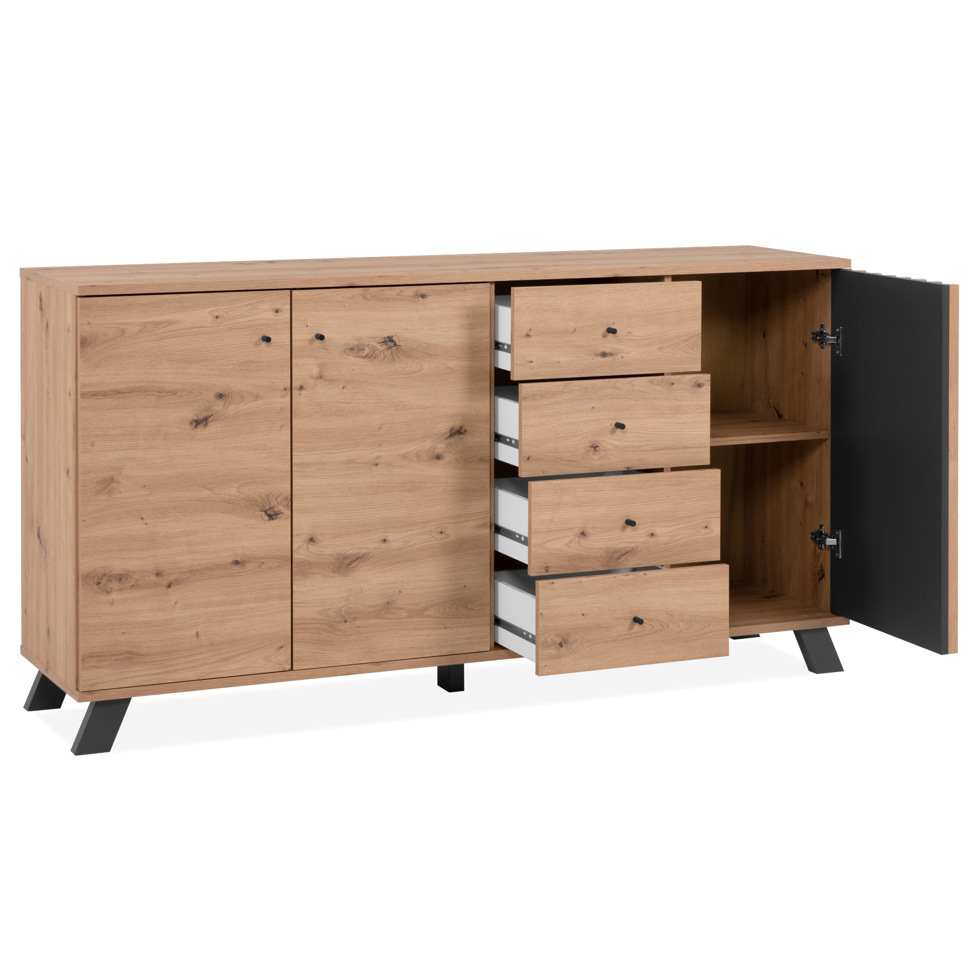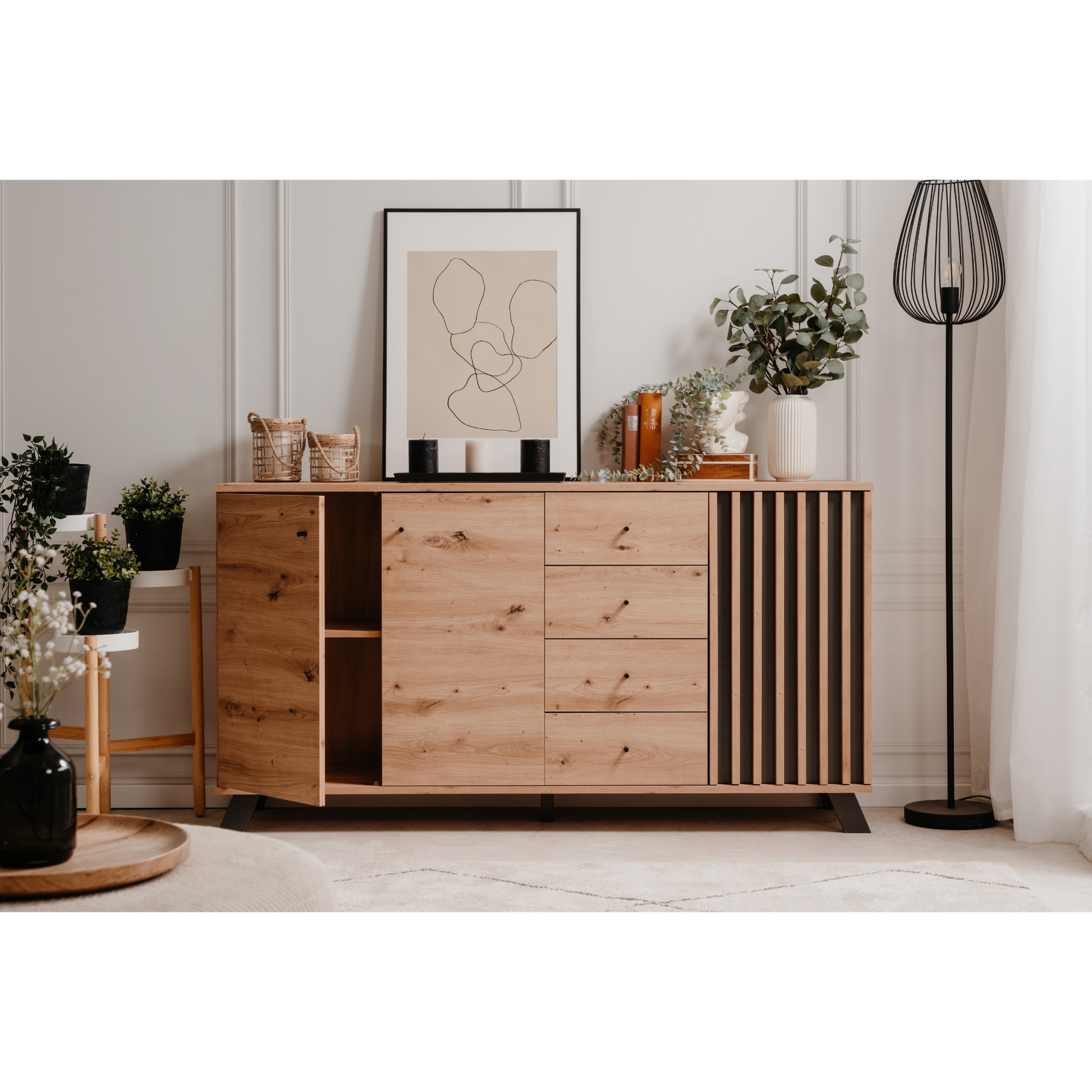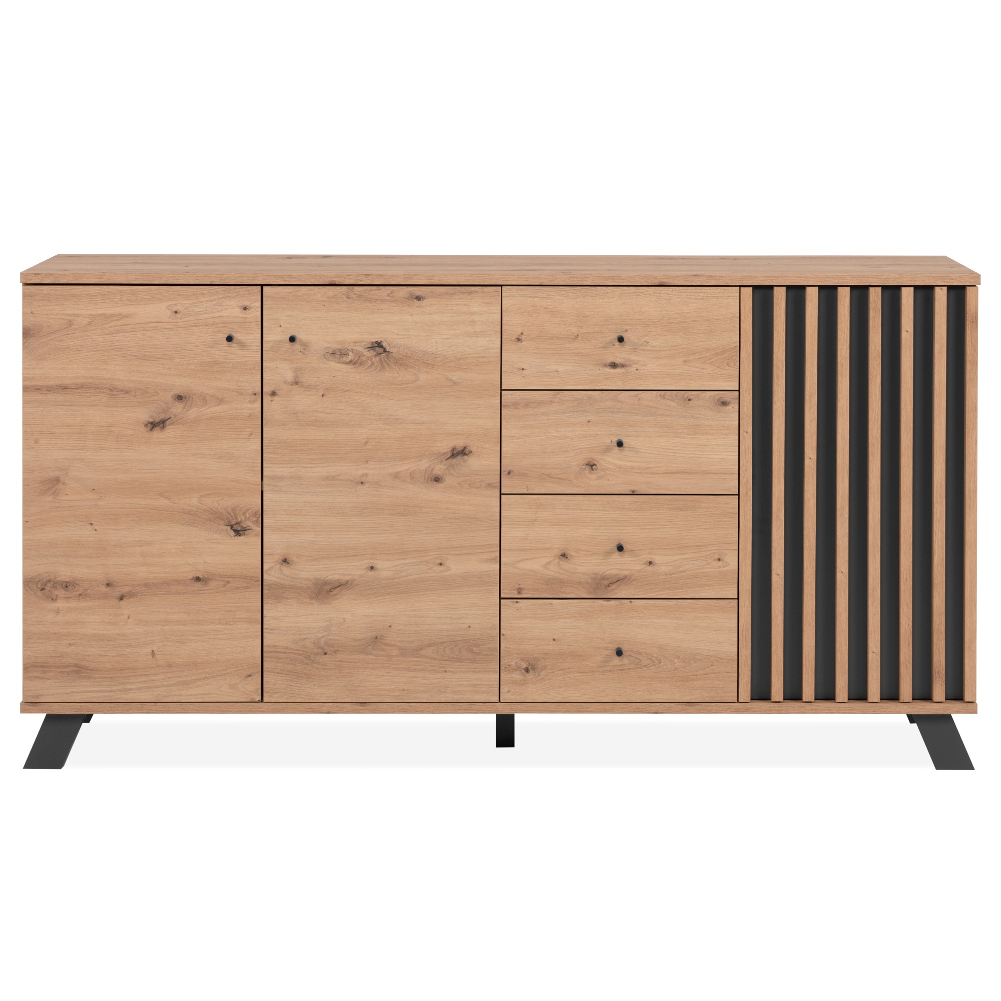 Vyrobená je z laminovaných dřevotřískových desek, které se vyznačují snadnou udržovatelností i dlouho životností. Laděná je pak do dekoru dubu artisan s výraznou kresbou dřeva, které interiér zútulňuje a obohacuje o přírodní nádech, styl doplňuje stabilní podnož z MDF materiálu v kontrastním antracitovém odstínu. Dostatečný úložný prostor zajišťují vnitřní police a prostřední čtyři zásuvky, pravá část je navíc doplněna o dekorativní dvířka. Celkovou manipulaci usnadňují decentní úchytky z kovu.