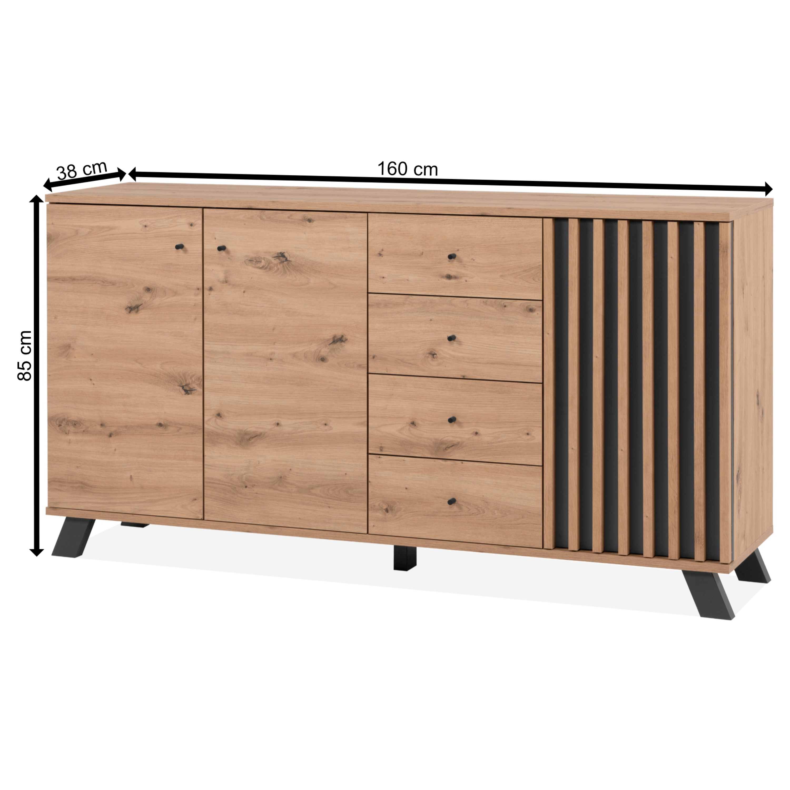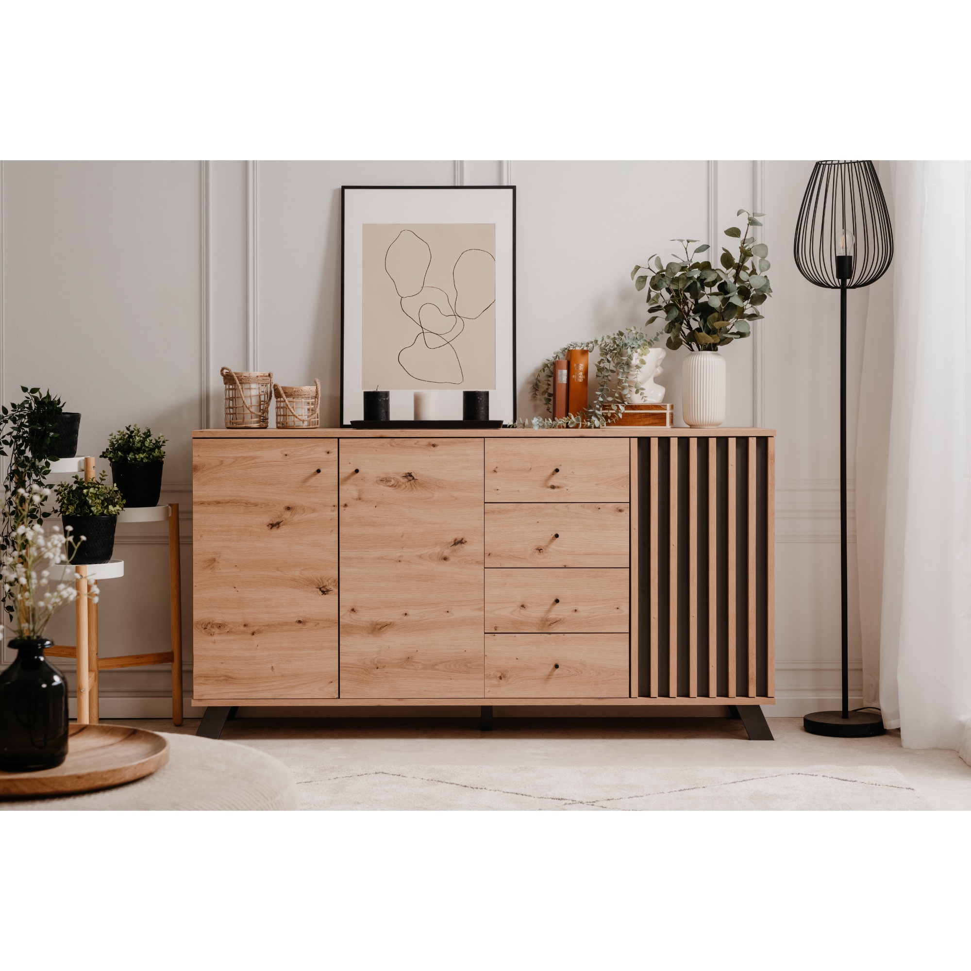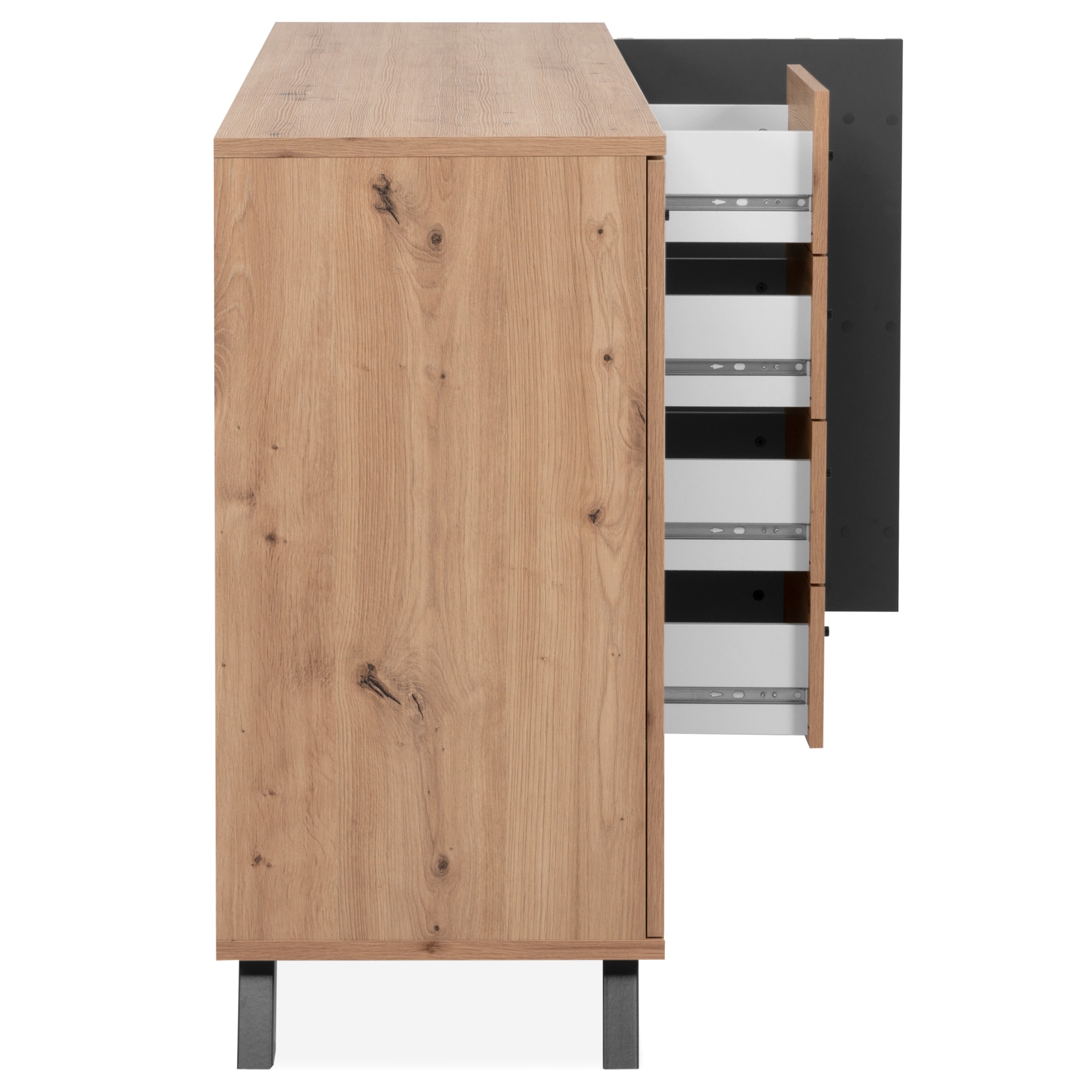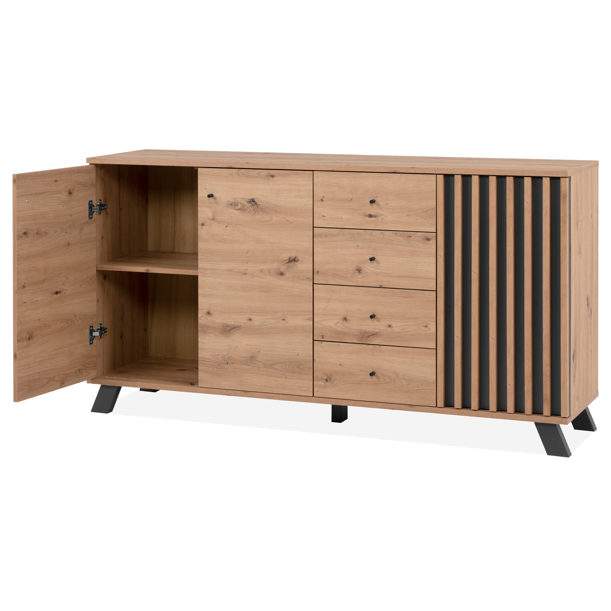 Vyrobená je z laminovaných dřevotřískových desek, které se vyznačují snadnou udržovatelností i dlouho životností. Laděná je pak do dekoru dubu artisan s výraznou kresbou dřeva, které interiér zútulňuje a obohacuje o přírodní nádech, styl doplňuje stabilní podnož z MDF materiálu v kontrastním antracitovém odstínu. Dostatečný úložný prostor zajišťují vnitřní police a prostřední čtyři zásuvky, pravá část je navíc doplněna o dekorativní dvířka. Celkovou manipulaci usnadňují decentní úchytky z kovu.