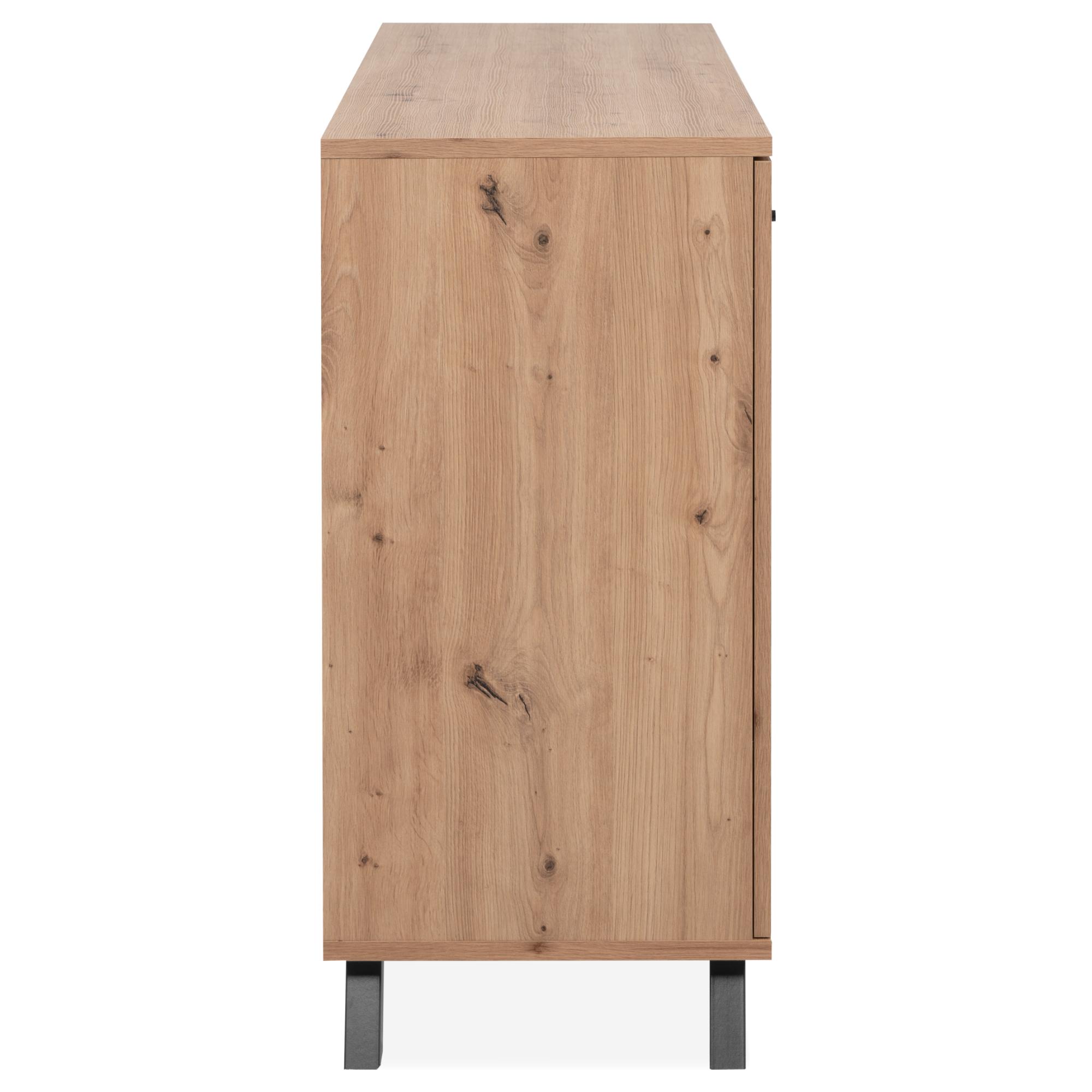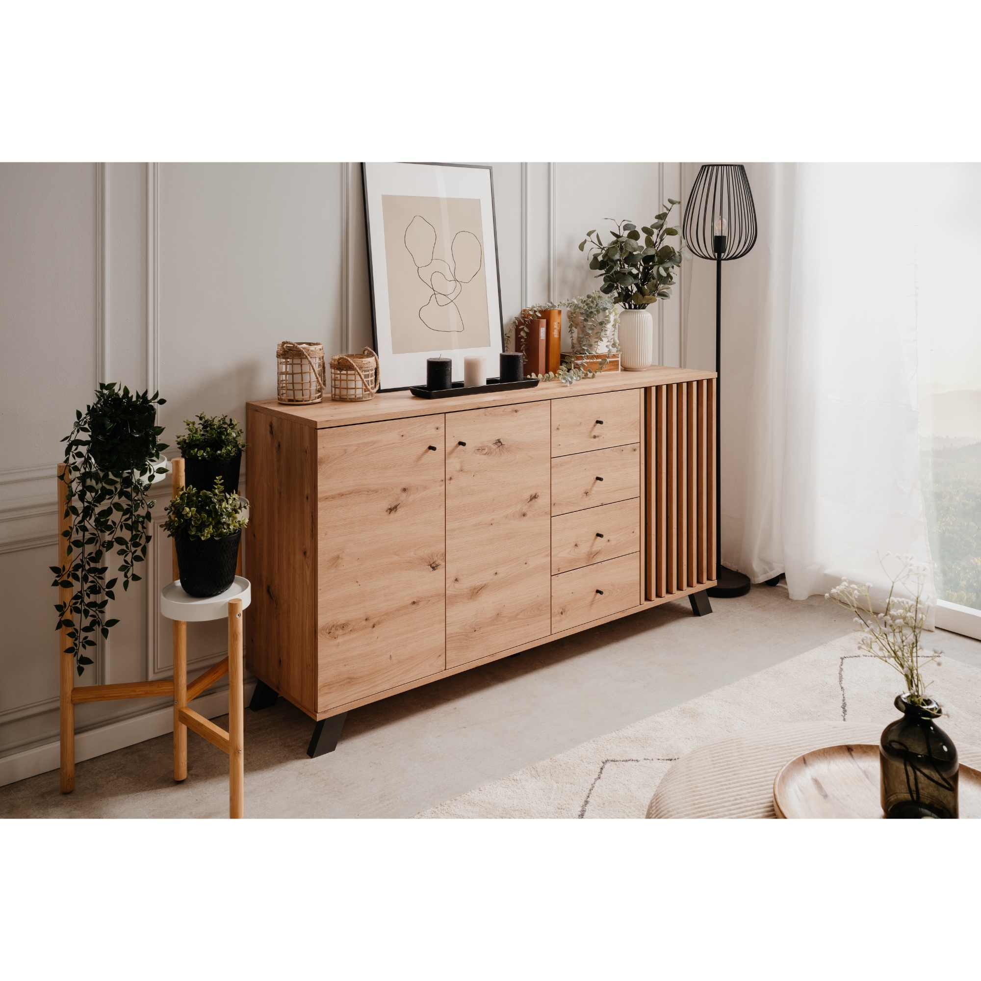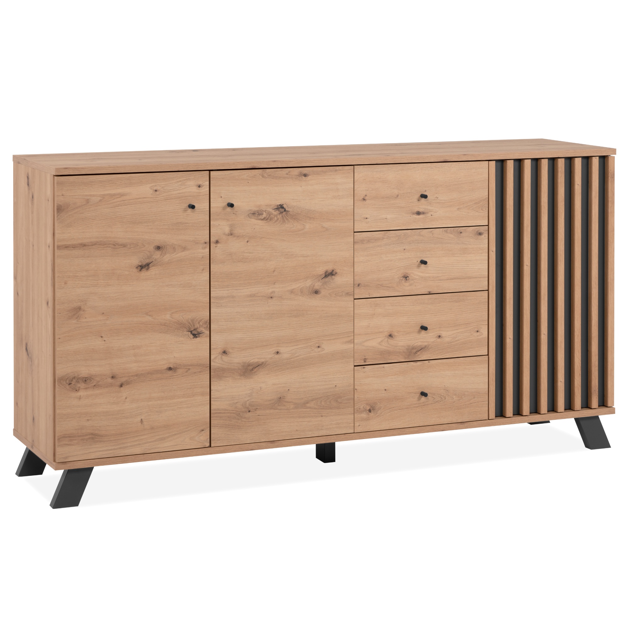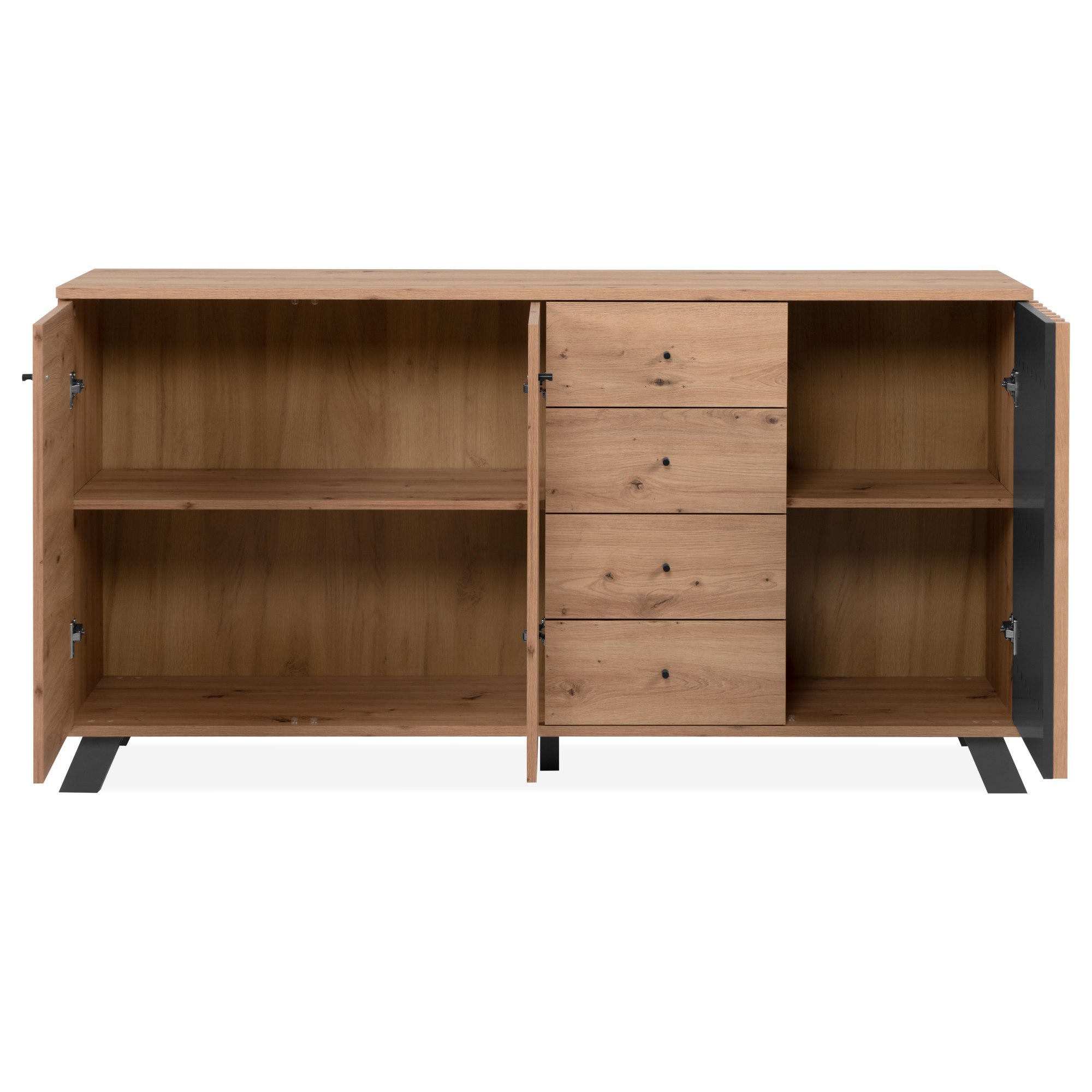 Vyrobená je z laminovaných dřevotřískových desek, které se vyznačují snadnou udržovatelností i dlouho životností. Laděná je pak do dekoru dubu artisan s výraznou kresbou dřeva, které interiér zútulňuje a obohacuje o přírodní nádech, styl doplňuje stabilní podnož z MDF materiálu v kontrastním antracitovém odstínu. Dostatečný úložný prostor zajišťují vnitřní police a prostřední čtyři zásuvky, pravá část je navíc doplněna o dekorativní dvířka. Celkovou manipulaci usnadňují decentní úchytky z kovu.