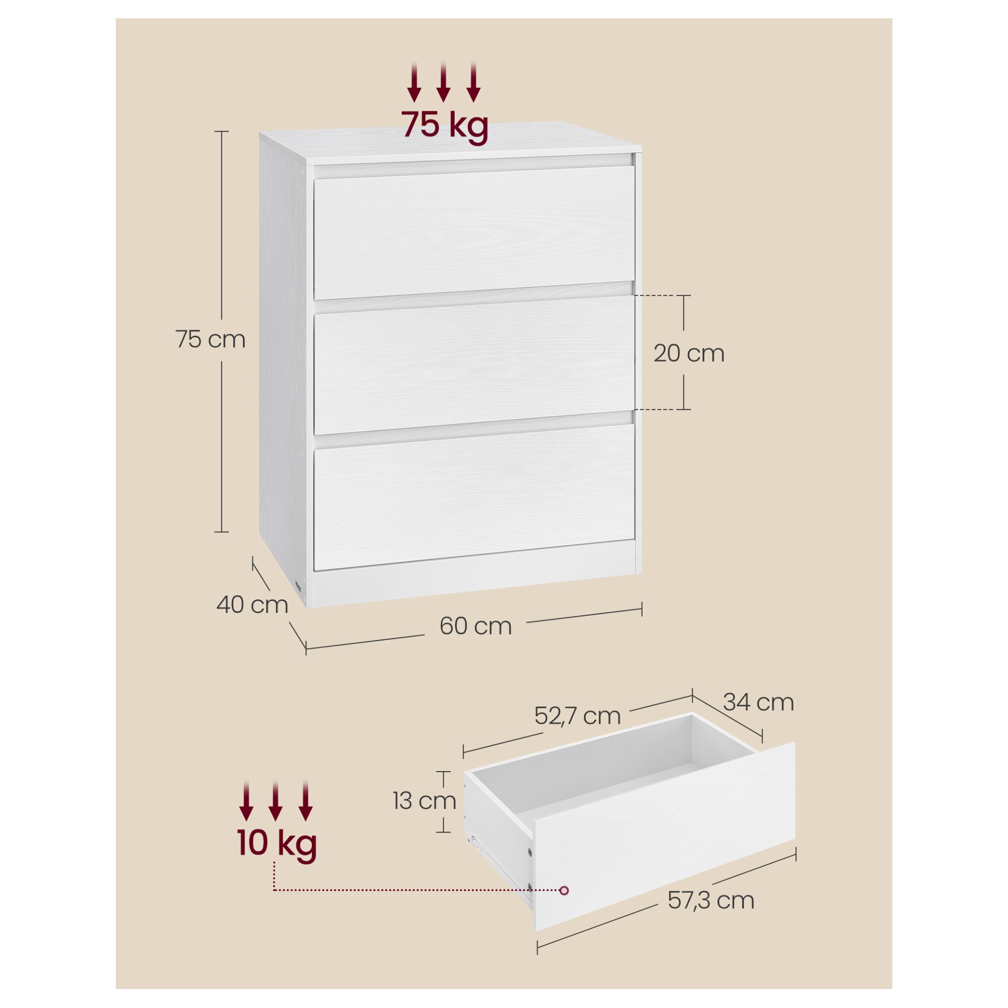Pokud jde o úložný prostor, nabízí komoda KAILYN 3 zásuvky. Nosnost jedné zásuvky je 10 kg, nosnost horní desky je 75 kg.