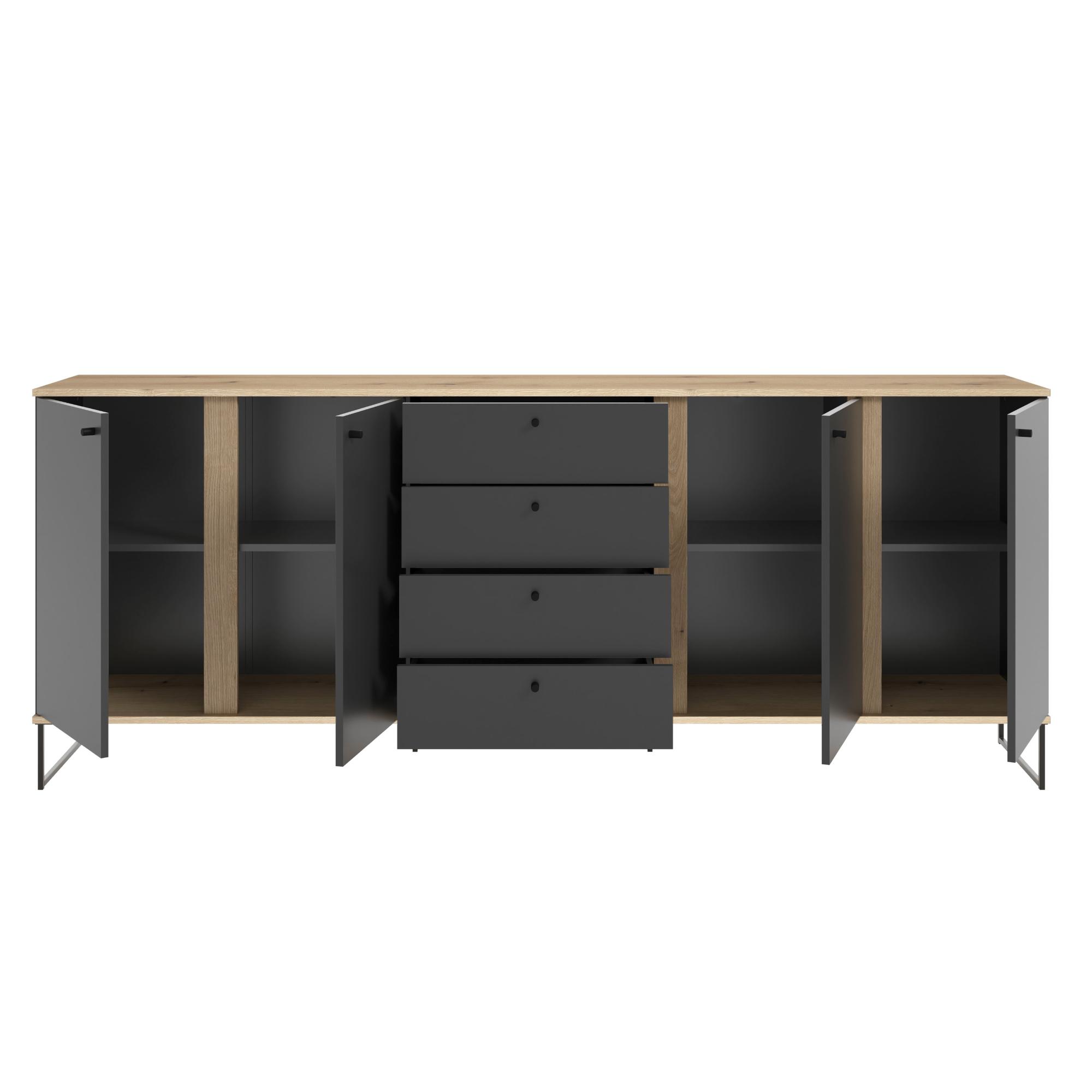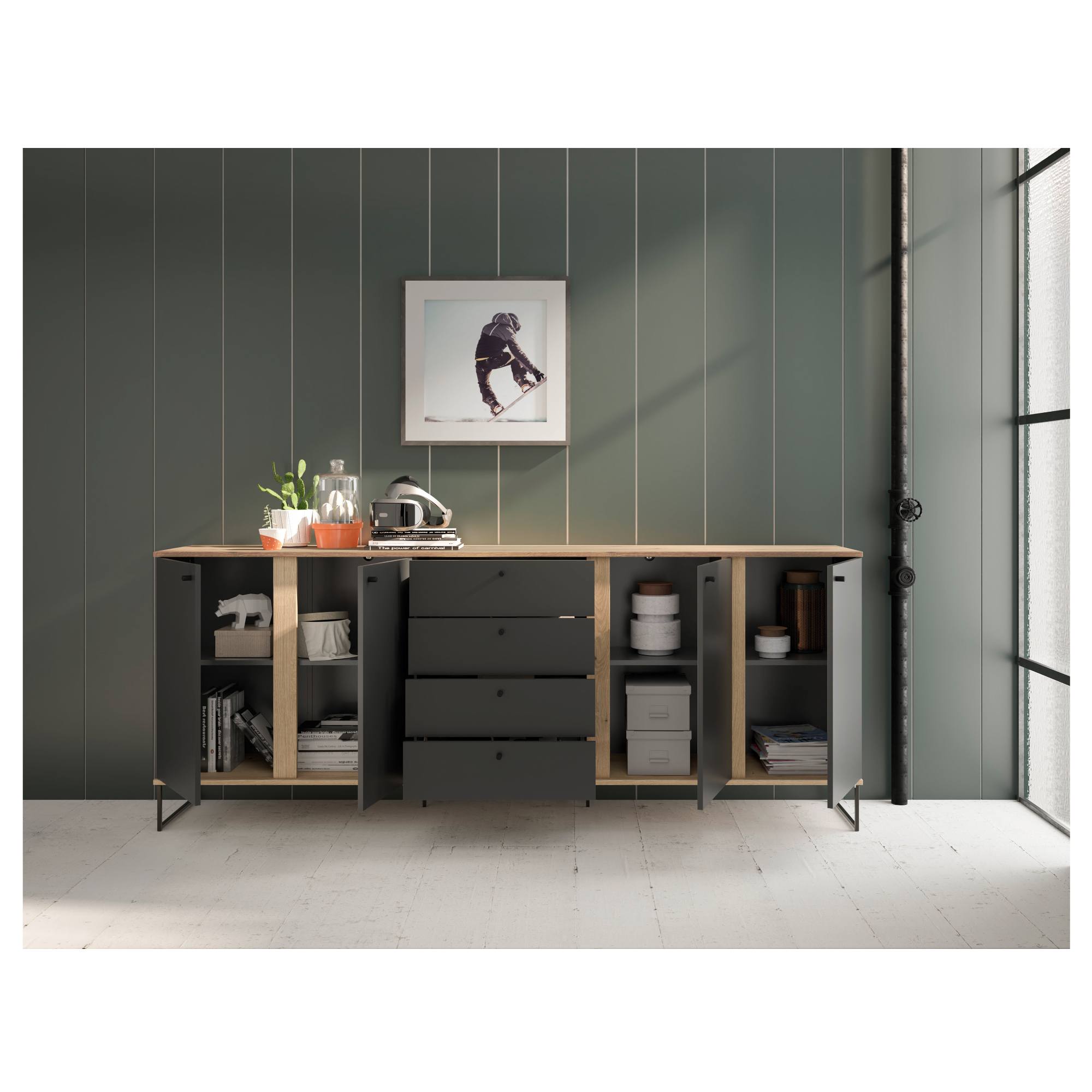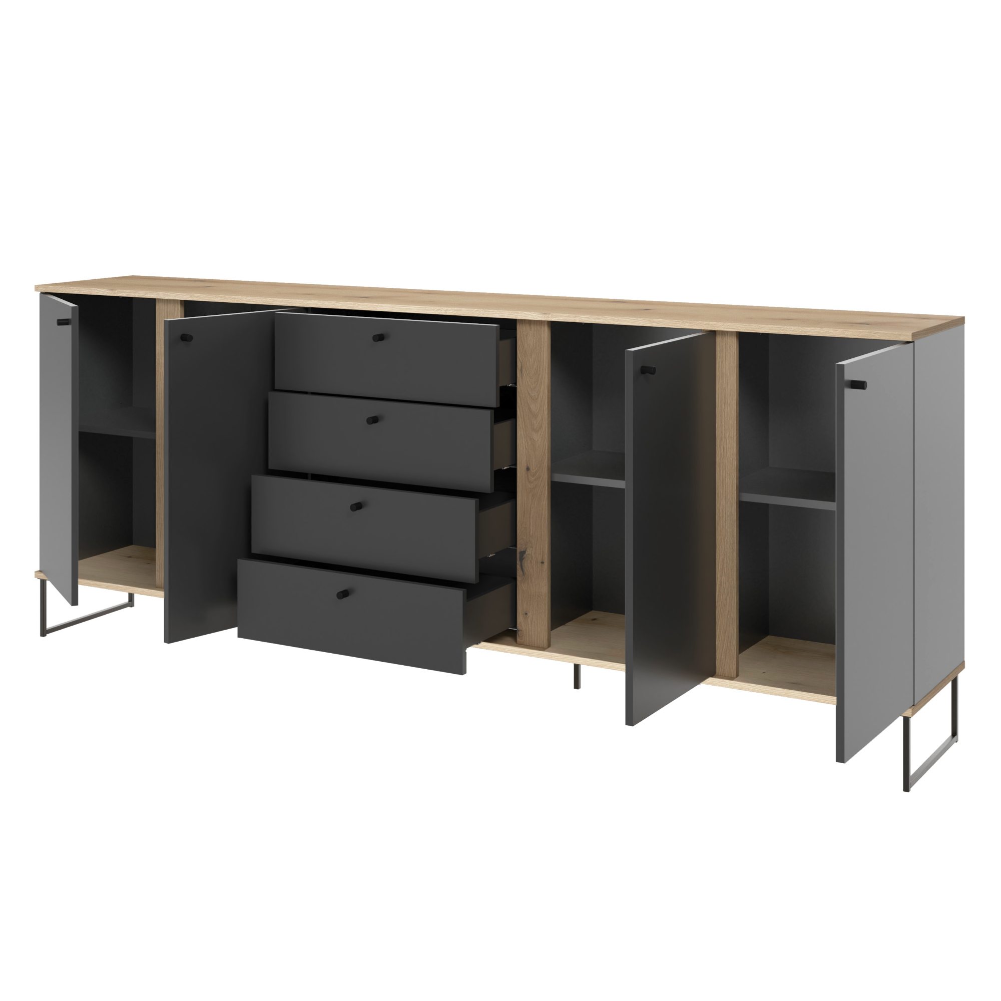 Kromě vzhledu vás komoda potěší i dostatkem úložného prostoru. Za jejími dvířky najdete 4 vložené police, které vám umožní přehledné uložená všeho, co se do komody rozhodnete umístit. Nechybí ani 4 praktické zásuvky. Aby se s dvířky a zásuvkami dobře manipulovalo, jsou vybaveny plastovými úchyty.