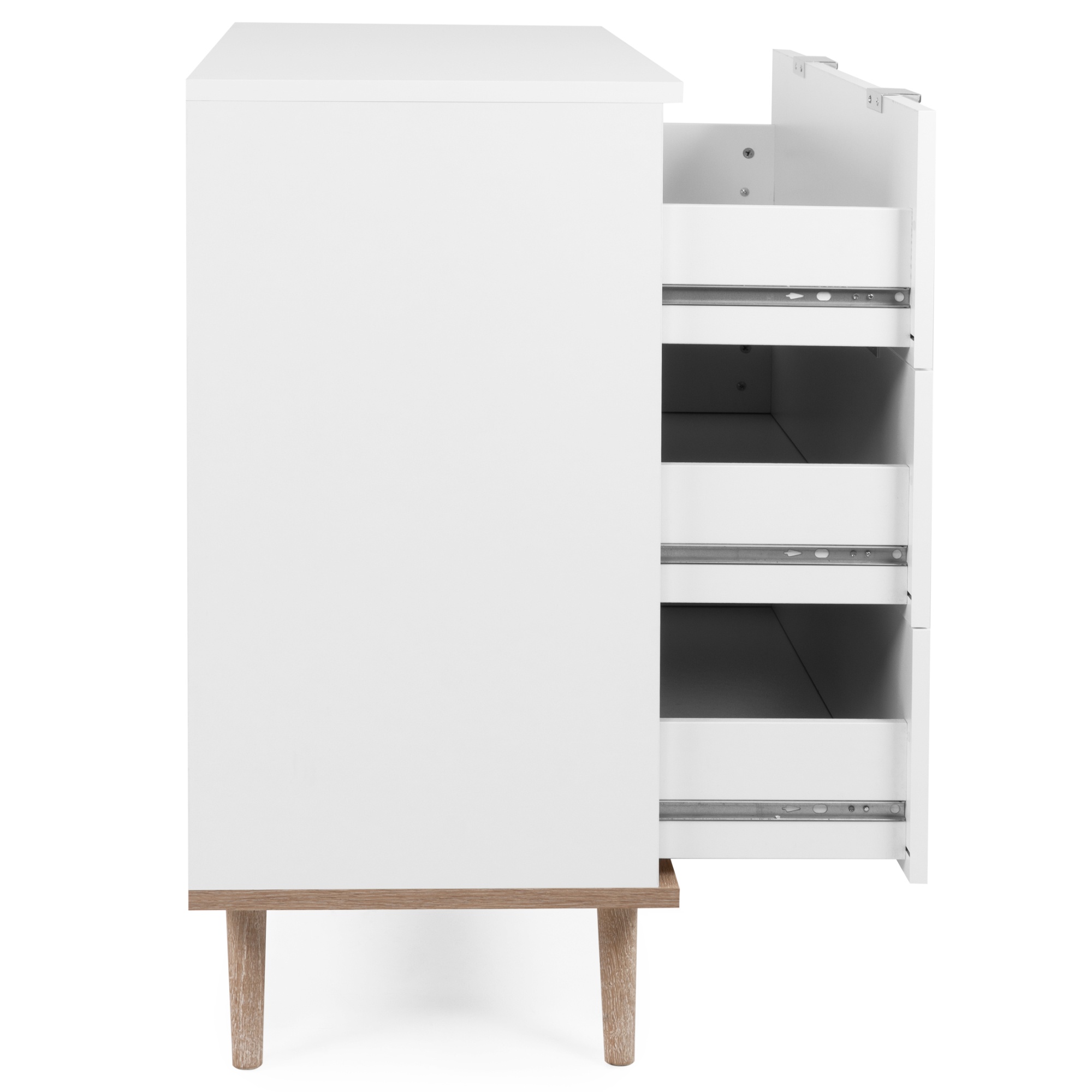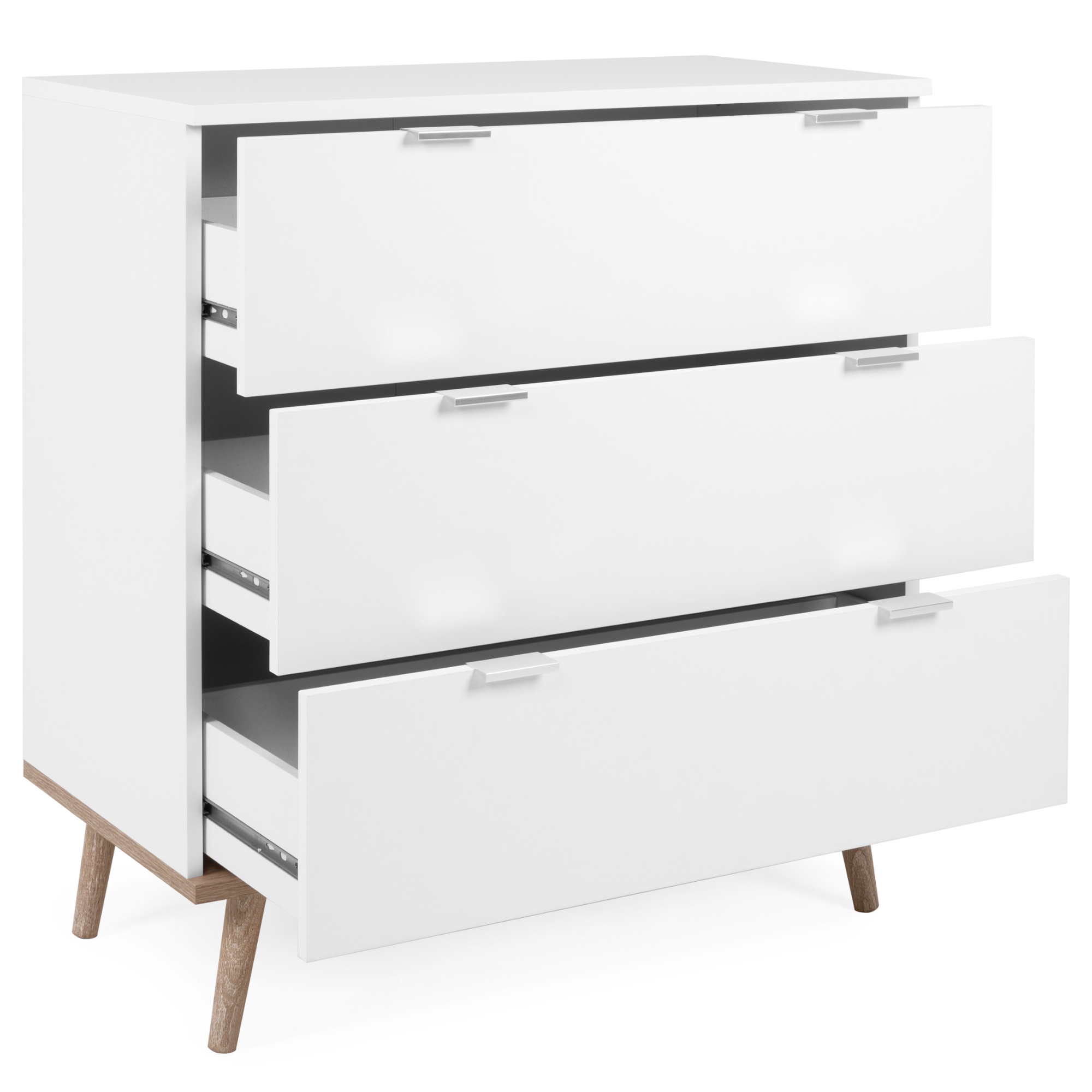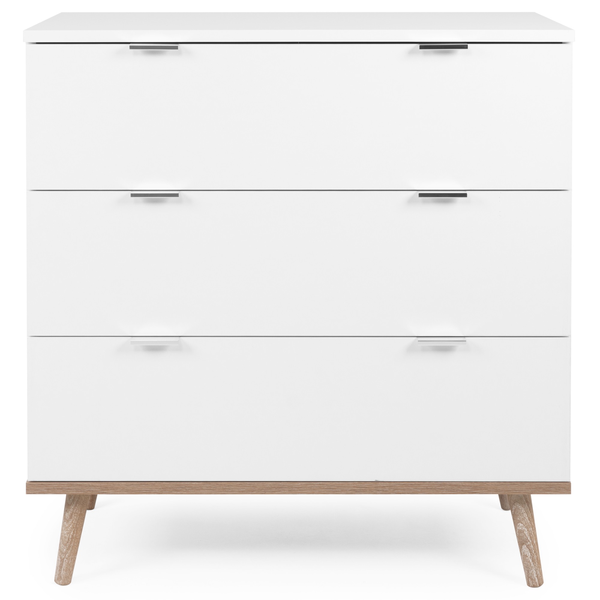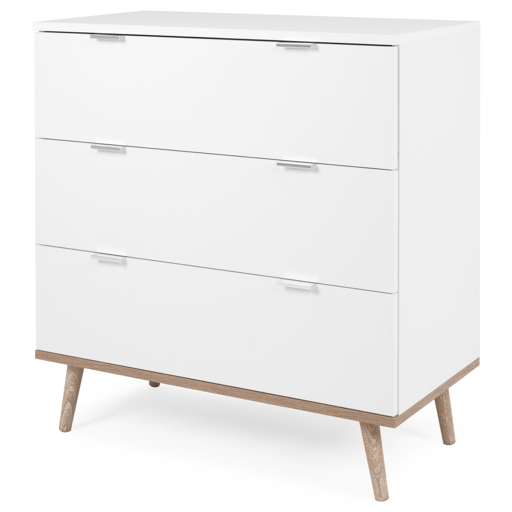 Vyrobena je z laminovaného dřevěného materiálu s ABS hranami, pro který je typická snadná udržovatelnost i dlouhá životnost. Maximální stabilitu zajišťuje podnož z masivního dřeva. Kontrastní barevné provedení, ve kterém se střetává bílá s dekorem dubu sonoma, navíc domácnosti vdechne jiskru i dojem přírody. Pro uložení všeho potřebného využijete tři zásuvky, jejich manipulaci usnadňují kovové úchytky.