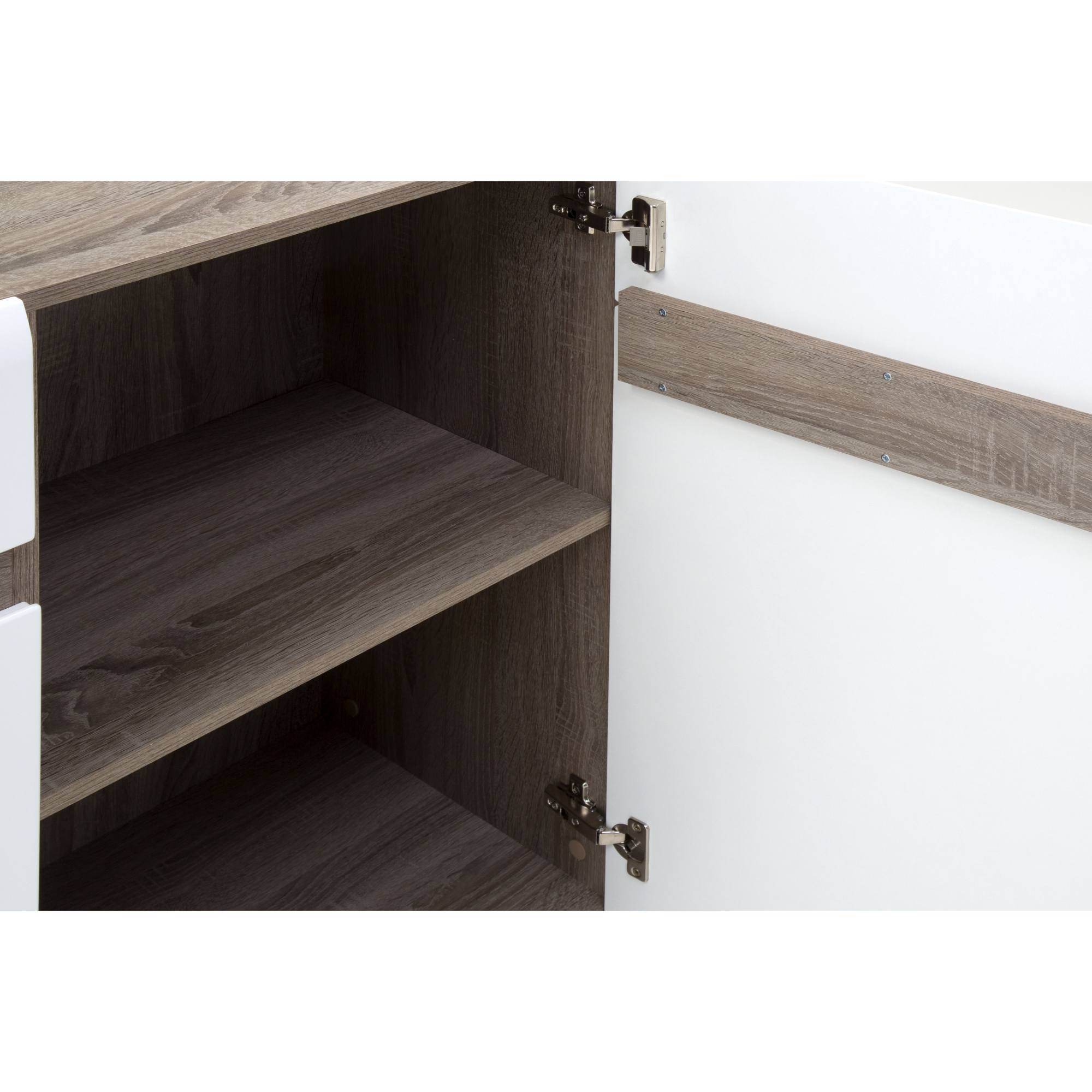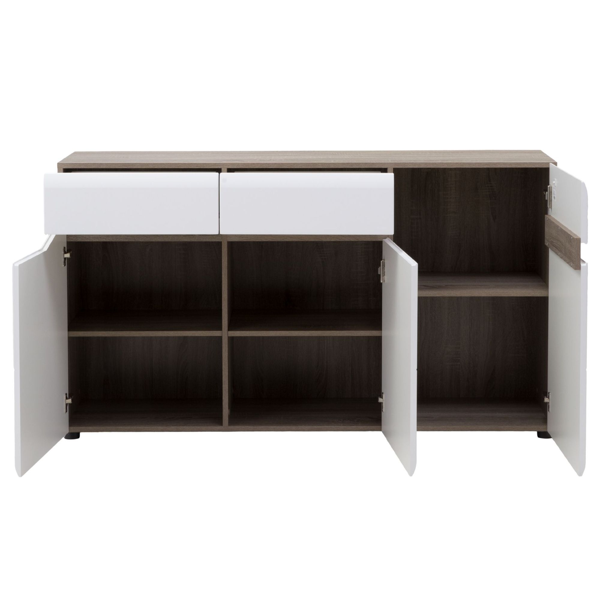Elegantní a moderní komoda LUCY se vyznačuje svým minimalistickým designem. Styl komody je výrazně podpořen kontrastní barevnou kombinací tmavě hnědé a bílé, celá je navíc laděná do dekoru dubu sonoma. Obsahuje tři dvířka a dvě zásuvky, jejich manipulaci zajišťují vyfrézované úchyty. Přední plocha je vyrobena z kvalitního MDF materiálu, korpus komody zase z laminovaného dřevěného materiálu. Povrch komody se vám bude snadno udržovat.