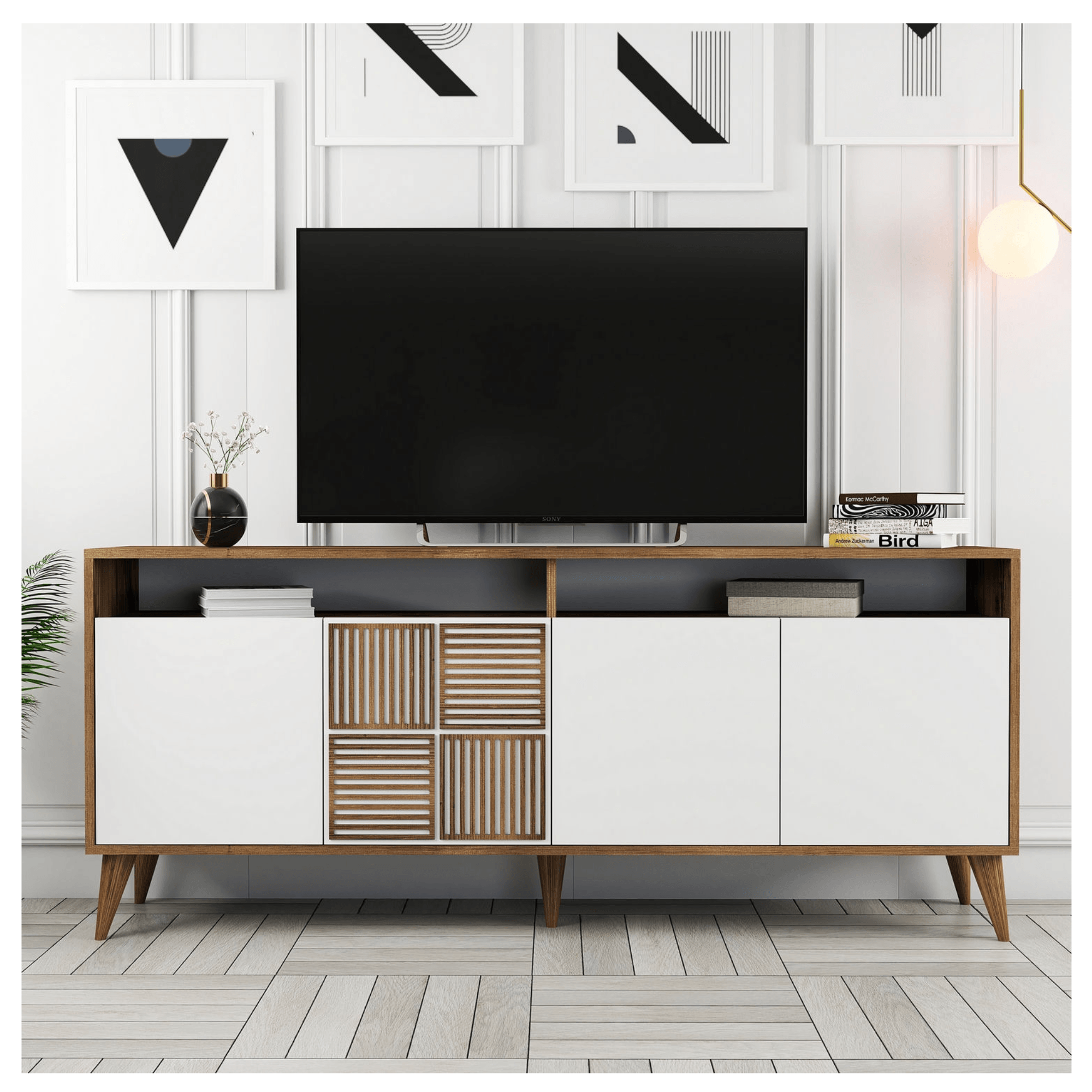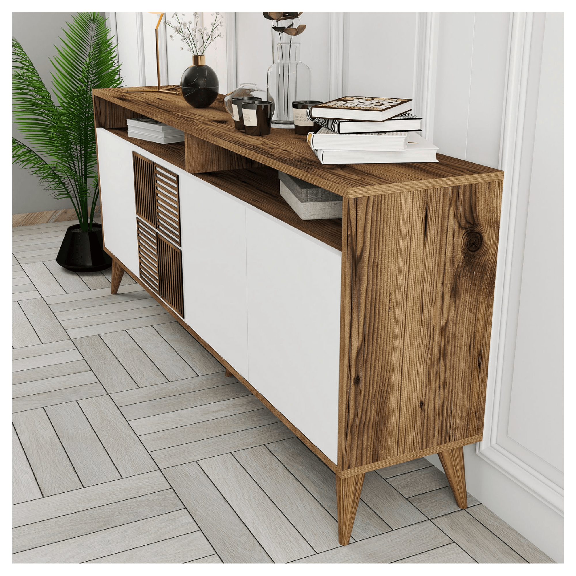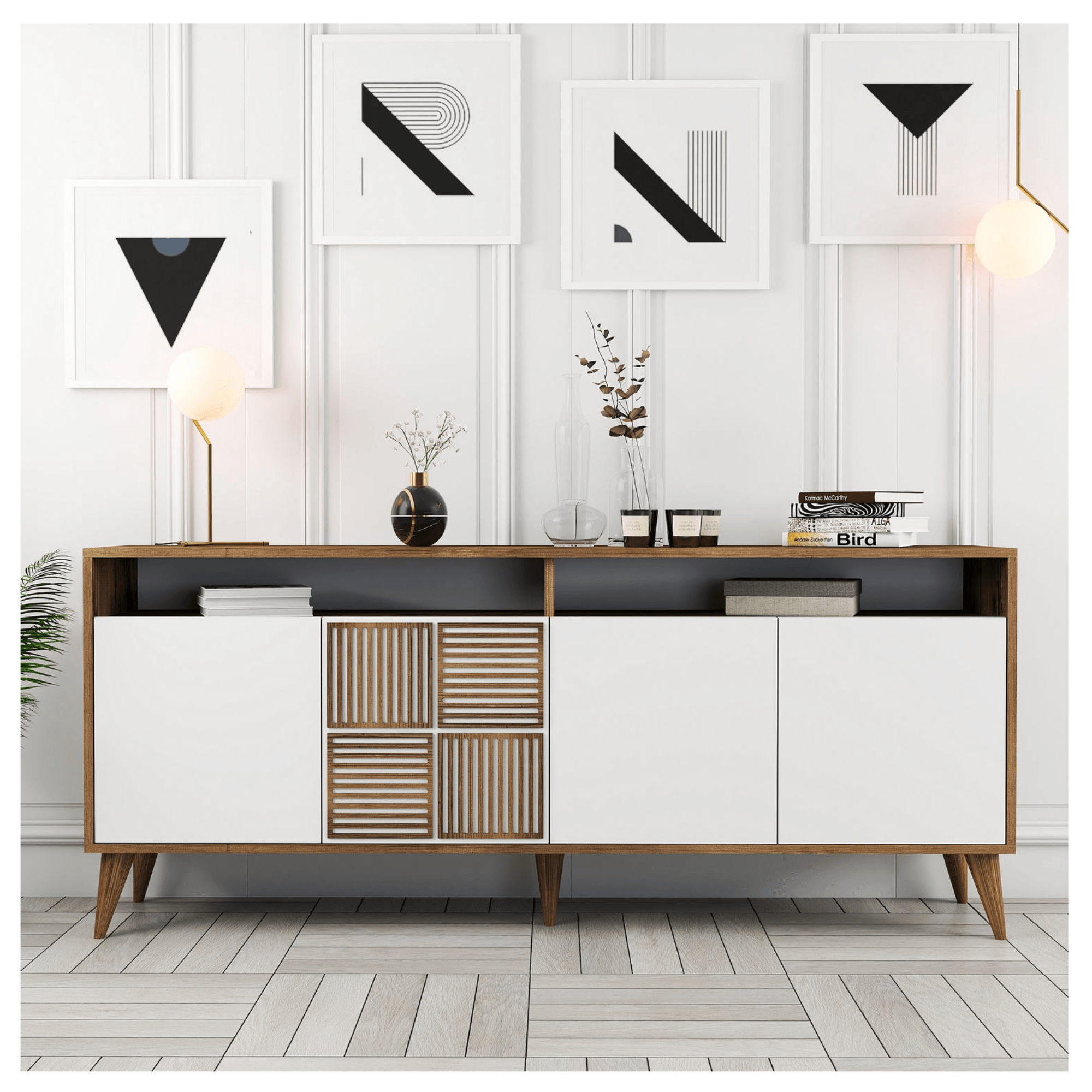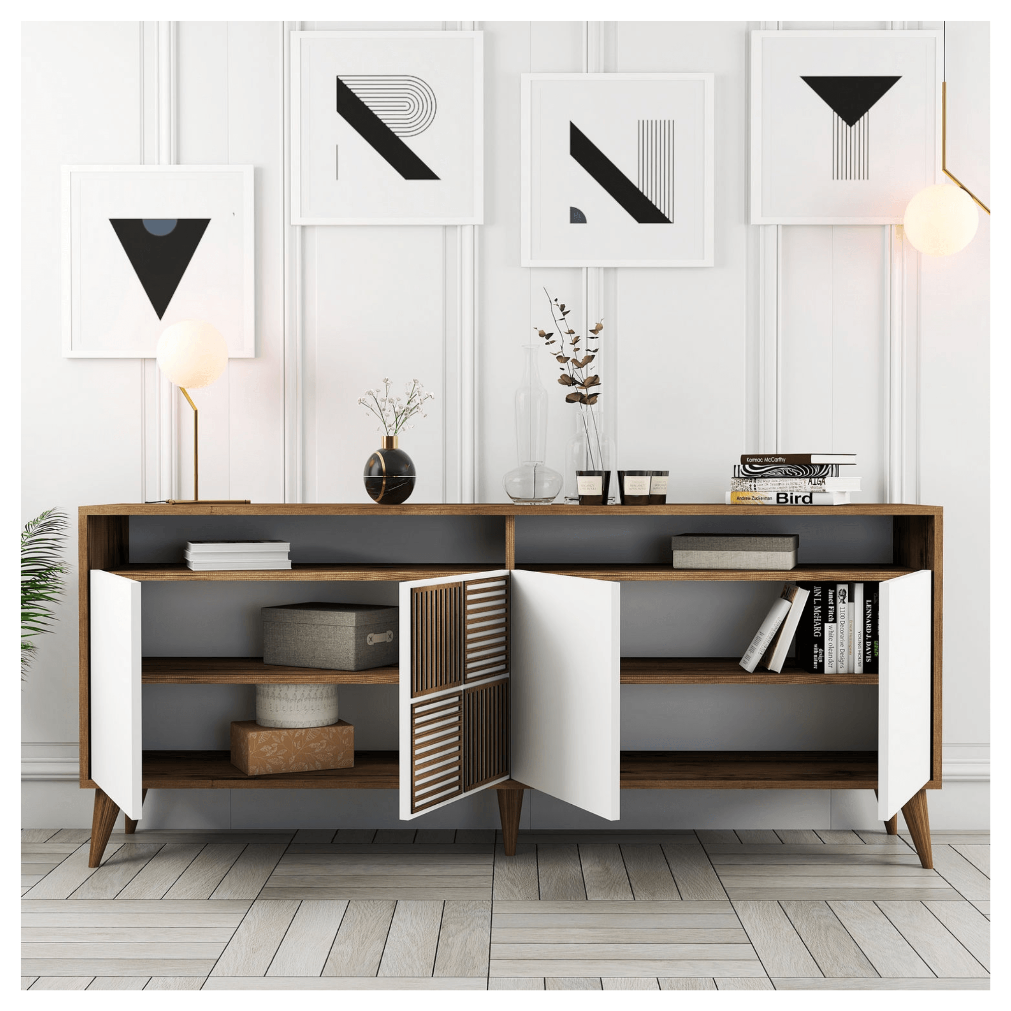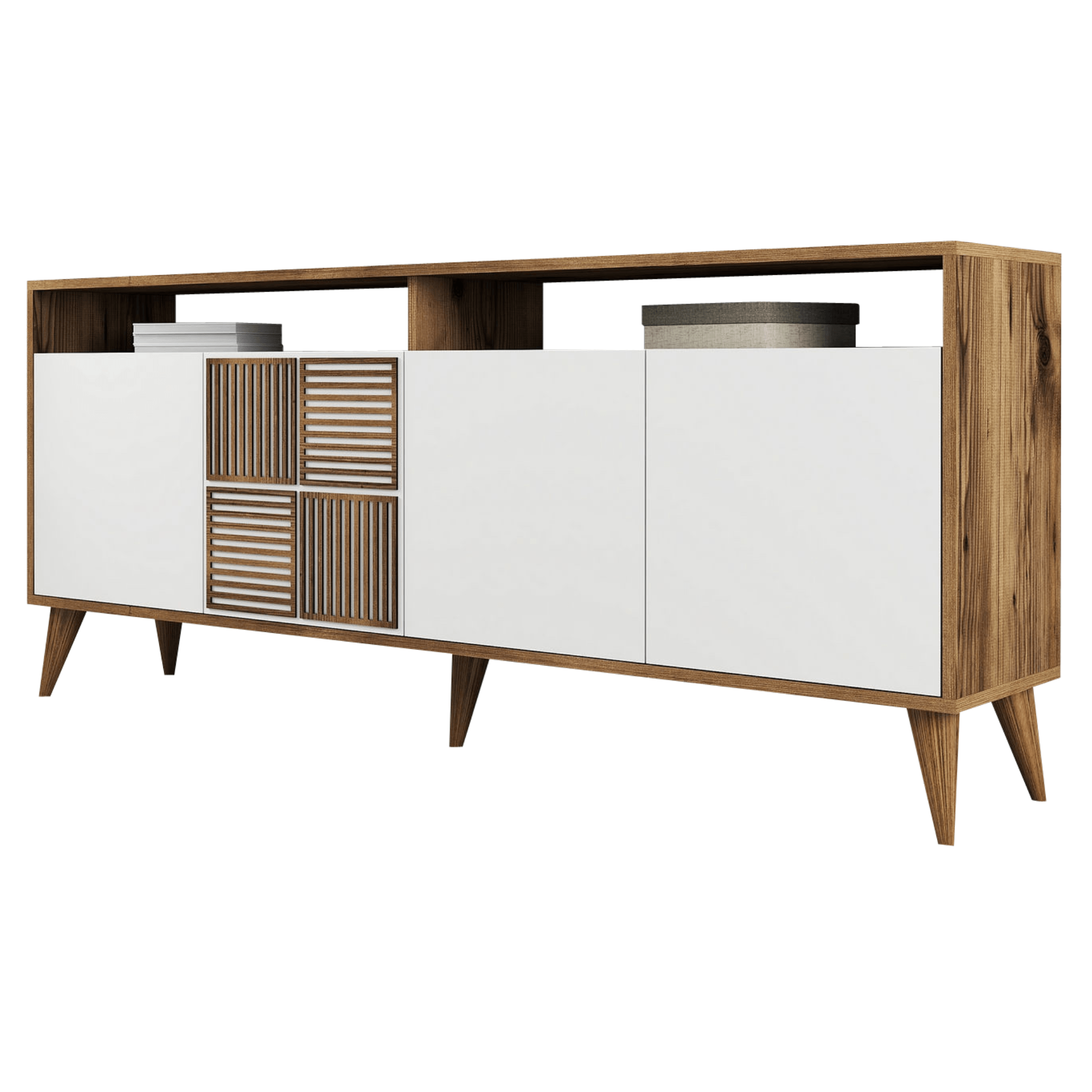 Komodu uzavírají 2 páry otočných dveří. kdy každý z nich ukrývá vloženou polici. Tyto police prakticky rozdělují vnitřní, úložný prostor a umožňují uložení všeho, co nechcete mít na očích. Nad každým párem dveří se nachází 1 otevřený odkládací prostor. Vrchní deska je ideální pro vystavení rostlin, fotografií a dalších dekorací nebo odkládaní předmětů denní potřeby. Komodu lze využít také jako TV komodu, která se bez problému postará o veškeré TV příslušenství. Pětice výrazných kónických nohou podtrhuje její celkový vzhled a zároveň umožňuje snadný úklid pod komodou. Vyrobena je z dřevěného materiálu potaženého melaminem.