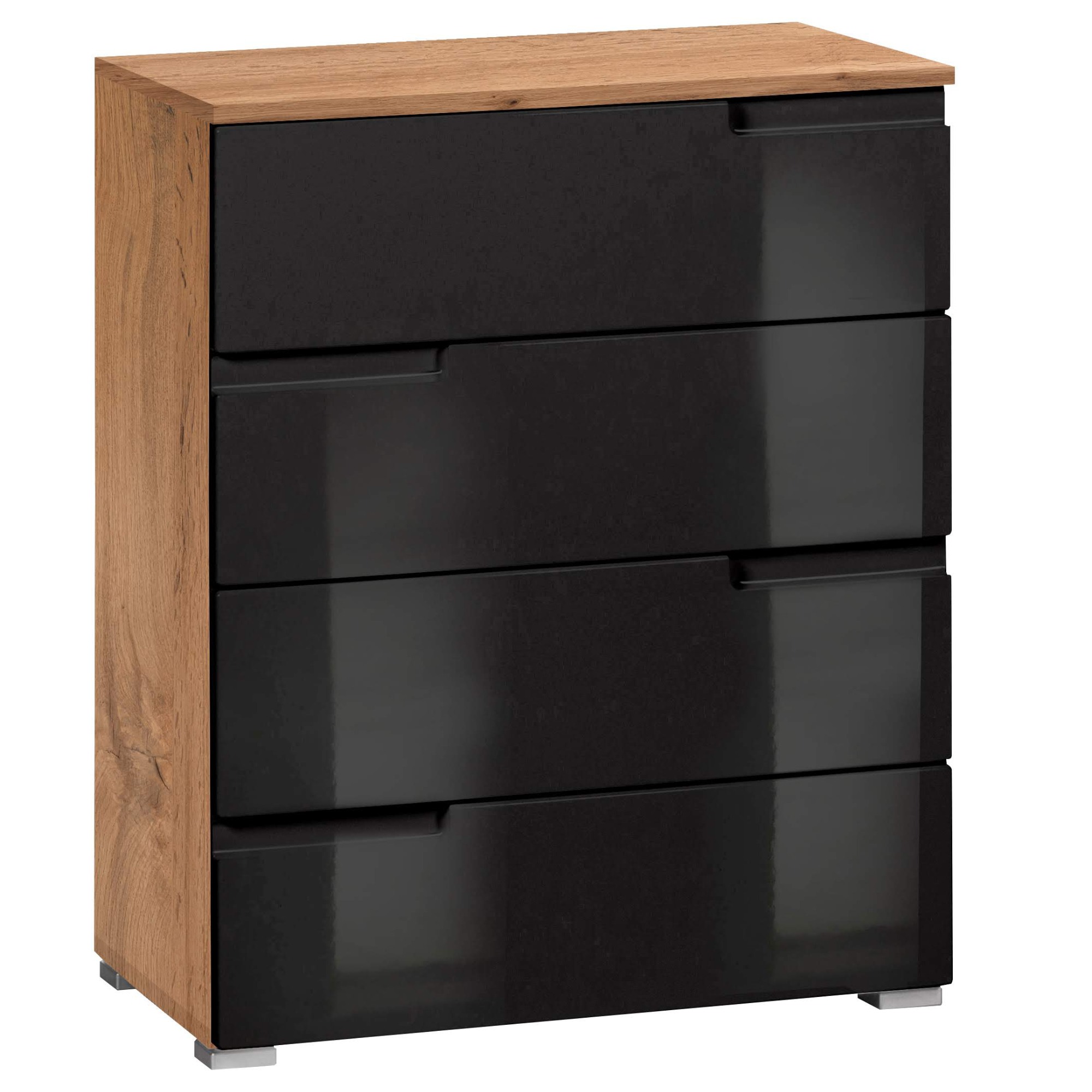 Komoda MOON 1 v minimalistickém stylu ozdobí každý moderní interiér. Díky jejím praktickým rozměrům ji můžete umístit i do menších obývacích pokojů či ložnic. Disponuje dostatečným úložným prostorem v podobě čtyř zásuvek. Vyfrézované úchyty nijak neruší, a přesto usnadní celkovou manipulaci. Celá konstrukce je postavena na čtyřech stříbrných nohách. Komodu lze zakoupit v několika barevných a dekorových variantách.