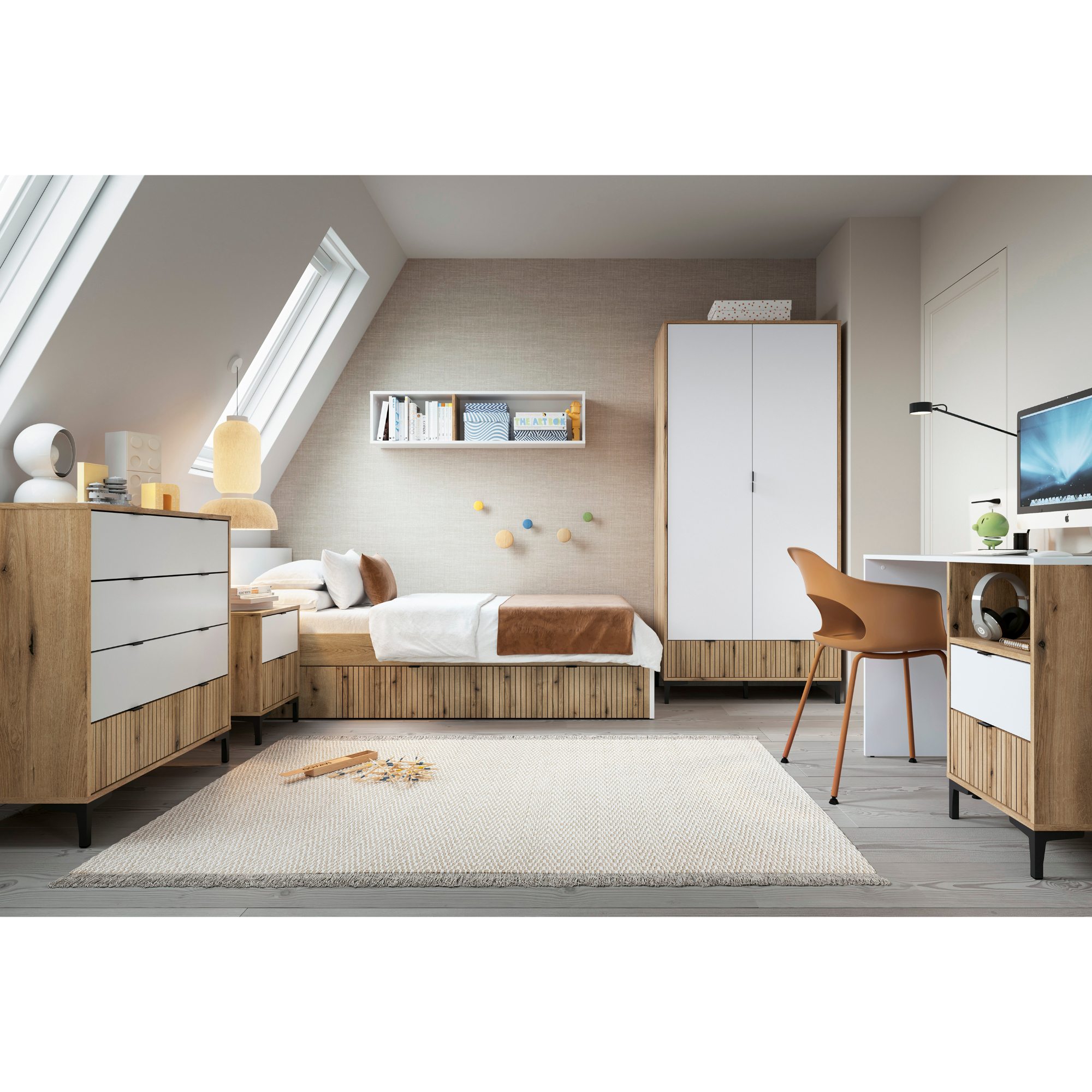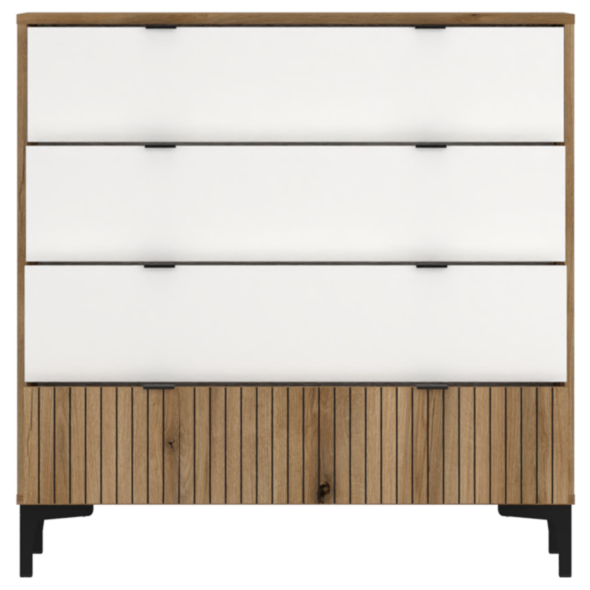 Komoda RICKO zaujme svým moderním designem a praktickými prvky. Kombinuje přírodní dekor dubu evoke s alpskou bílou barvu, díky čemu zapadne téměř do jakéhokoliv stylu interiéru.