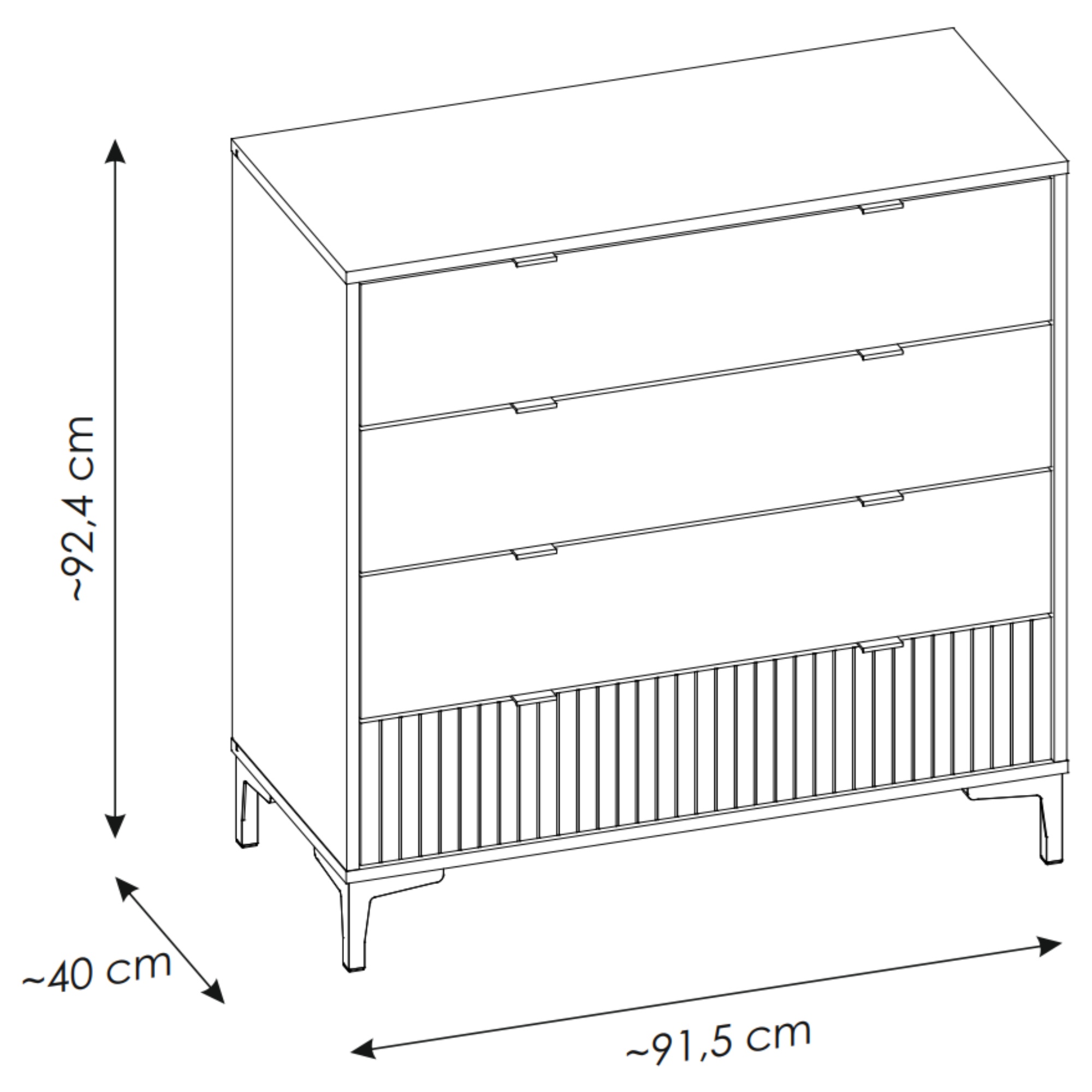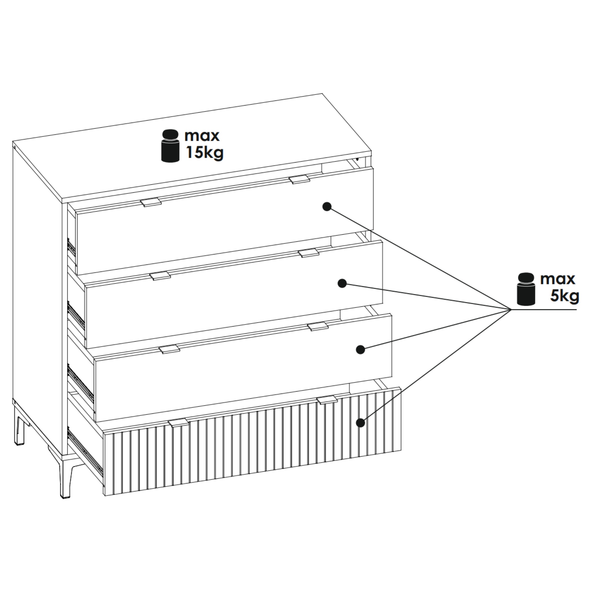 Úložný prostor obsahuje čtyři zásuvky, kde všechno potřebné budete mít vždy po ruce. Decentní úchytky podtrhují moderní styl komody. Vrchní deska zase dává k dispozici prostor na odkládání různých dekorací či jiných nezbytností.