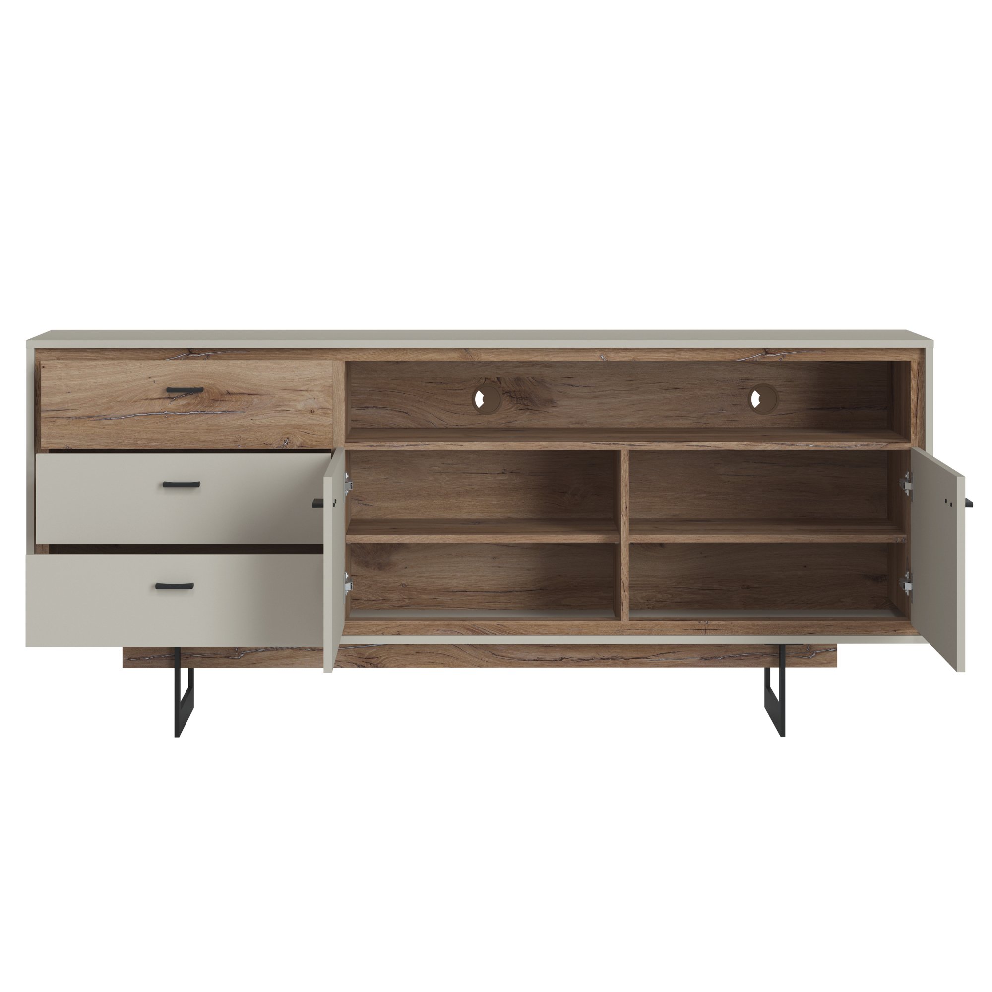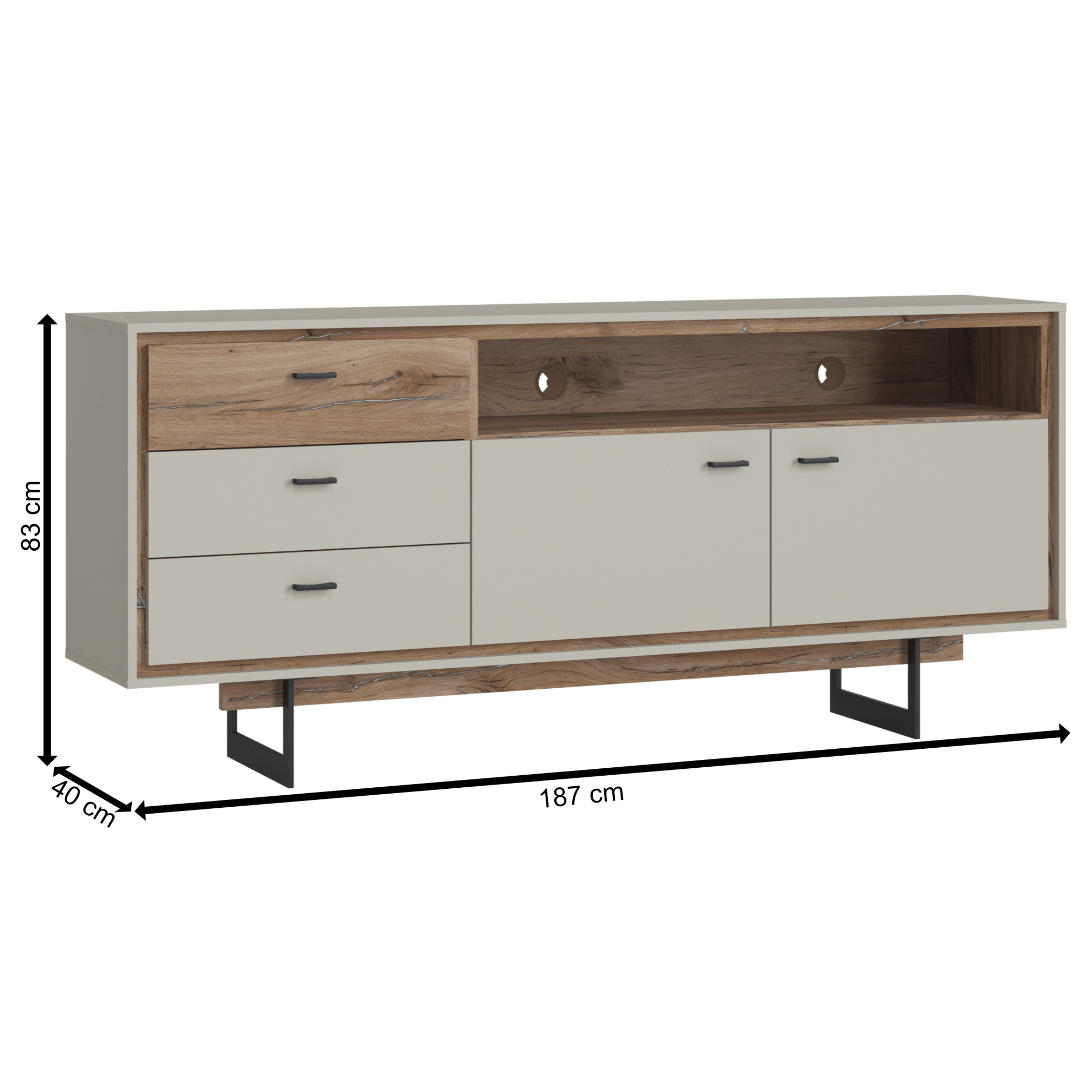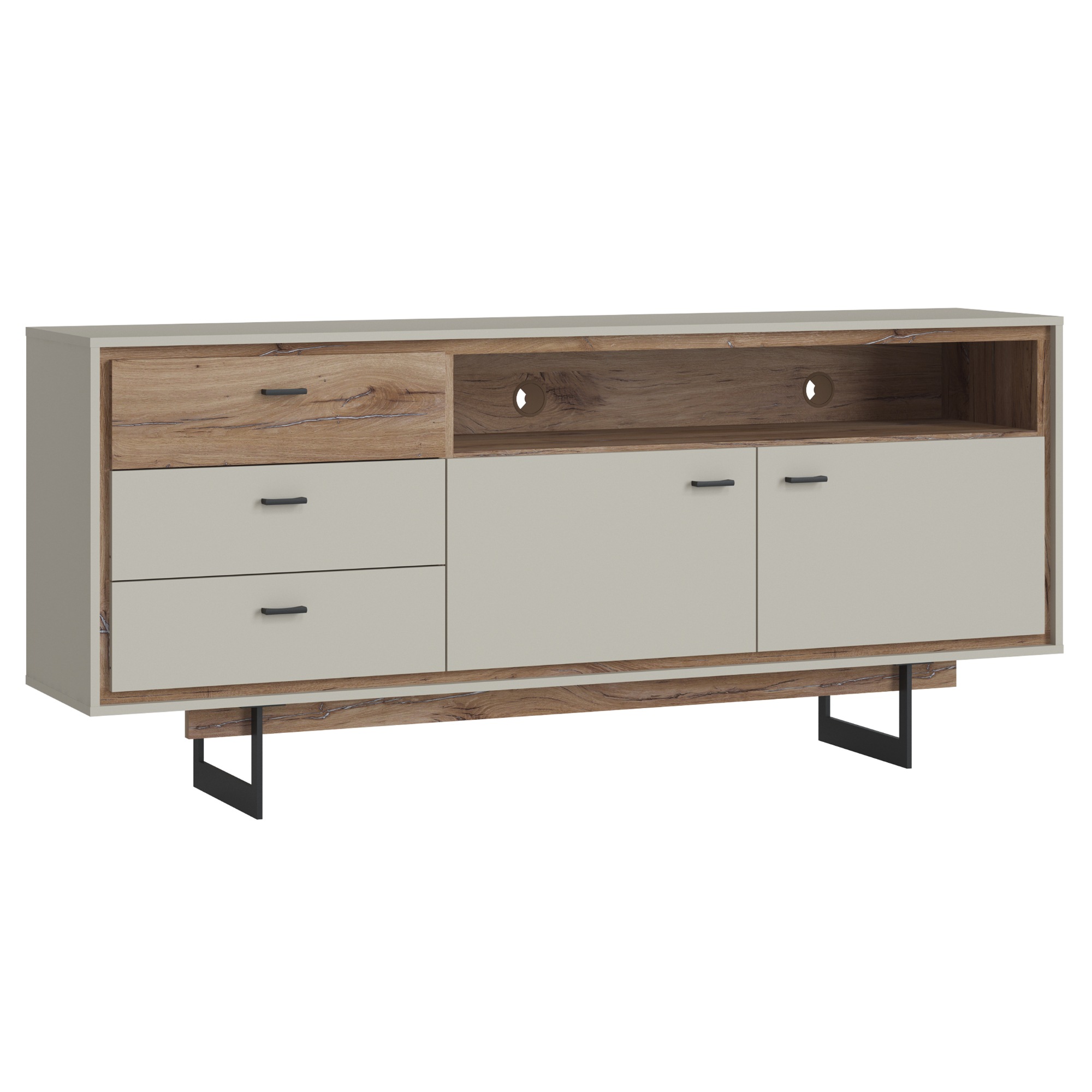 Vyrobena je z laminovaného dřevěného materiálu, pro který je typická snadná udržovatelnost i dlouhá životnost. Design podtrhuje barevné sladění šedé s dekorem dubu tmavého a černou kovovou podnoží. Okraje nábytku jsou hraněny ABS hranami, které eliminují riziko mechanického poškození. Bohatý úložný prostor zajišťují tři zásuvky v levé části. V pravé části je pak prostor dělený dvěma policemi a příčkou do čtyř samostatných sekcí – tento prostor kryje dvojice dvířek. Horní pravou část doplňuje otevřený prostor pro dekorace a jiné drobnosti, zde se nachází dva otvory pro kabeláž. Manipulaci navíc usnadňují černé kovové úchyty a tiché dovírání softclose.