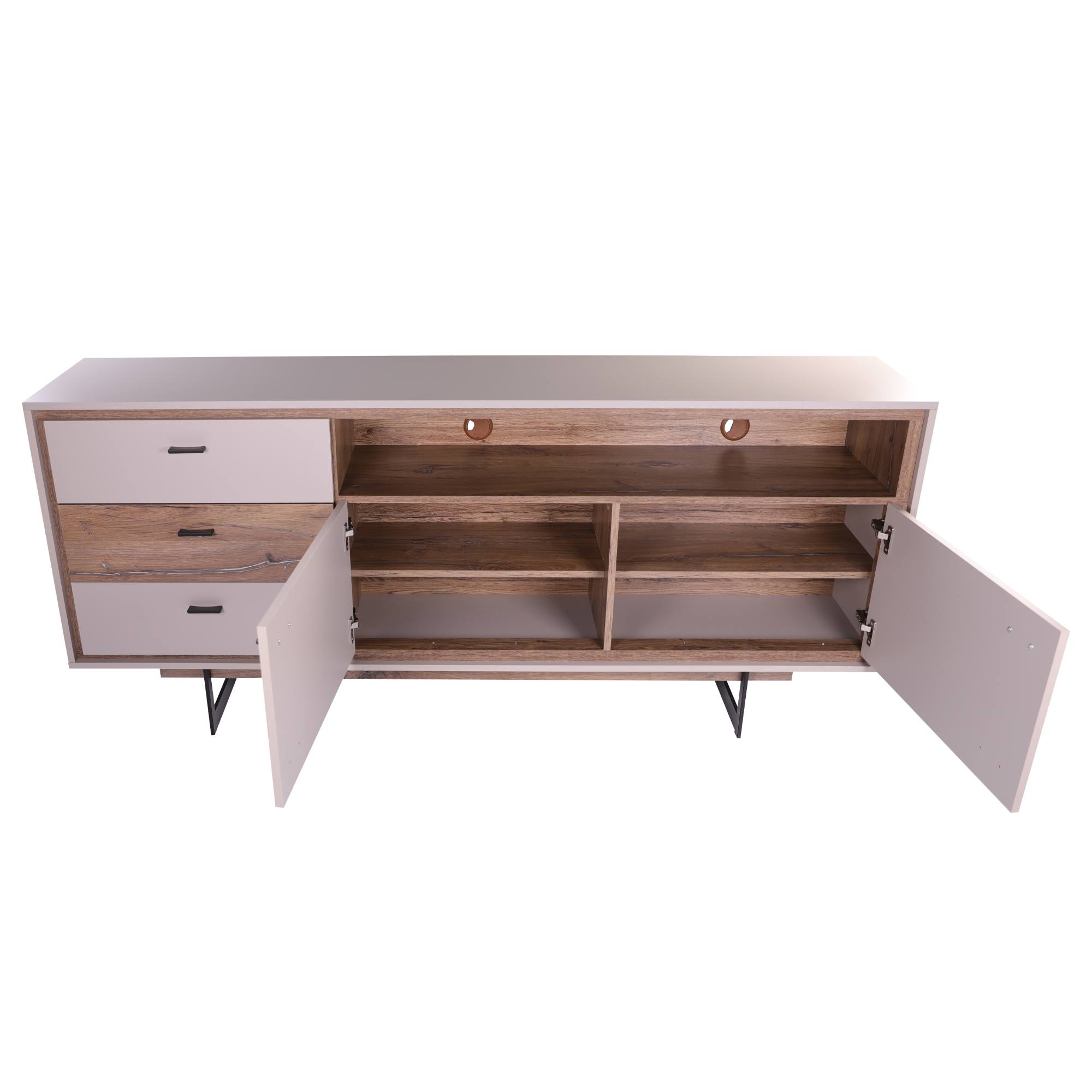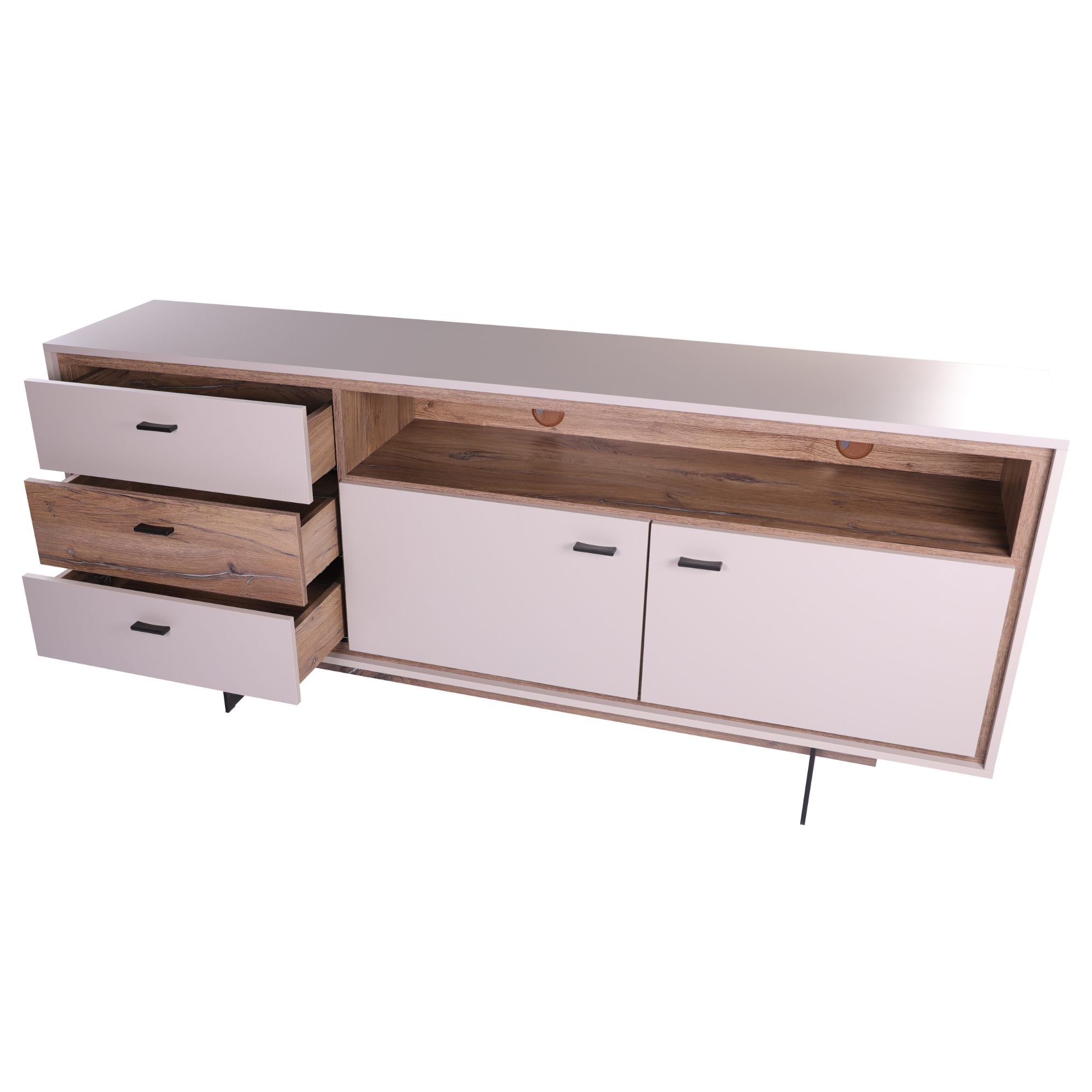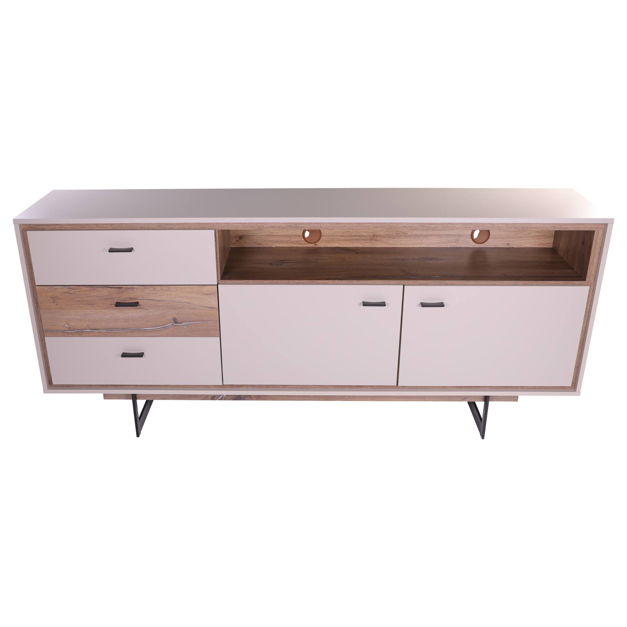 Vyrobena je z laminovaného dřevěného materiálu, pro který je typická snadná udržovatelnost i dlouhá životnost. Design podtrhuje barevné sladění šedé s dekorem dubu tmavého a černou kovovou podnoží. Okraje nábytku jsou hraněny ABS hranami, které eliminují riziko mechanického poškození. Bohatý úložný prostor zajišťují tři zásuvky v levé části. V pravé části je pak prostor dělený dvěma policemi a příčkou do čtyř samostatných sekcí – tento prostor kryje dvojice dvířek. Horní pravou část doplňuje otevřený prostor pro dekorace a jiné drobnosti, zde se nachází dva otvory pro kabeláž. Manipulaci navíc usnadňují černé kovové úchyty a tiché dovírání softclose.
