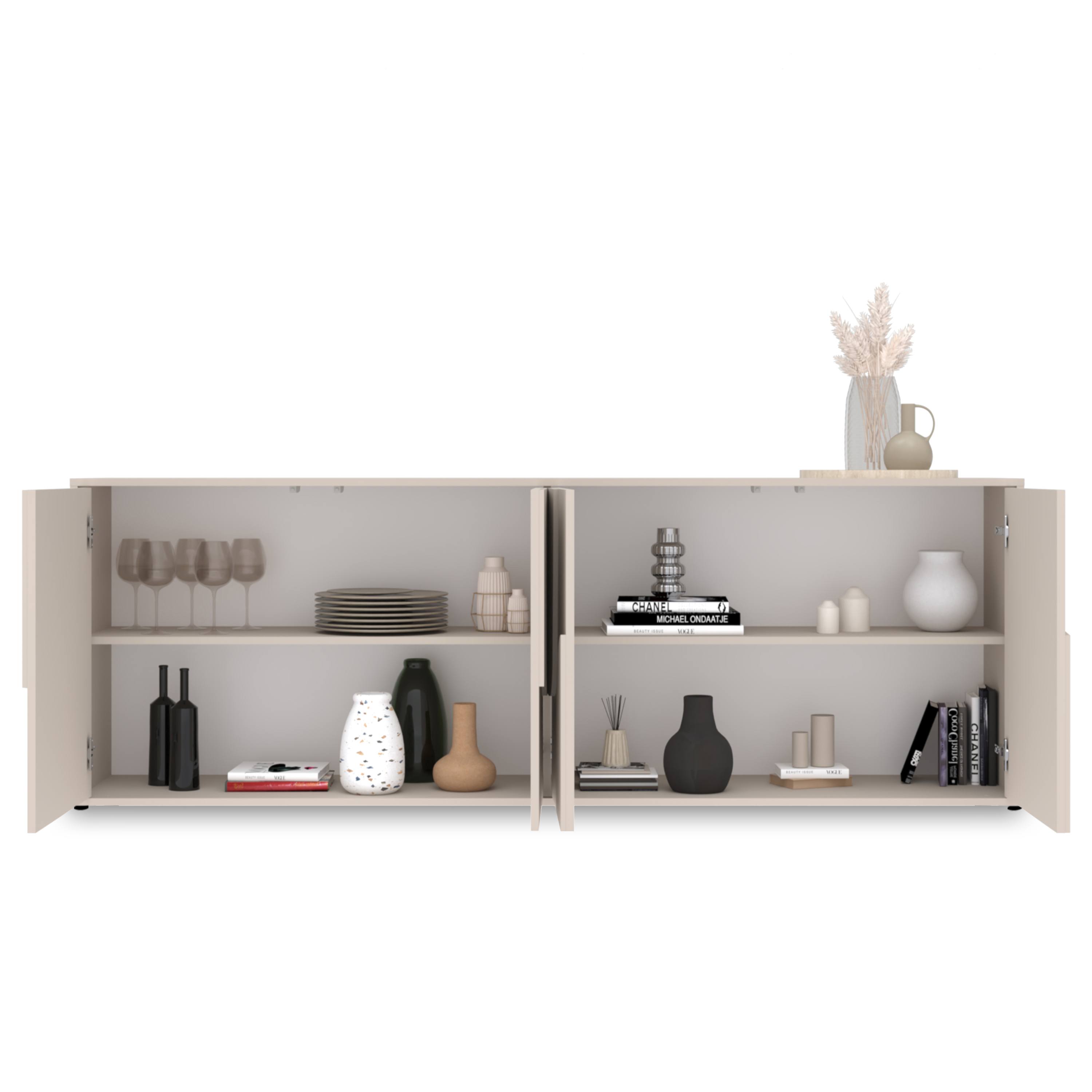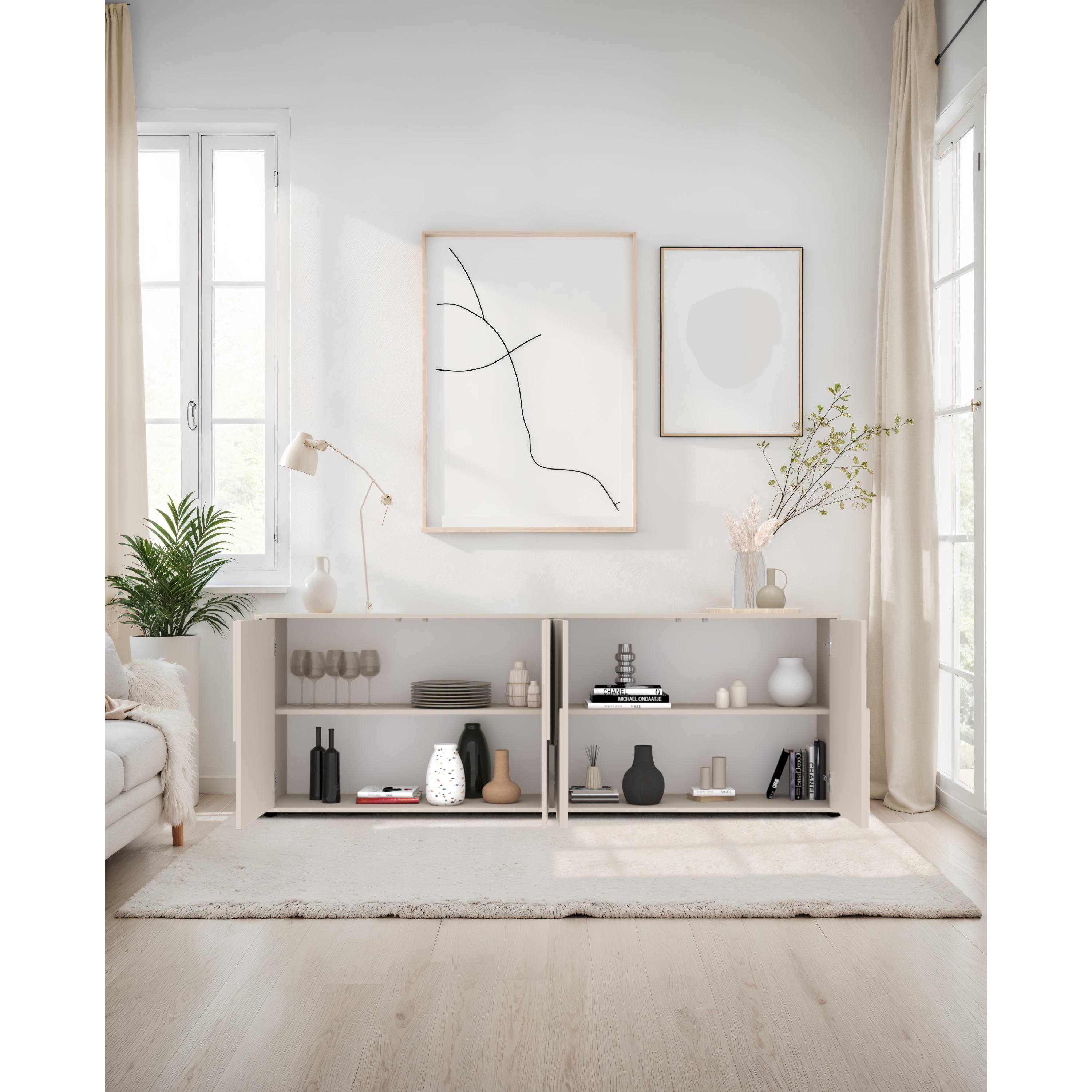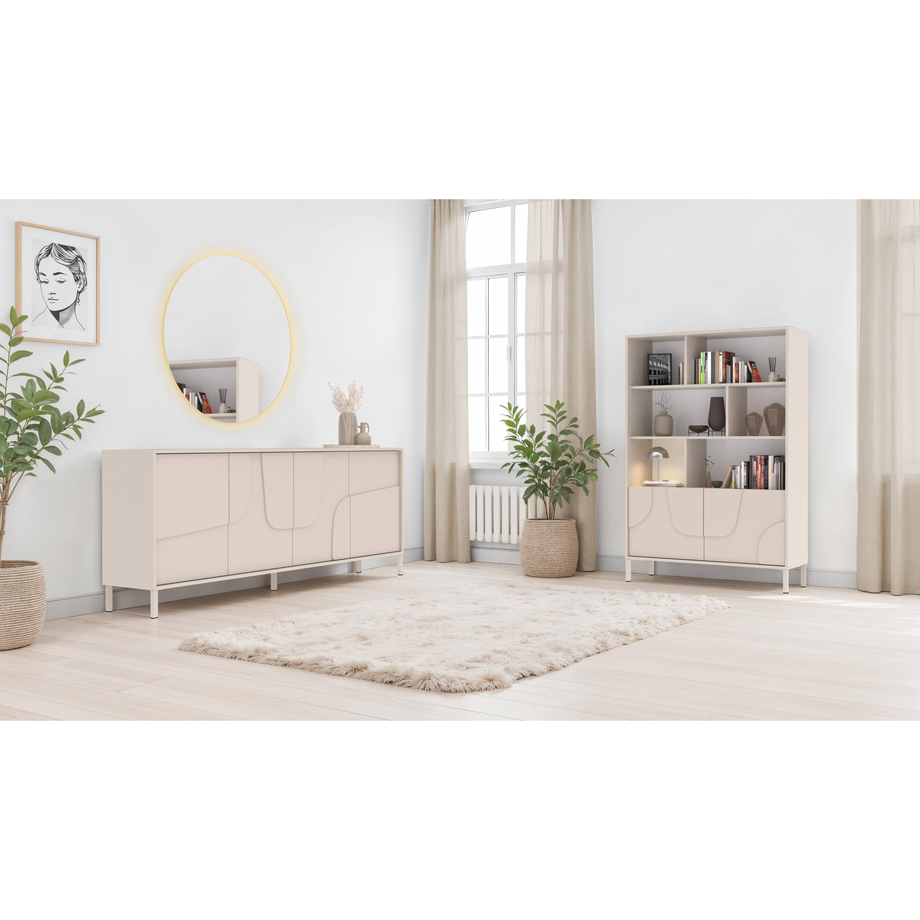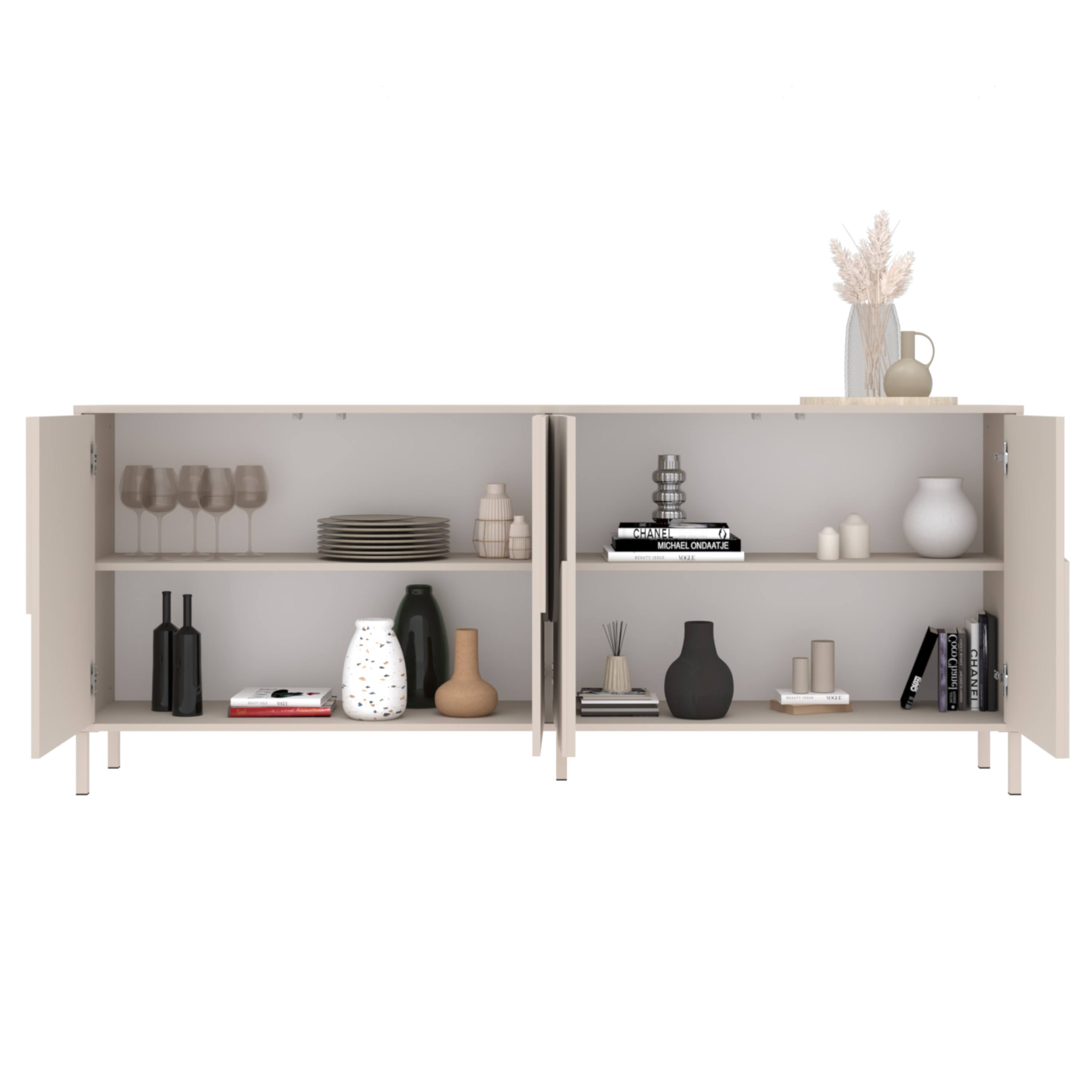Vyrobená je z laminovaných dřevotřískových desek, které jsou snadno udržovatelné. Laděná je pak do odstínu kašmírové barvy, která interiér zútulní. Dostatek úložného prostoru pak naleznete za dvířky. Komodu lze doplnit o menší plastové nohy nebo o větší kovové nohy, obě varianty jsou součástí balení.