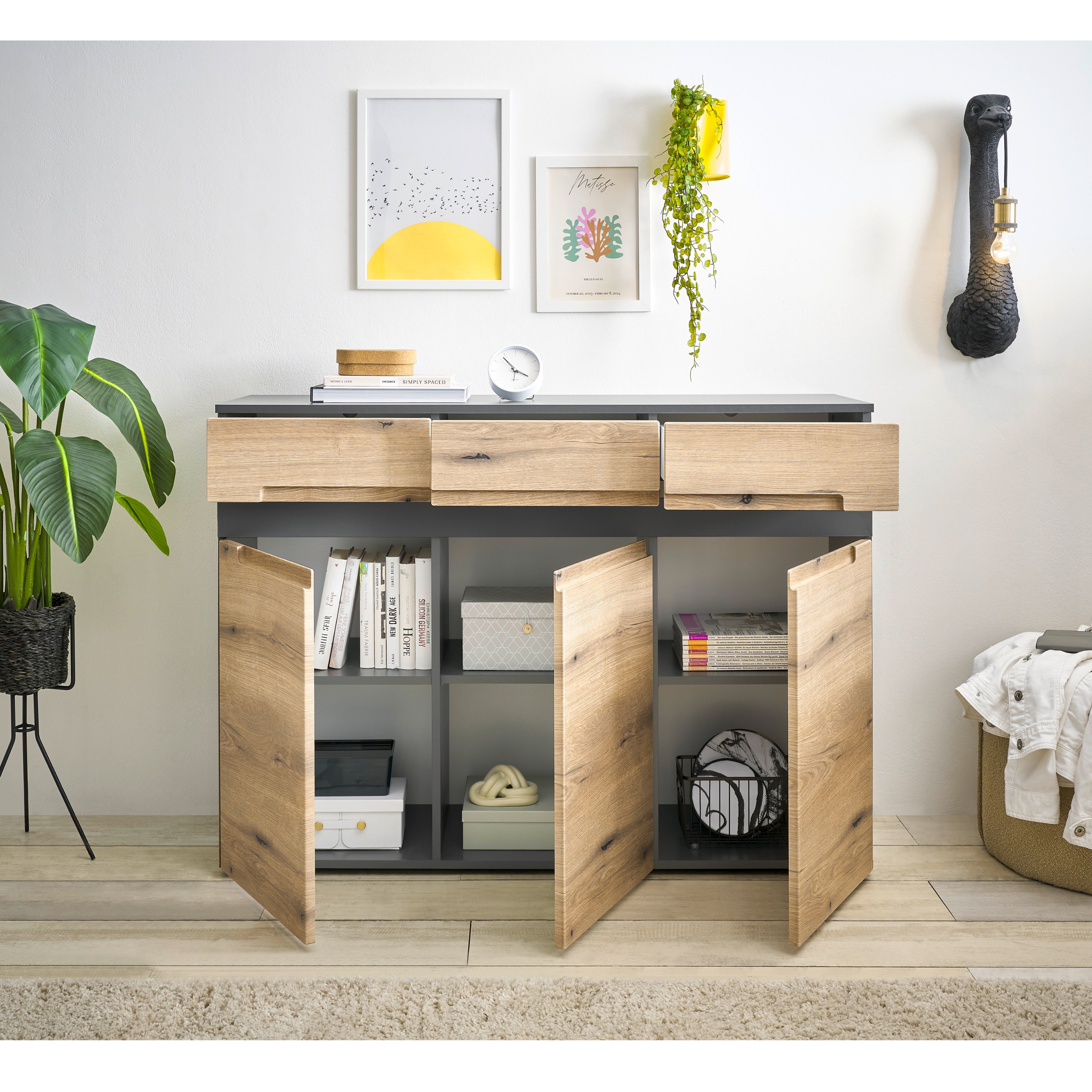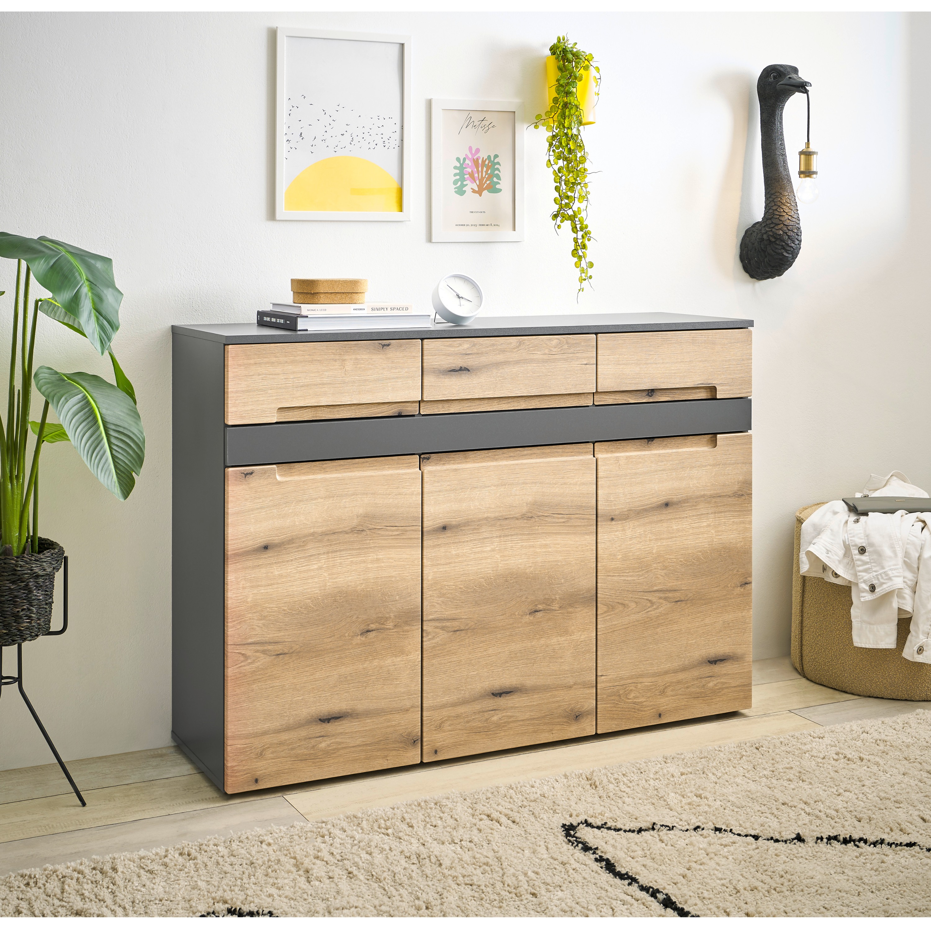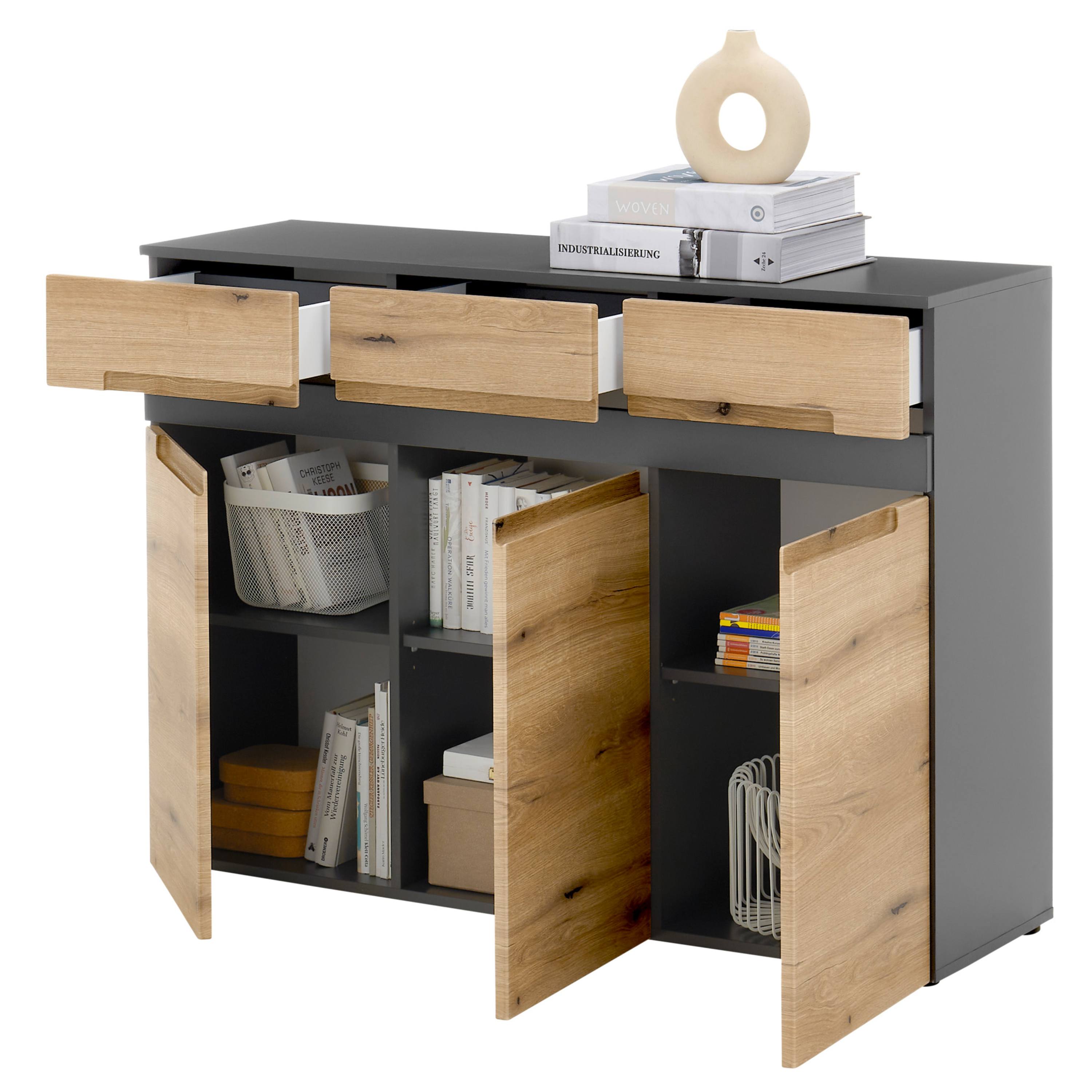 Komoda TAYLOR 3 v moderním provedení s čistými liniemi zaujme kontrastní kombinací dekoru dubu evoke a antracitové barvy, díky které snadno zapadne do současných interiérů.