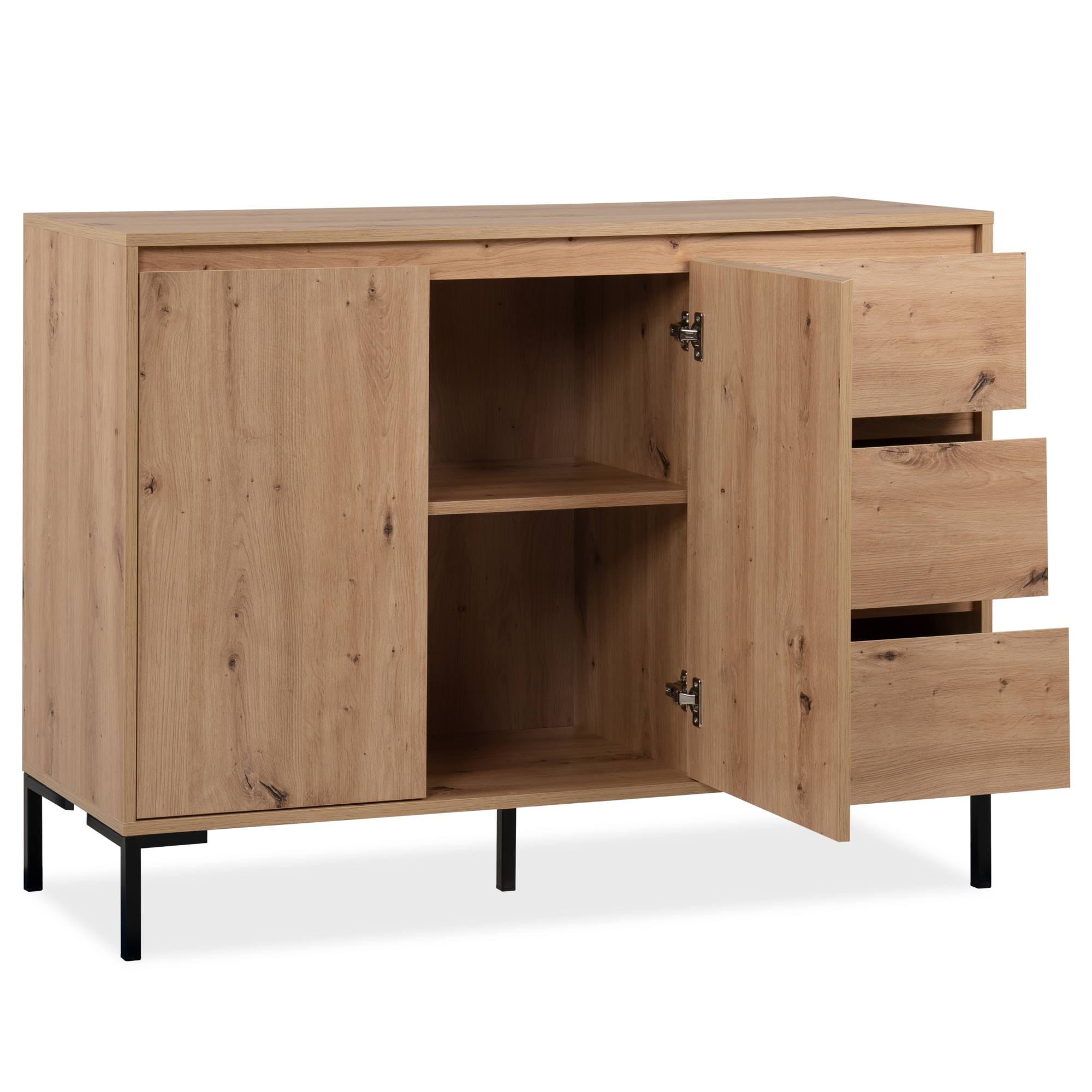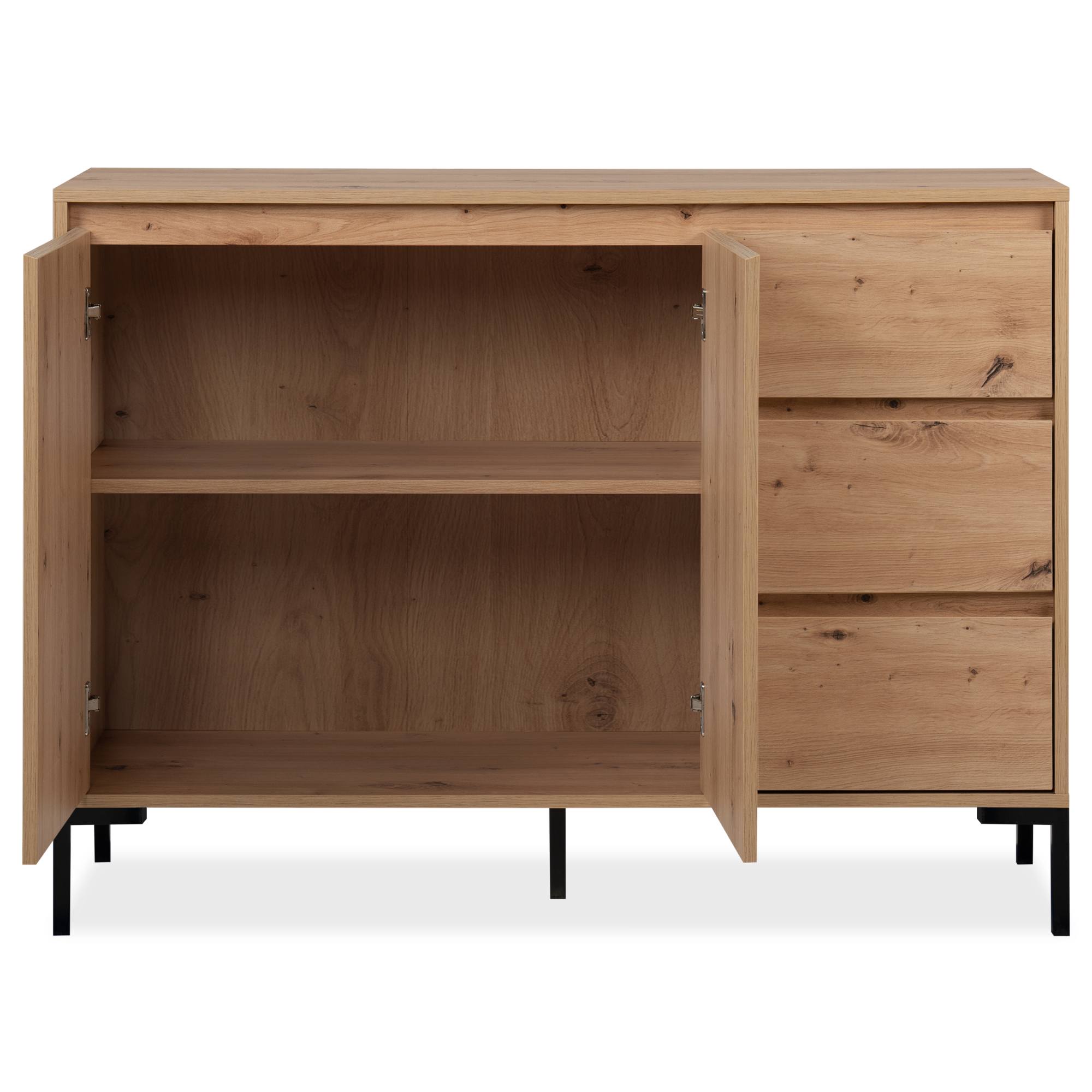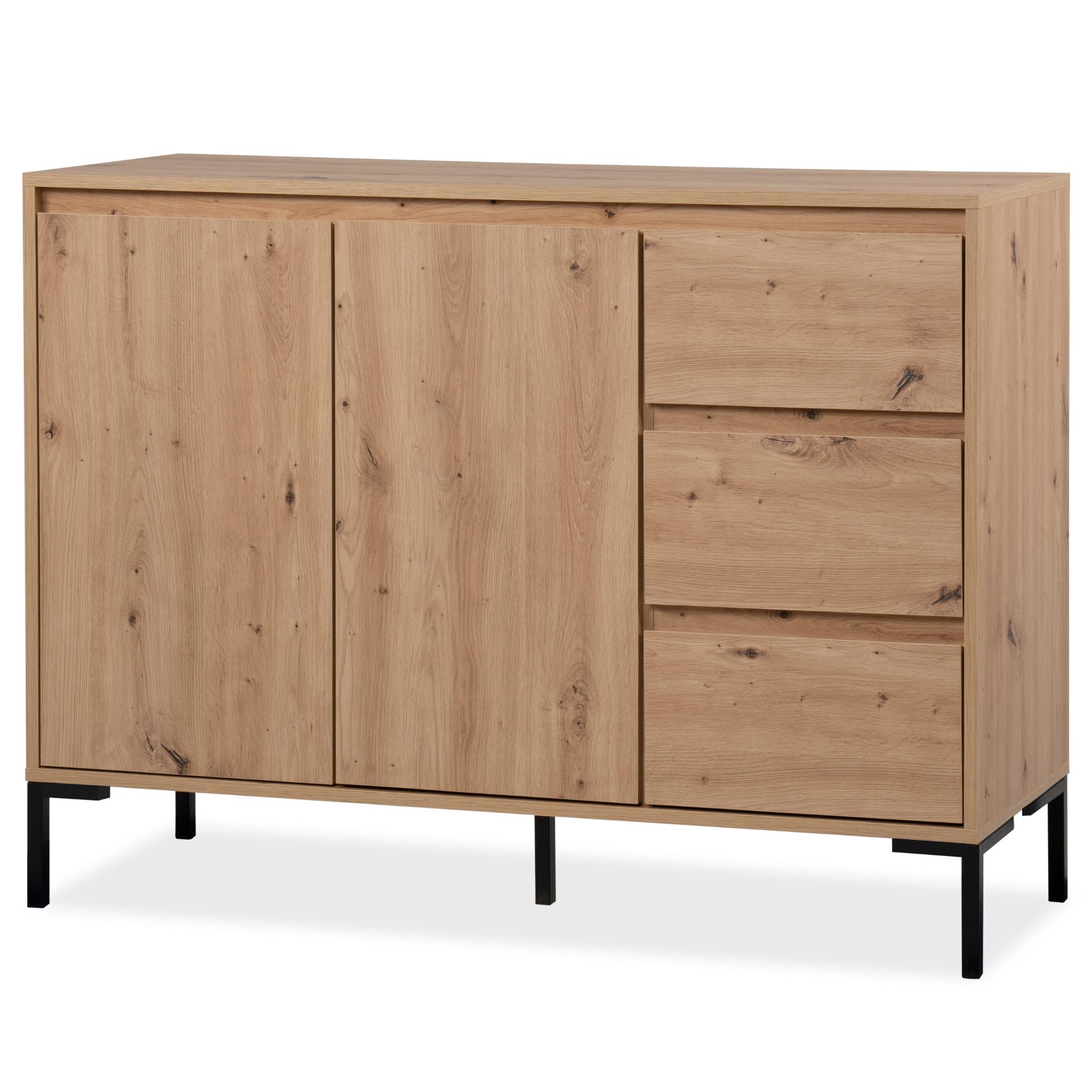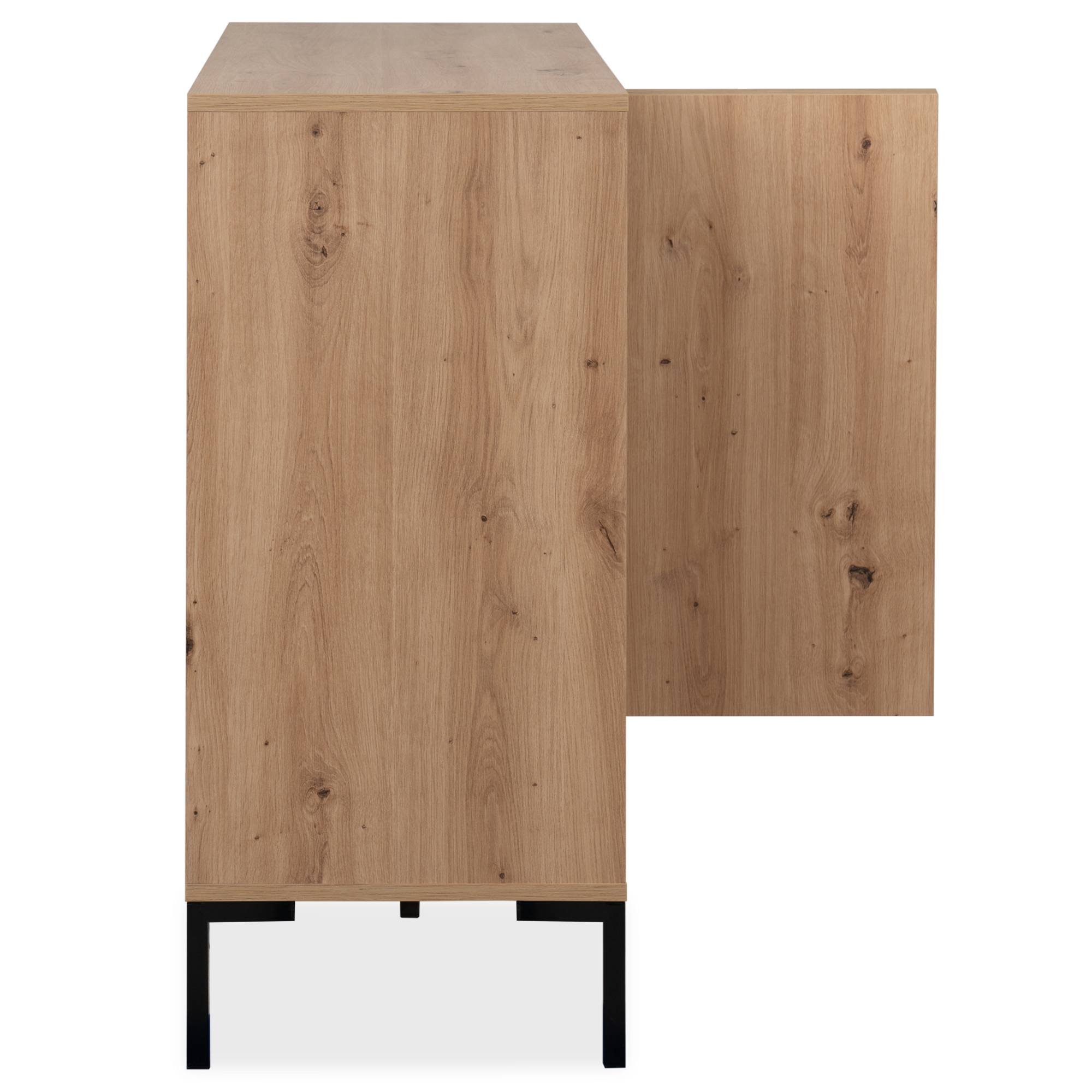 Vyrobená je z laminovaných dřevotřískových desek, které jsou snadno udržovatelné. Laděná je pak do dekoru dubu artisan – ten interiér zútulňuje a propůjčuje mu nádech přírody. Maximální stabilitu zajišťuje podnož z kovu v kontrastním černém provedení. Dostatek úložného prostoru pak naleznete ve třech zásuvkách a za dvířky, kde je jedna vložená police.