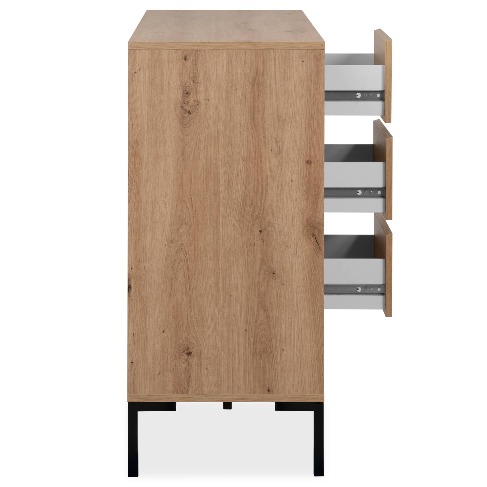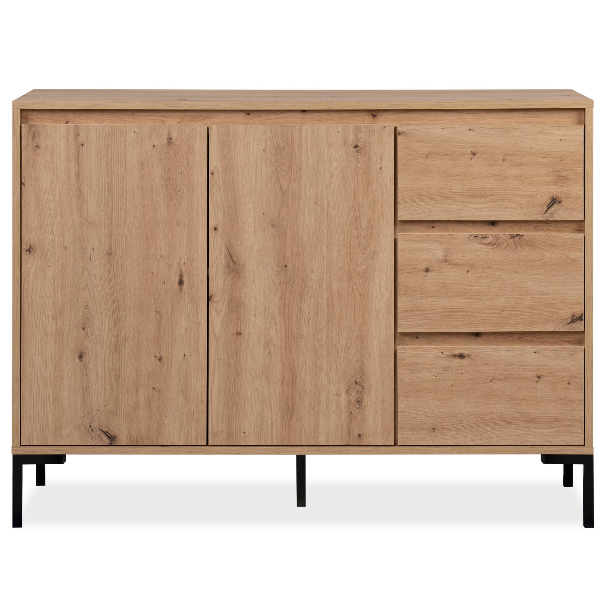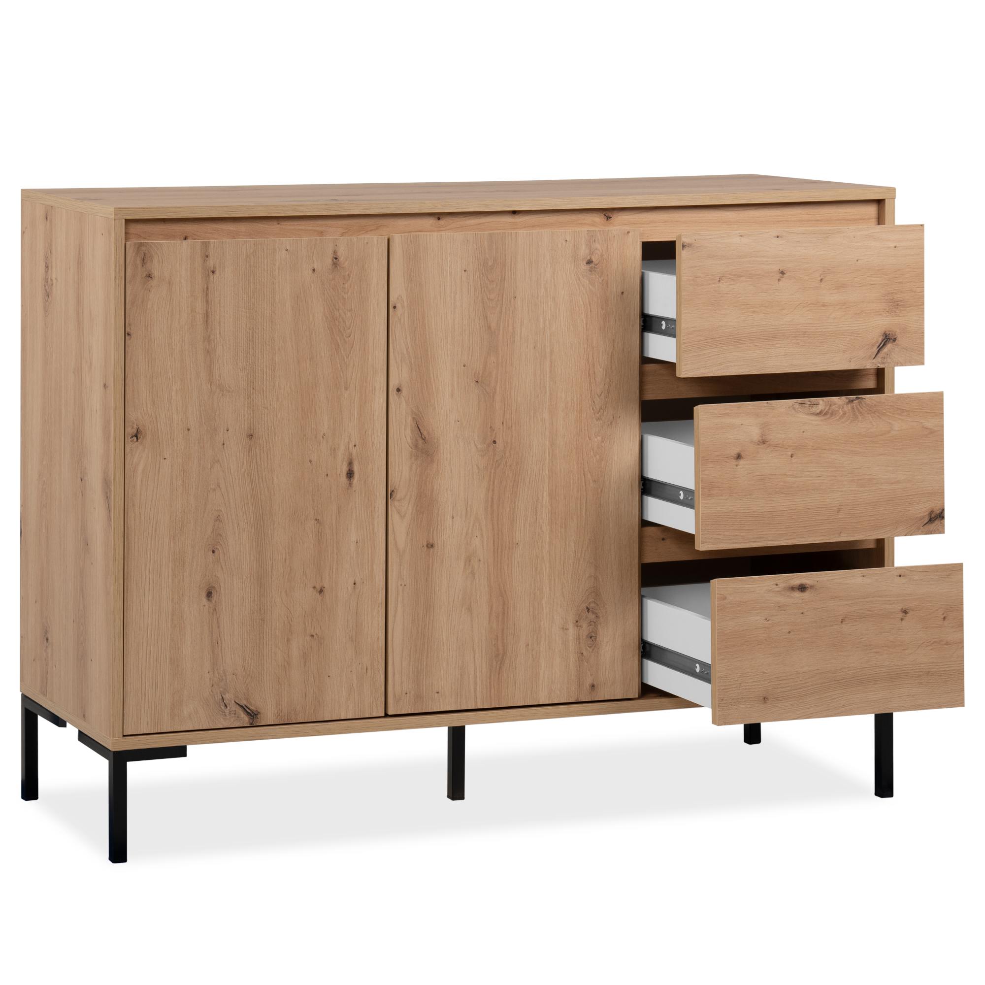 Vyrobená je z laminovaných dřevotřískových desek, které jsou snadno udržovatelné. Laděná je pak do dekoru dubu artisan – ten interiér zútulňuje a propůjčuje mu nádech přírody. Maximální stabilitu zajišťuje podnož z kovu v kontrastním černém provedení. Dostatek úložného prostoru pak naleznete ve třech zásuvkách a za dvířky, kde je jedna vložená police.