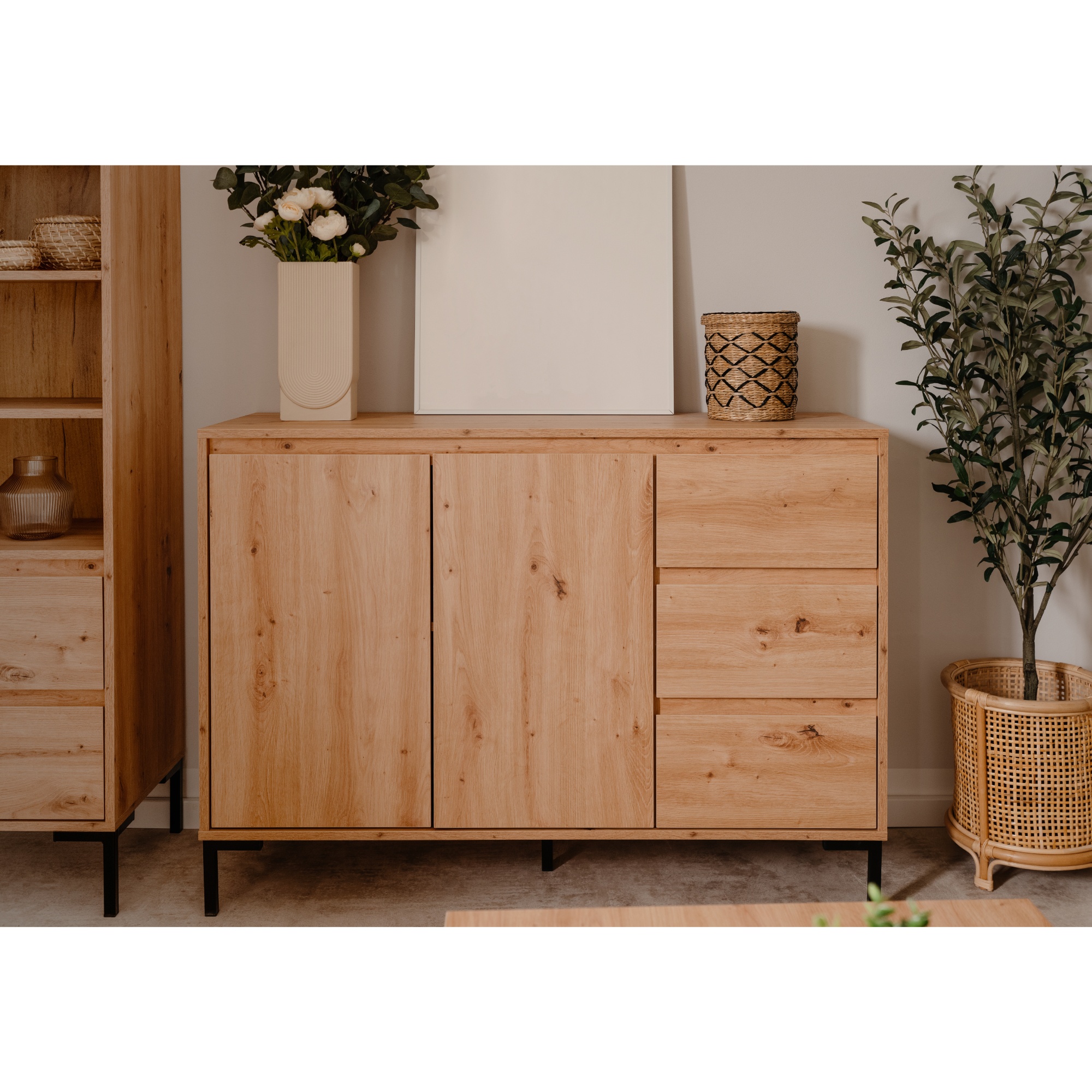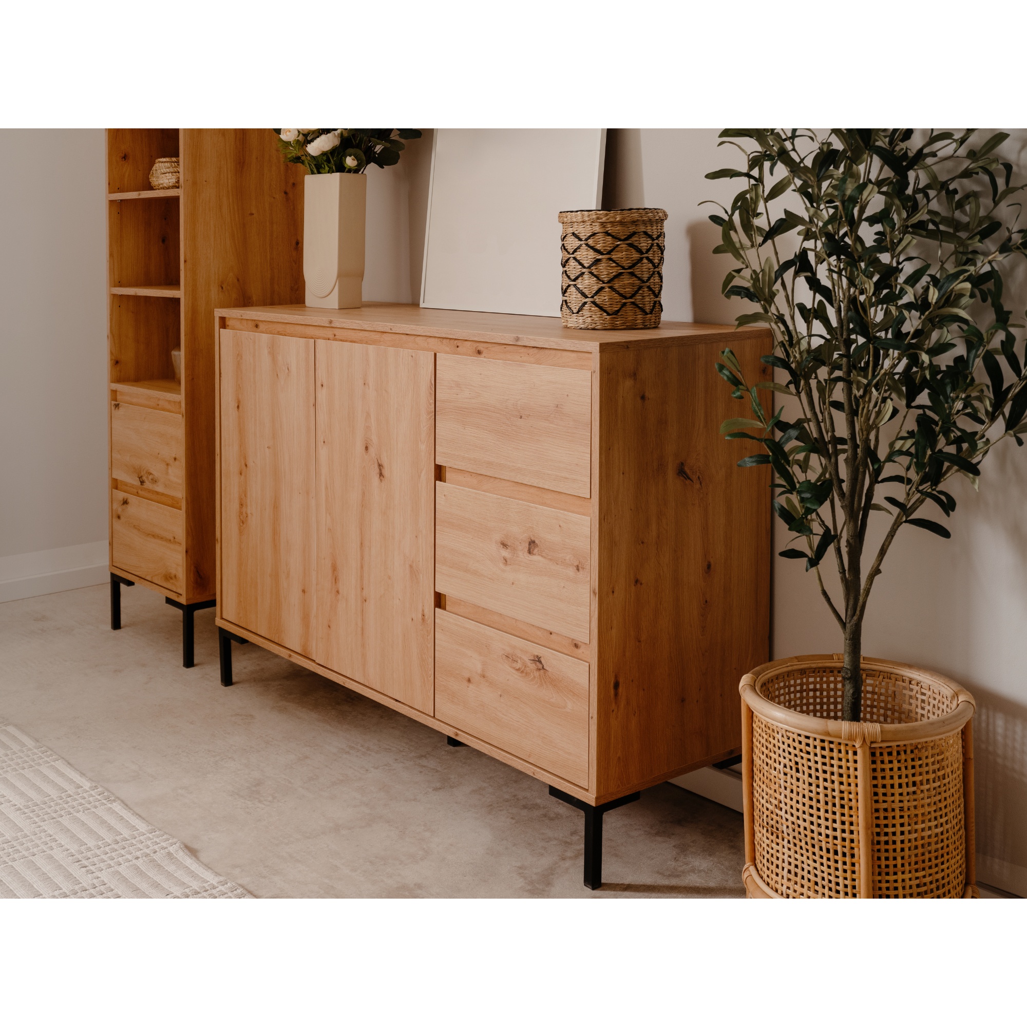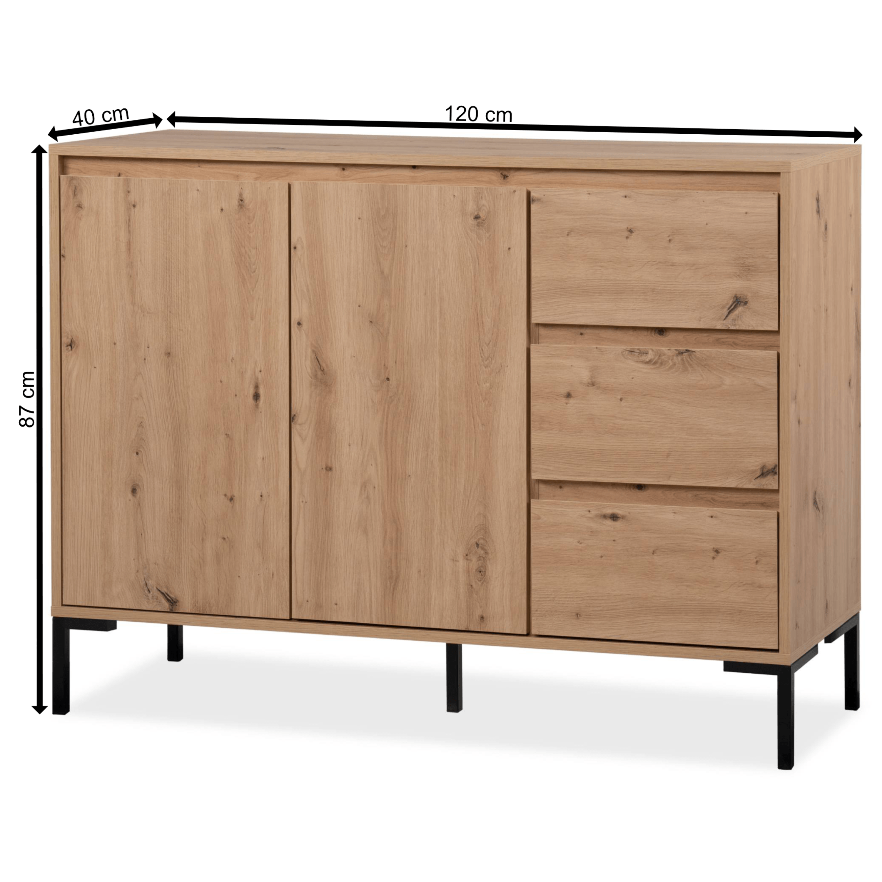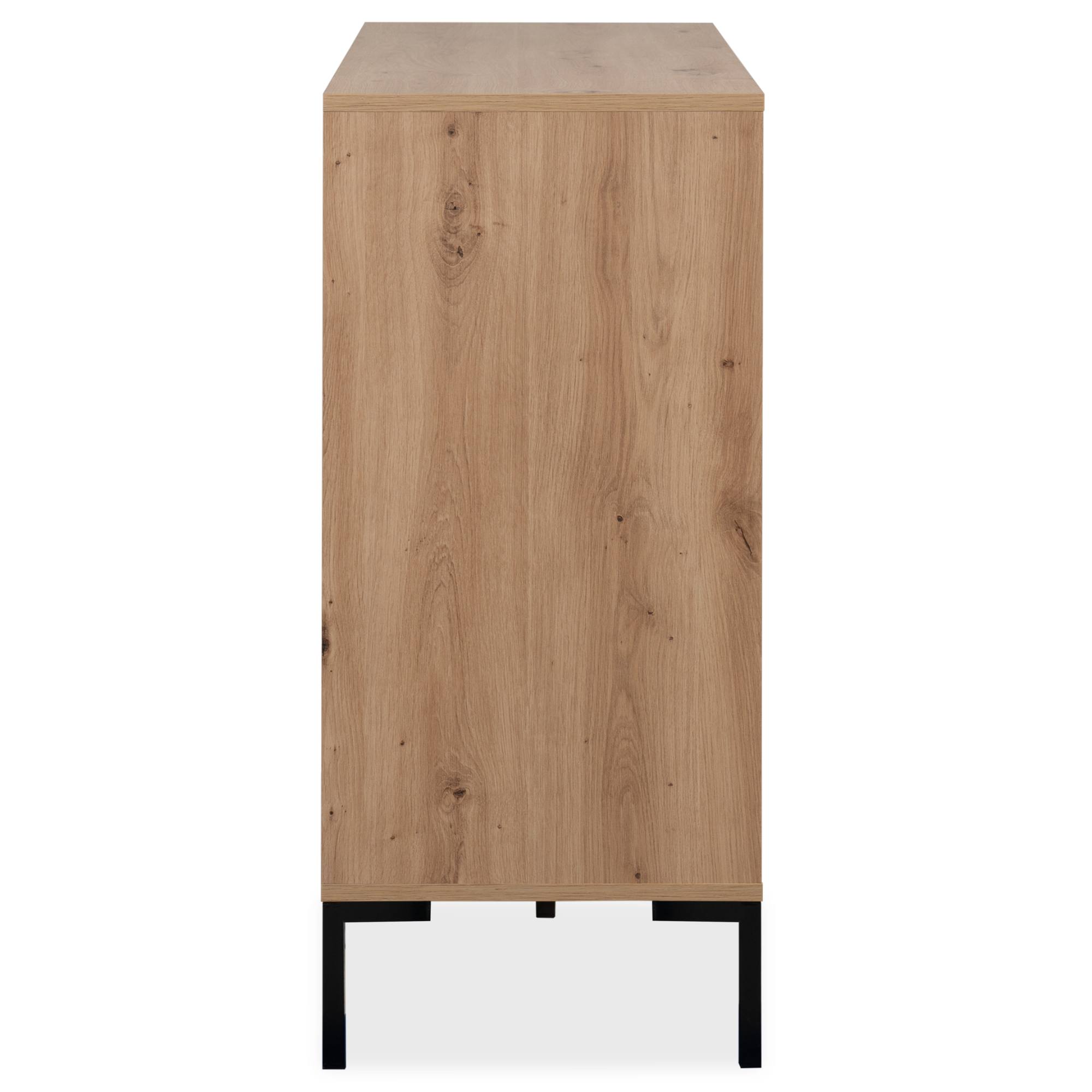 Vyrobená je z laminovaných dřevotřískových desek, které jsou snadno udržovatelné. Laděná je pak do dekoru dubu artisan – ten interiér zútulňuje a propůjčuje mu nádech přírody. Maximální stabilitu zajišťuje podnož z kovu v kontrastním černém provedení. Dostatek úložného prostoru pak naleznete ve třech zásuvkách a za dvířky, kde je jedna vložená police.