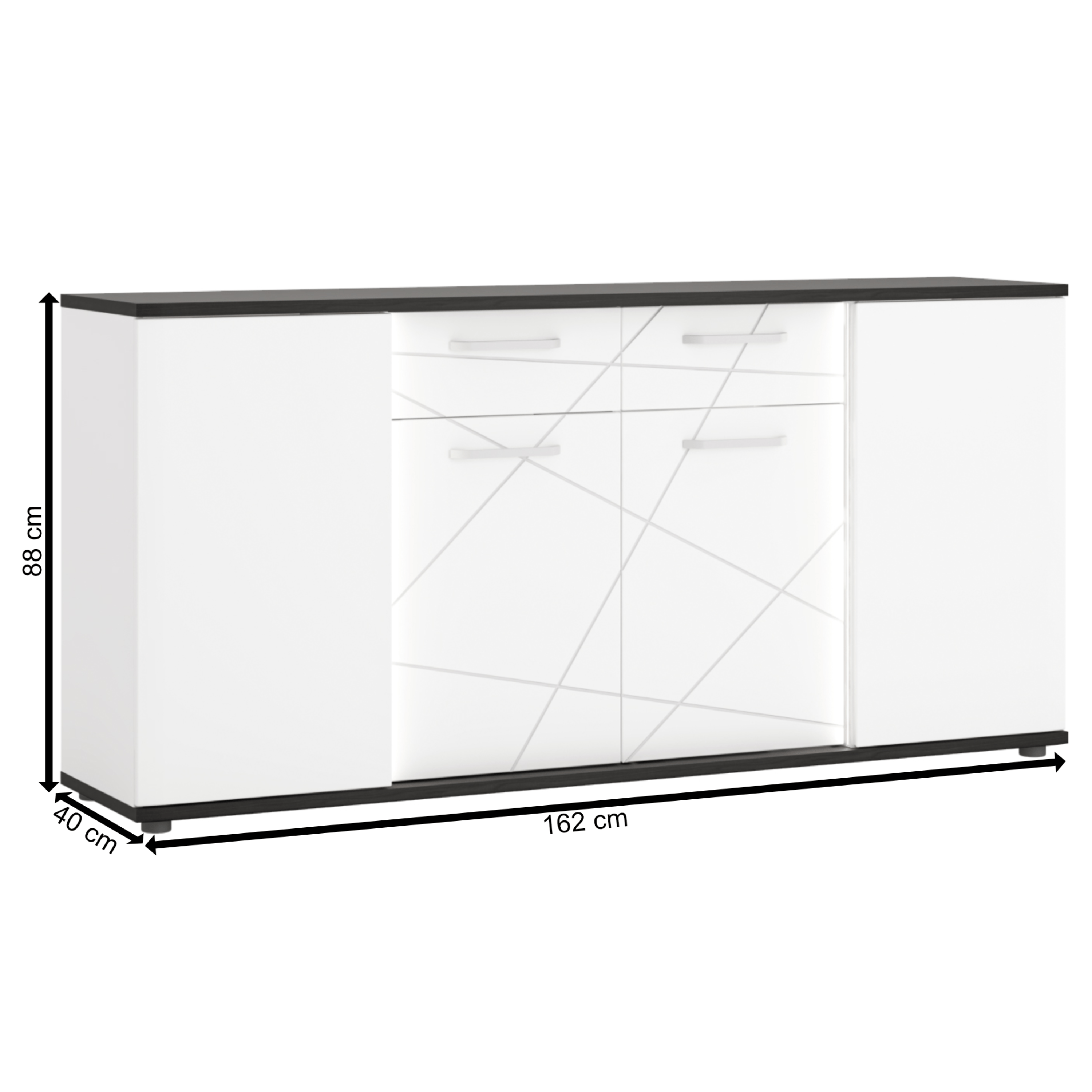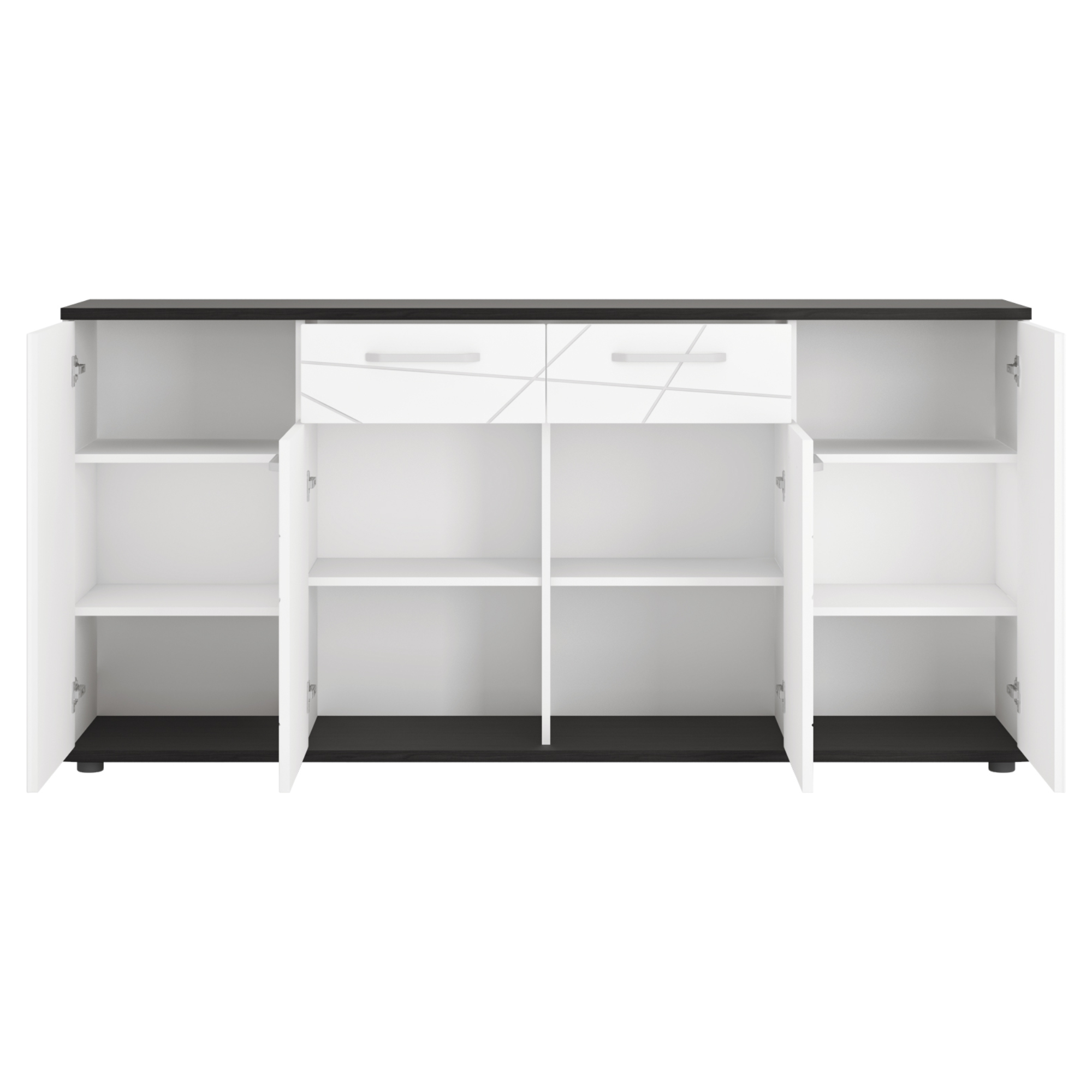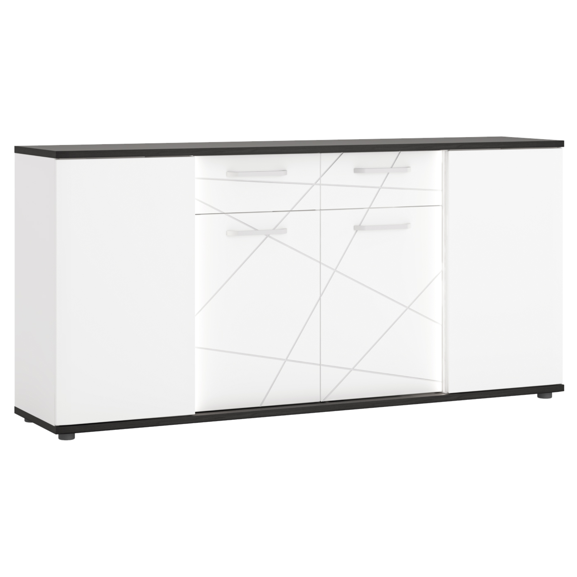 Prostorná komoda VENEZIA VENK02 v jednoduchém provedení černé a alpské bílé doplňují netradiční frézované prvky. Díky svému čistému vzhledu snadno zapadne do jakéhokoliv moderního obývacího pokoje.