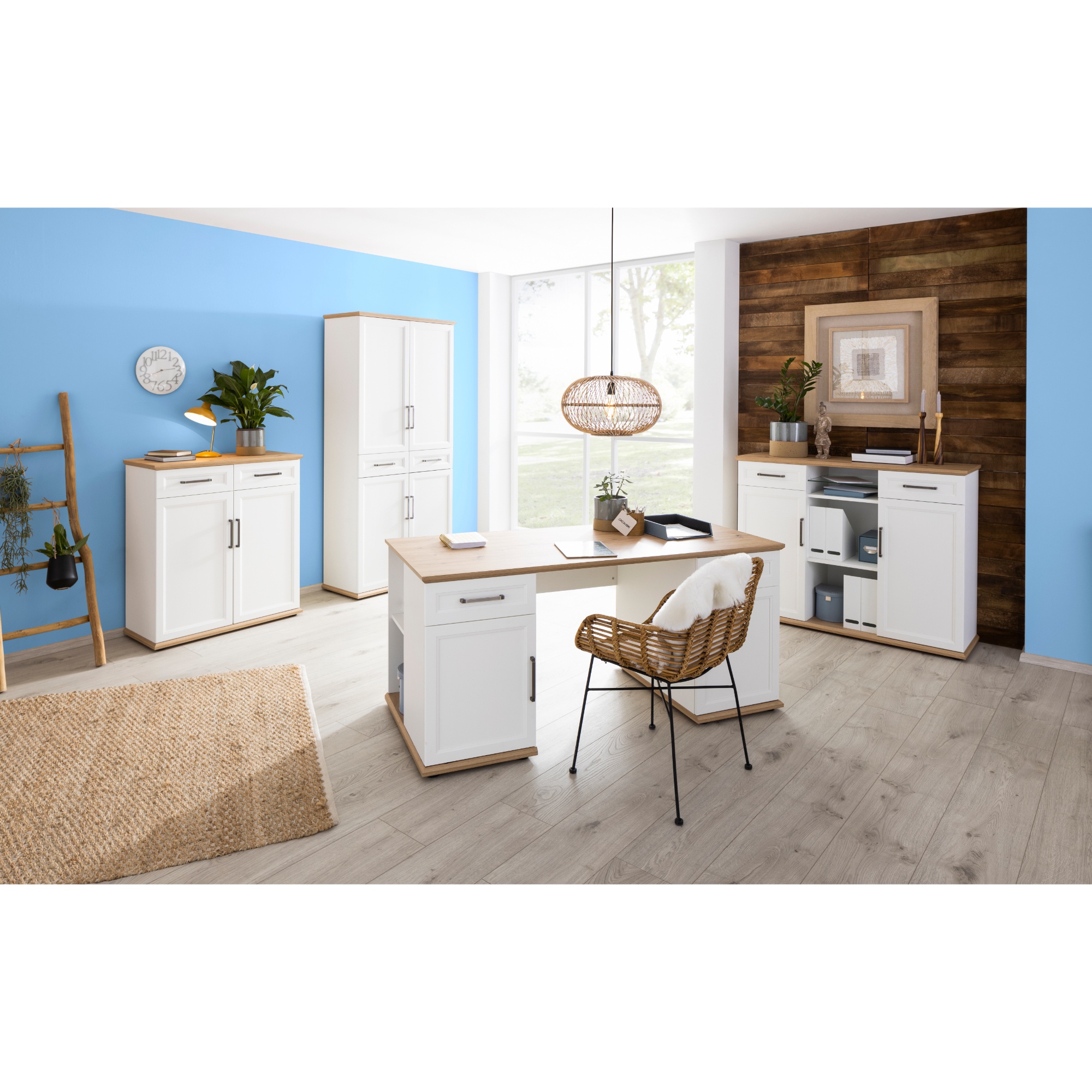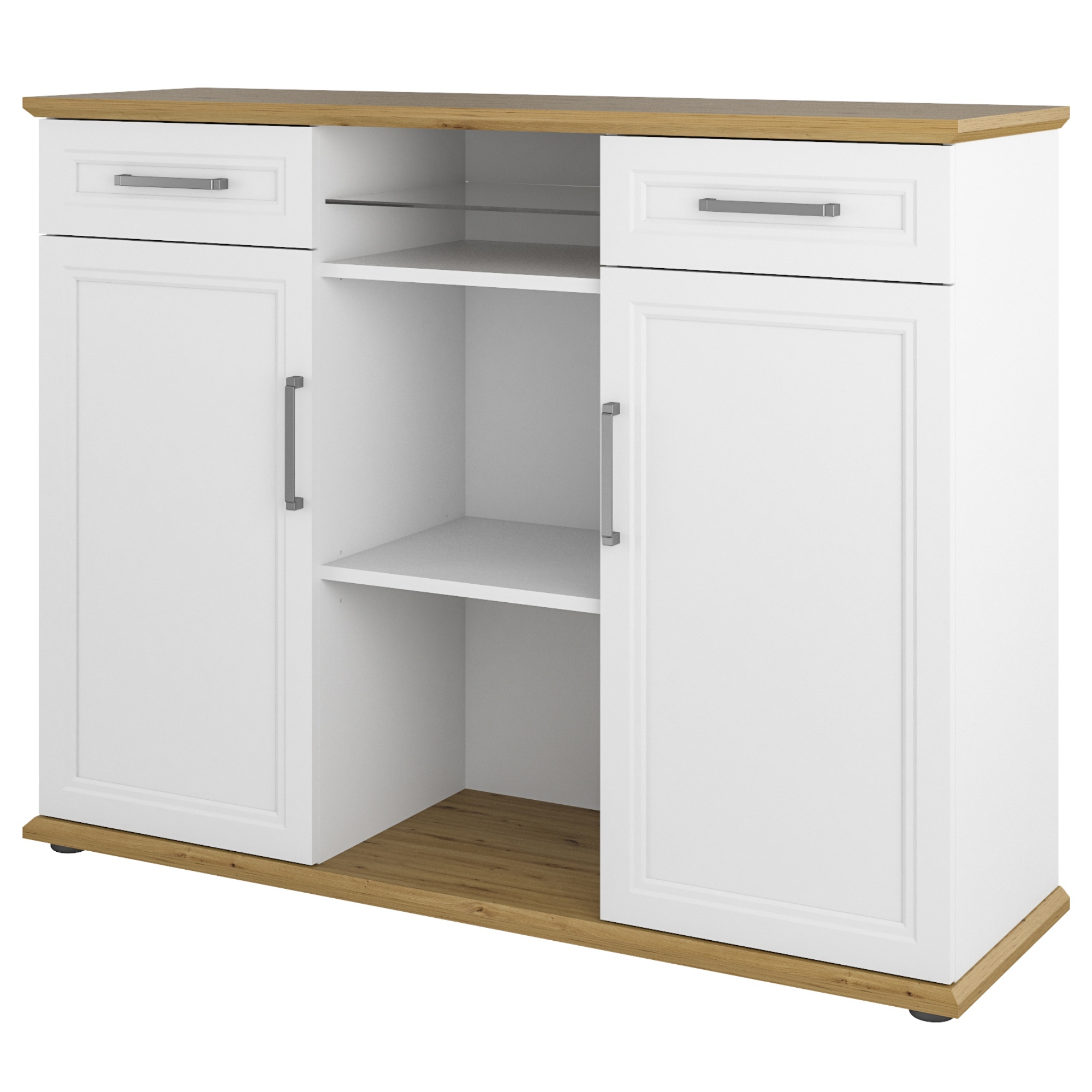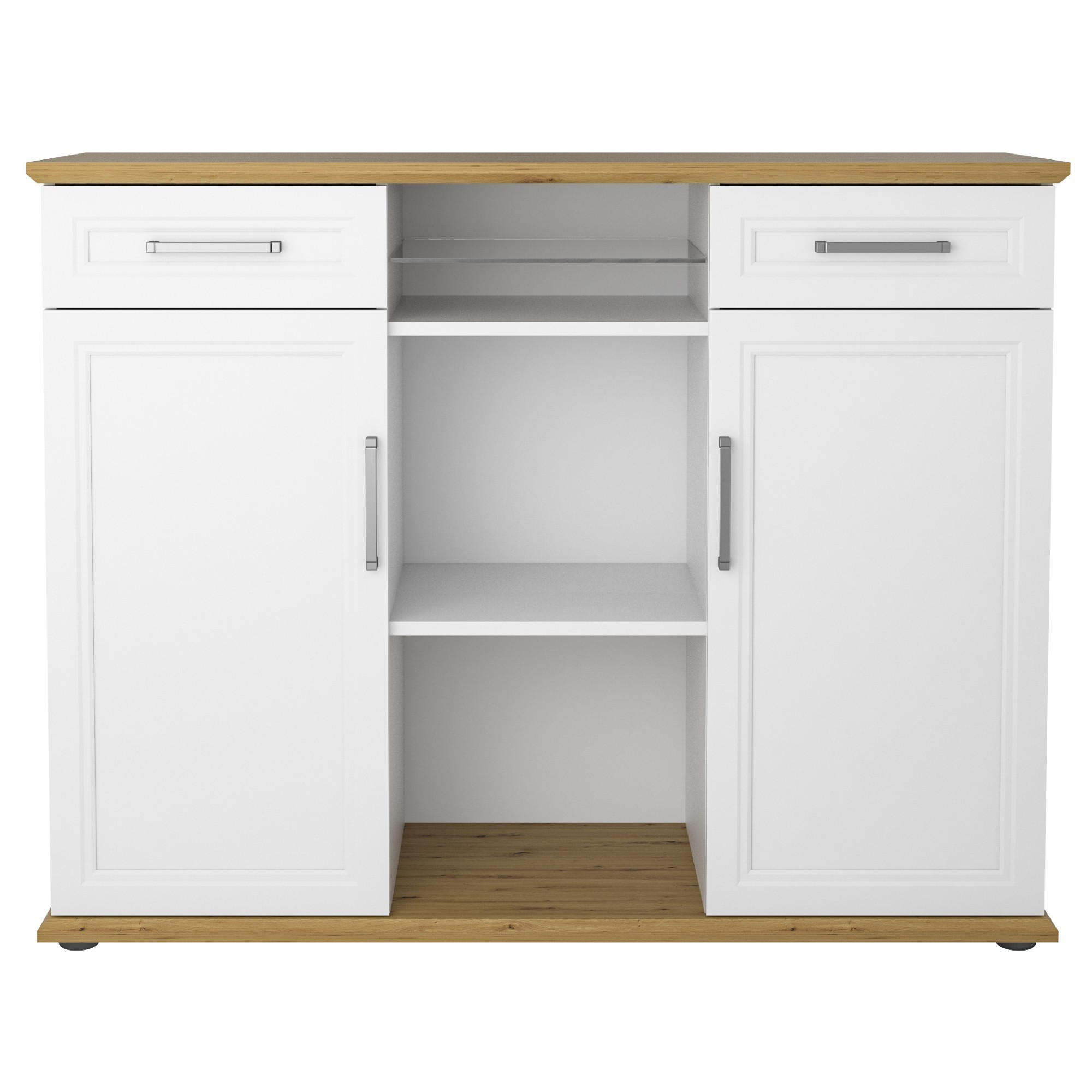 Komoda VIVIENNE díky zdobným liniím připomíná provensálský styl nábytku. Zároveň je ale doplněná o kovová madla a desku v přírodním dekoru, která naopak působí moderním dojmem. U komody najdete dvě prostorné zásuvky s plstěnou vložkou, která zamezuje posouvání předmětů při jejím otevírání. Pod každou zásuvkou se nachází krytý úložný prostor s otočnými dvířky. Zásuvky a dvířka jsou navíc vybavena tlumeným samozavíráním. V prostřední části komody najdete i otevřený úložný prostor s vloženými policemi. Jedna police je z bezpečnostního tvrzeného skla, zbylé dvě jsou z laminovaného materiálu, který je nenáročný na údržbu. Komodu můžete kombinovat s dalším nábytkem z kancelářského programu VIVIENNE.
