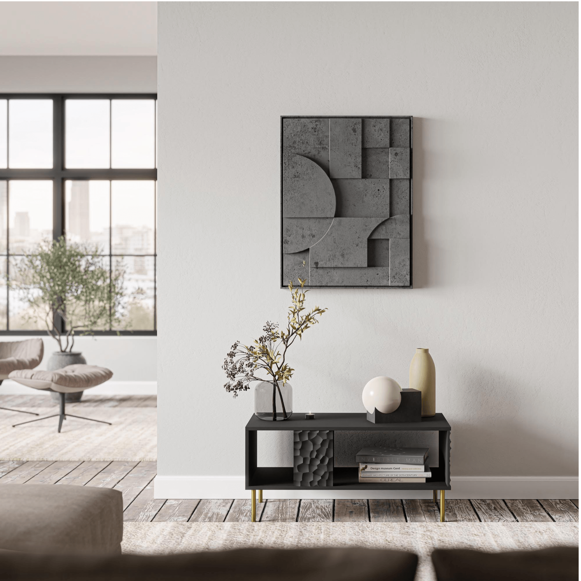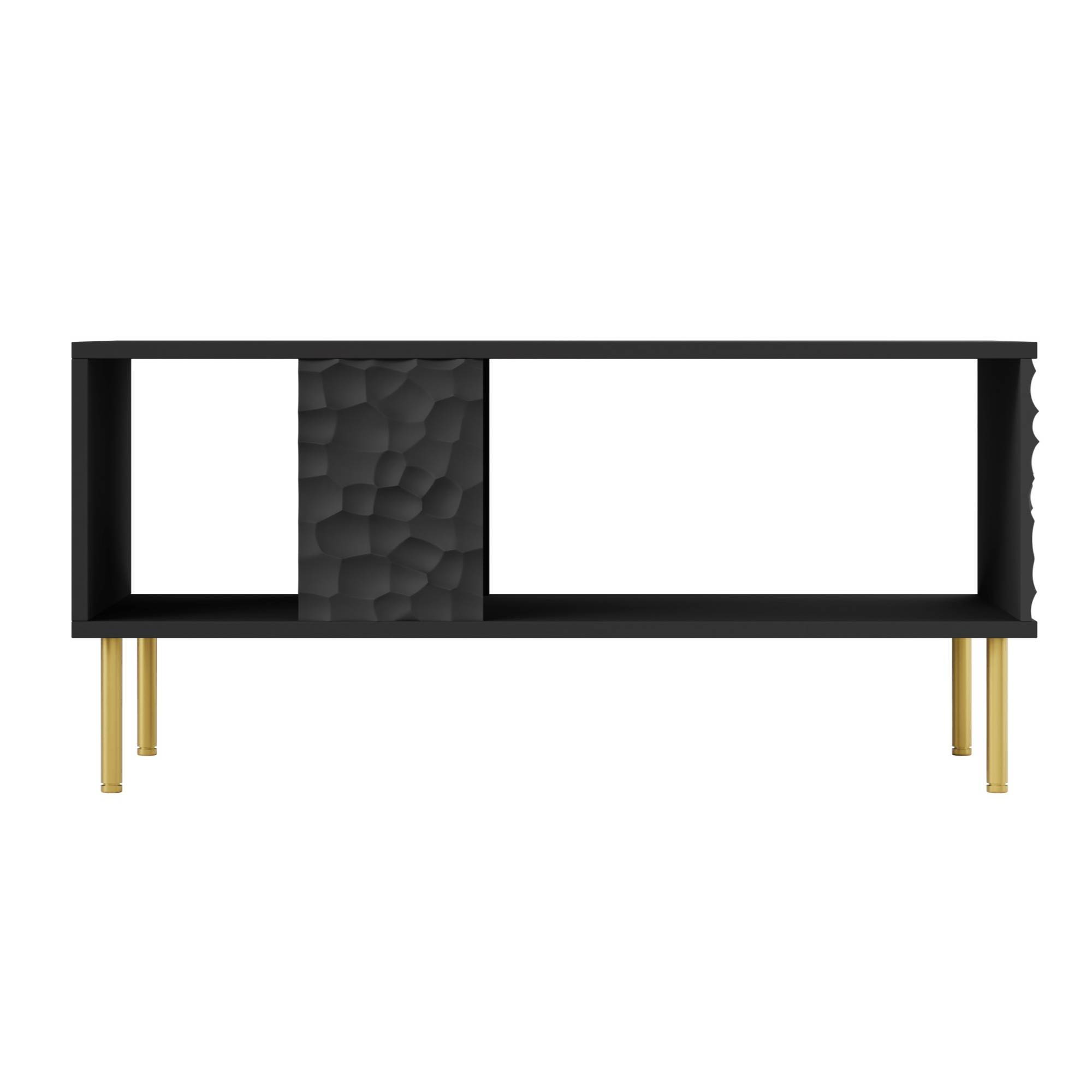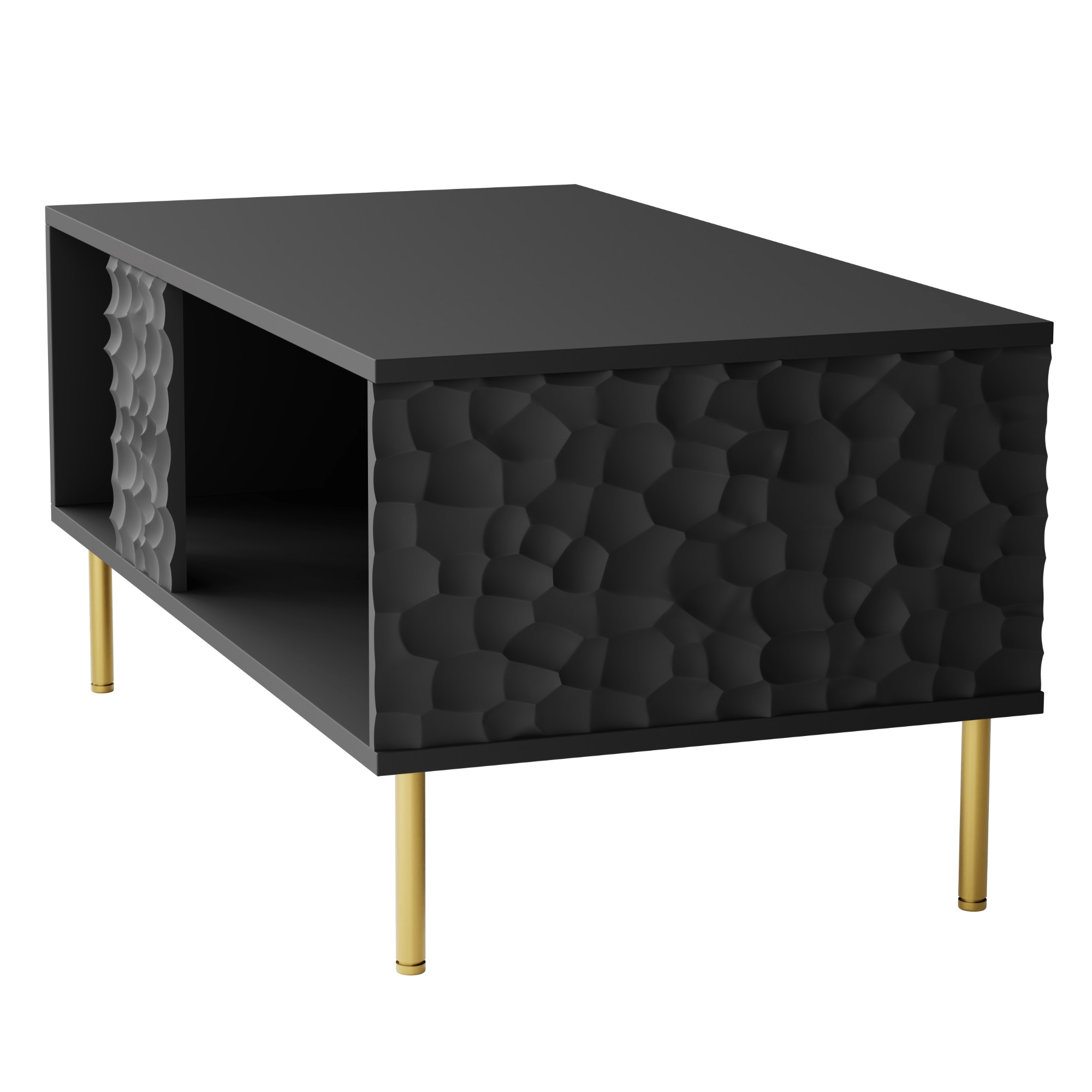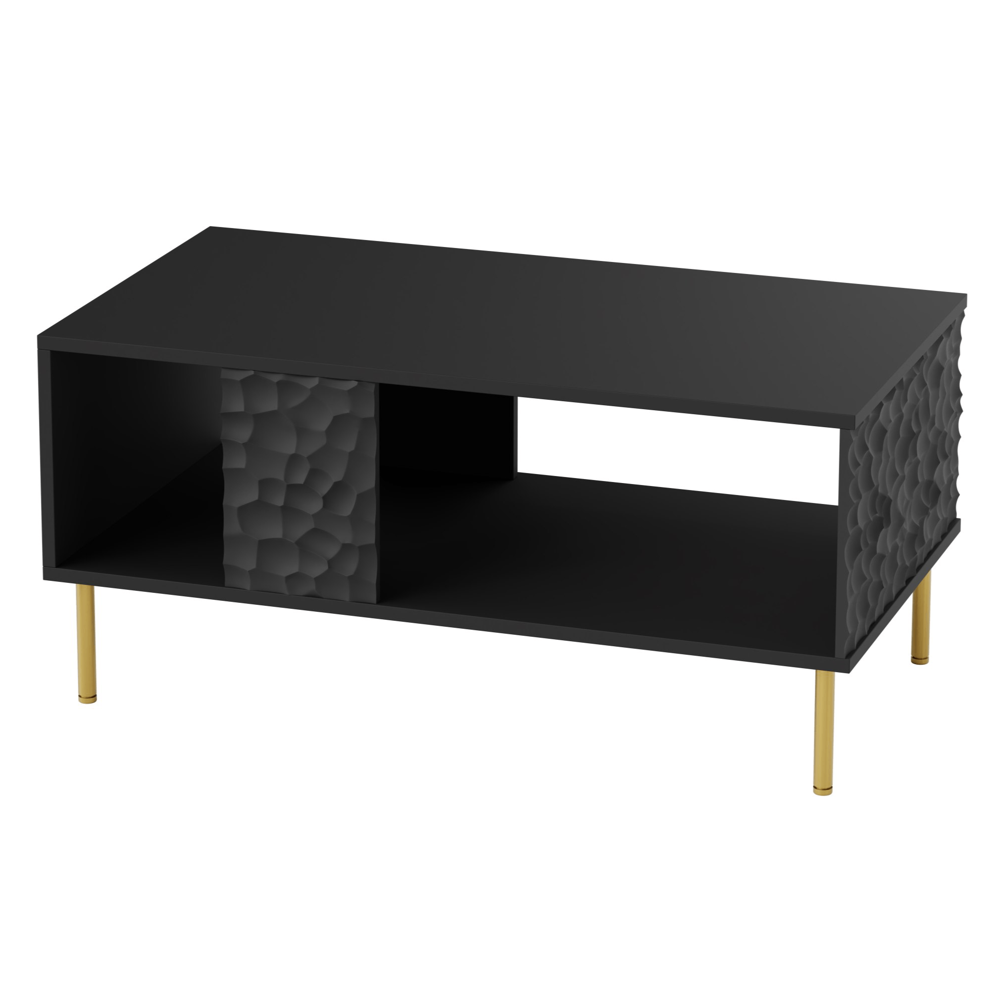 Vyrobený je z dřevovláknitého materiálu MDF, pro který je typická snadná udržovatelnost i dlouhá životnost. Stěžejním designovým prvkem je dekorativní 3D dekor bočních desek. Maximální stabilitu zajišťuje čtveřice nožek z kovu ve zlatém odstínu. Spodní celoplošná police pak nabízí prostor pro knihy, časopisy a jiné potřeby, které se hodí mít po ruce.