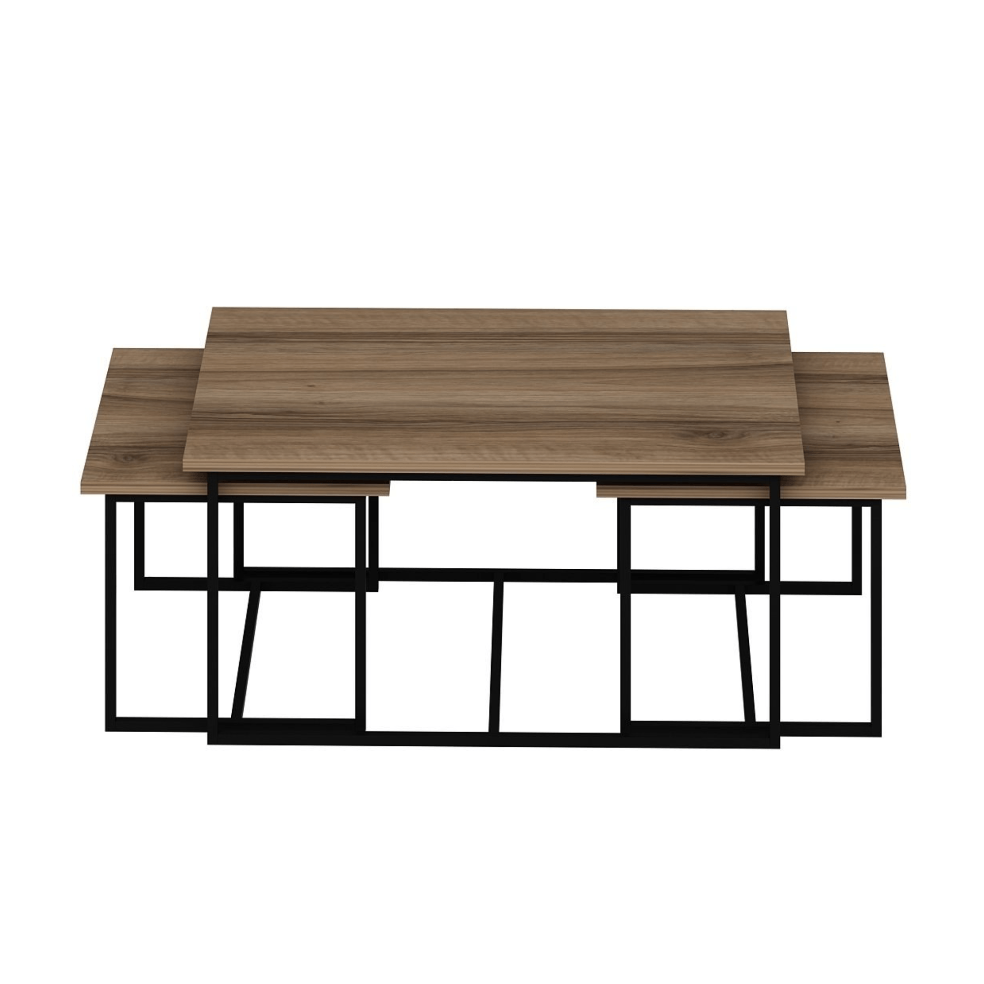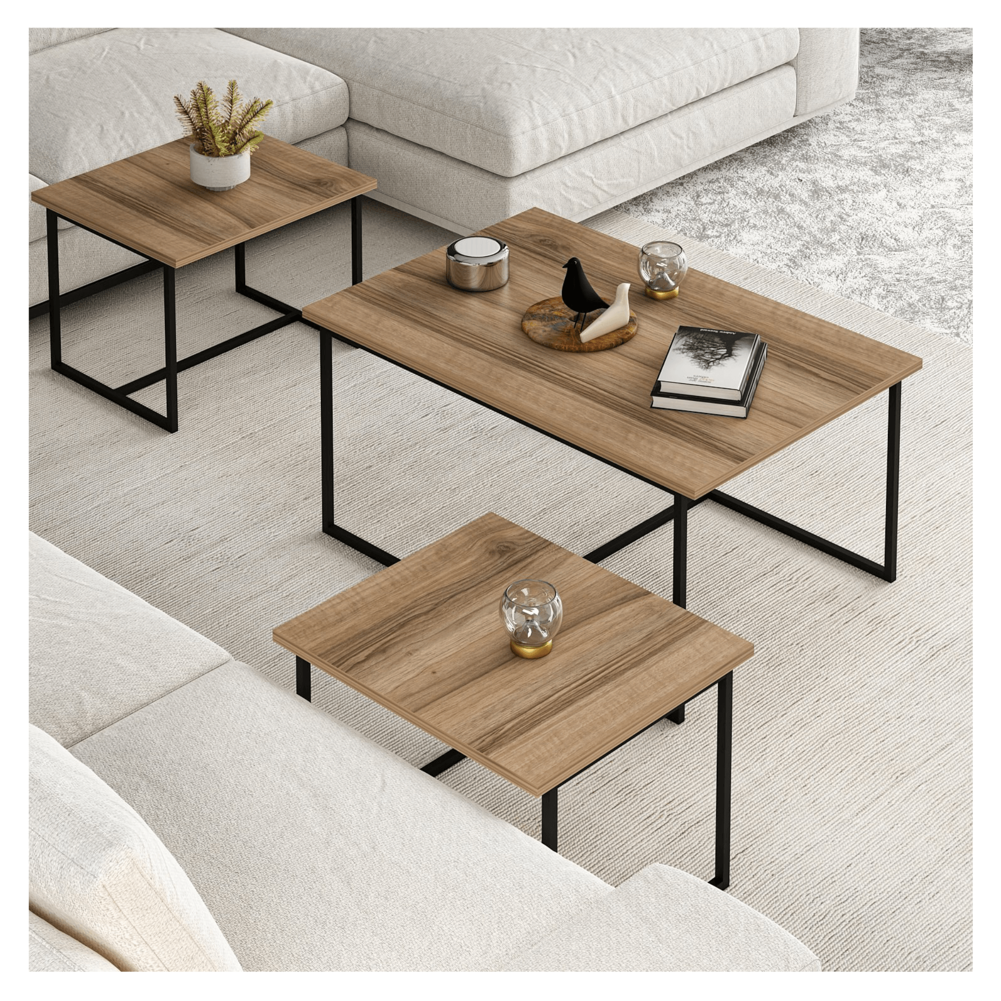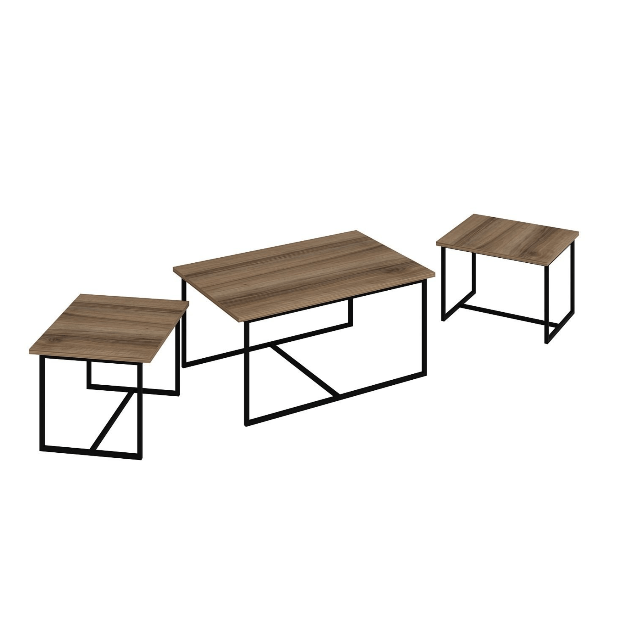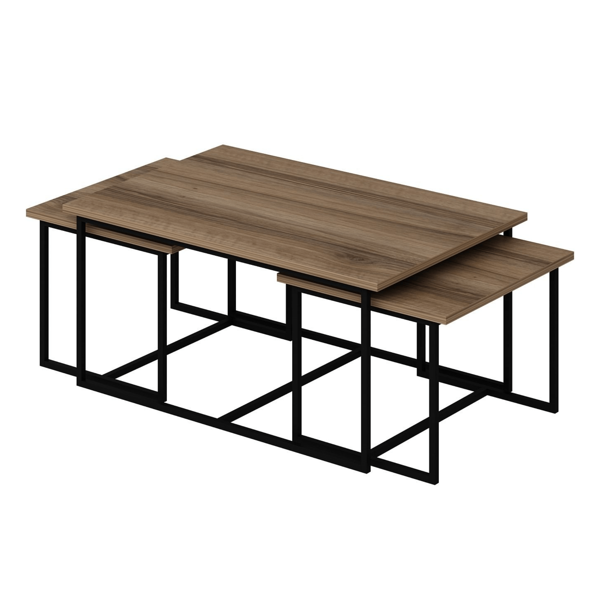 Desky stolků jsou vyrobeny z laminovaného dřevěného materiálu, pro který je typická snadná udržovatelnost i dlouhá životnost. Laděny jsou do dekoru ořechu. Stabilitu zajišťuje kovová konstrukce. Díky odlišným velikostem lze nízké stolky zasunout pod vyšší, čímž v případě potřeby ušetříte cenné místo.