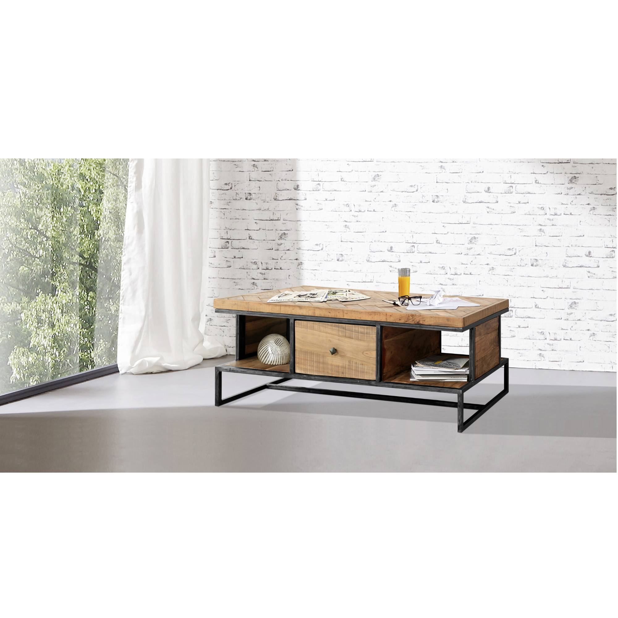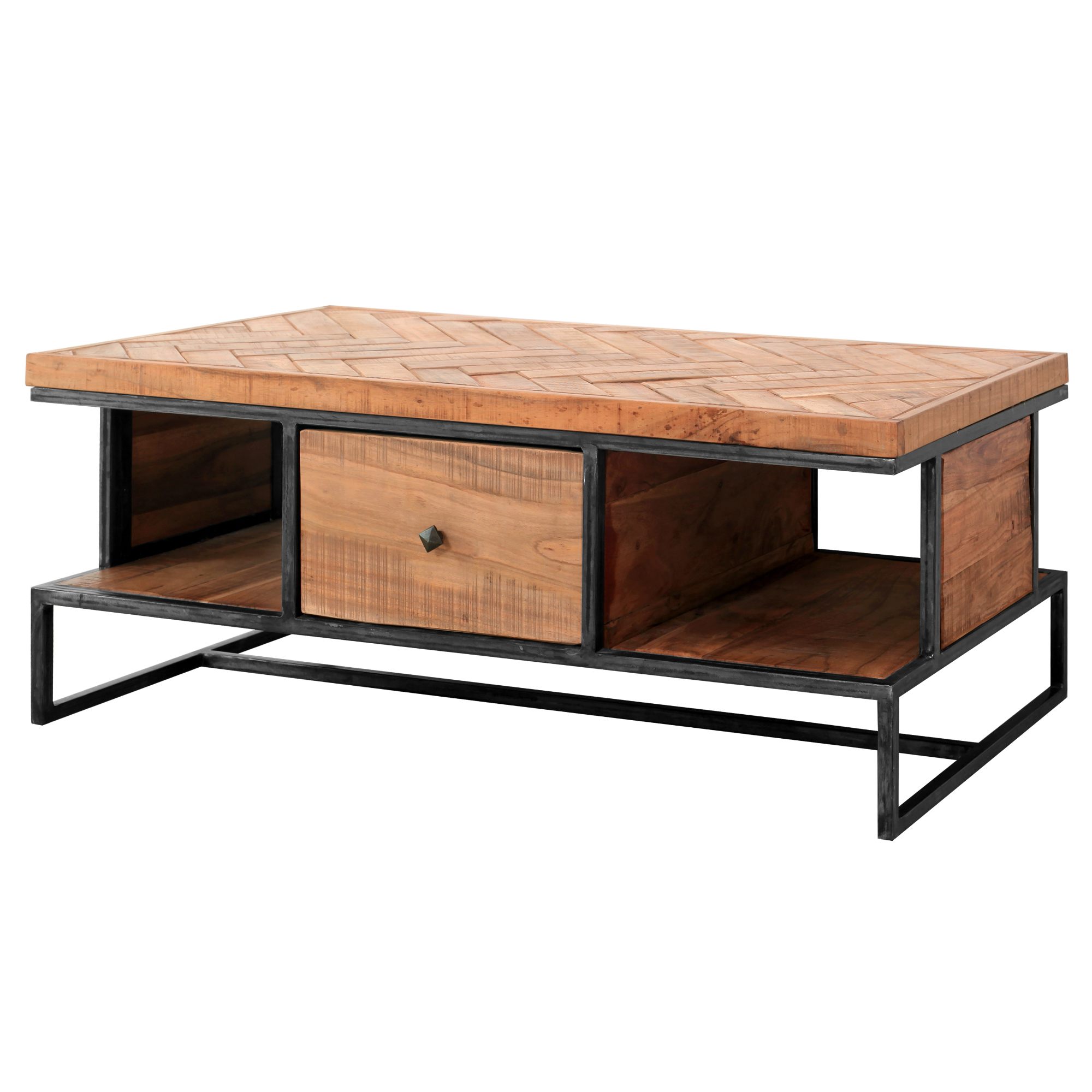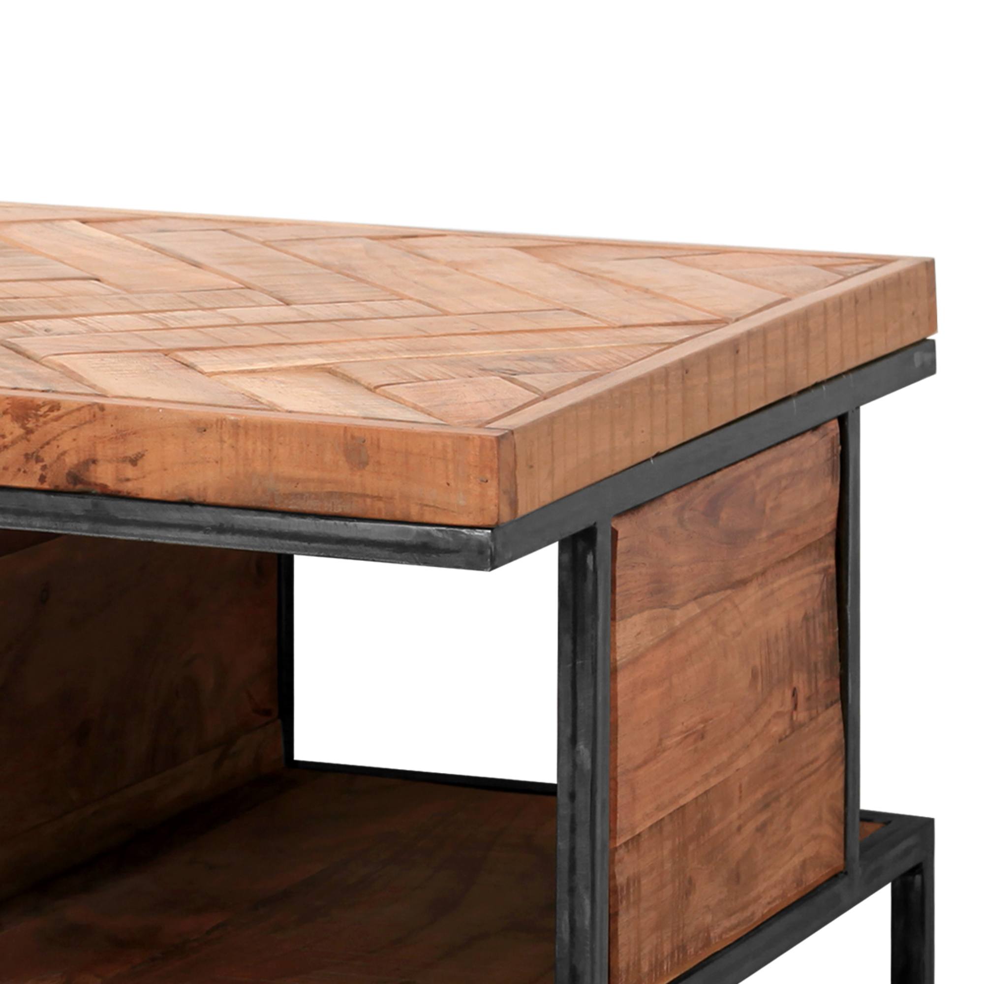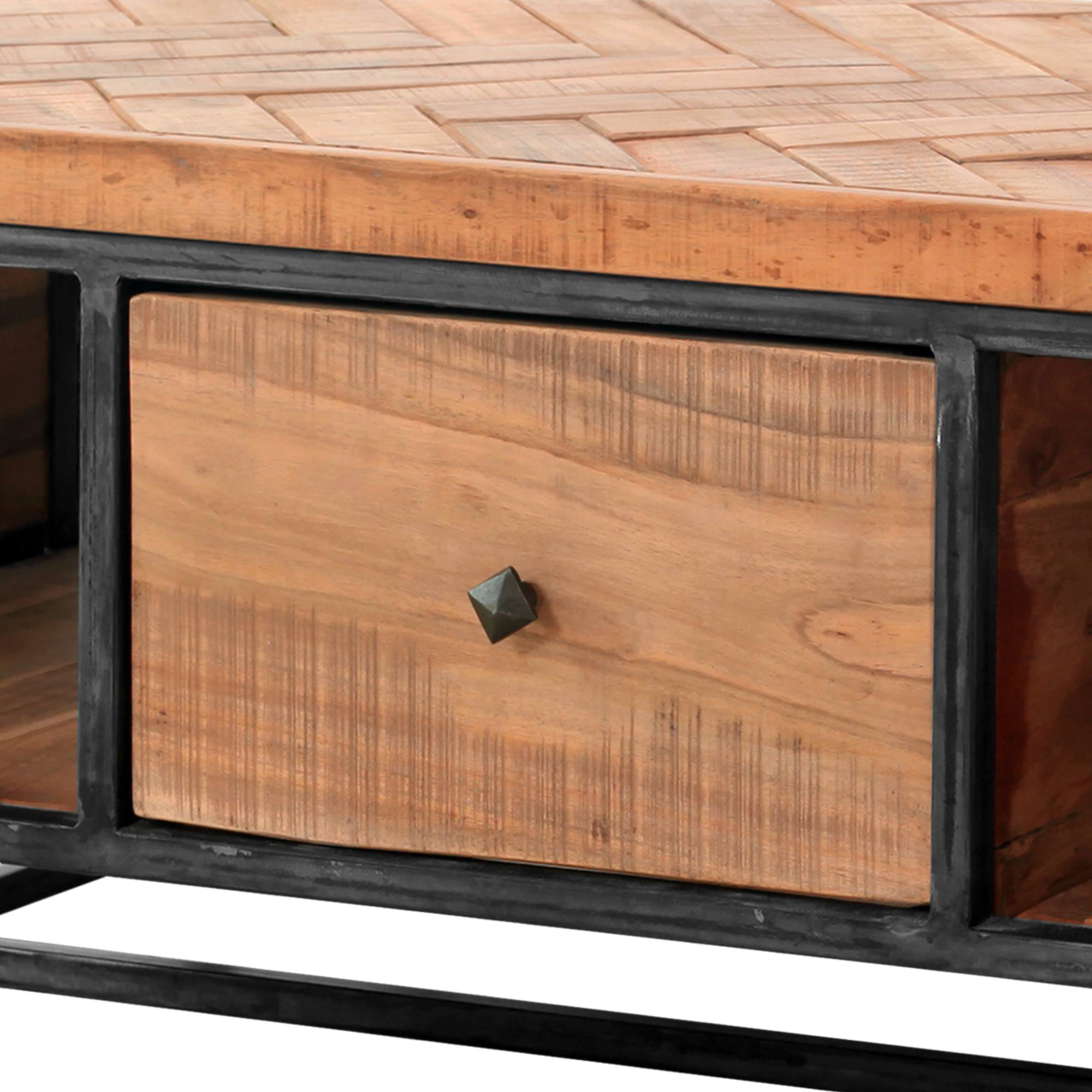 Kombinace kovu a masivu z akácie dodává robustnímu konferenčnímu stolku PARQUET industriální nádech. Kovový rám zajišťuje vysokou stabilitu a přírodní barevné tóny dřeva zútulňují interiér. Praktickým prvkem je úložný prostor ve formě jedné zásuvky a dvou polic krytých bočnicemi stolu. Typické pro tento druh nábytku jsou přiznané vady dřeva a ruční, hrubé zpracování, které dodává každému kusu naprosto unikátní vzhled. Týká se to i kovových konstrukcí, které jsou opatřeny patinou a nakonec přelakovány. To vše ve výsledku dodává nábytku jedinečnost, kdy se provedení každého kusu může mírně lišit od produktové fotografie.