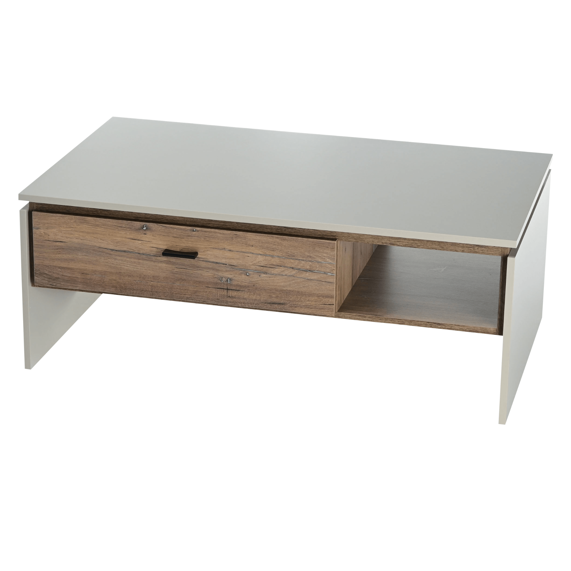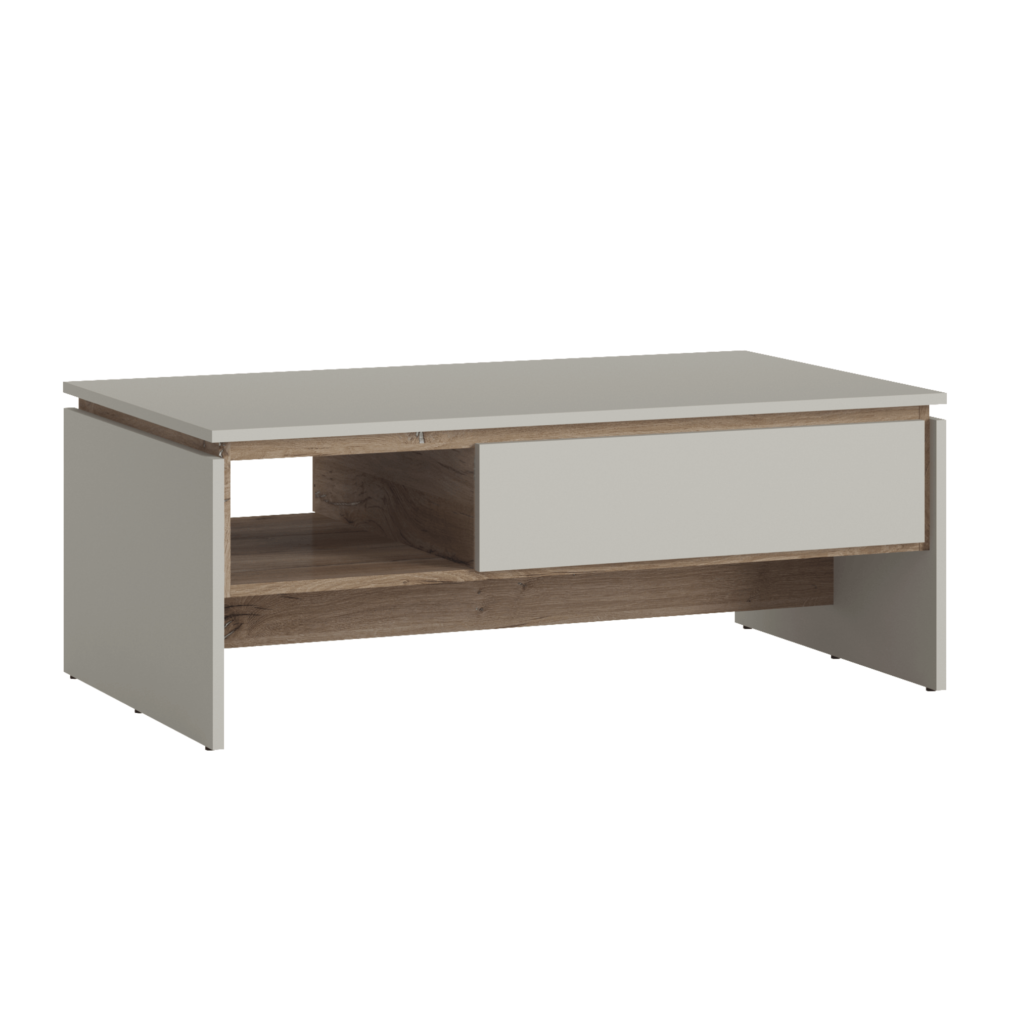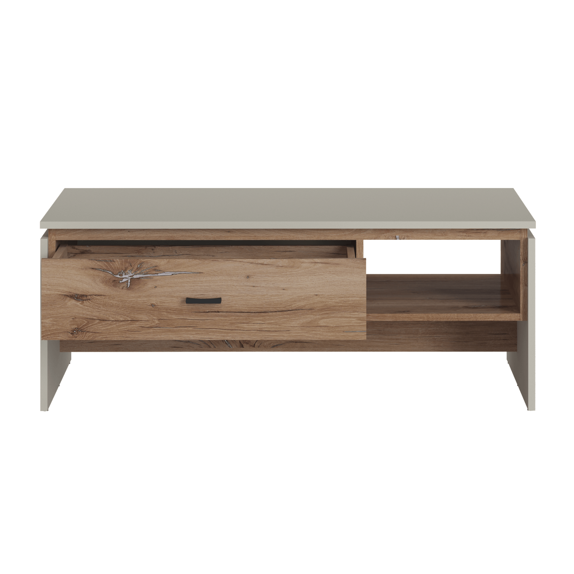 Vyrobený je z laminovaného dřevěného materiálu, pro který je typická snadná udržovatelnost i dlouhá životnost. Hlavní odkládací plocha je doplněna o dodatečný úložný prostor v podobě jedné prostorné zásuvky a boční otevřené sekce vedle ní. Kontrastní barevné provedení, ve kterém se střetává šedá s dekorem dubu tmavého, navíc domácnosti vdechne dojem přírody.