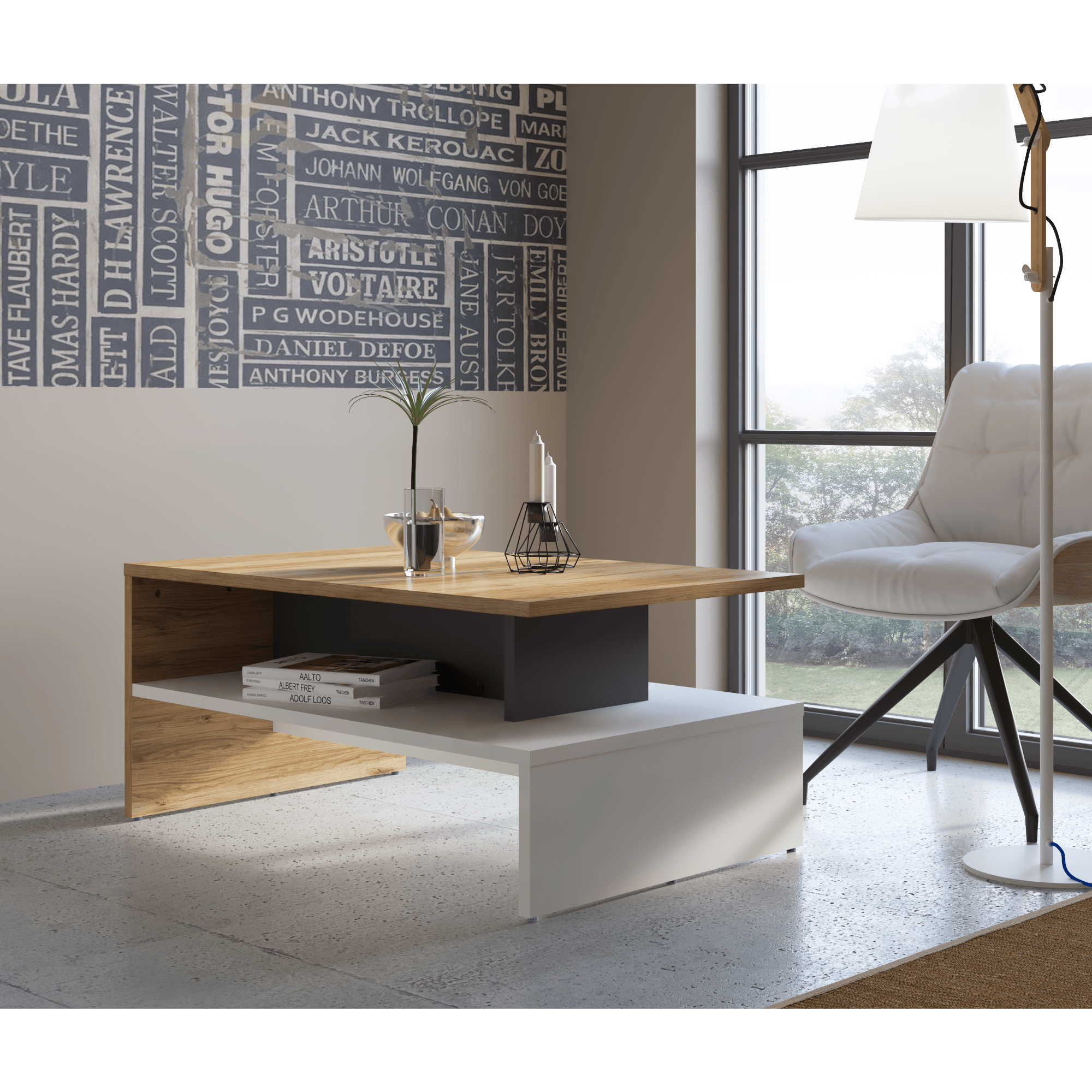 Moderní konferenční stolek SAGE jednoduše zapadne do každého obývacího pokoje. Vyrobený je z laminovaného dřevěného materiálu, pro který je typická snadná udržovatelnost i dlouhá životnost. Hlavní odkládací deska je doplněna o spodní polici, ta je dělena centrální nosnou příčkou, která hlavní desku podporuje, zvyšuje stabilitu stolku a zároveň efektivně dělí úložný prostor. Konferenční stolek SAGE podpoří styl vaší domácnosti a stane se její nedílnou součástí.