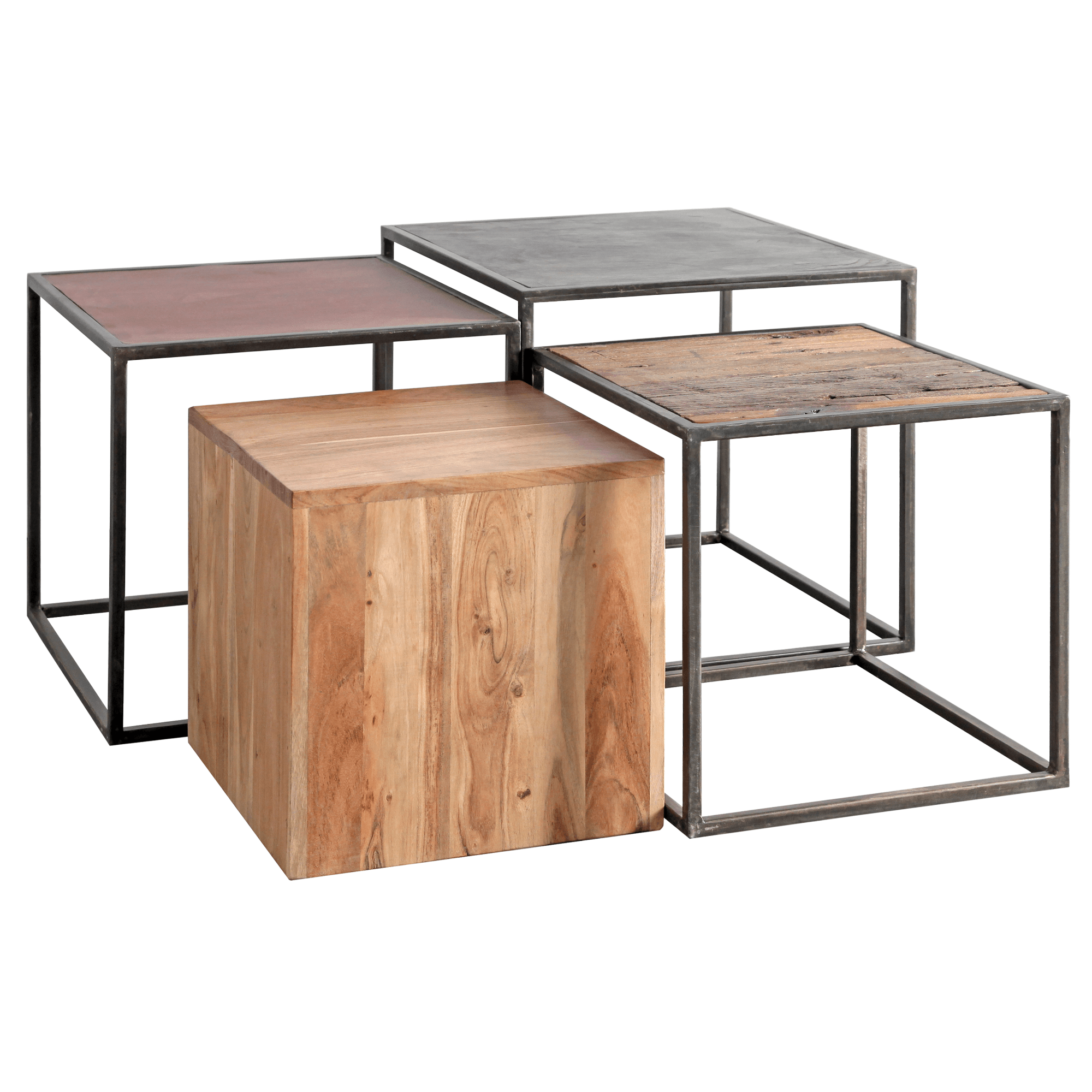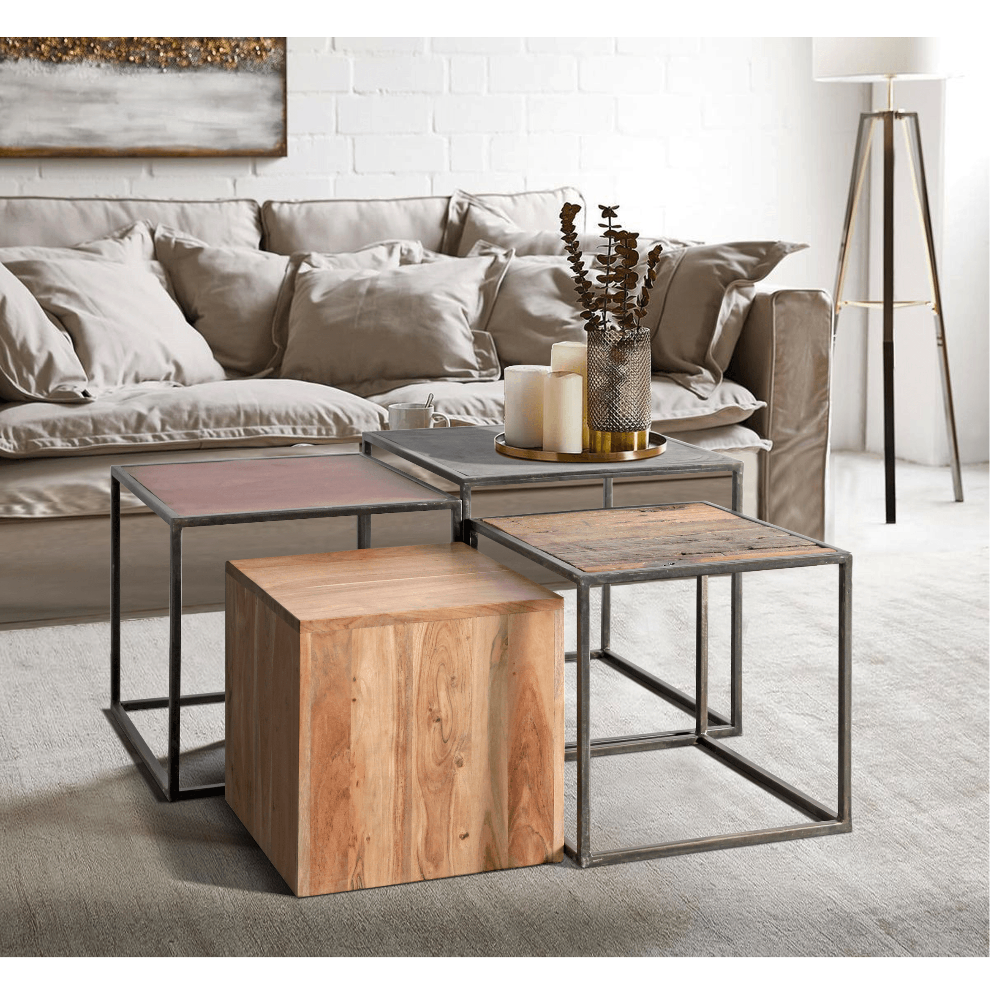 Společným jmenovatelem jsou odkládací desky z masivního dřeva exotické dřeviny, která vyniká vysokou pevností a výraznou strukturou dřeva s přirozenými vadami, které se kus od kusu liší – tomu přispívá i hrubé ruční opracování. Každý jeden stolek je tak naprostým originálem. Maximální stabilitu pak zajišťuje kovová podnož s patinou – ta stolkům propůjčuje výrazný industriální nádech. Díky konstrukci a velikosti jednotlivých stolků je lze složit do sebe, což pomůže ušetřit cenné místo.