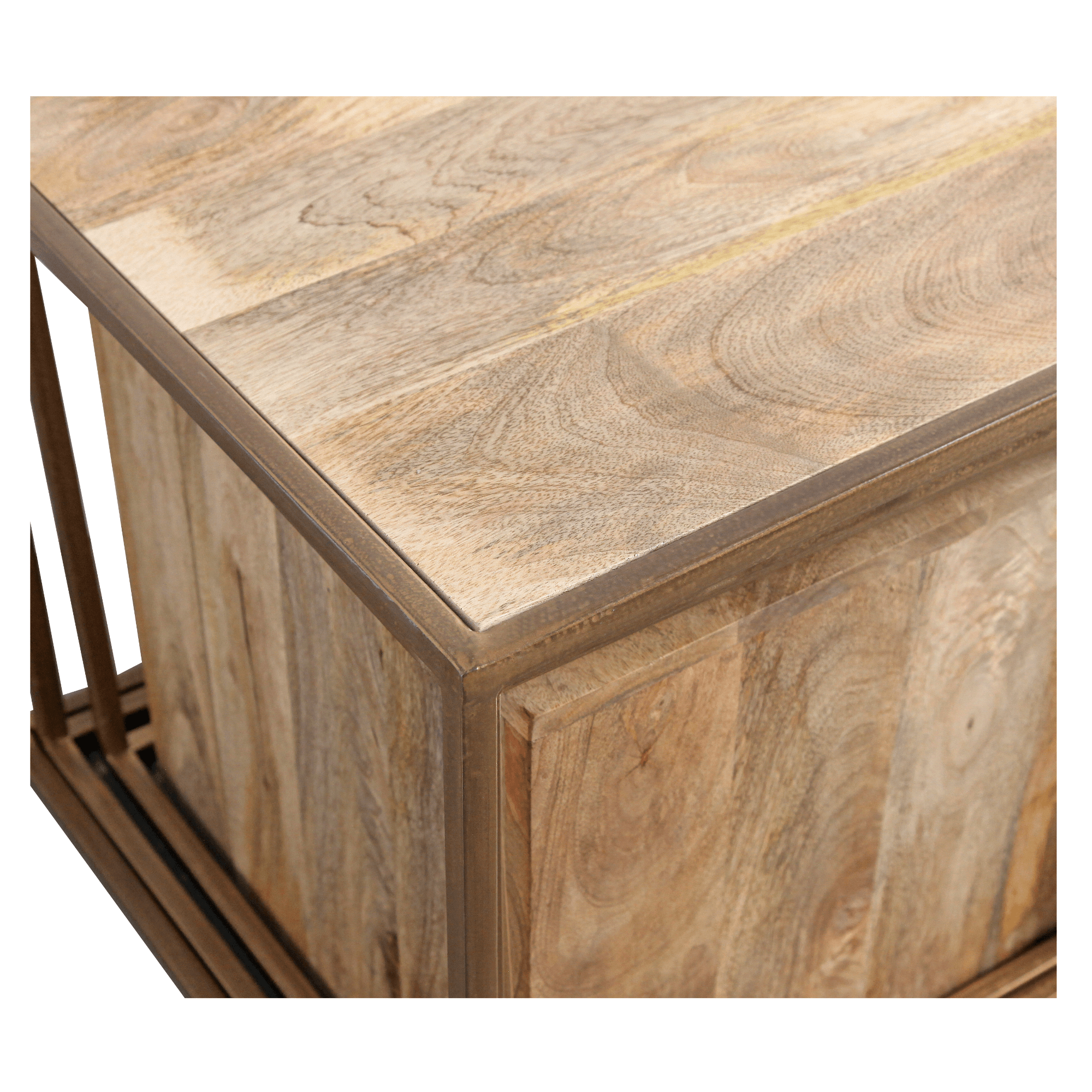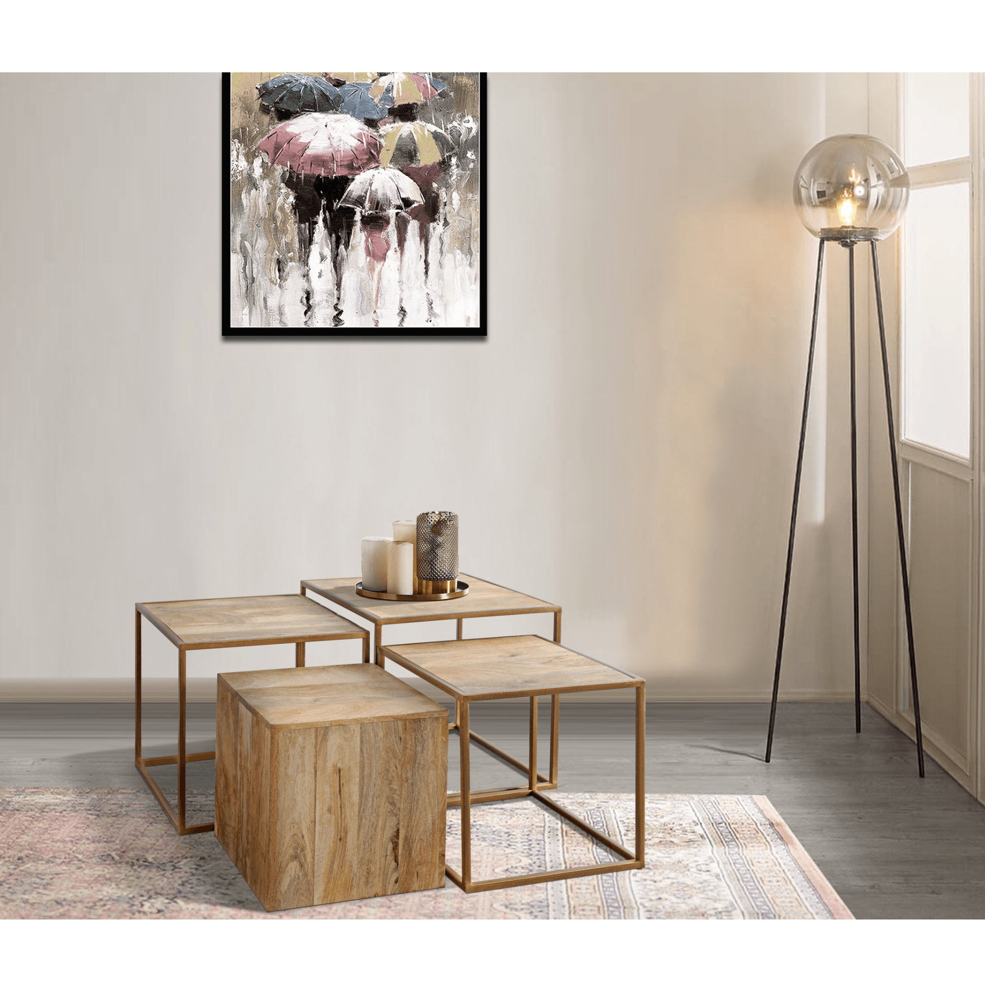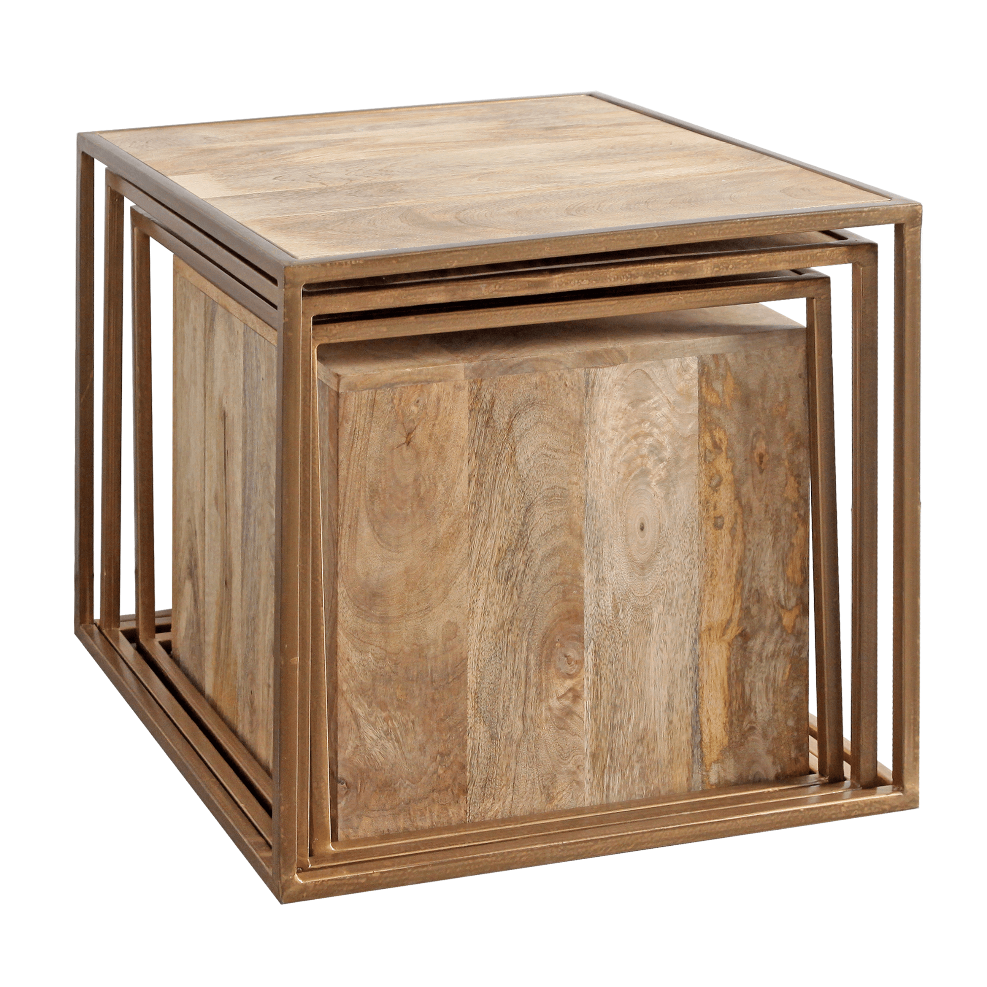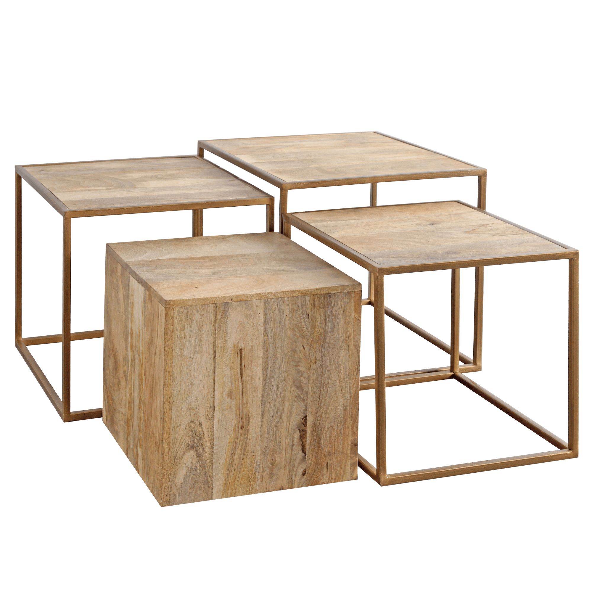 Společným jmenovatelem jsou odkládací desky z masivního dřeva exotické dřeviny, která vyniká vysokou pevností a výraznou strukturou dřeva s přirozenými vadami, které se kus od kusu liší – tomu přispívá i hrubé ruční opracování. Každý jeden stolek je tak naprostým originálem. Maximální stabilitu pak zajišťuje kovová podnož s patinou – ta stolkům propůjčuje výrazný industriální nádech. Díky konstrukci a velikosti jednotlivých stolků je lze složit do sebe, což pomůže ušetřit cenné místo.