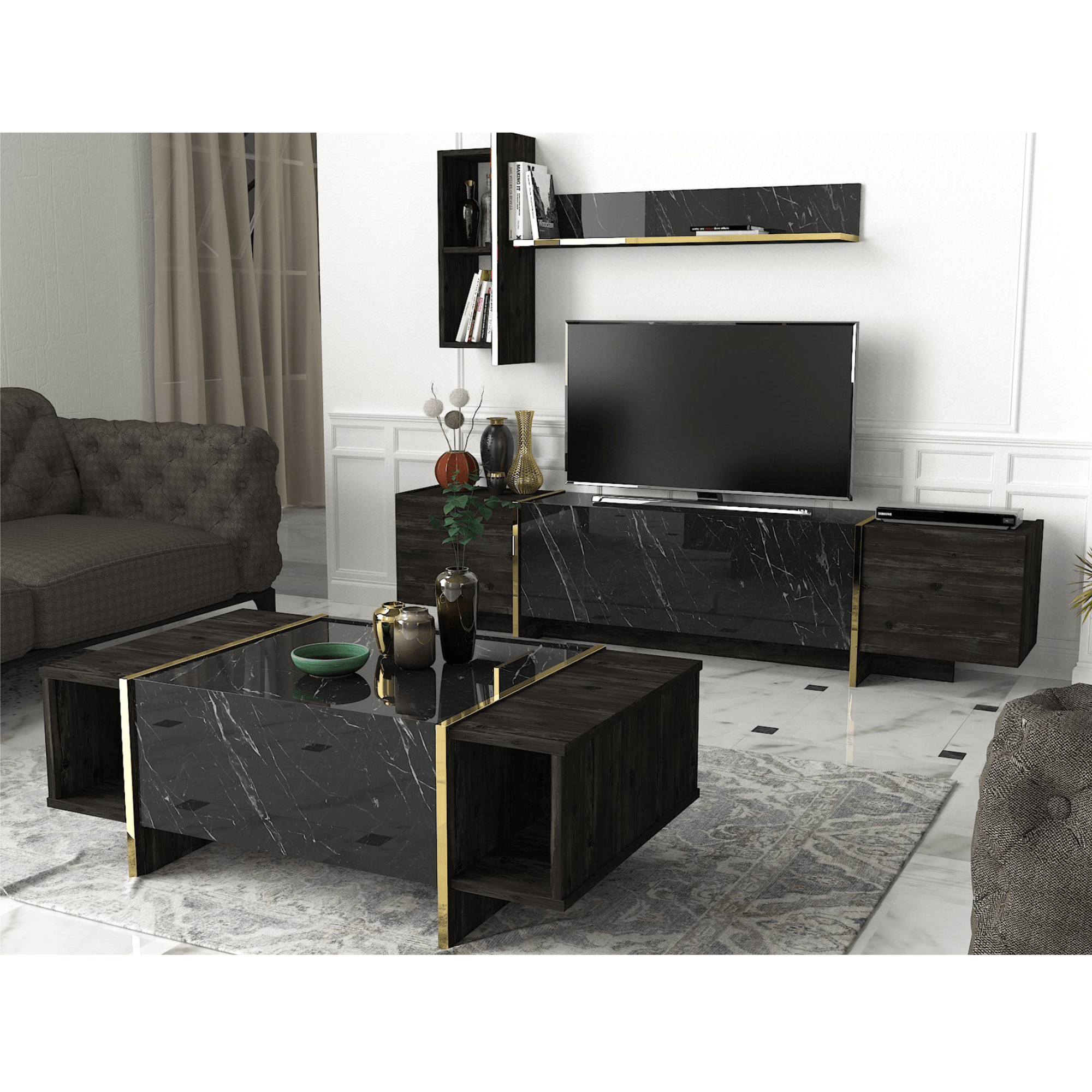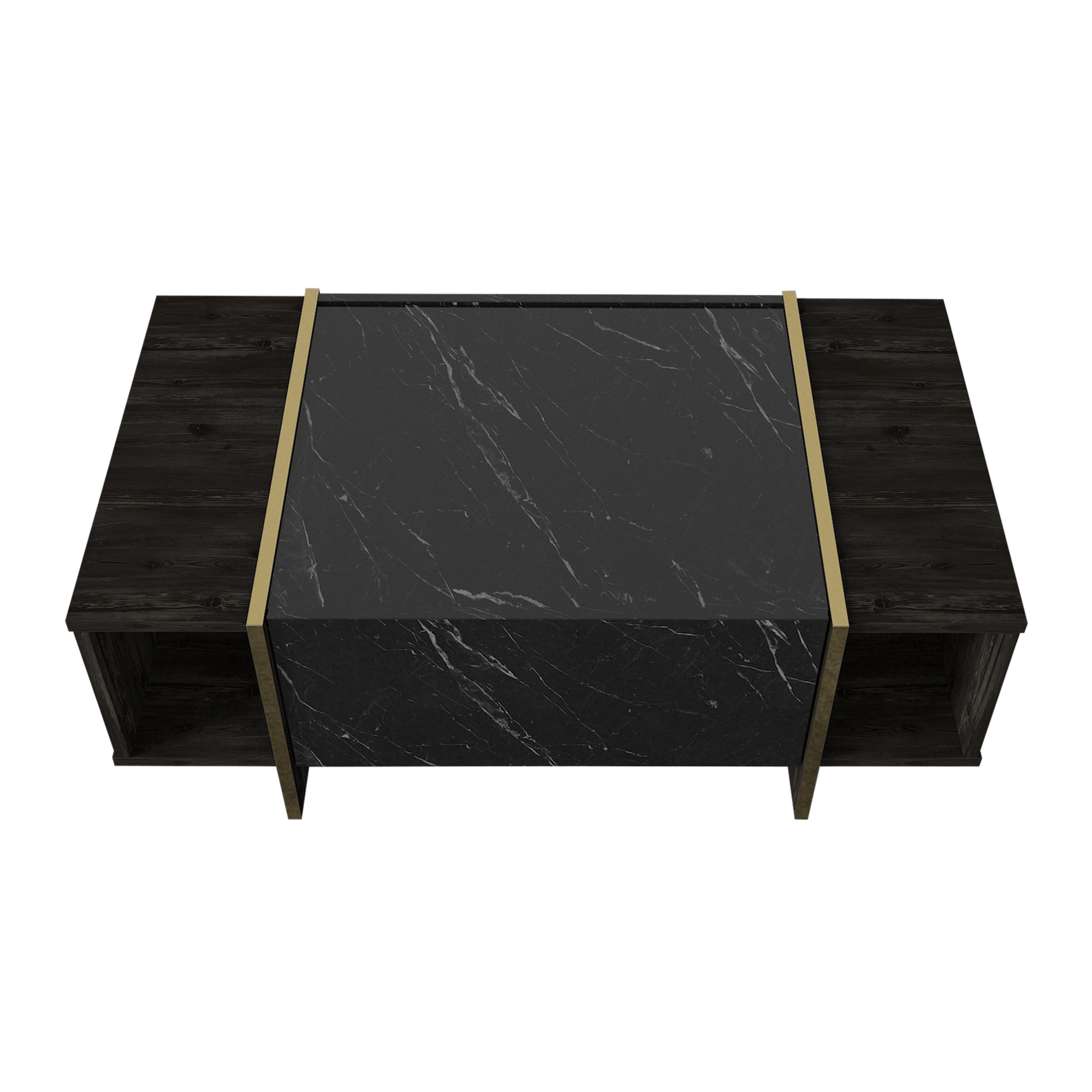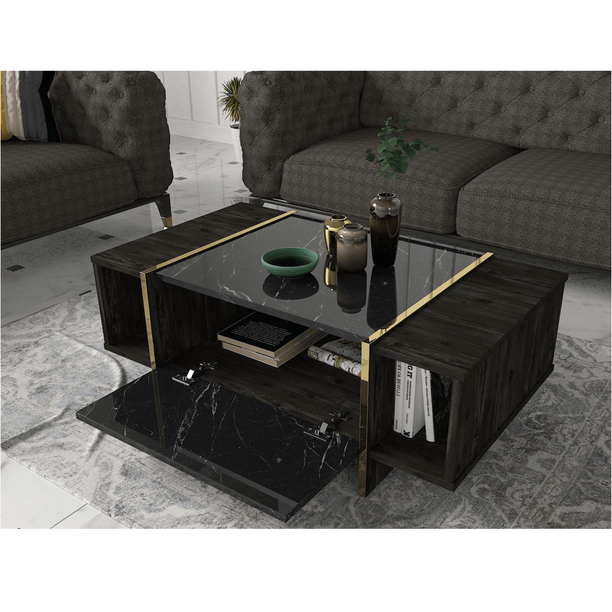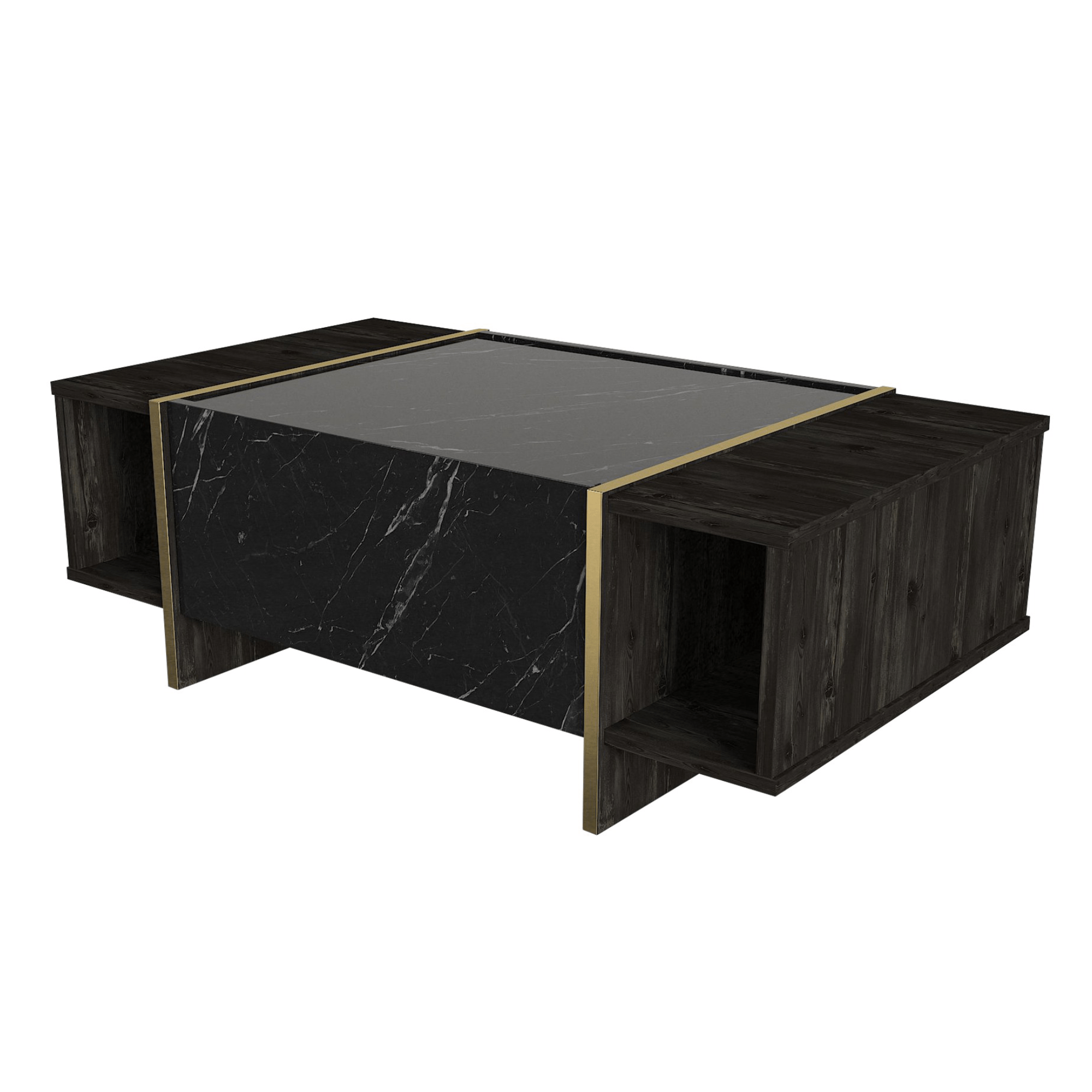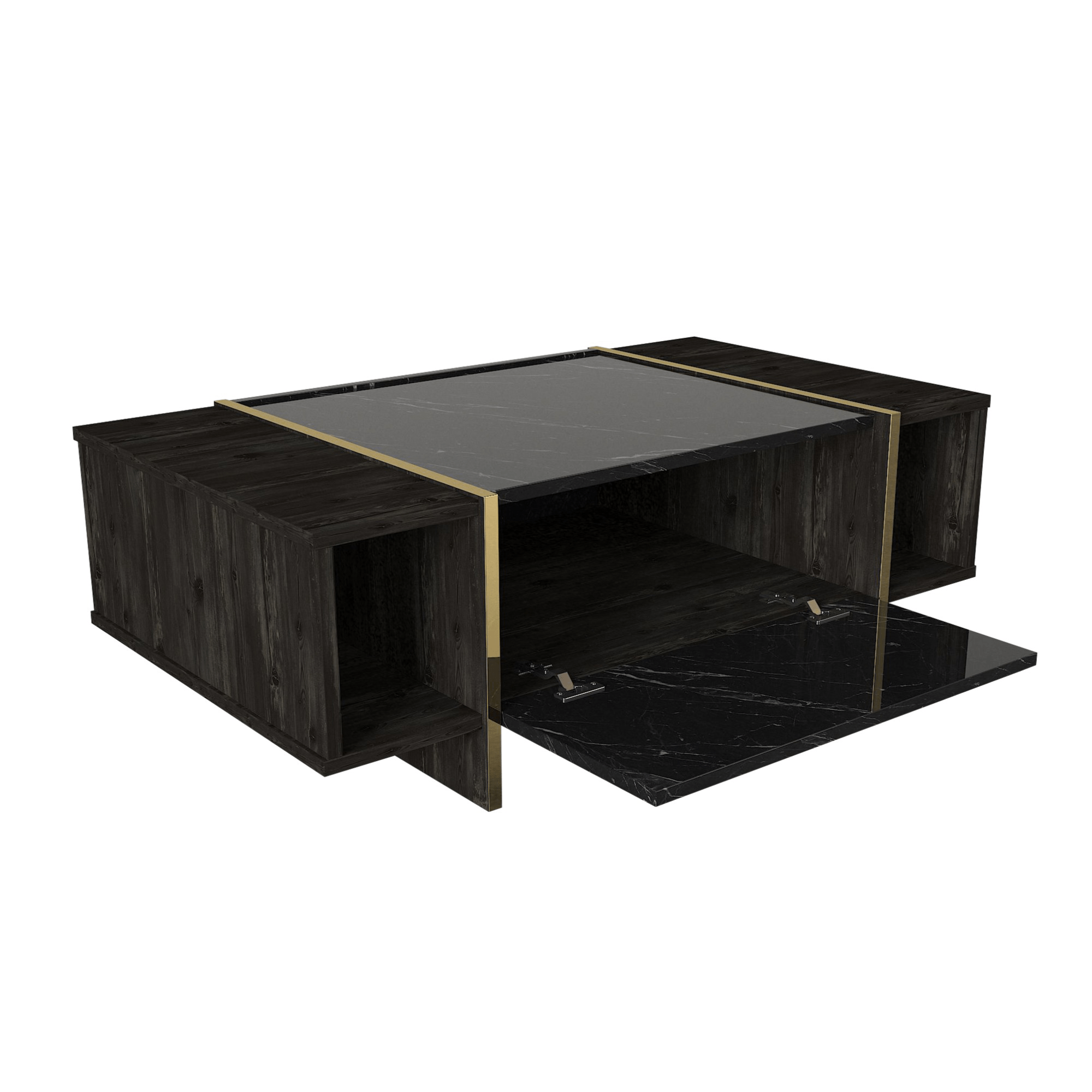 Vyrobený je z laminovaného dřevěného materiálu, pro který je typická snadná udržovatelnost i dlouhá životnost. Boční oblast a okrajové části odkládací plochy jsou oděny do dekoru dřeva tmavě hnědé barvy, zatímco centrální odkládací plocha a front skříňky s výklopnými dvířky imitují mramorovou desku – ta stolku dodává kontrastní rozměr a interiéru punc luxusu. Mramorová oblast je navíc po stranách lemována zlatými prstenci, které ve spod přirozeně přechází ve stabilní podnož.