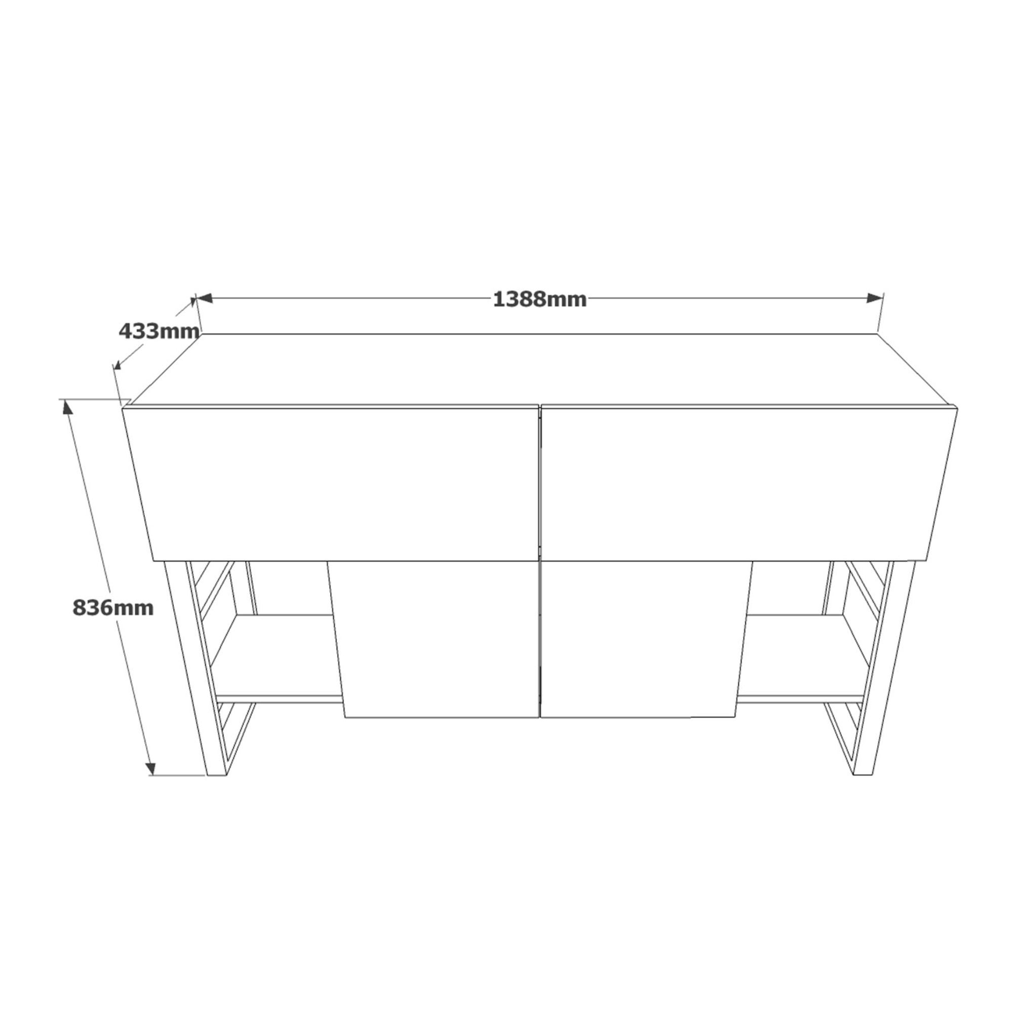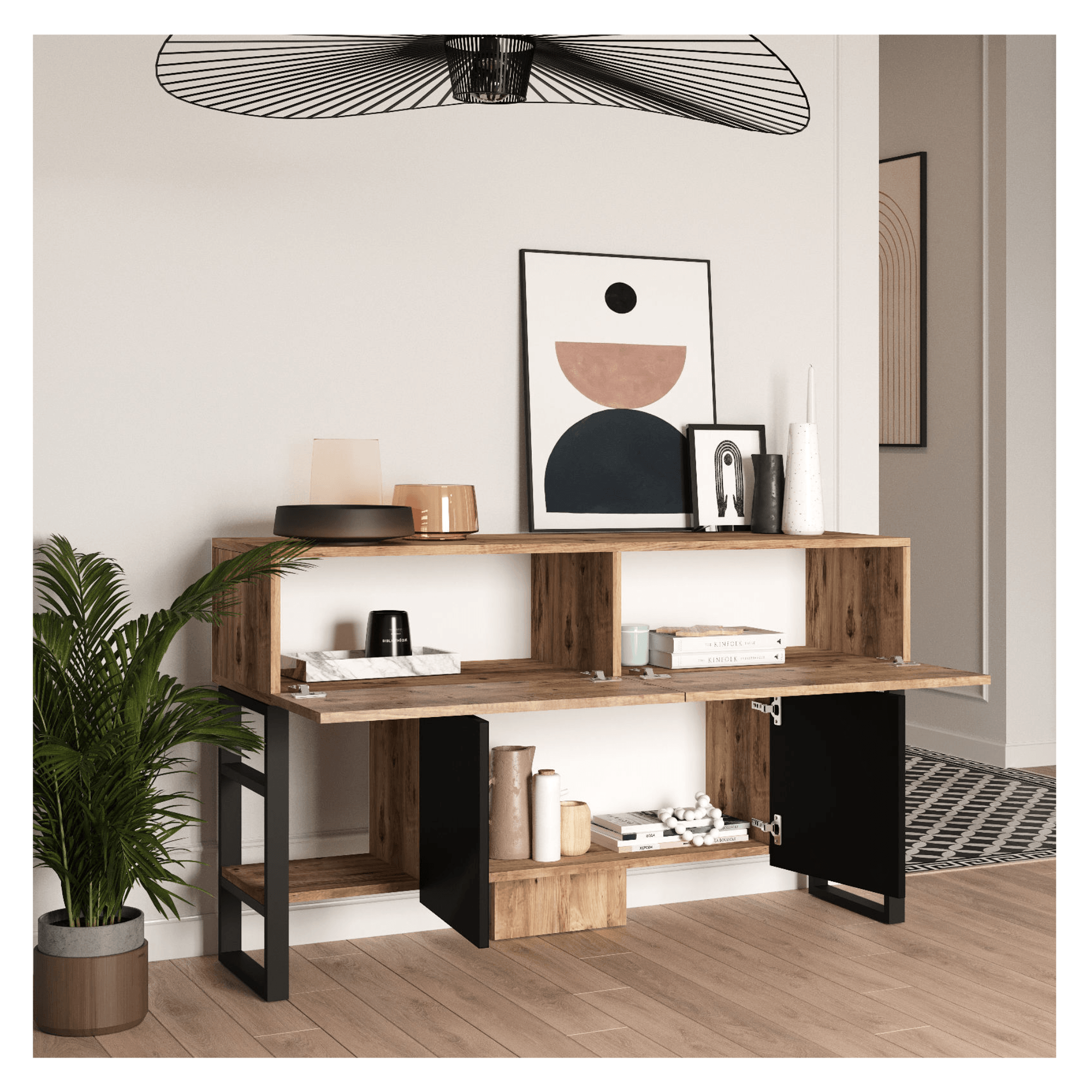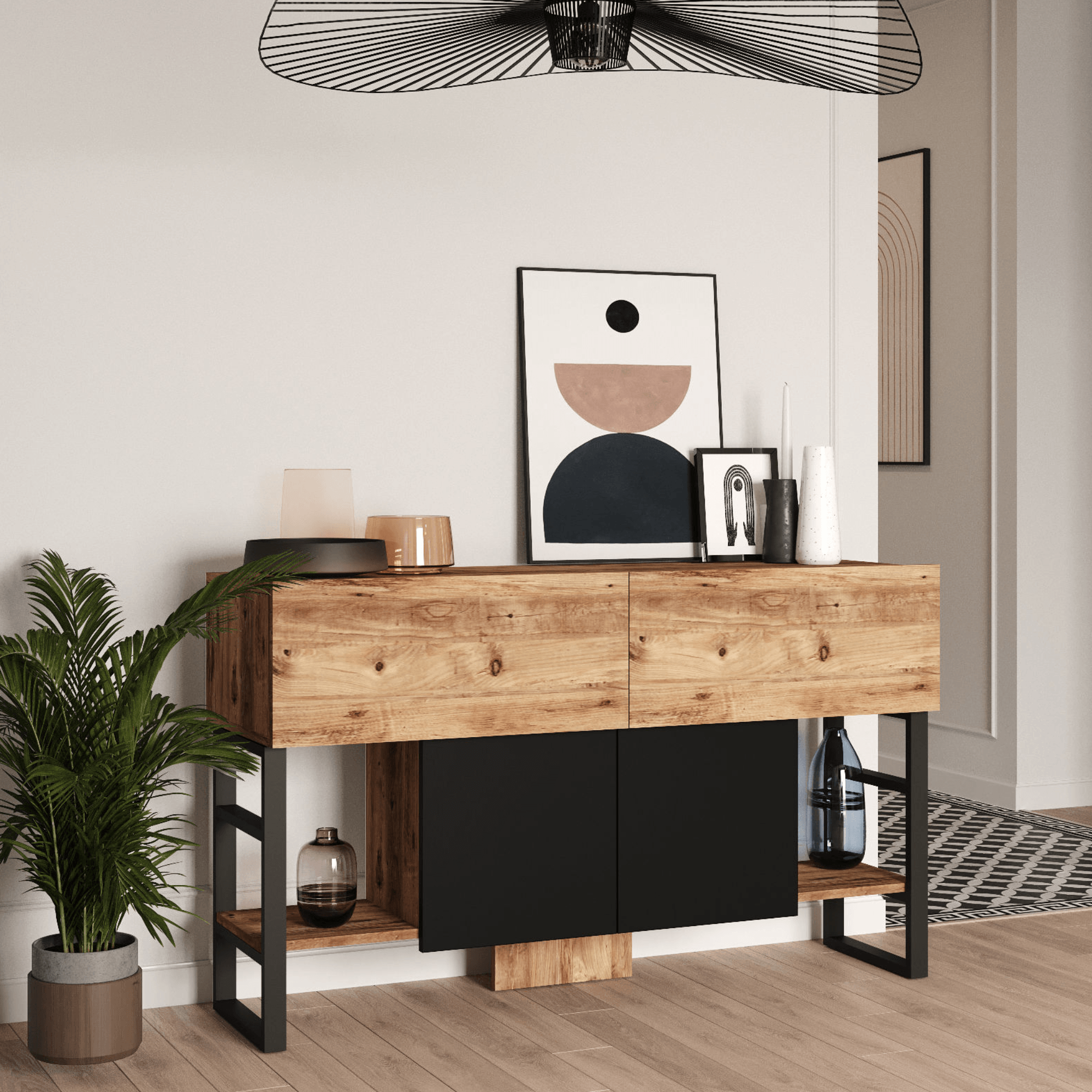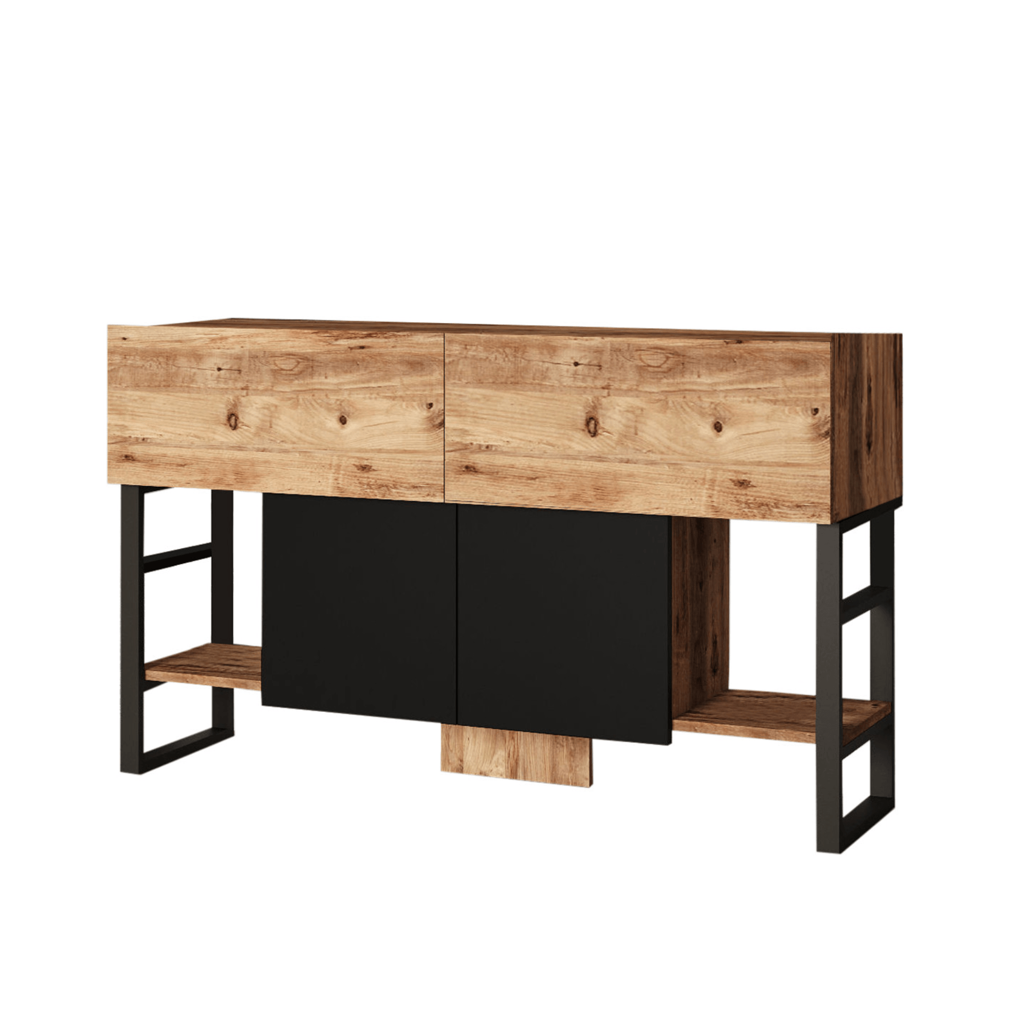 Vyrobený je z laminovaného dřevěného materiálu, který se vyznačuje snadnou udržovatelností i dlouhou životností. Maximální stabilitu má na starost boční kovová podnož. Stolek je laděný do kontrastní souhry dekoru borovice atlantic a černé, což industriální dojem jen podtrhuje. Bohatý úložný prostor pak zajišťuje dvojice horních skříněk s výklopnými dvířky, spodní centrální skříňka s otočnými dvířky a spodní postranní police na knihy a dekorace.
