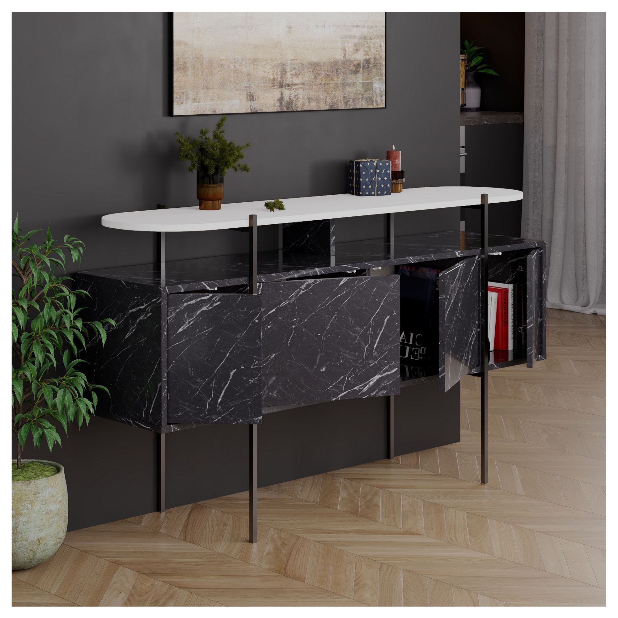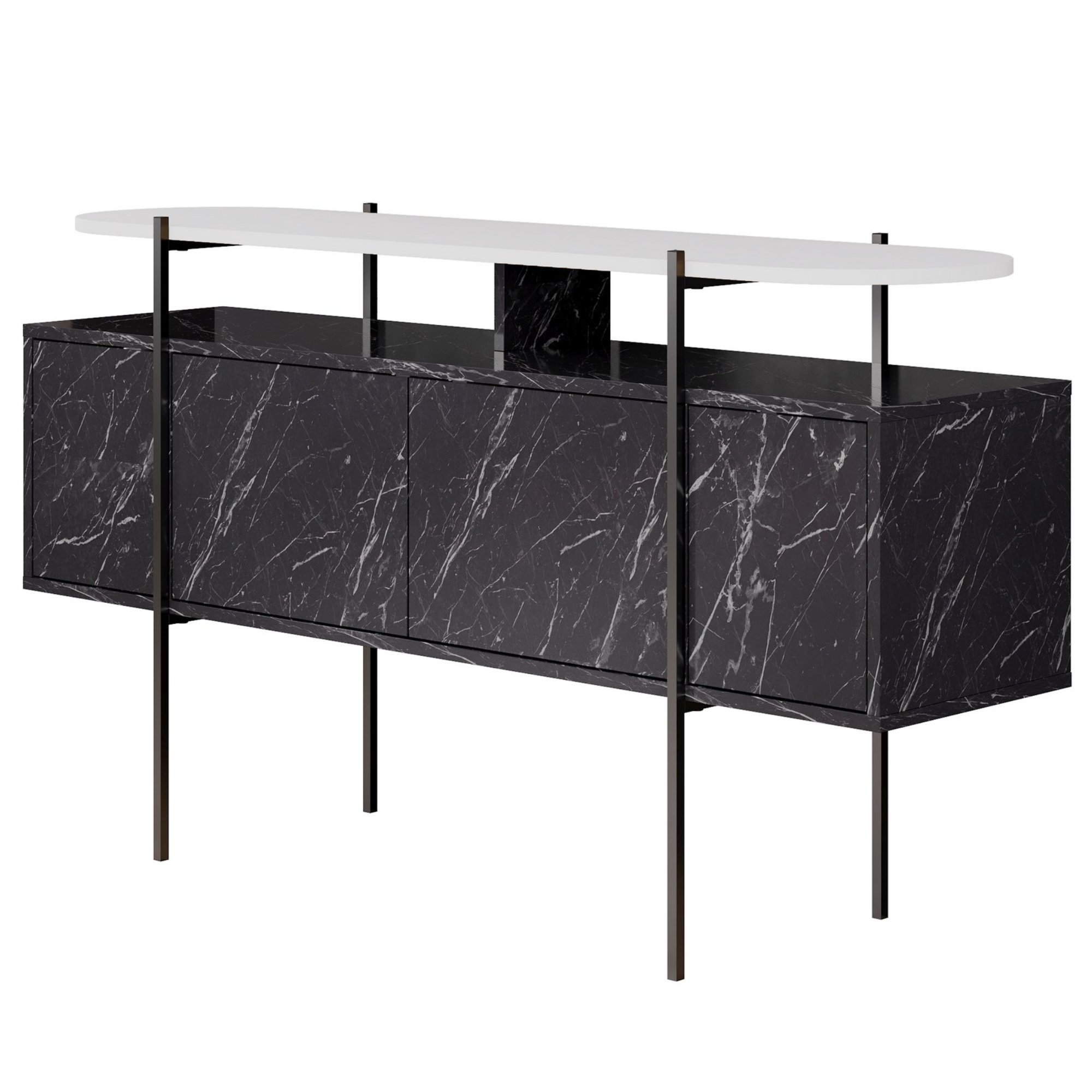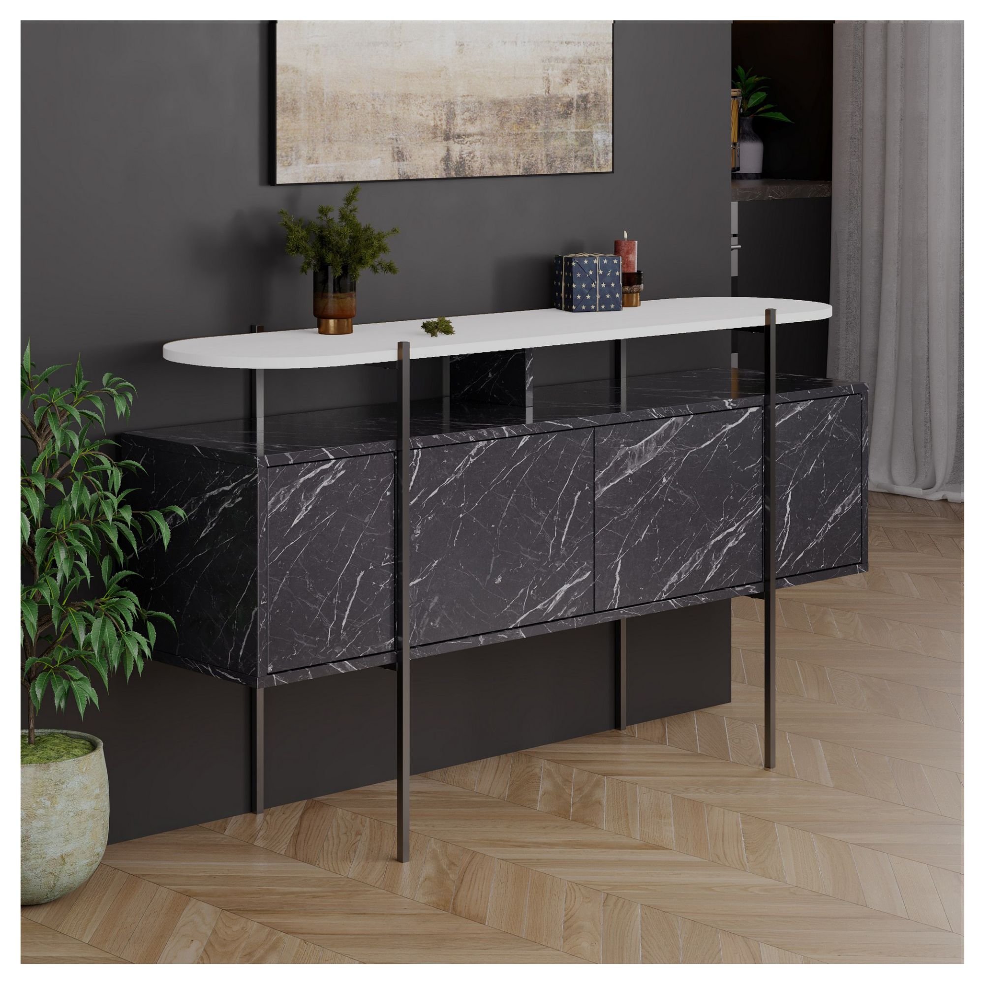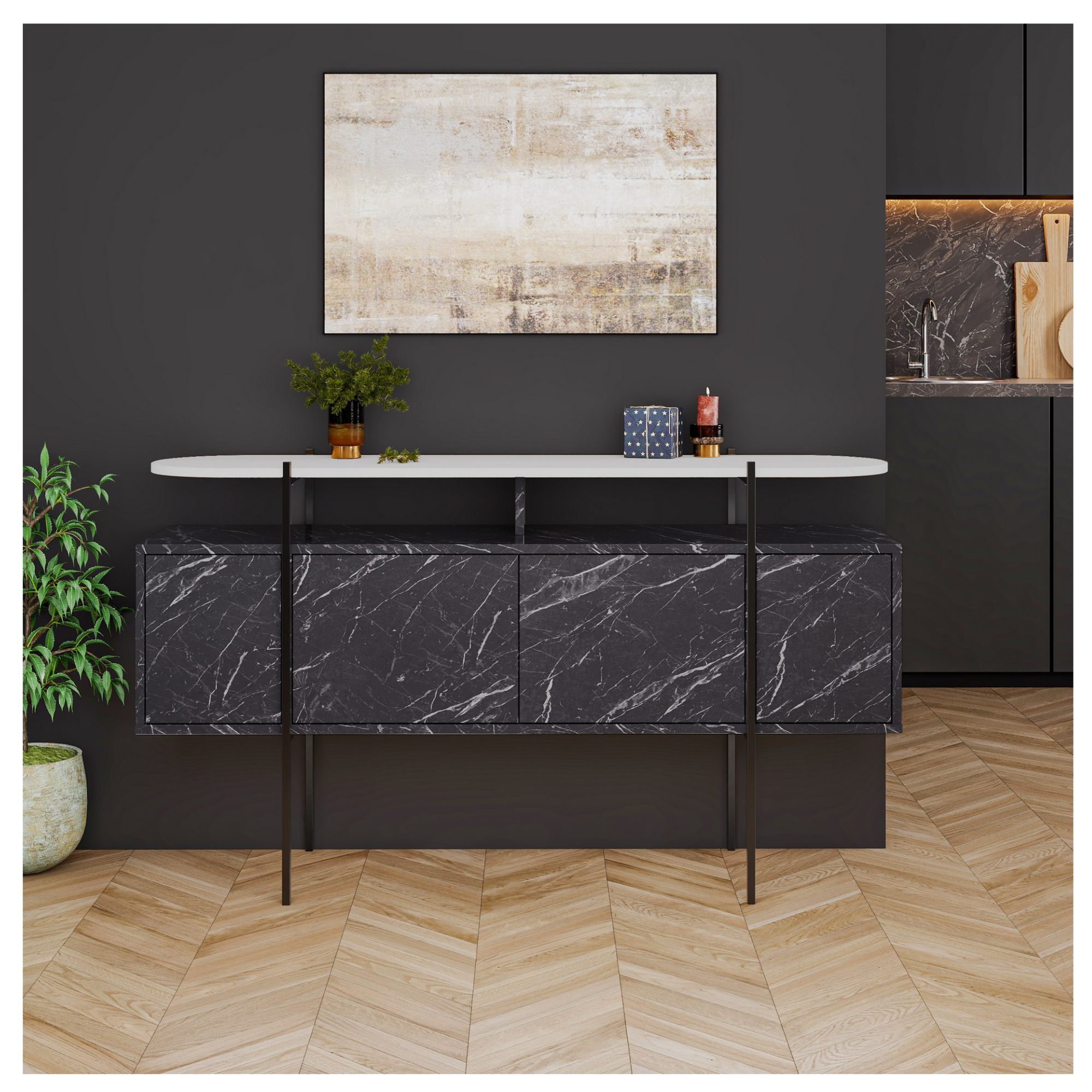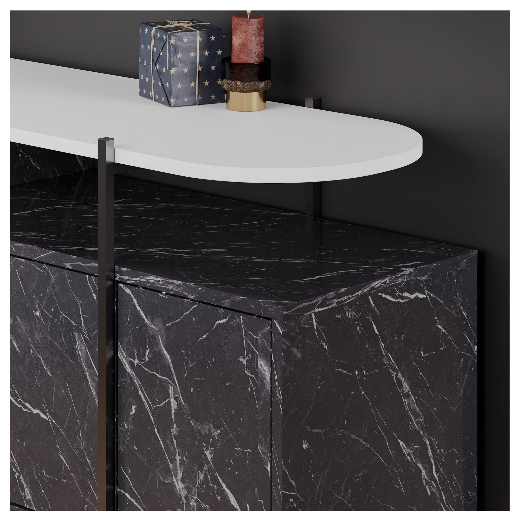 Stolek je vyroben z dřevotřískové desky, která věrně imituje mramor s jemným bílým žilkováním. Stabilitu a pevnost mu dodává odolný kovový rám, jenž podtrhuje jeho moderní vzhled.