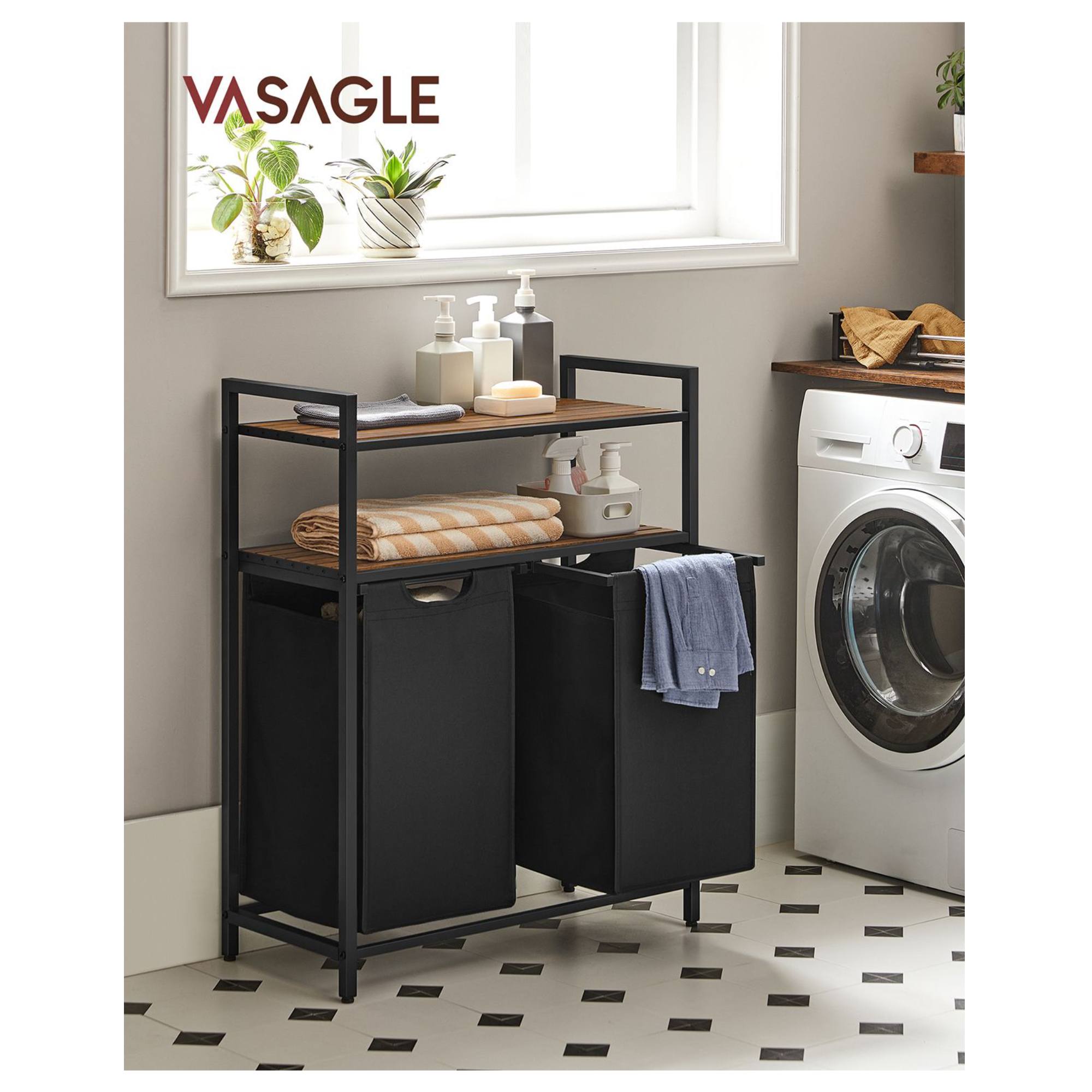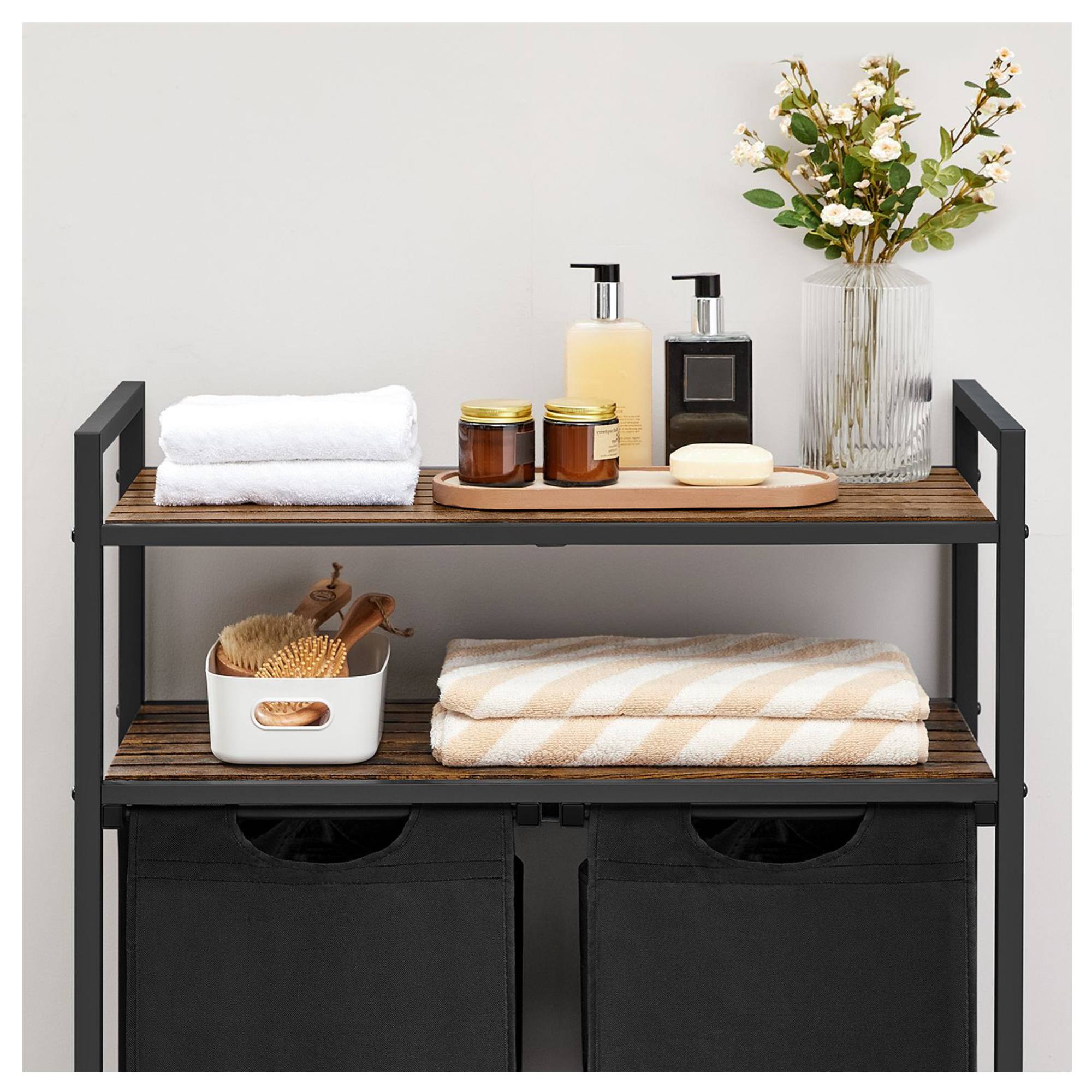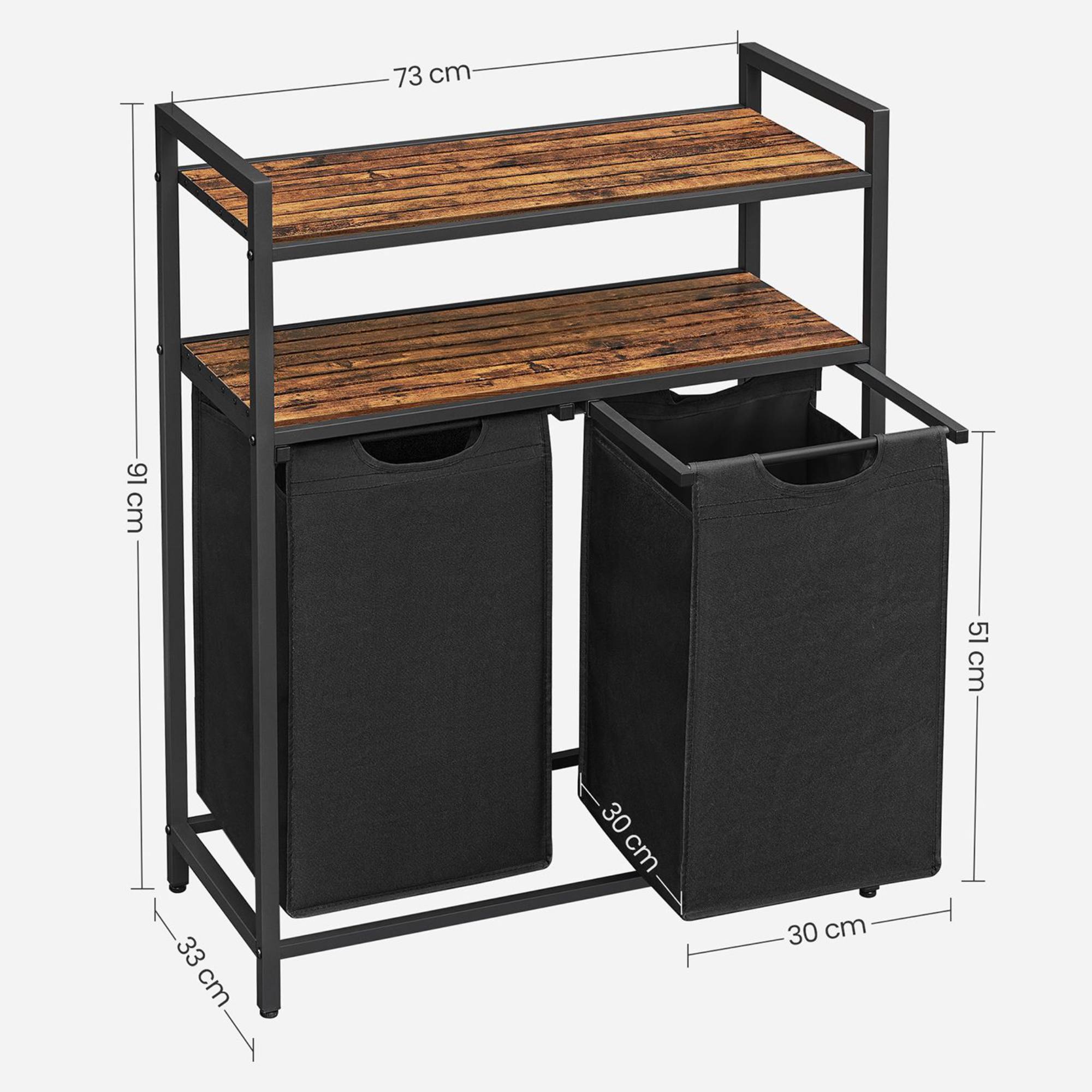 Má kovovou konstrukci v černé barvě, doplněnou o 2 police z dřevovláknité MDF desky s dekorem dřeva. Police poskytují perfektní místo pro uložení pracích prostředků, ručníků a dalších doplňků, které potřebujete mít po ruce. Disponuje 2 látkovými koši, z nichž má každý nosnost 5 kg. Díky praktickému rozdělení si snadno roztřídíte prádlo už před praním. Koše jsou vybaveny úchyty, které usnadní odnesení prádla přímo k pračce.