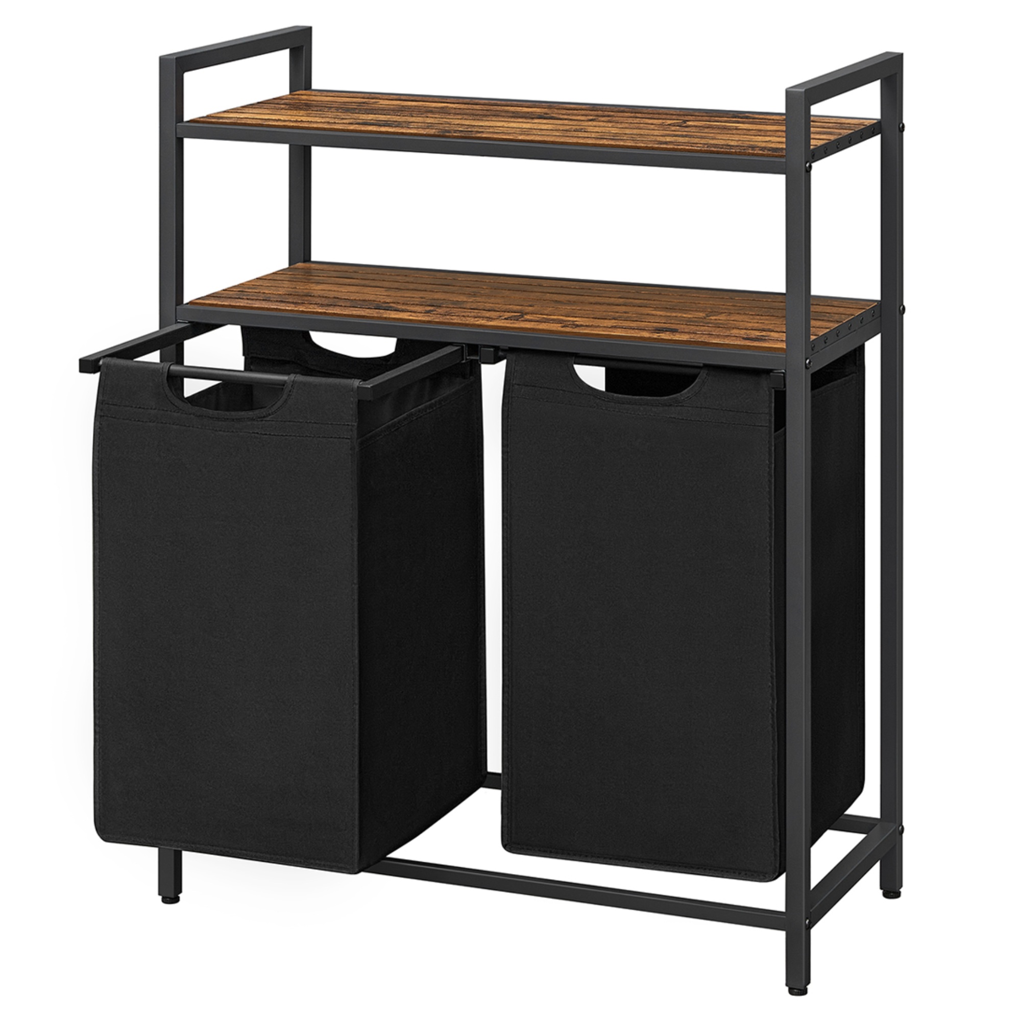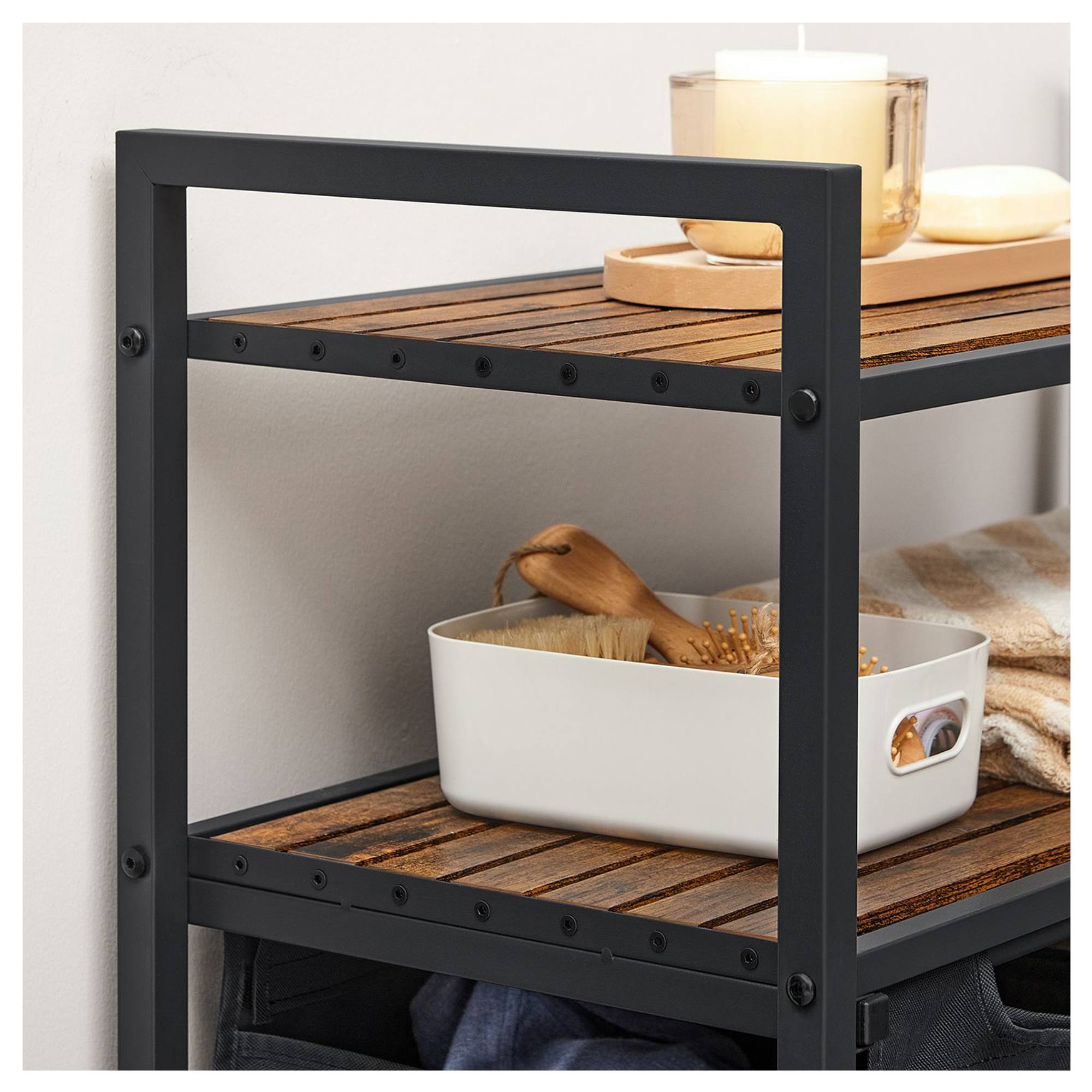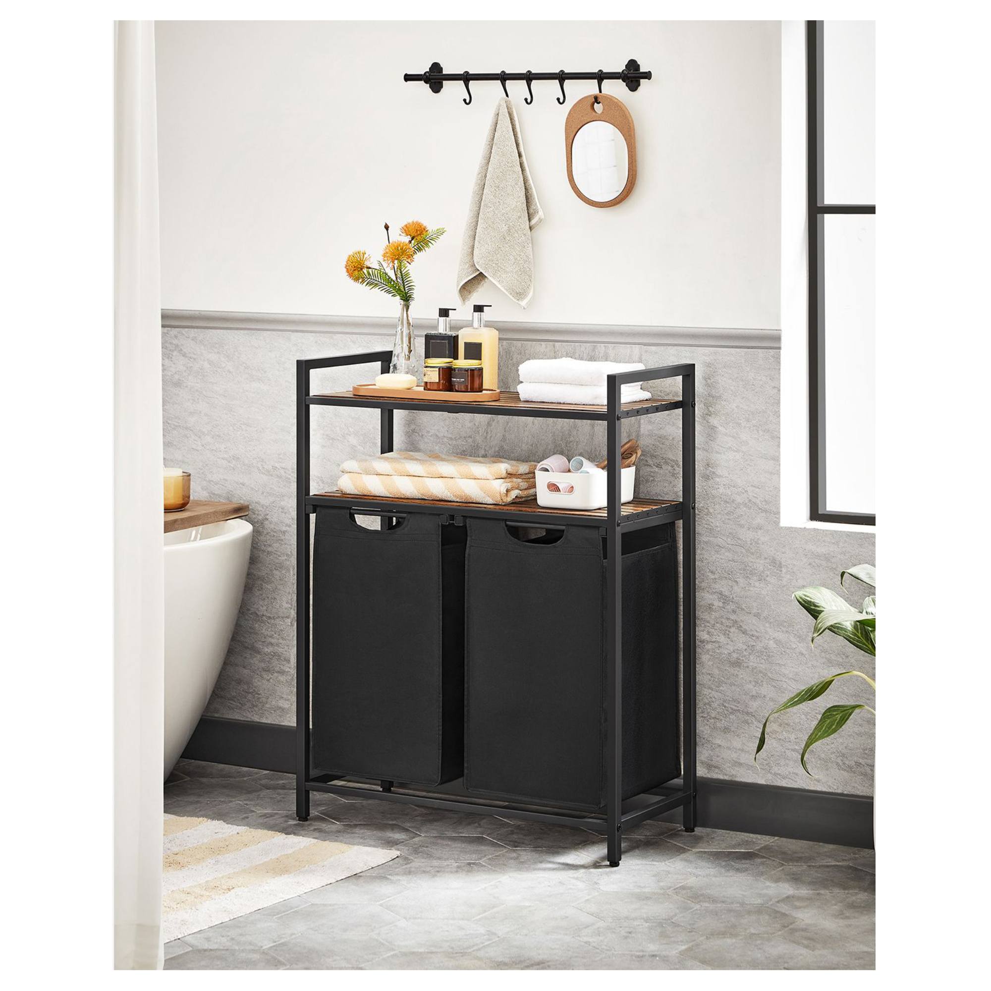 Má kovovou konstrukci v černé barvě, doplněnou o 2 police z dřevovláknité MDF desky s dekorem dřeva. Police poskytují perfektní místo pro uložení pracích prostředků, ručníků a dalších doplňků, které potřebujete mít po ruce. Disponuje 2 látkovými koši, z nichž má každý nosnost 5 kg. Díky praktickému rozdělení si snadno roztřídíte prádlo už před praním. Koše jsou vybaveny úchyty, které usnadní odnesení prádla přímo k pračce.
