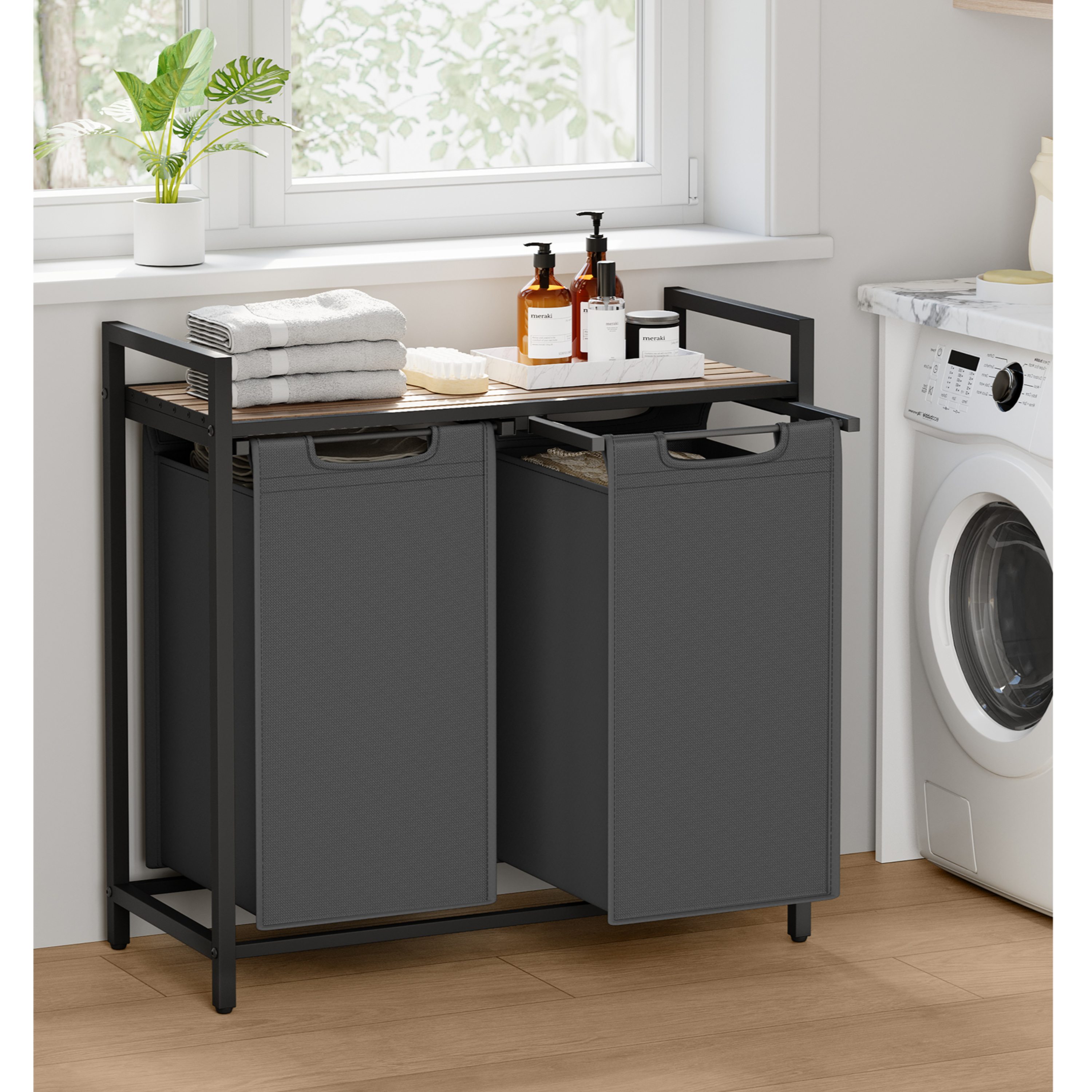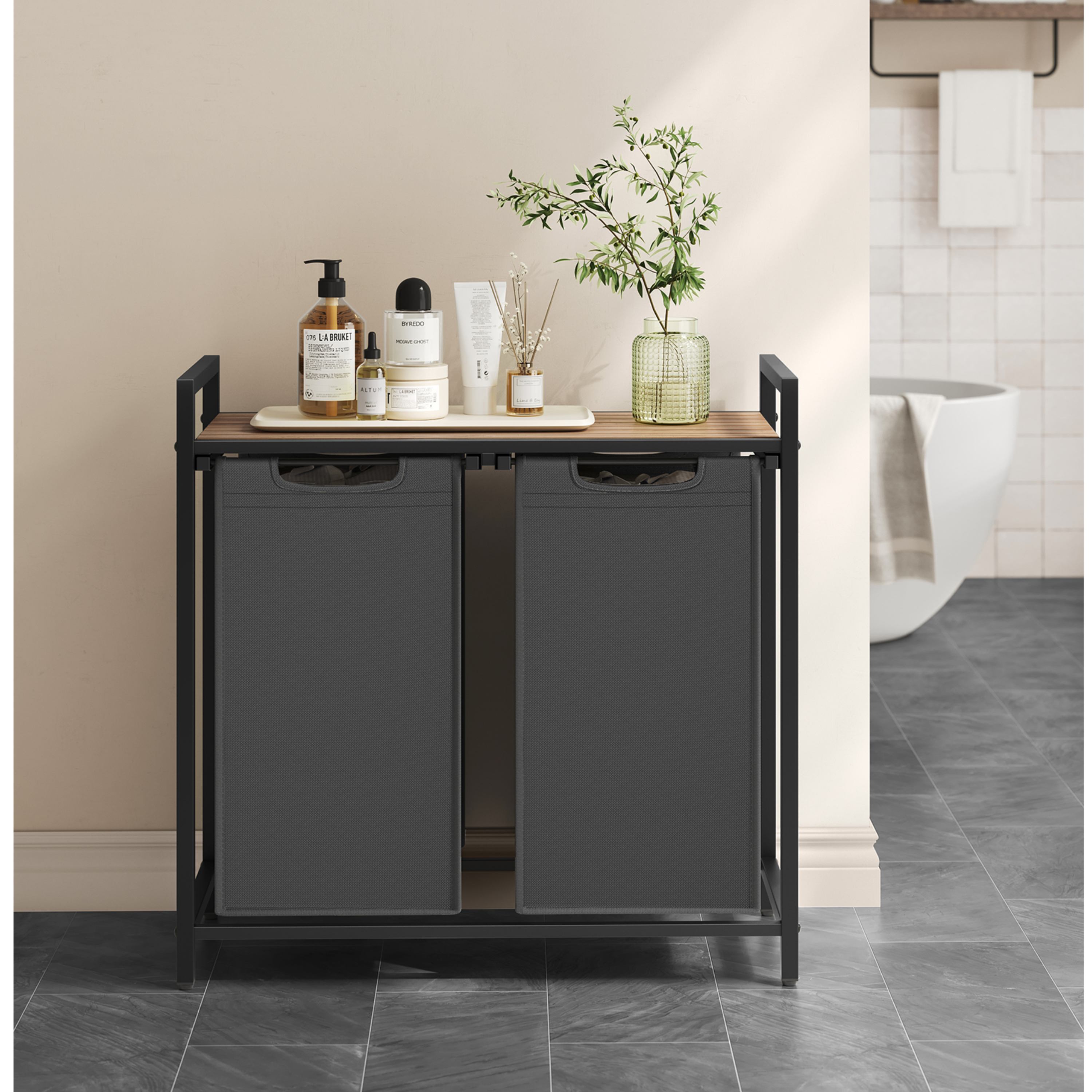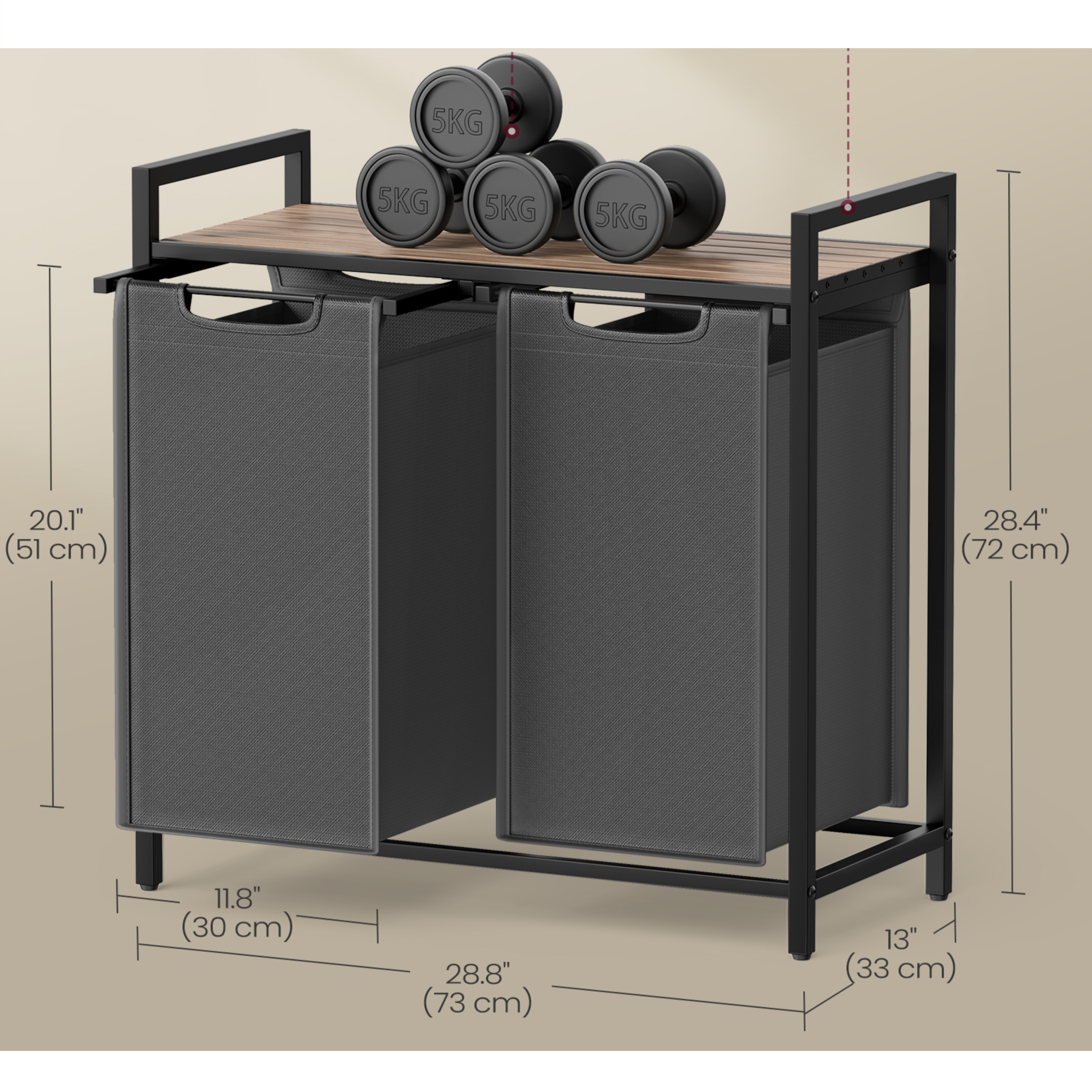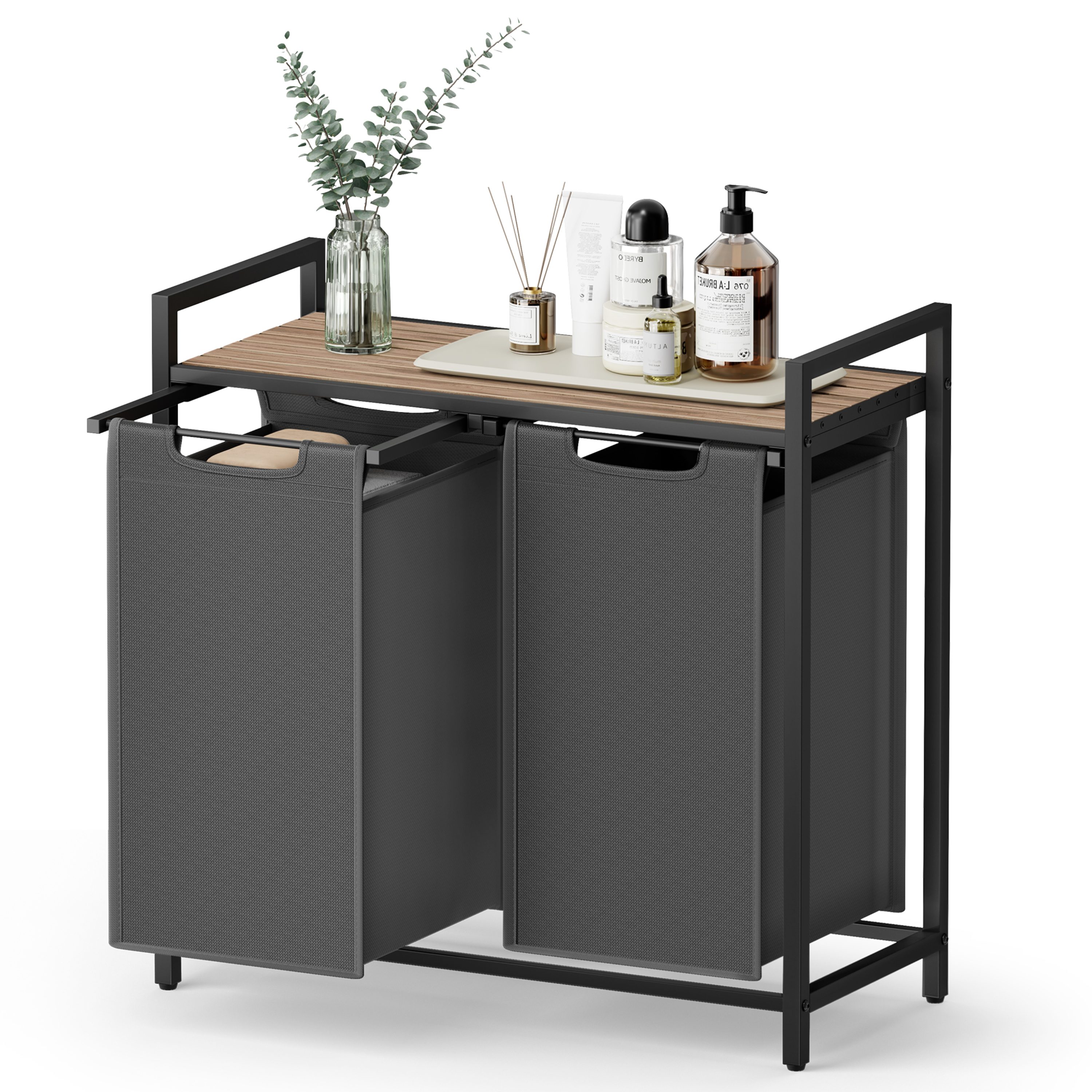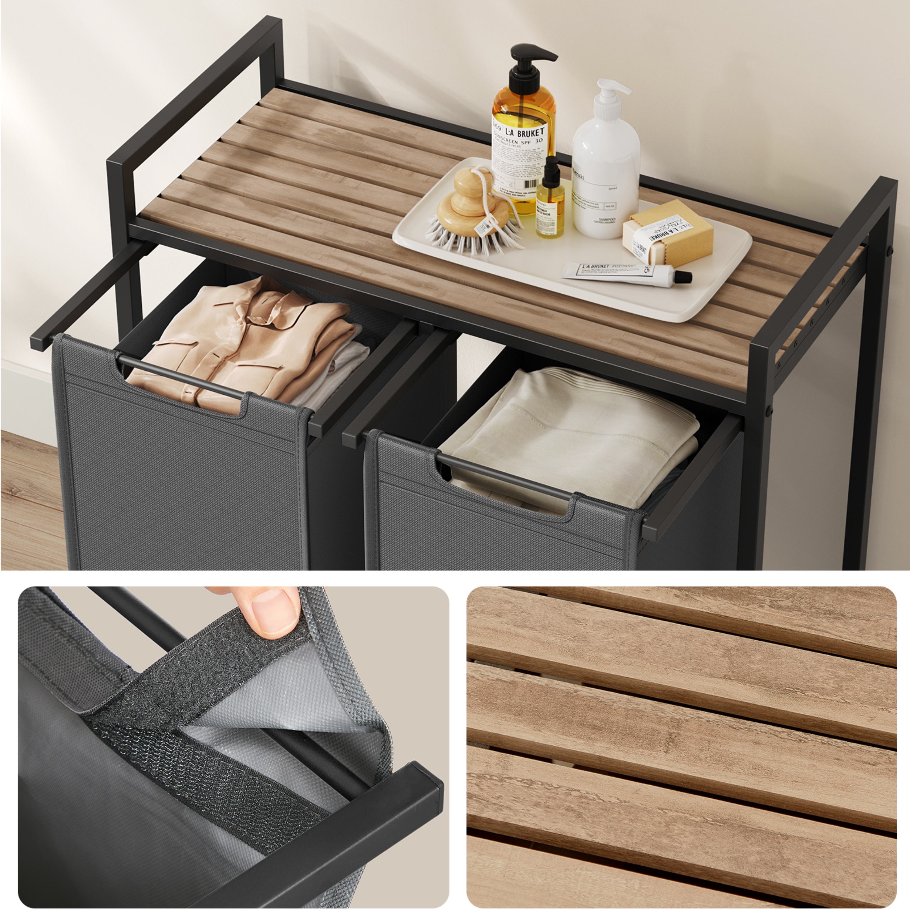 Horní deska je vyrobena z dřevovláknitého materiálu MDF, který je nenáročný na údržbu. Maximální stabilitu pak zajišťuje ocelová konstrukce. Pod odkládací deskou jsou vloženy dva látkové koše na prádlo, kdy nosnost každého z nich je dostatečných 5 kg. Nosnost horní plochy činí až 20 kg. Koše může díky praktickým úchytům jednoduše vyjmout a odnést k pračce.