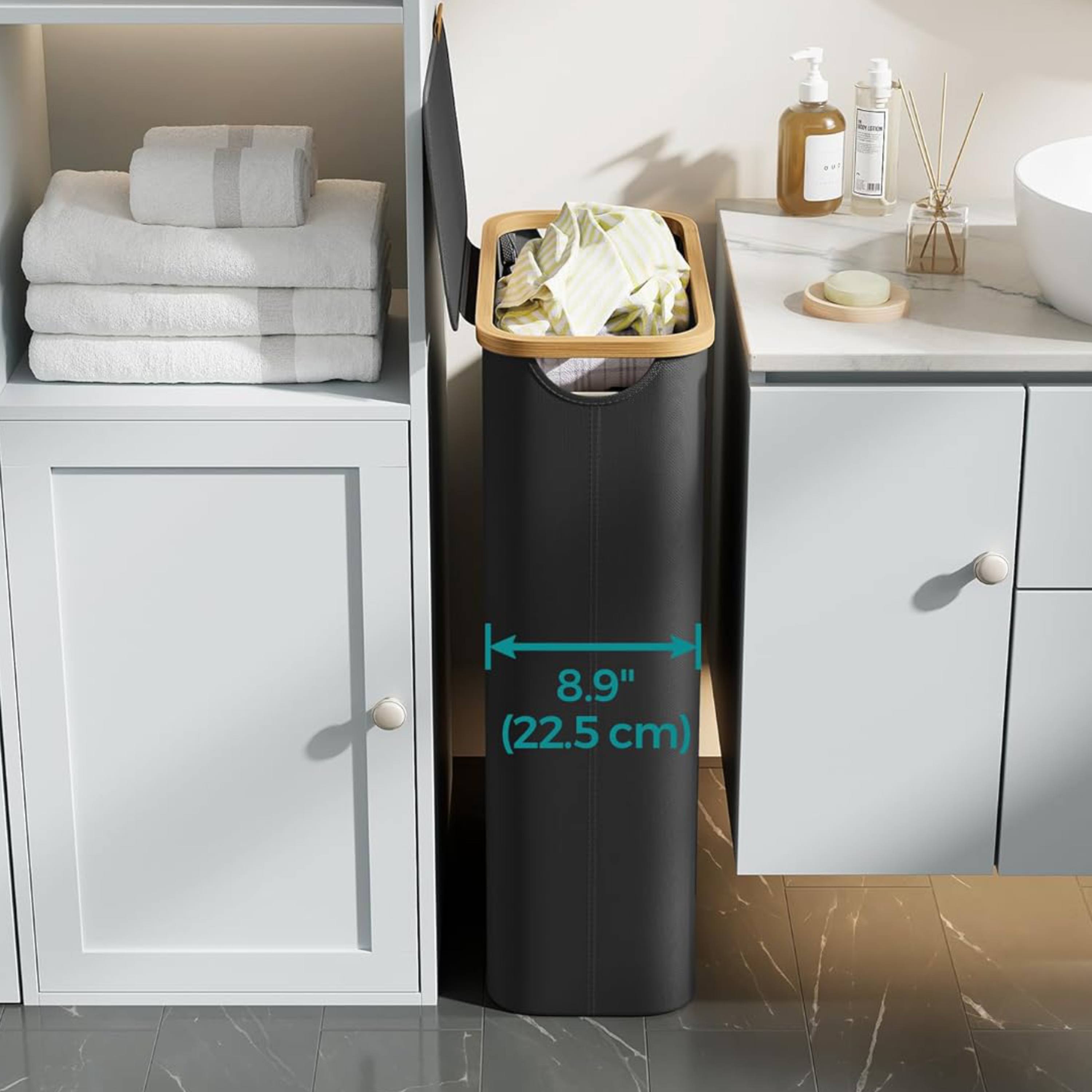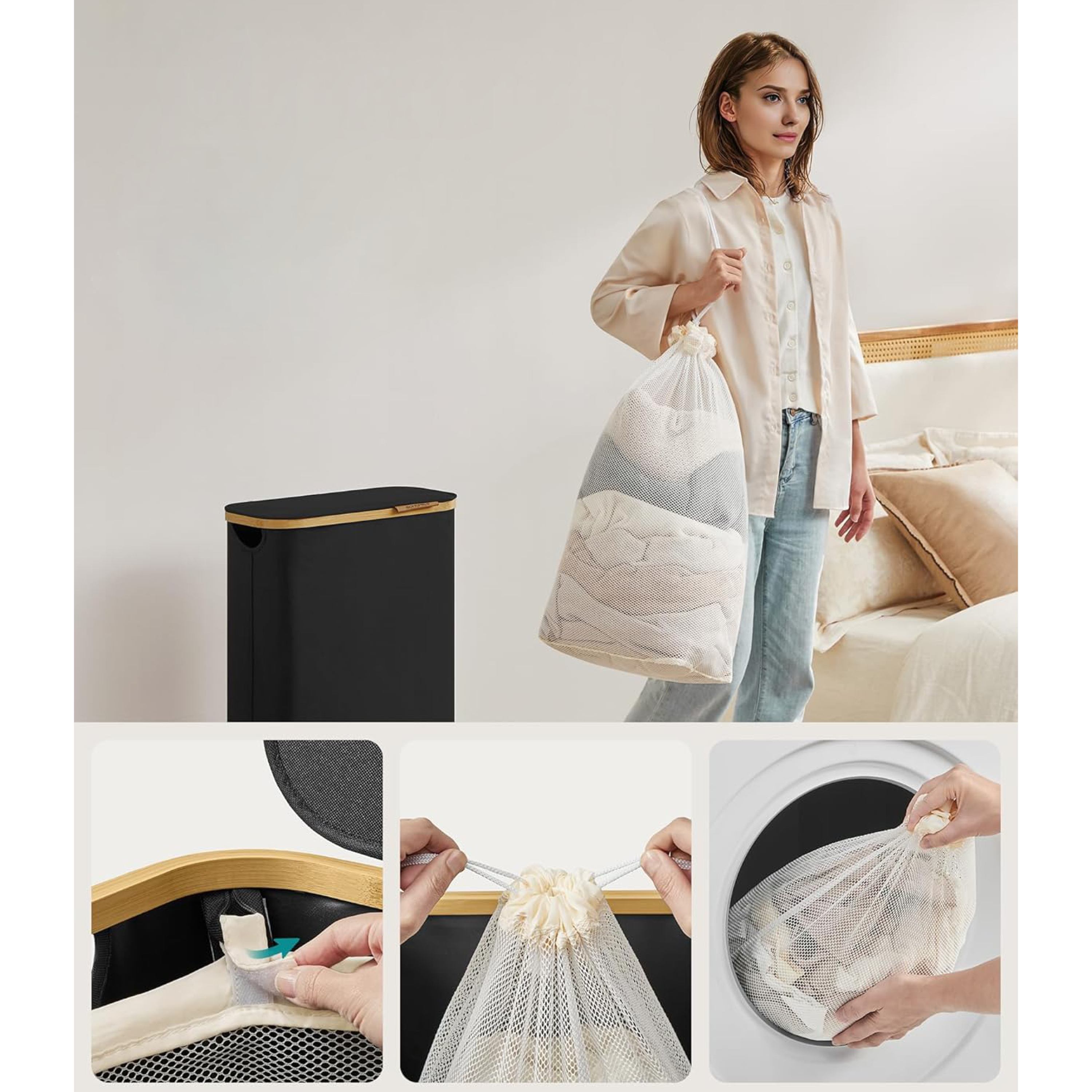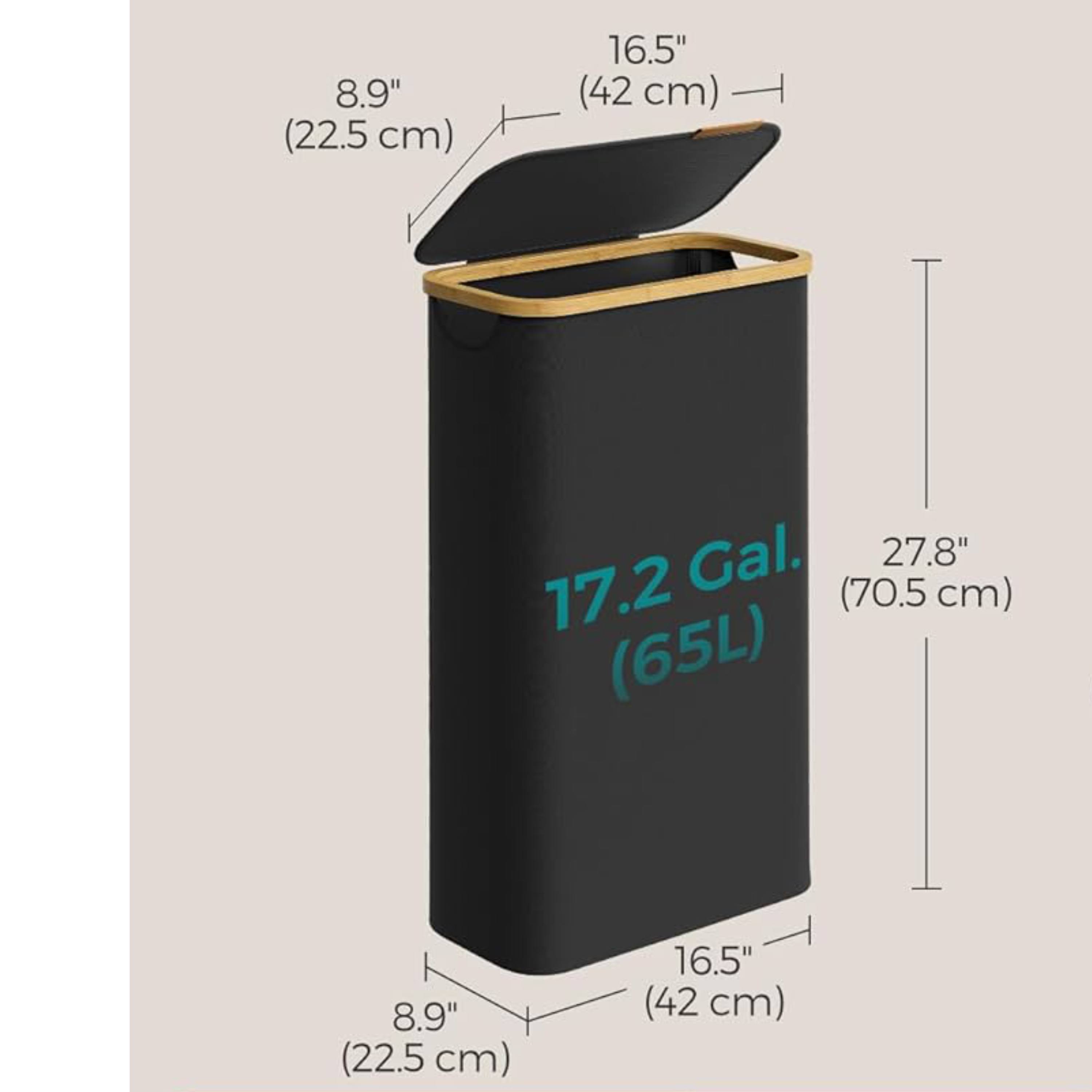 Celkový objem koše činí 65 L a pytel unese celkem 5 kg prádla. Pytel je upevněn suchým zipem a je vyjímatelný. Díky jeho utahovací šňůrce jej pohodlně odnesete až k pračce. Koš je vyroben z látky Oxford, která se vyznačuje svou pevností, voděodolností a snadnou údržbou. Látka je napnutá pomocí podpěrných tyčí a v kombinaci s bambusovým rámem udržují jeho tvar. Součástí koše je víko, které udržuje uvnitř nežádoucí pachy a zároveň chrání prádlo před prachem. Nechybí také praktické úchytky pro pohodlnou manipulaci. Díky své kompaktní velikosti je ideální do koupelen s nedostatkem místa.