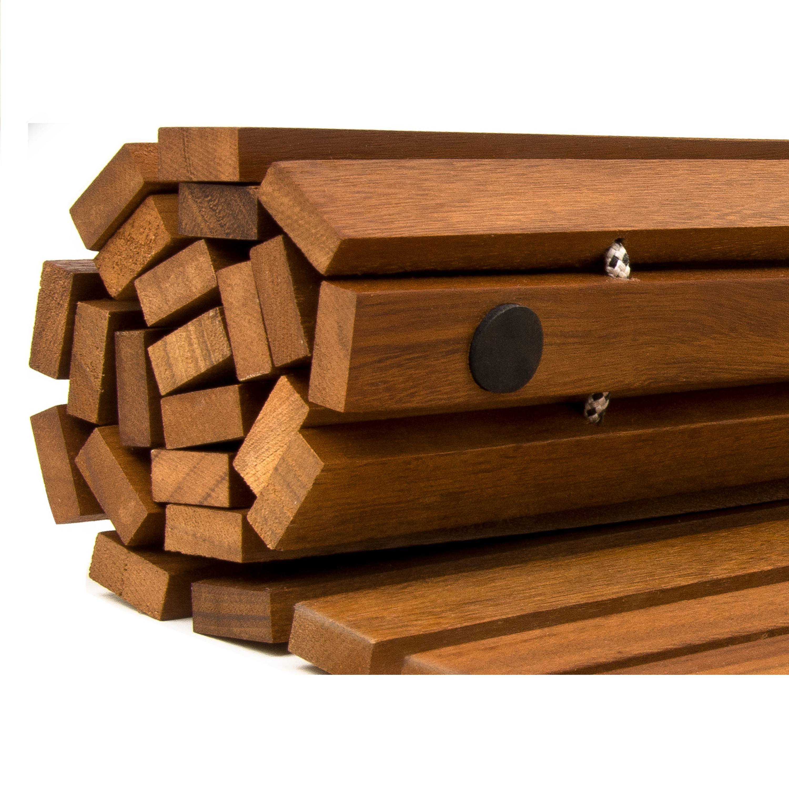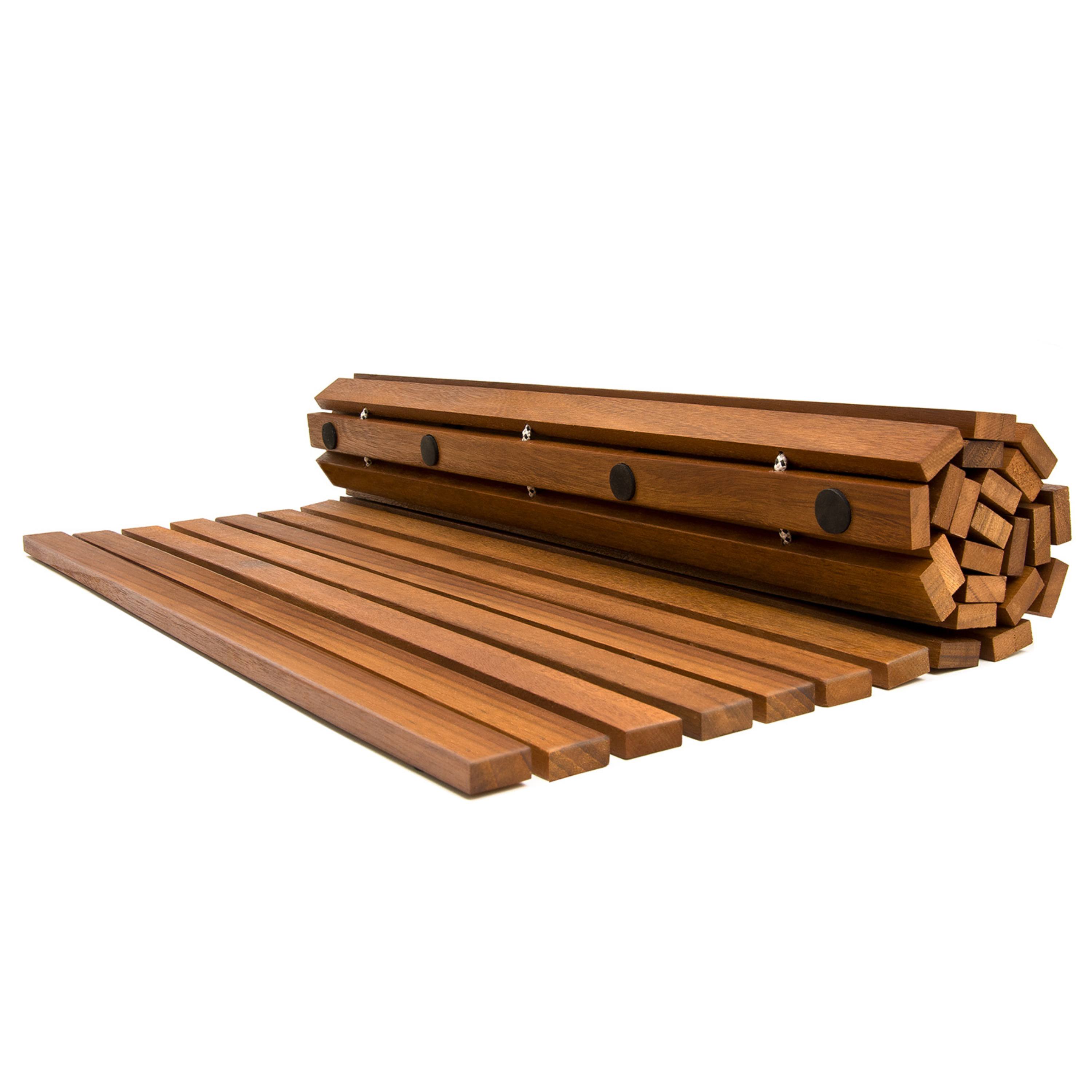 Vyrobena je z akáciového dřeva a její povrch je dodatečně olejovaný, což zvyšuje odolnost vůči vlhkosti a povětrnostním vlivům. Konstrukce zajišťuje dobrou cirkulaci vzduchu a rychlejší schnutí, což přispívá k hygienickému používání. Na spodní straně jsou umístěny protiskluzové gumové chrániče podlahy, které zároveň drží předložku na místě.