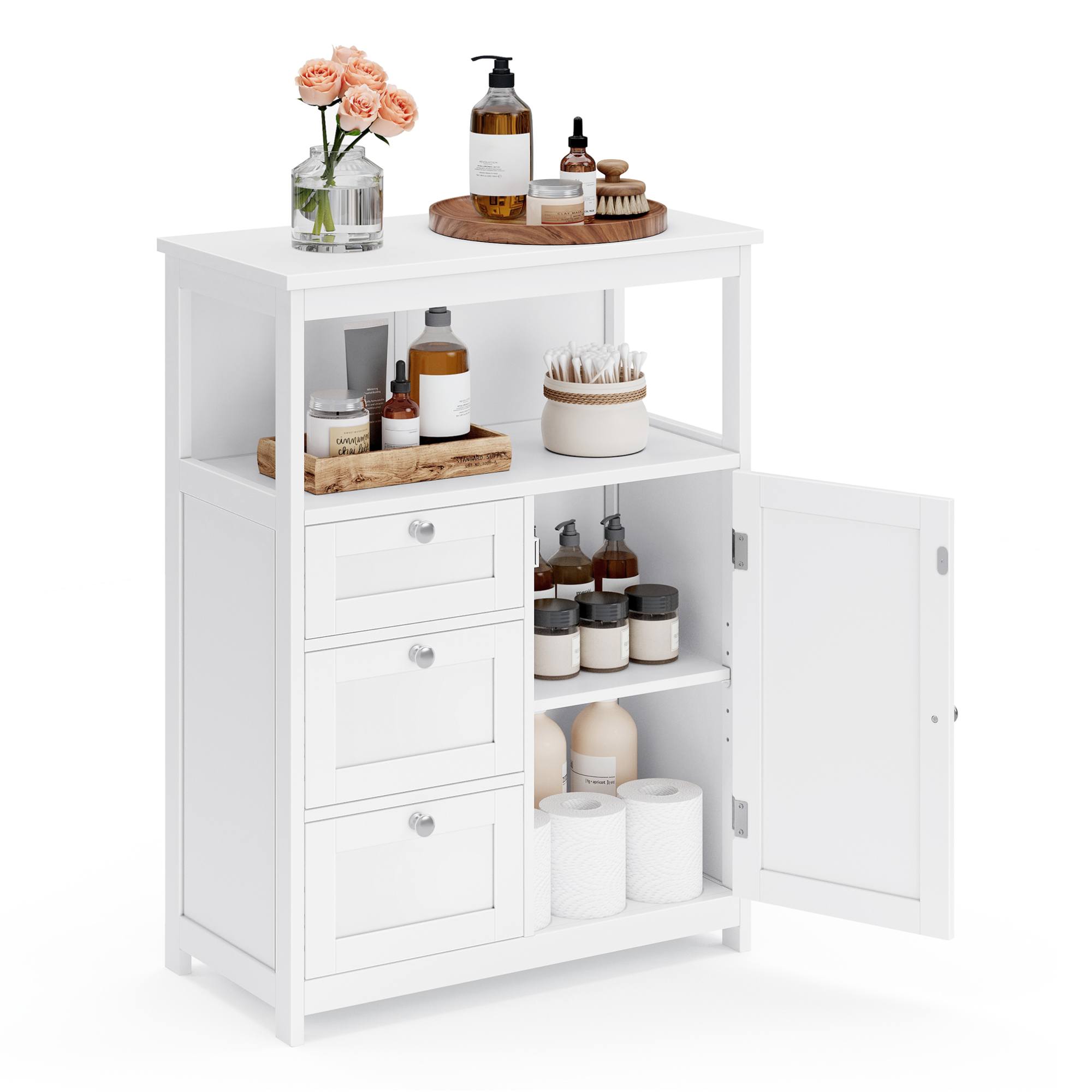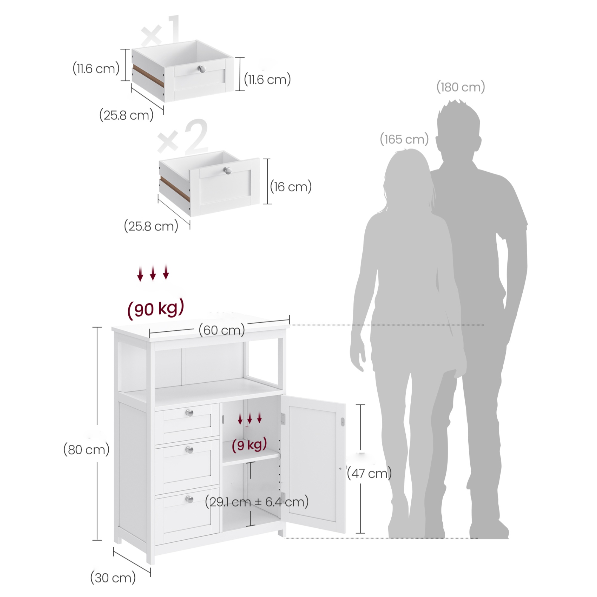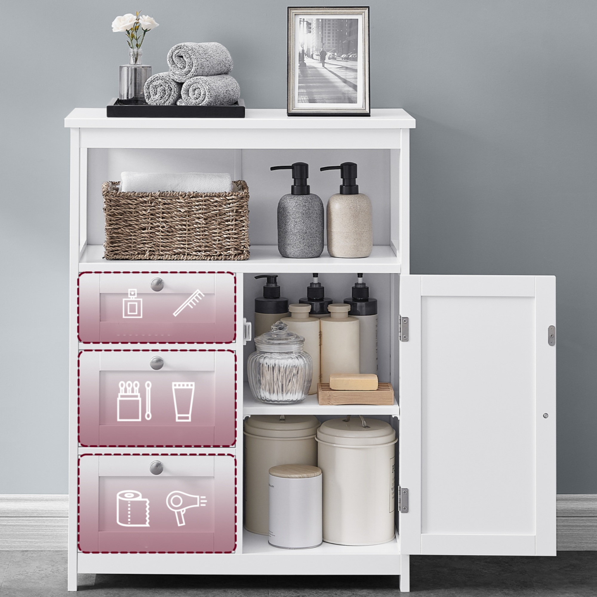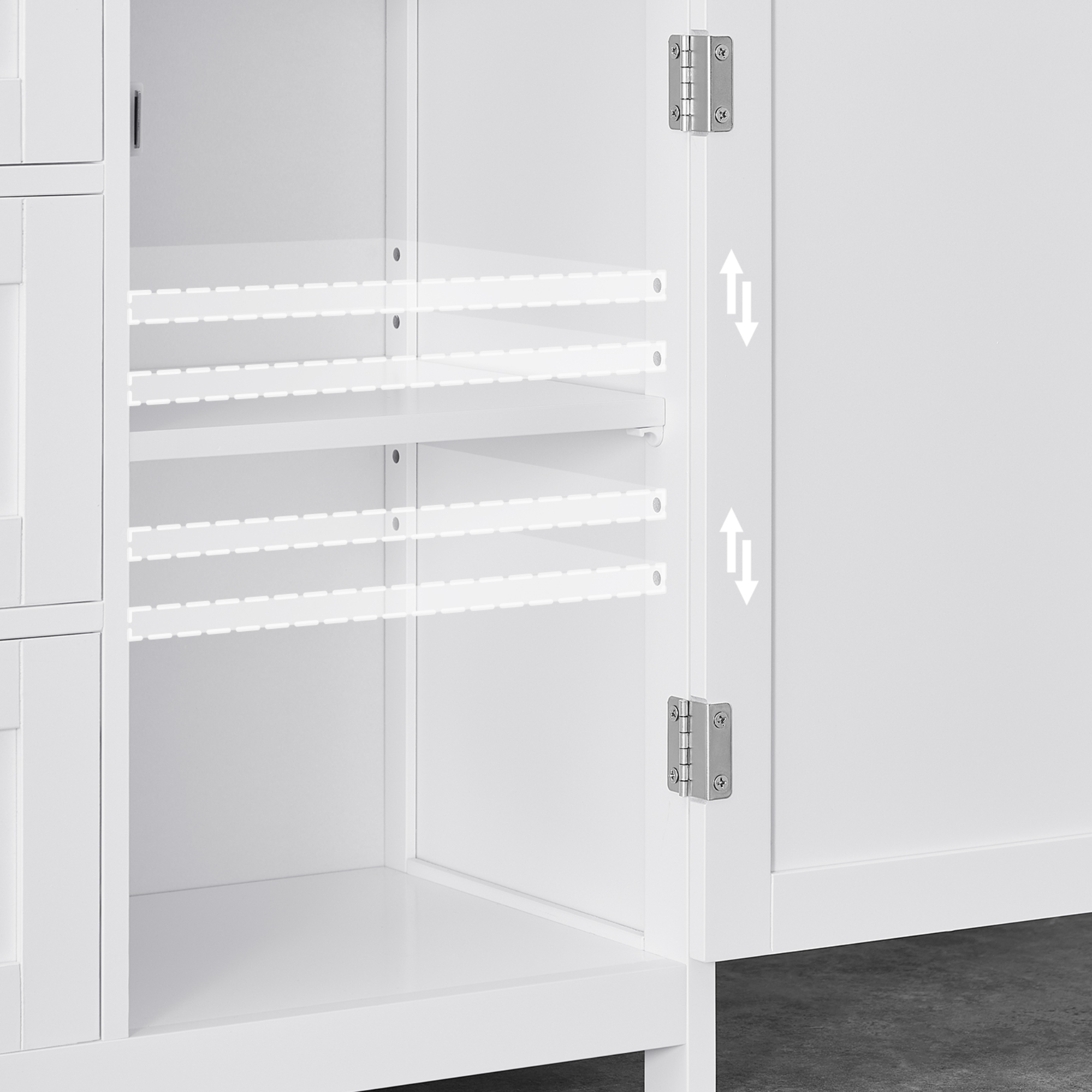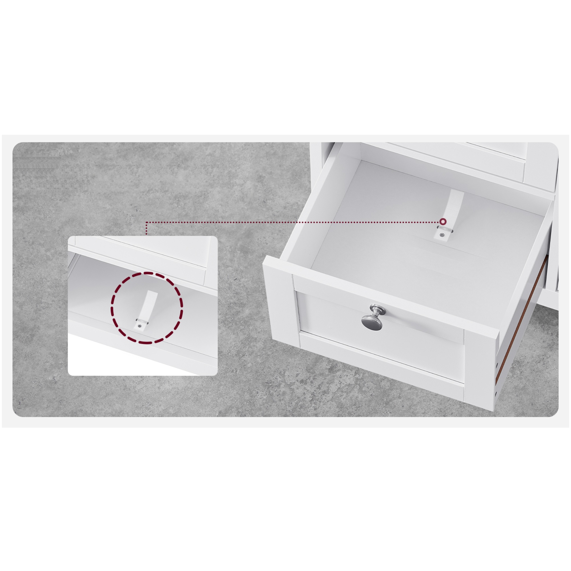 Její součástí jsou nejen 3 zásuvky, ale i 1 nastavitelná vložená police, kterou lze umístit do 5 různých výšek. Zásuvky jsou vybaveny plastovými záchytkami, které zabraňují jejich vypadnutí ze skříňky během manipulace. Na zásuvkách a dvířkách se nacházejí praktické úchyty.