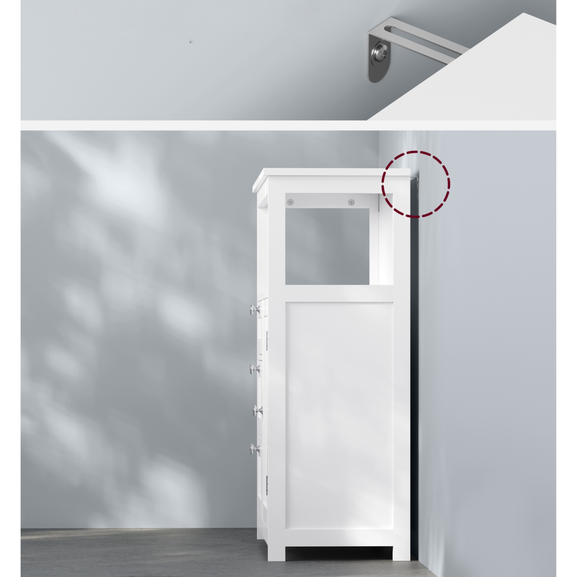 Z bezpečnostních důvodů připevněte volně stojící koupelnovou skříňku ke zdi pomocí dodané sady proti převrácení. Zabraňte vystavení skříňky vodě, abyste zamezili jejímu popraskání a deformaci.