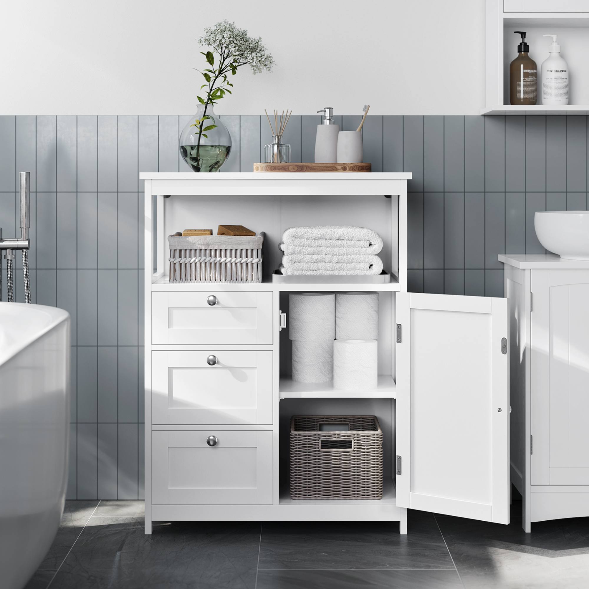 Koupelnová skříňka CLOUDE 1 nabízí dostatek otevřeného i uzavíratelného úložného prostoru, díky čemuž najde využití v každé koupelně.