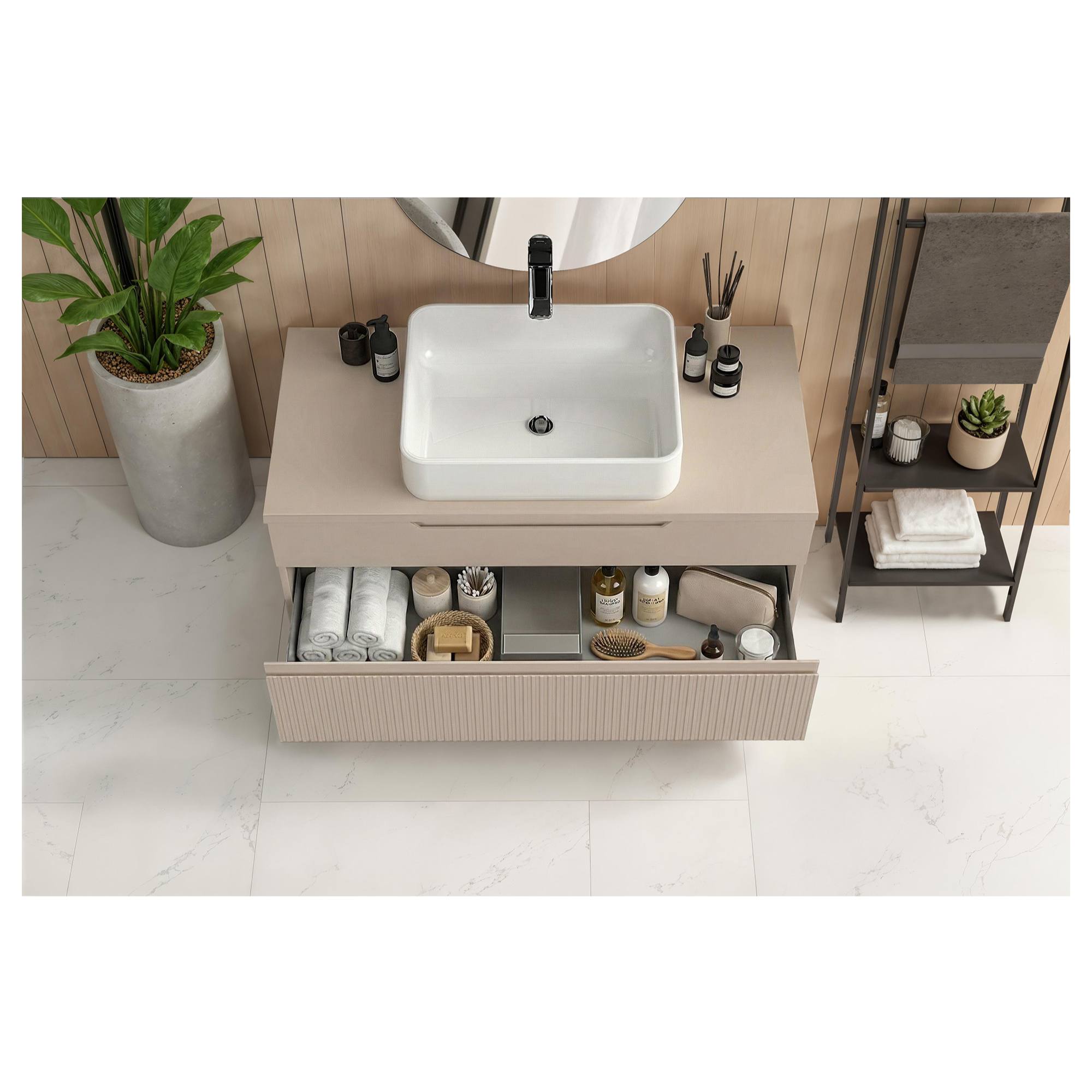 Skříňka kromě umyvadla nabízí i dostatek úložného prostoru. Její součástí jsou 2 zásuvky bez úchytů s tichým dovíráním, do nichž si můžete přehledně uložit všechno, co v koupelně potřebujete mít po ruce.