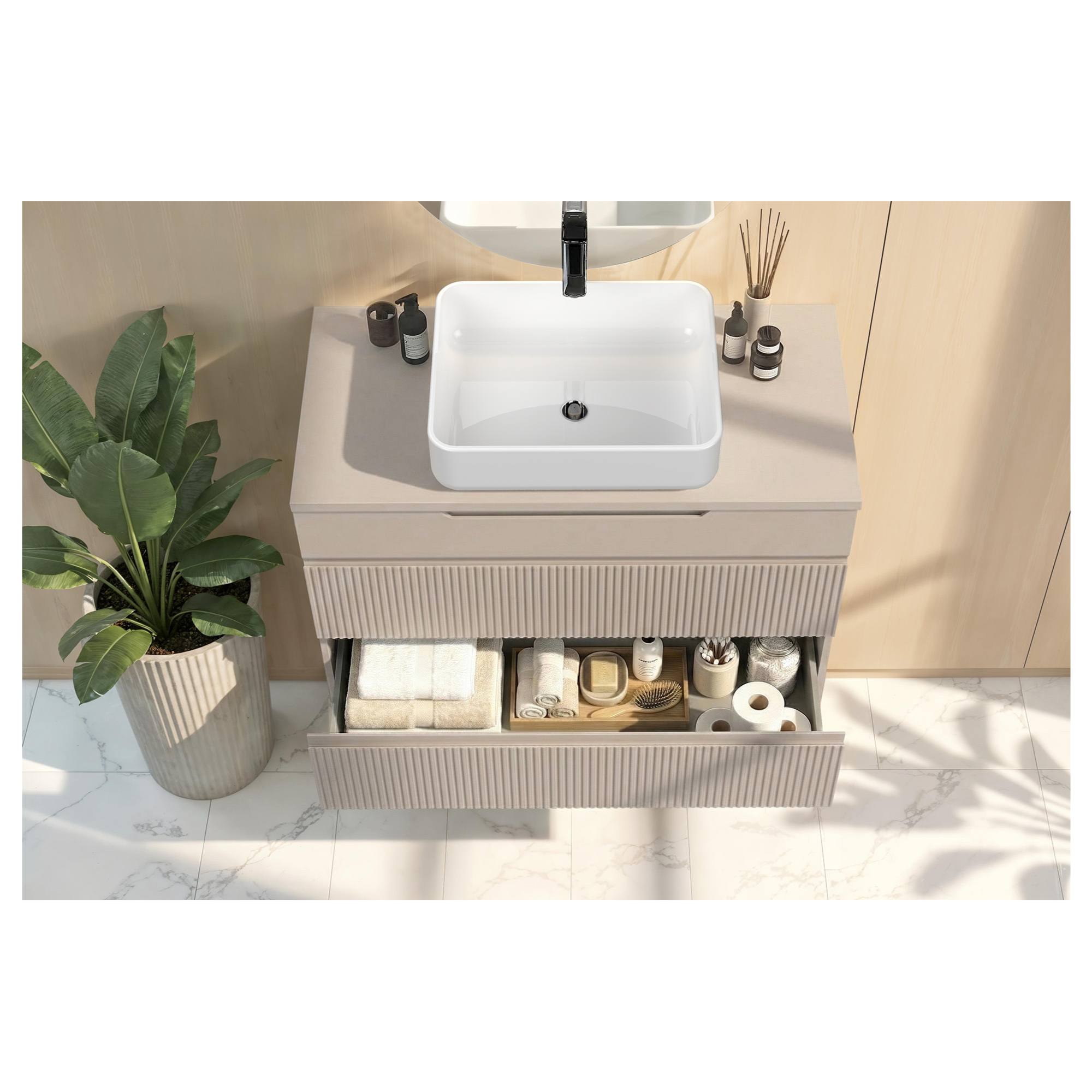 Skříňka kromě umyvadla nabízí i dostatek úložného prostoru. Její součástí jsou 3 zásuvky bez úchytů s tichým dovíráním, do nichž si můžete přehledně uložit všechno, co v koupelně potřebujete mít po ruce.