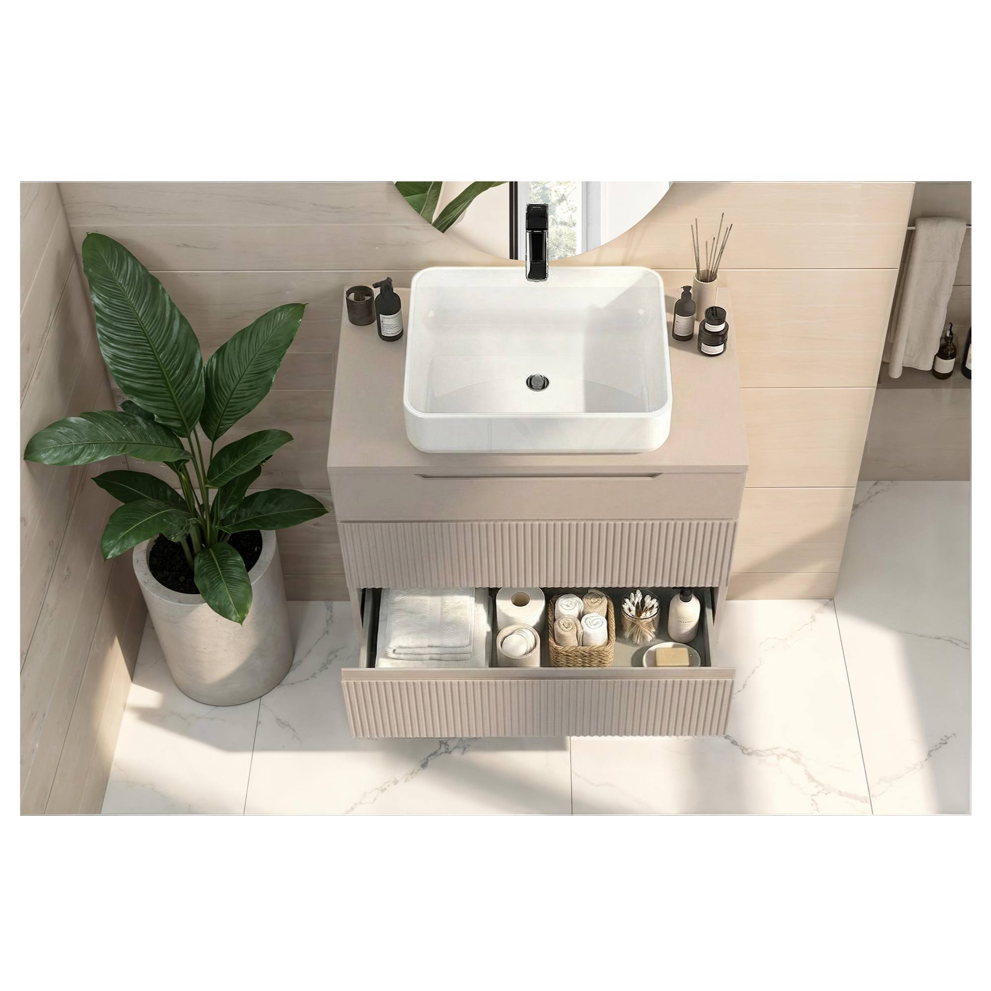 Skříňka kromě umyvadla nabízí i dostatek úložného prostoru. Její součástí jsou 3 zásuvky bez úchytů s tichým dovíráním, do nichž si můžete přehledně uložit všechno, co v koupelně potřebujete mít po ruce.