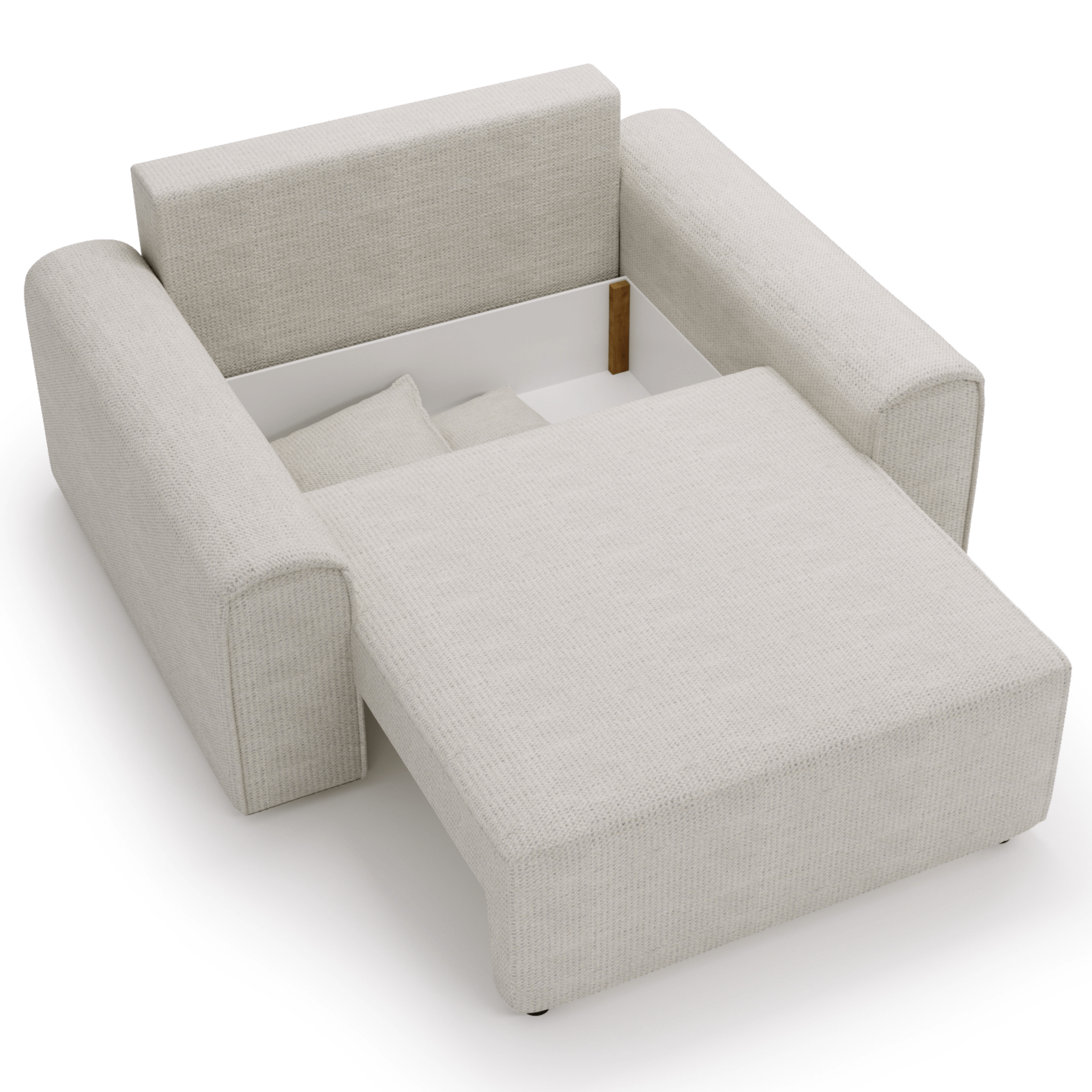 Praktický systém polohování umožňuje během několika sekund proměnit křeslo na lůžko o rozměrech 184 x 114 cm. Obsahuje také integrovaný úložný prostor, kam uložíte vše potřebné. Toto je perfektní řešení pro ty, kteří chtějí spojit funkčnost, pohodlí a prostorově úsporné prvky.