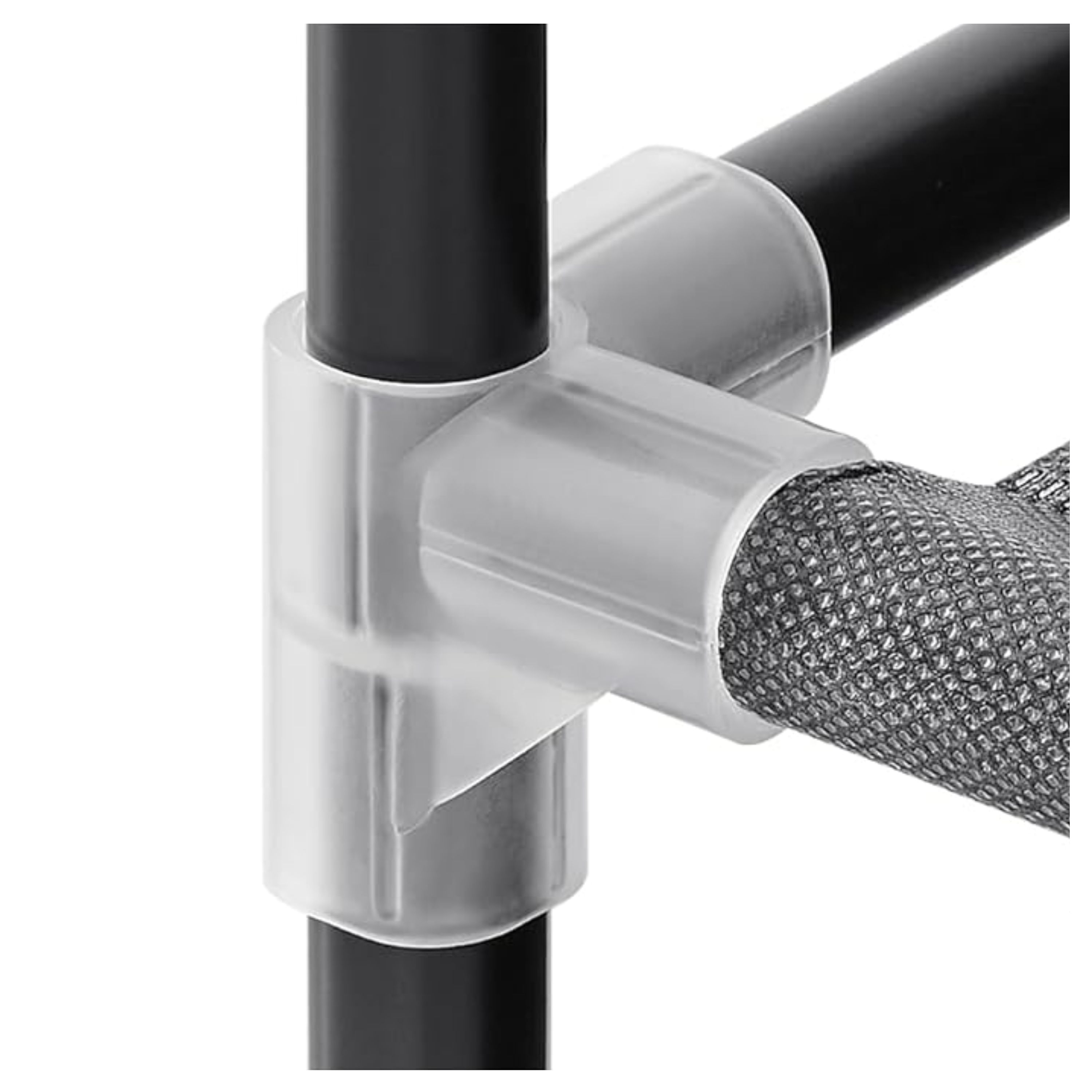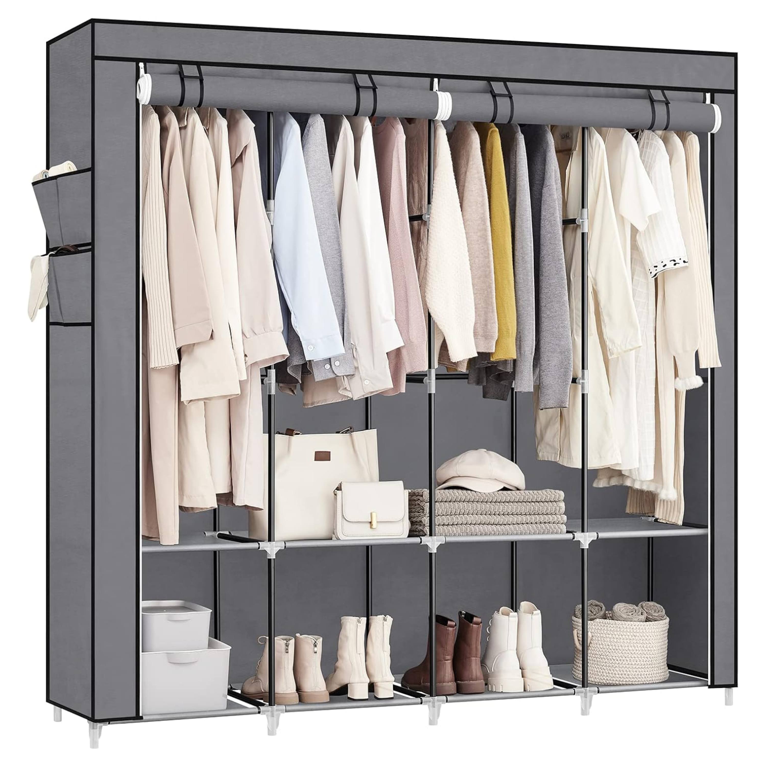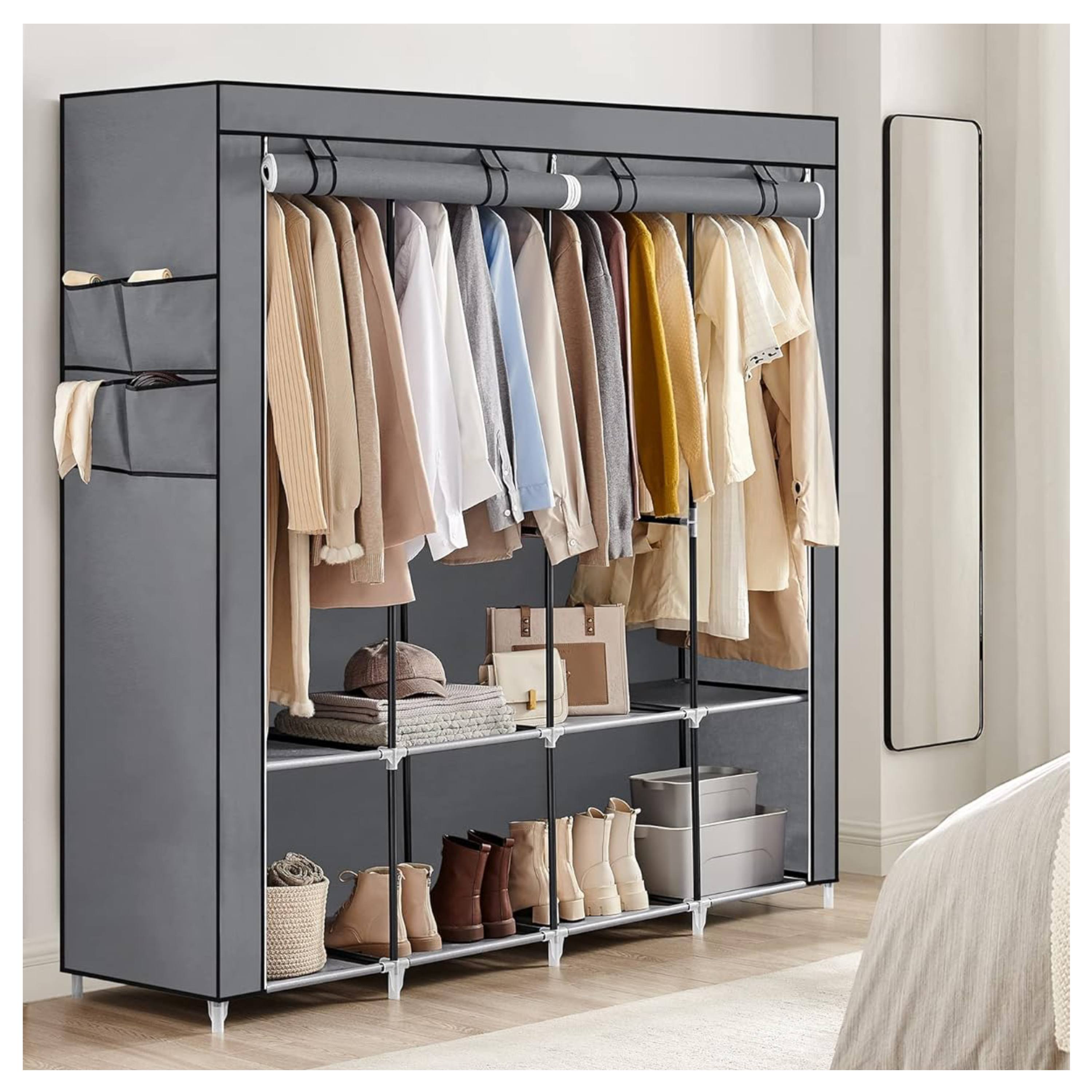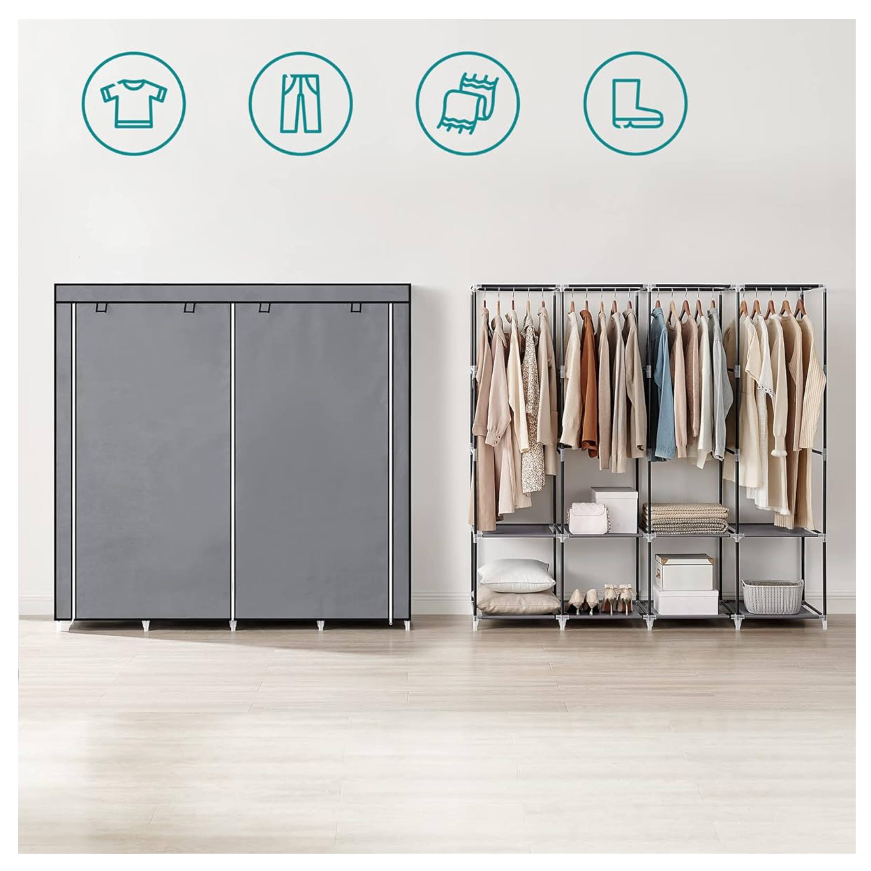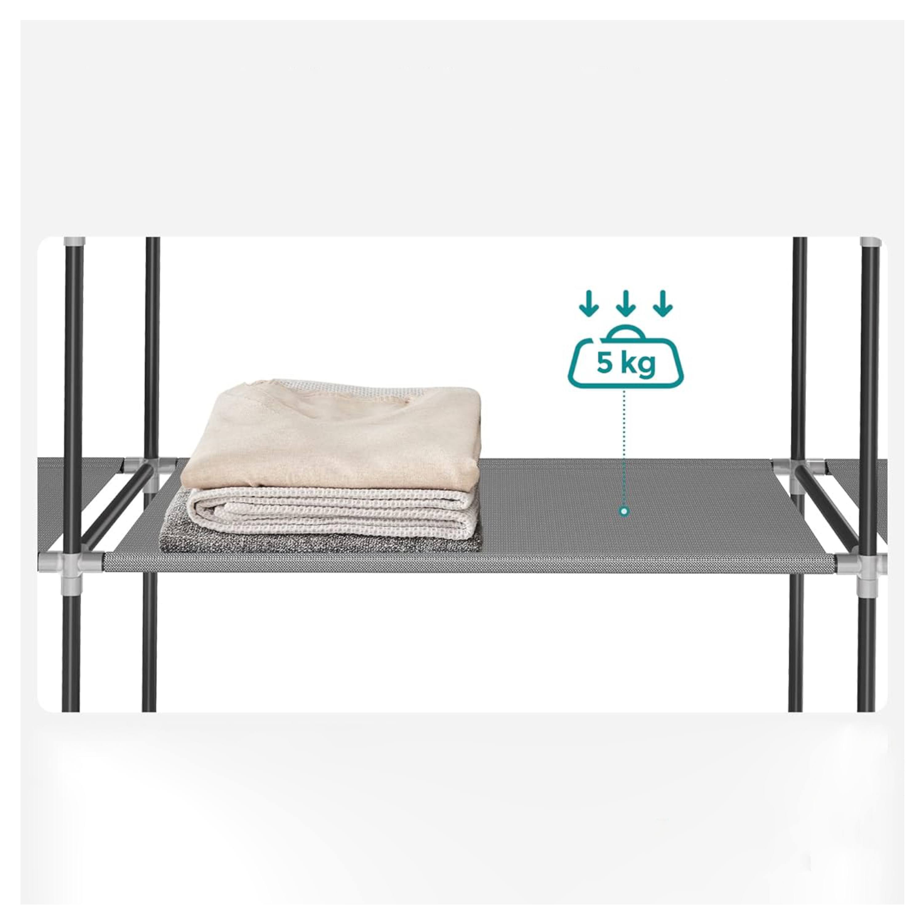 Skříň je vybavena 4 šatními tyčemi a 8 policemi. Šatní tyče jsou perfektním pomocníkem pro zavěšení šatů, kabátů či obleků, díky nimž zabráníte pomačkání oděvů. Police poskytují místo pro uložení lůžkovin, oblečení či úložných boxů. Součástí skříně je textilní potah, který ochrání vaše oblečení před prachem a nečistotami. Je také vybaven postranními kapsami pro uložení menších doplňků.