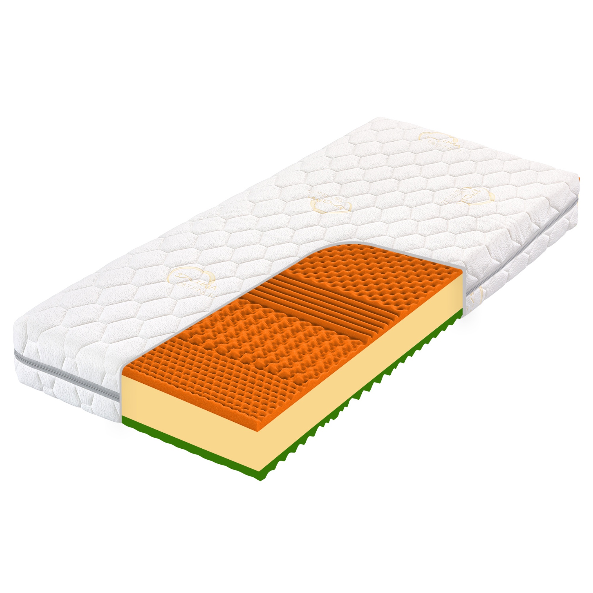 Matrace je oboustranná s rozdílnou tuhostí. Uživatel si zvolí tvrdší nebo měkčí stranu pouhým otočením. Odolná středová vrstva je vyrobena ze studené pružné pěny Flexifoam® s vyšší objemovou hmotností. 7-zónová masážní 3D profilace podporuje prokrvení pokožky a celkovou úlevu svalů. Barevné provedení jednotlivých pěnových vrstev se může od uvedených fotografií lišit, avšak jejich vlastnosti zůstávají stejné.