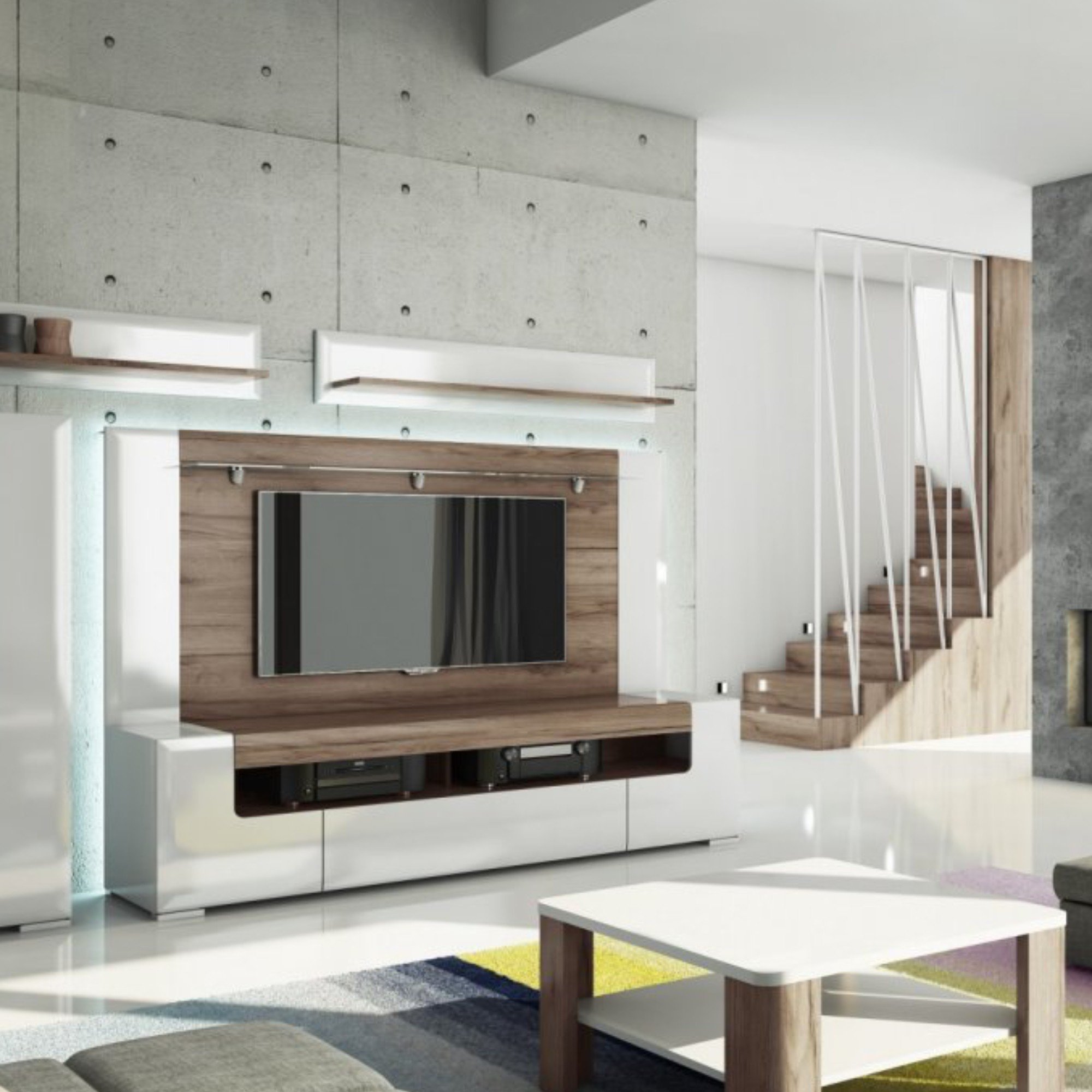 S panelem MILANO vaše stěna už nikdy nebude vypadat fádně. Díky jemnému podsvícení vytvoříte příjemnou atmosféru při sledování svého oblíbeného filmu nebo při setkání s přáteli. Skleněná police nabízí prostor pro knihy nebo drobné dekorace. Nástěnný panel MILANO je dokonalým spojením funkčnosti a elegantního vzhledu a v kombinaci s TV komodou vytvoří plnohodnotnou, reprezentativní sestavu, která bude vašemu obýváku opravdu slušet. Dodáváno s osvětlením.