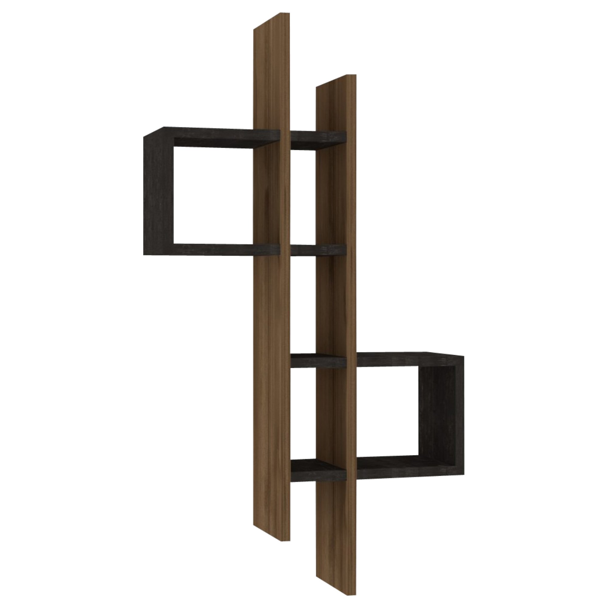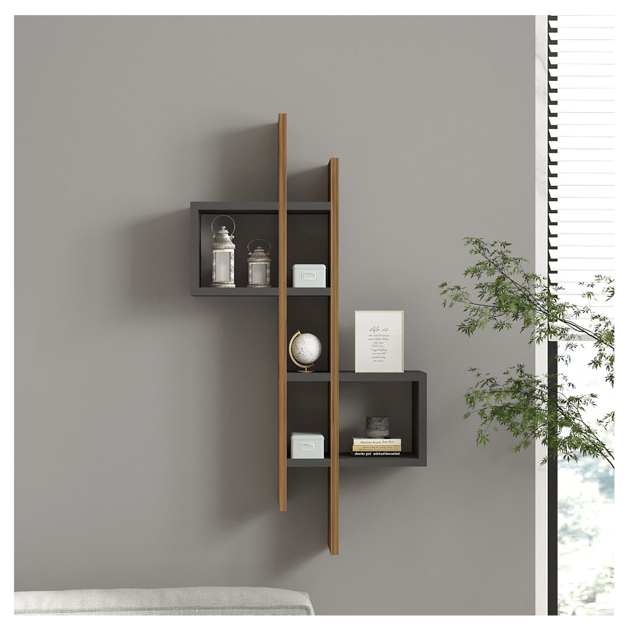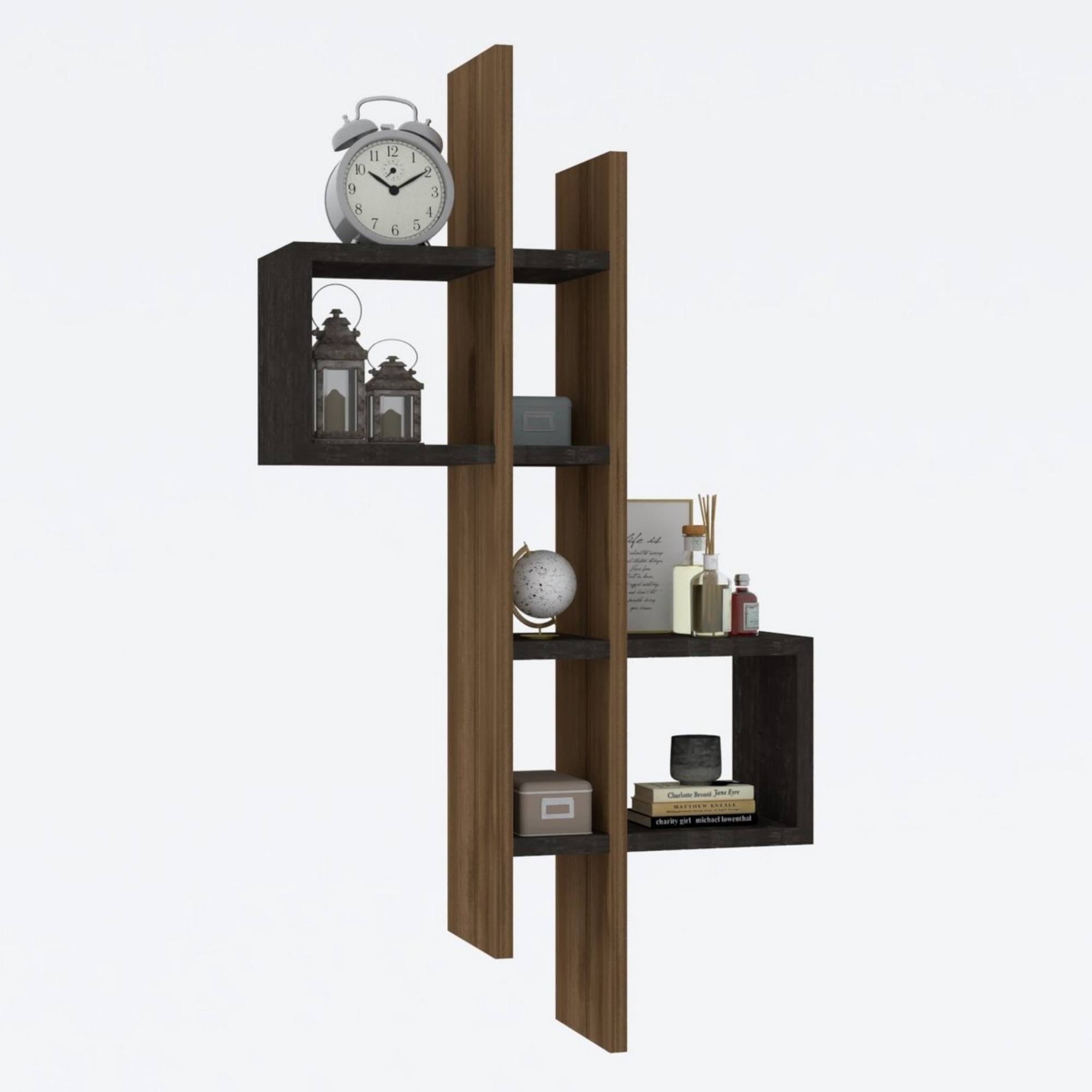 Dělený odkládací prostor různých velikostí poskytne místo pro vaše knihy a dekorace. Originální, minimalistické provedení ze snadno udržovatelného materiálu bude ozdobou interiéru.